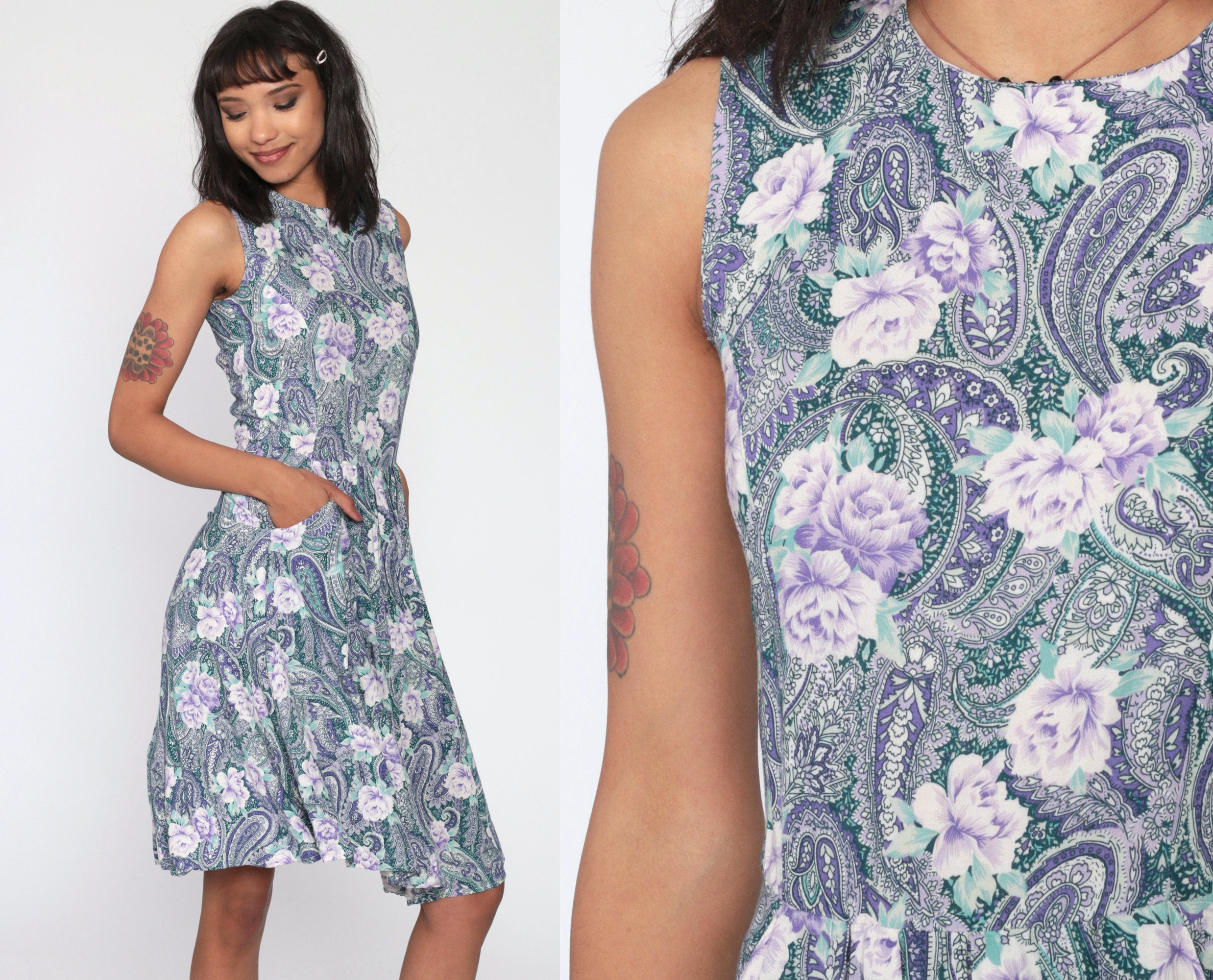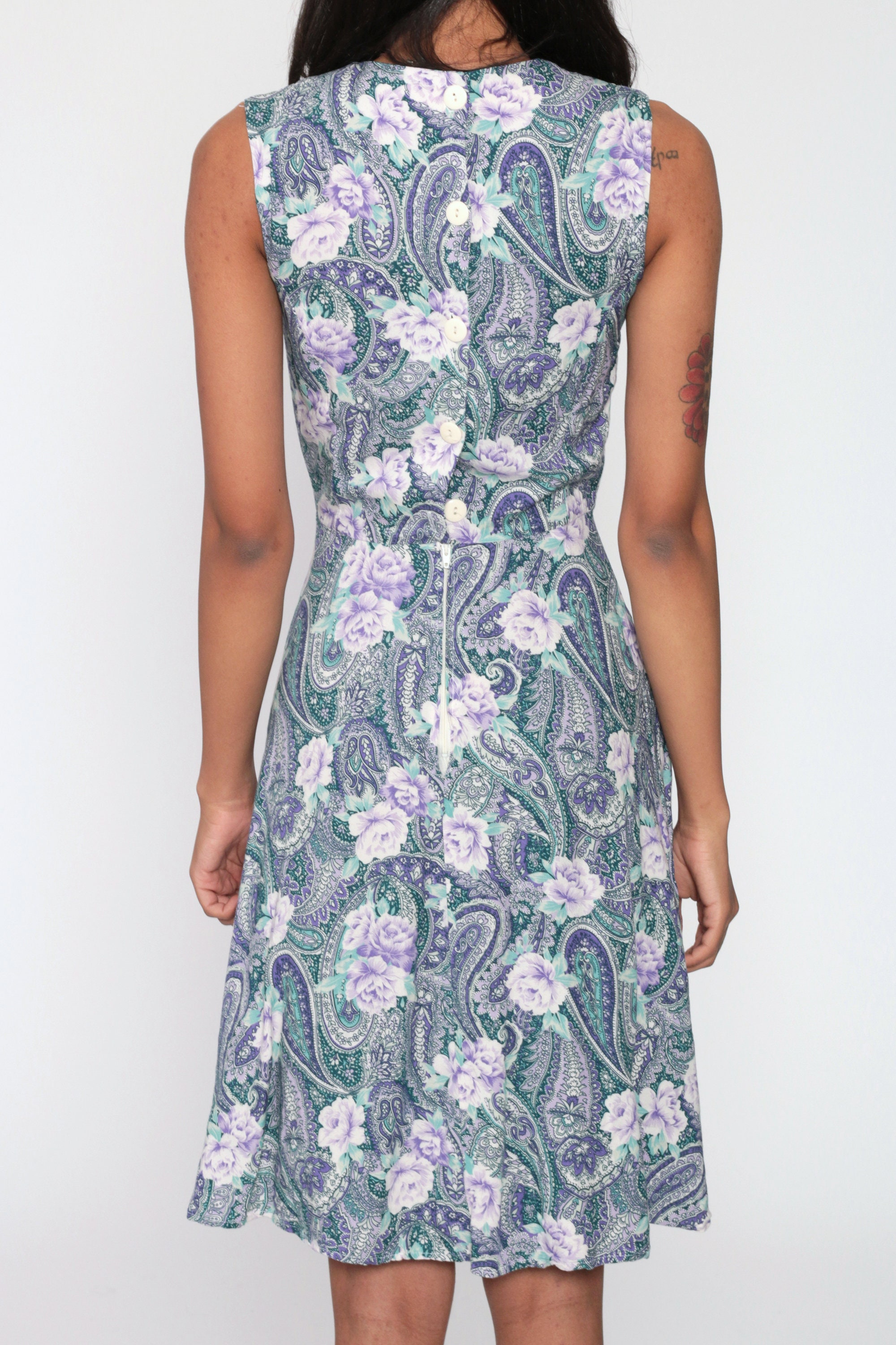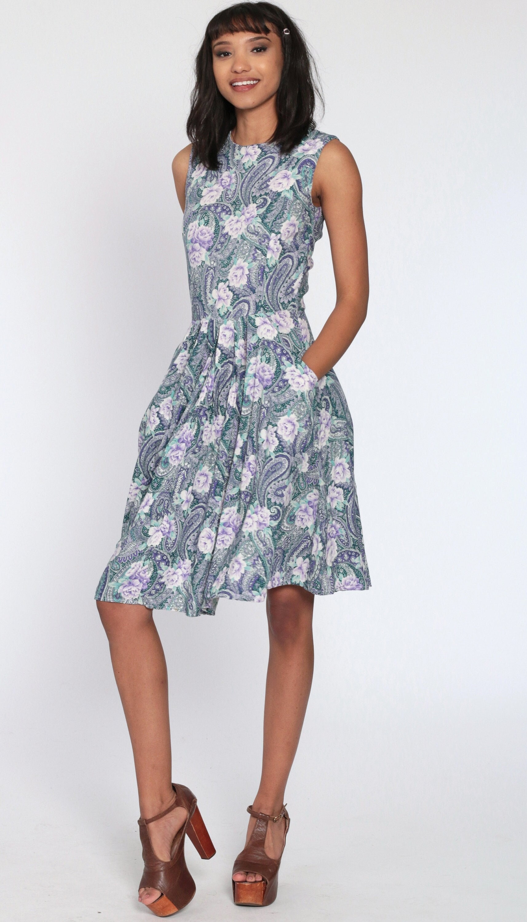 Vintage 80s dress in a floral paisley print with buttons up the back. Has a gathered skirt and pockets.