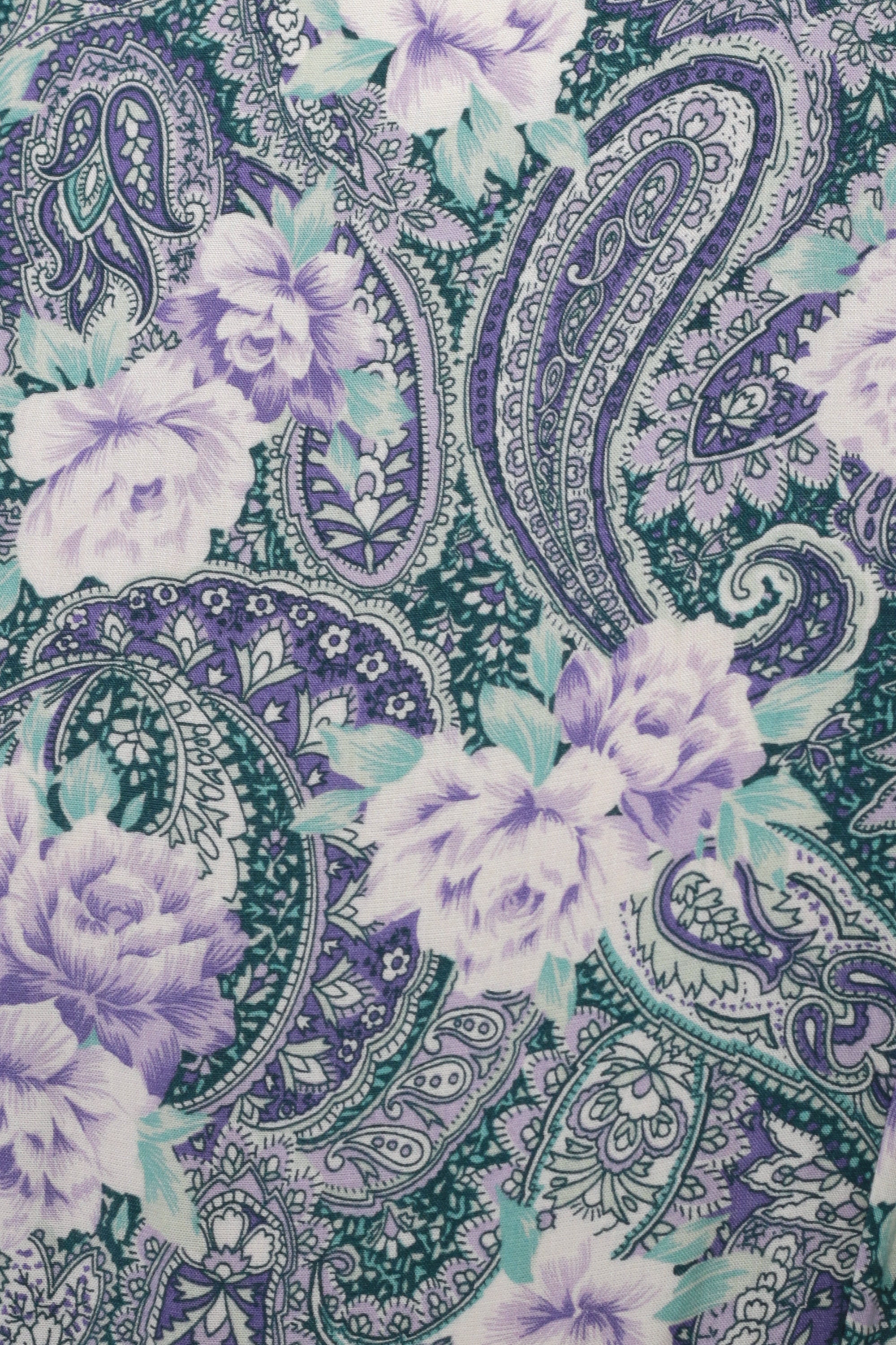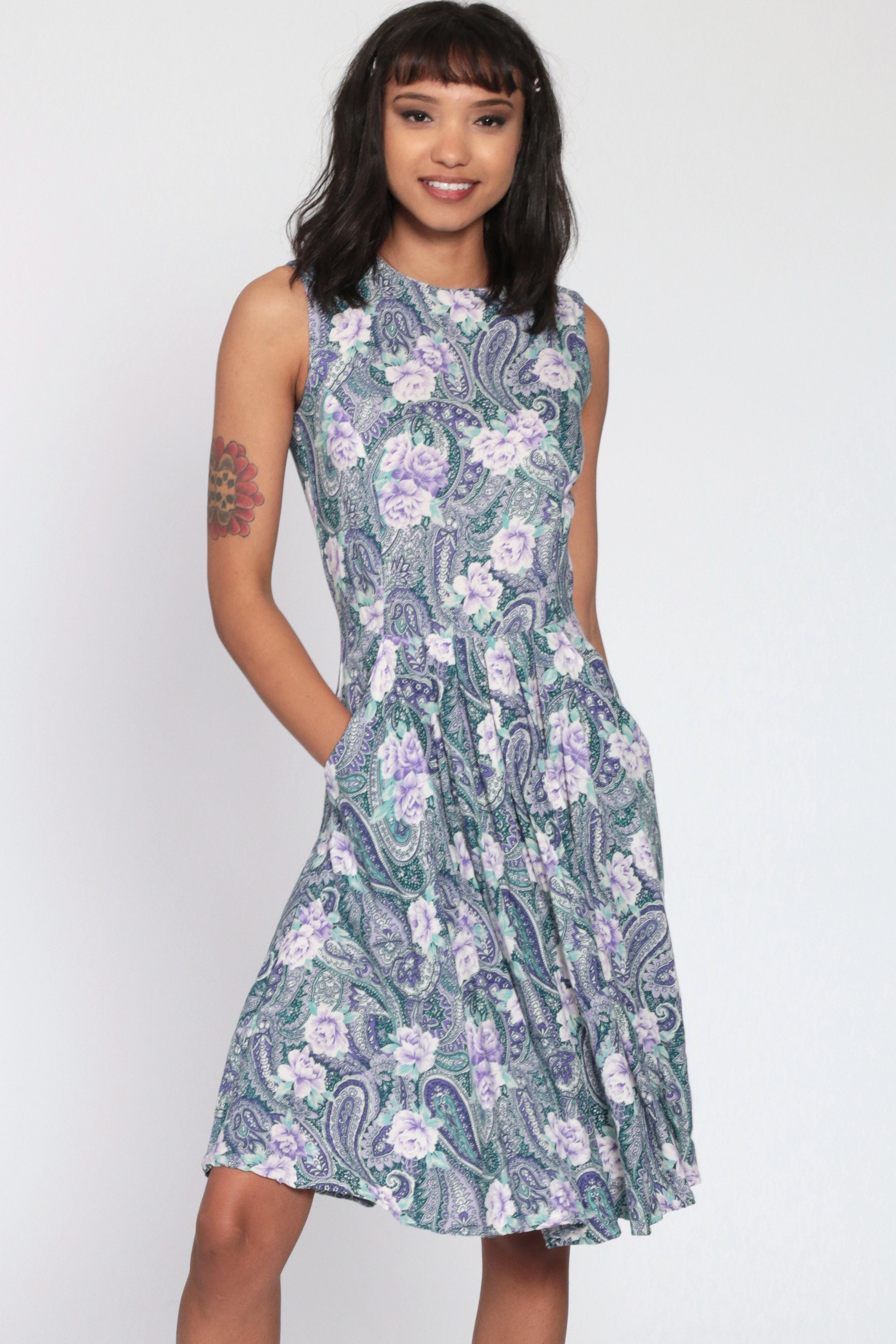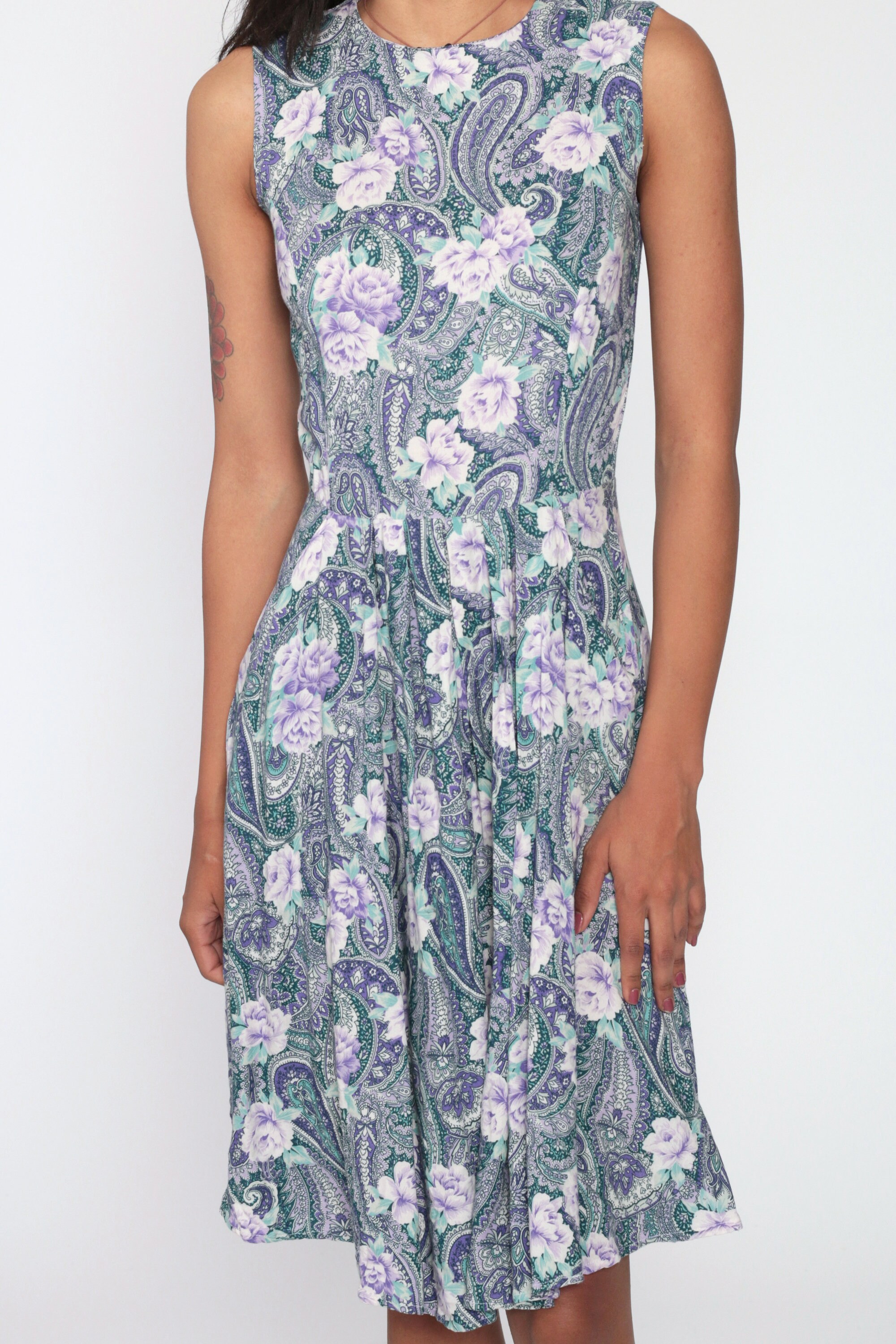 Vintage 80s dress in a floral paisley print with buttons up the back. Has a gathered skirt and pockets.