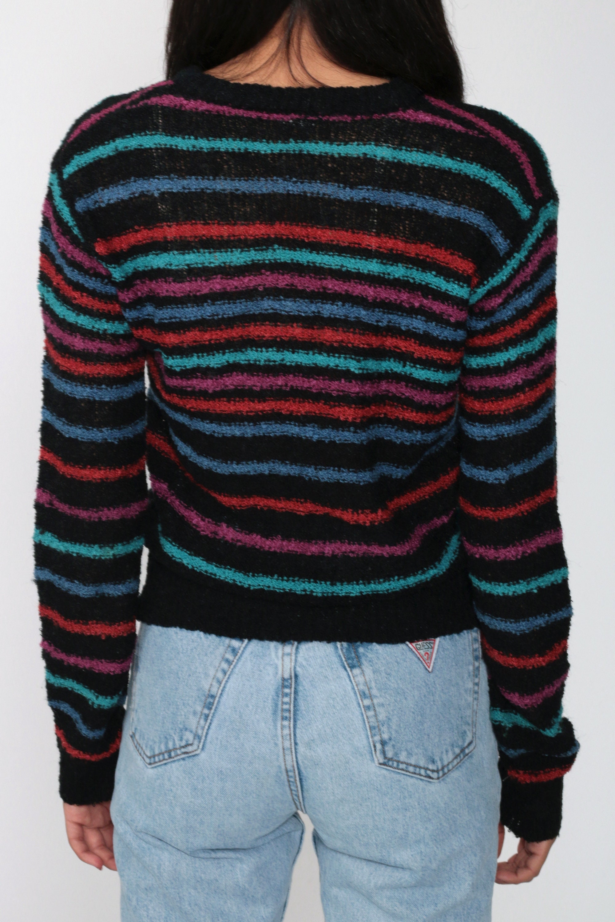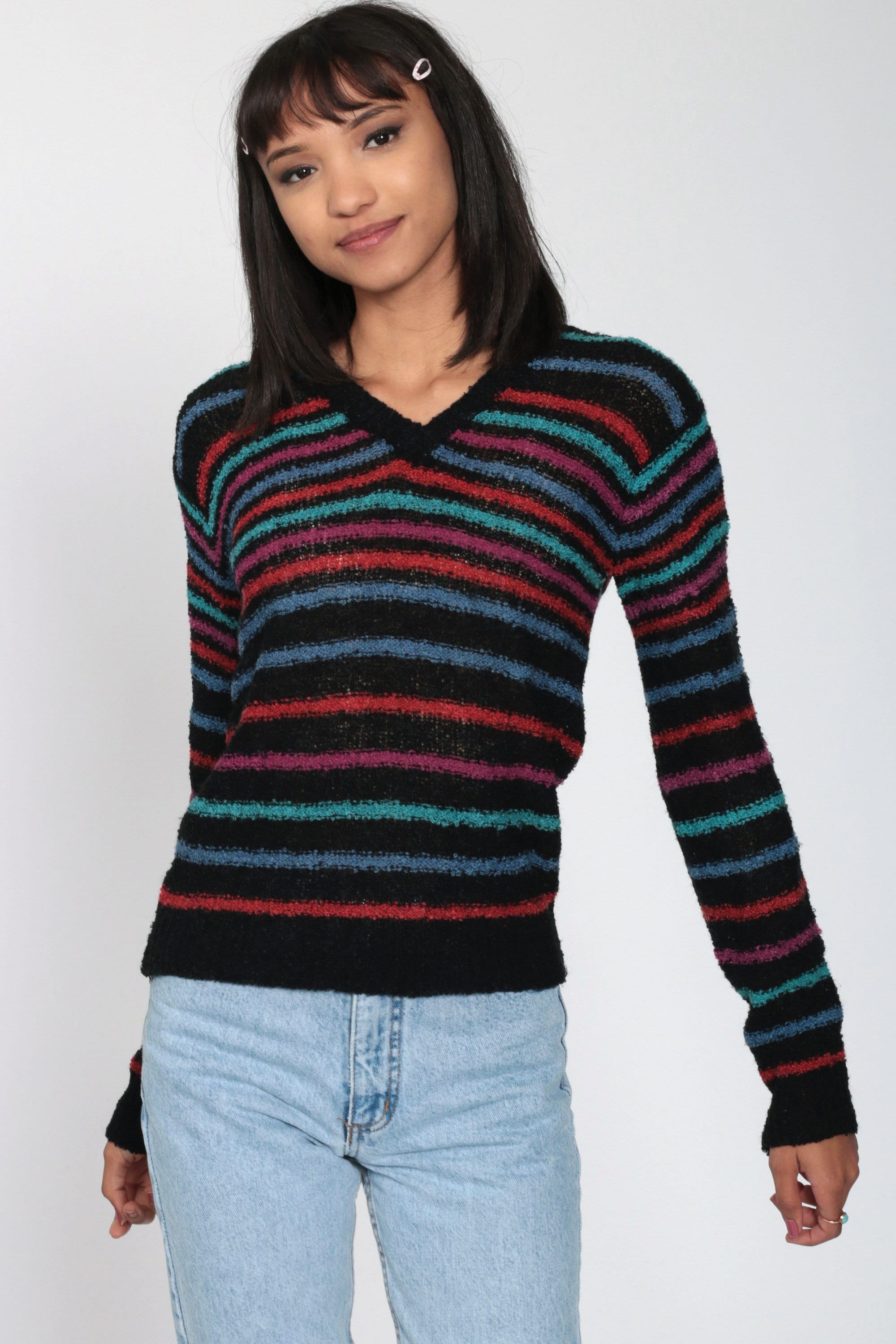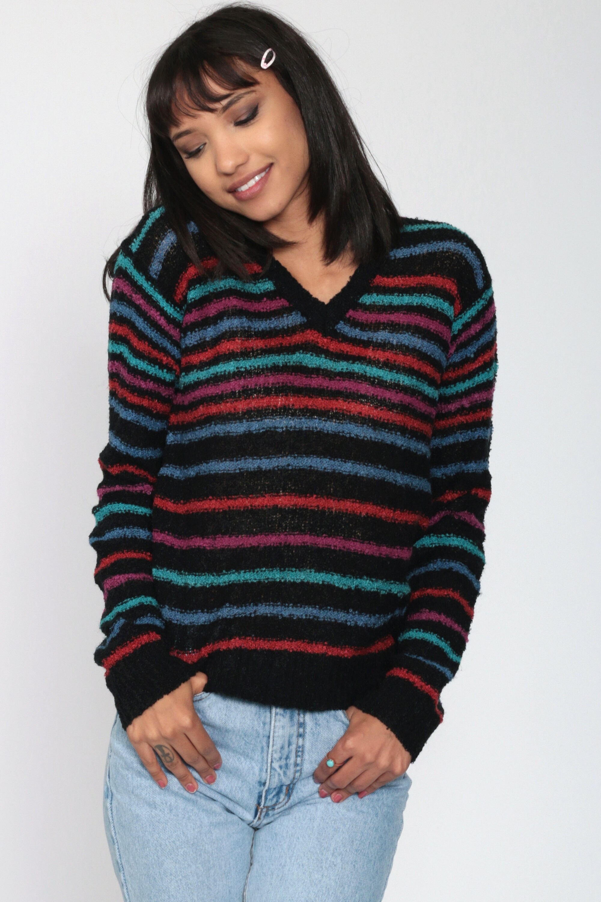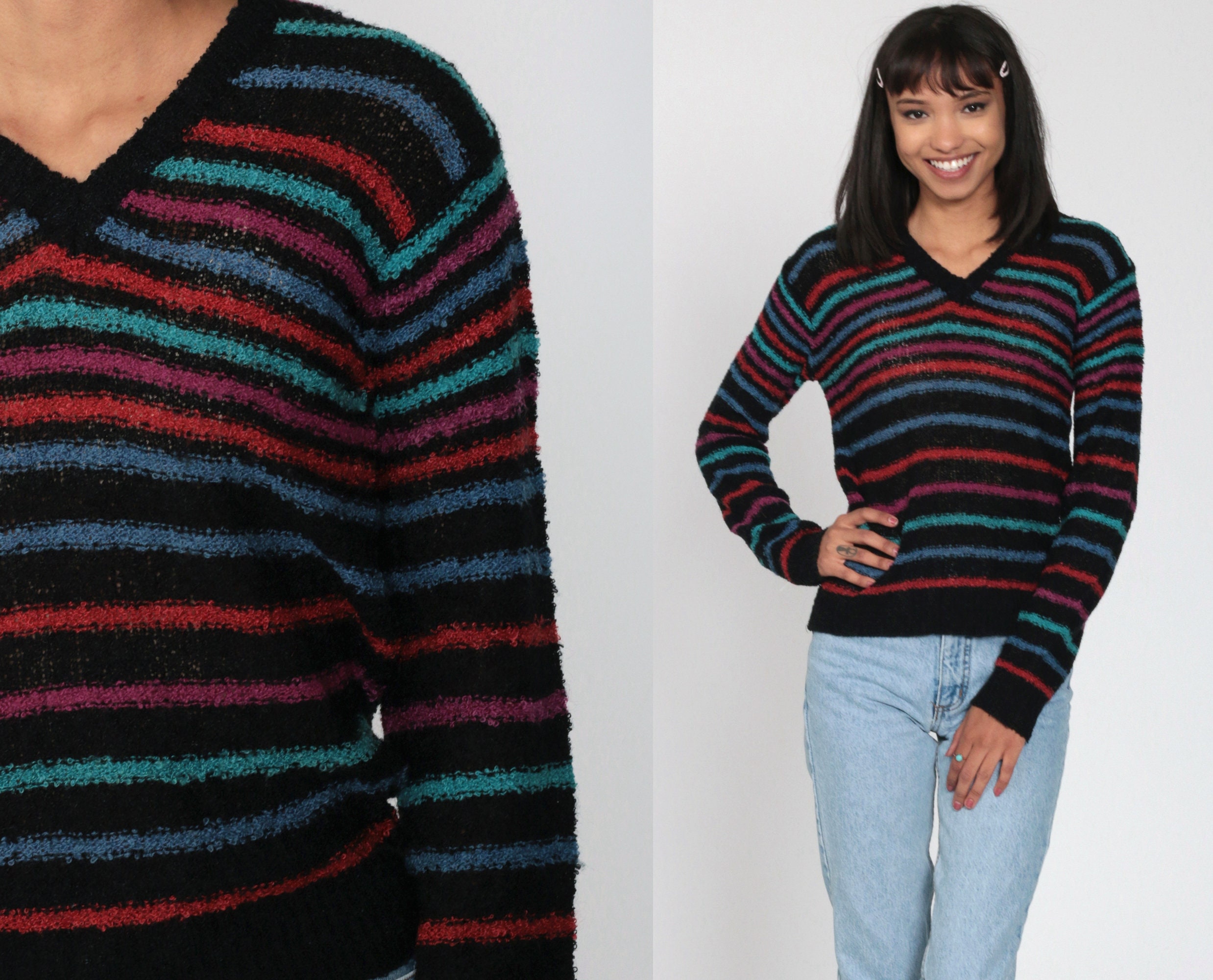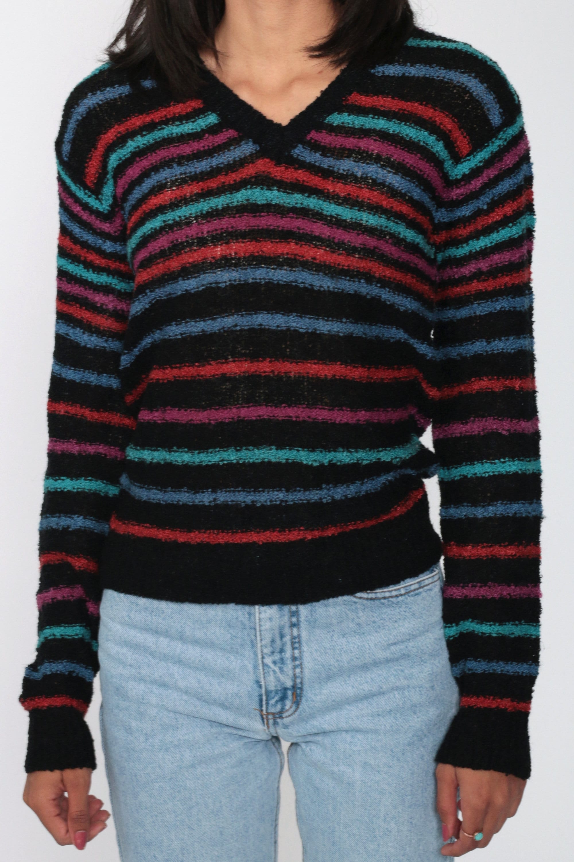 Vintage 80s sweater in black with stripes. Slouchy with a v neck.