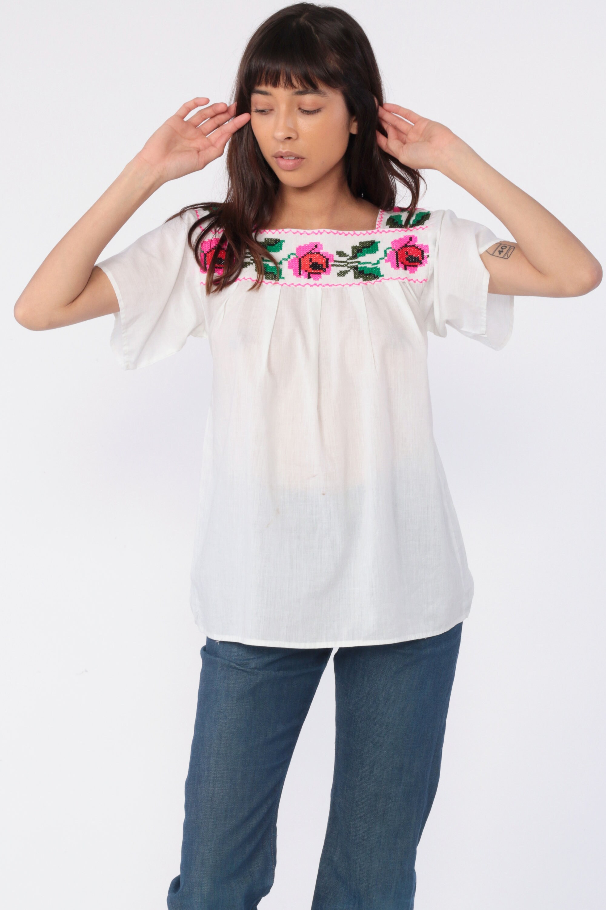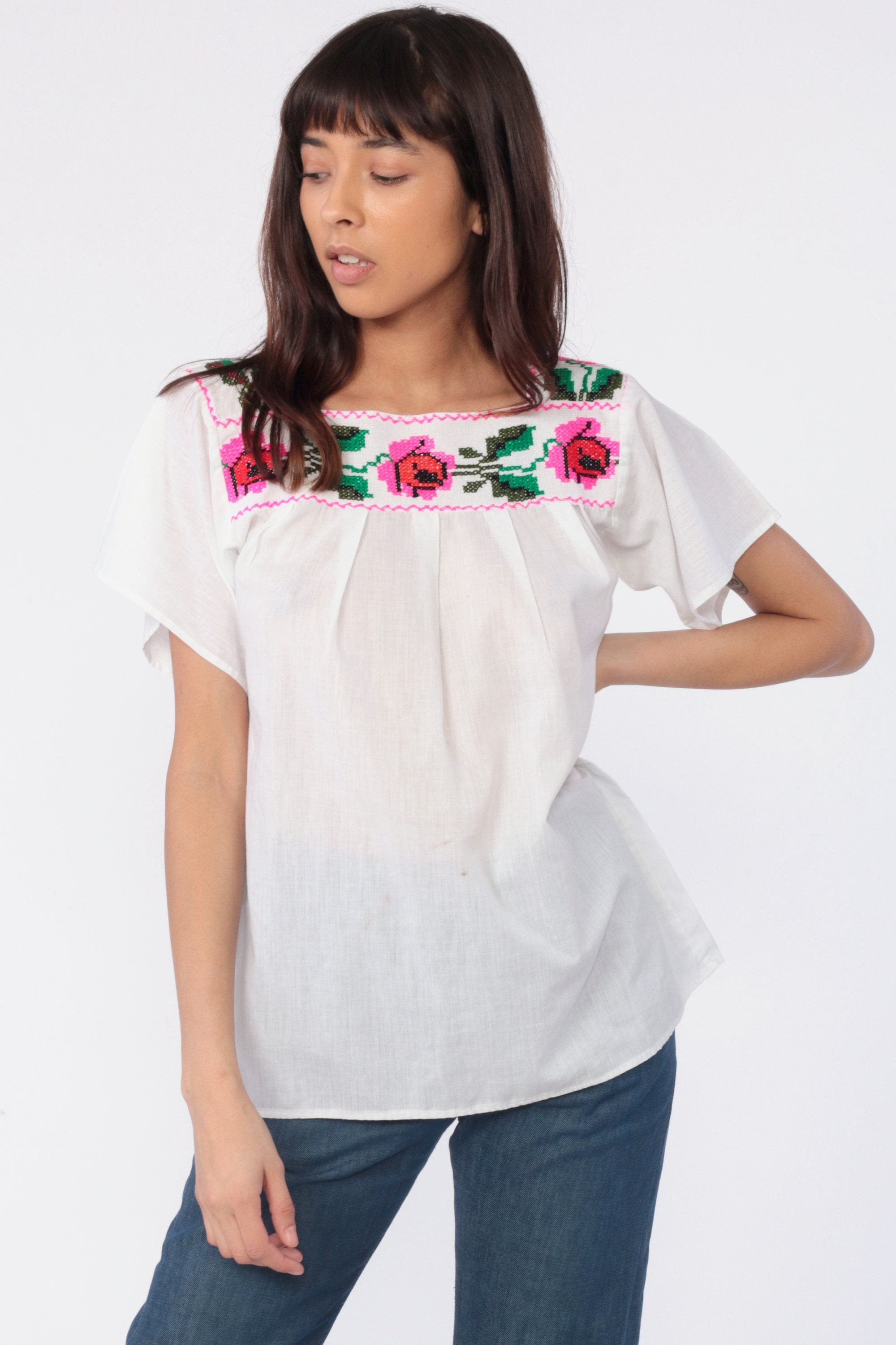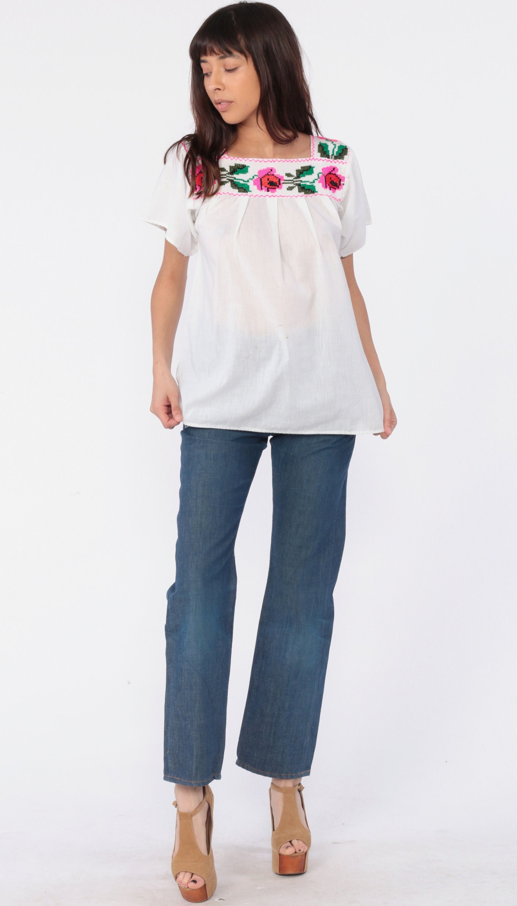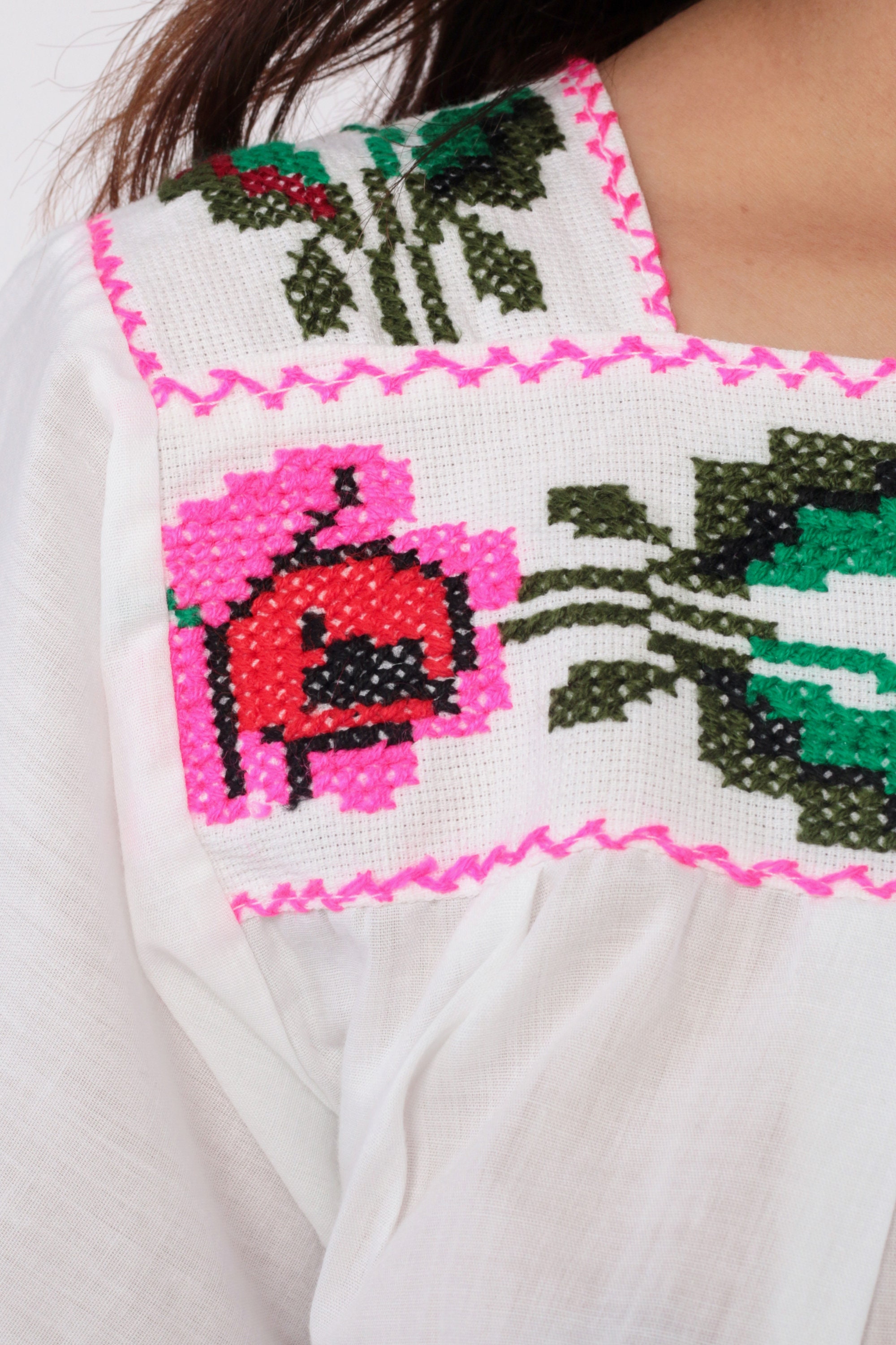 Vintage Mexican blouse with floral embroidery on white cotton. Tunic cut.