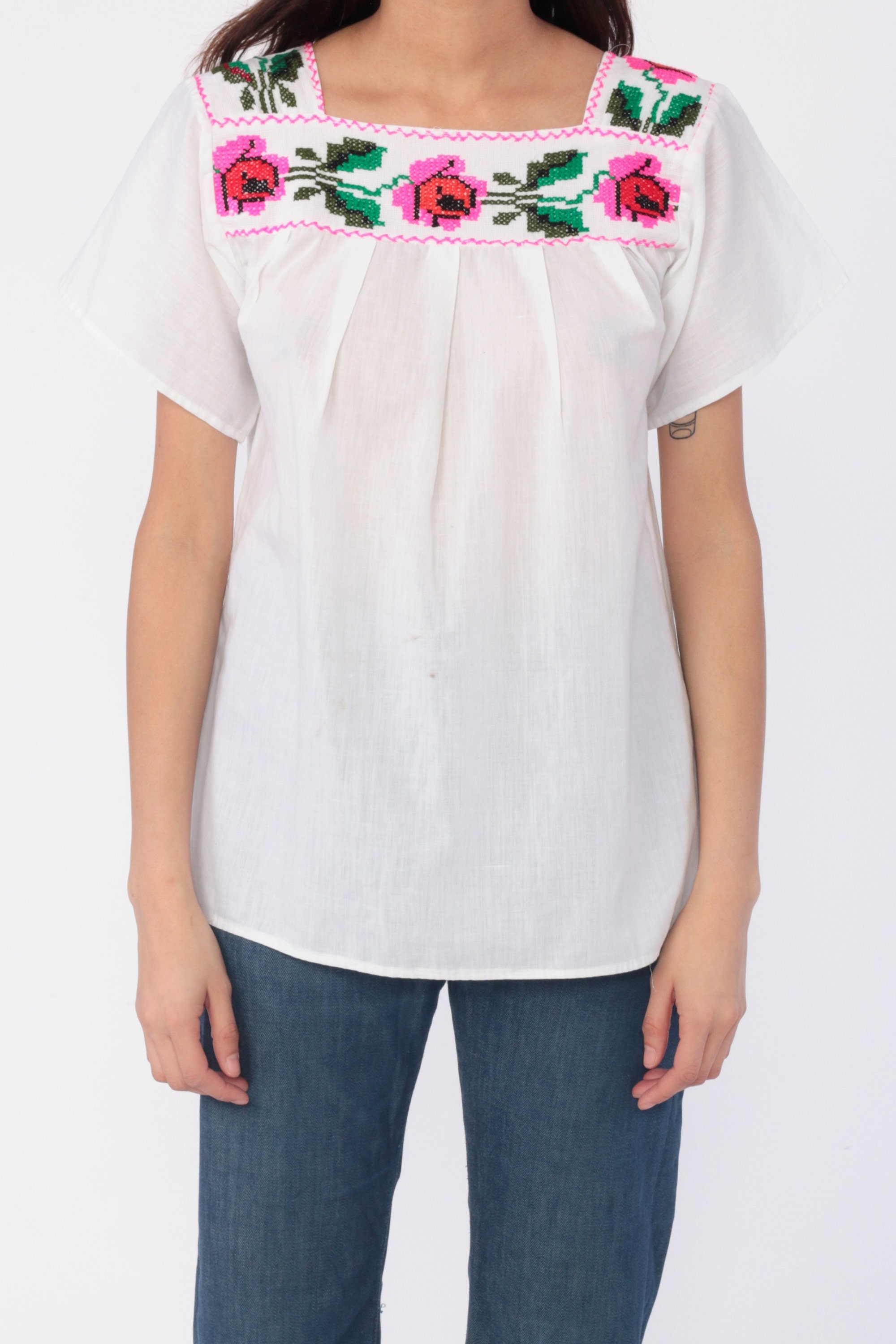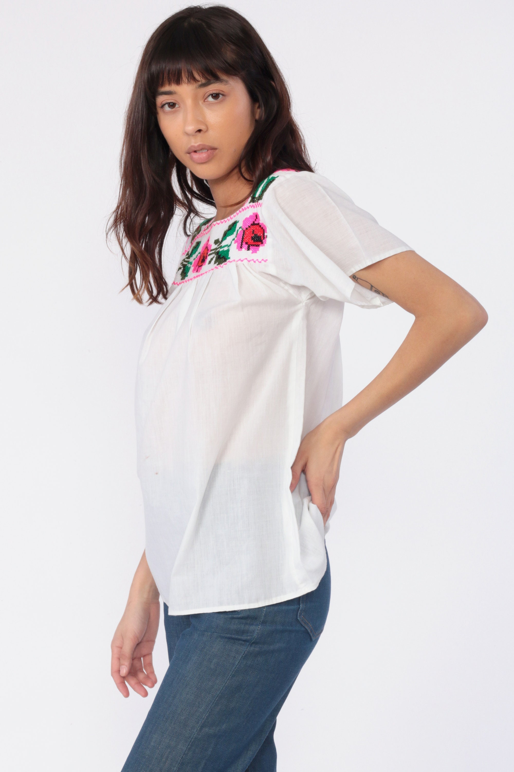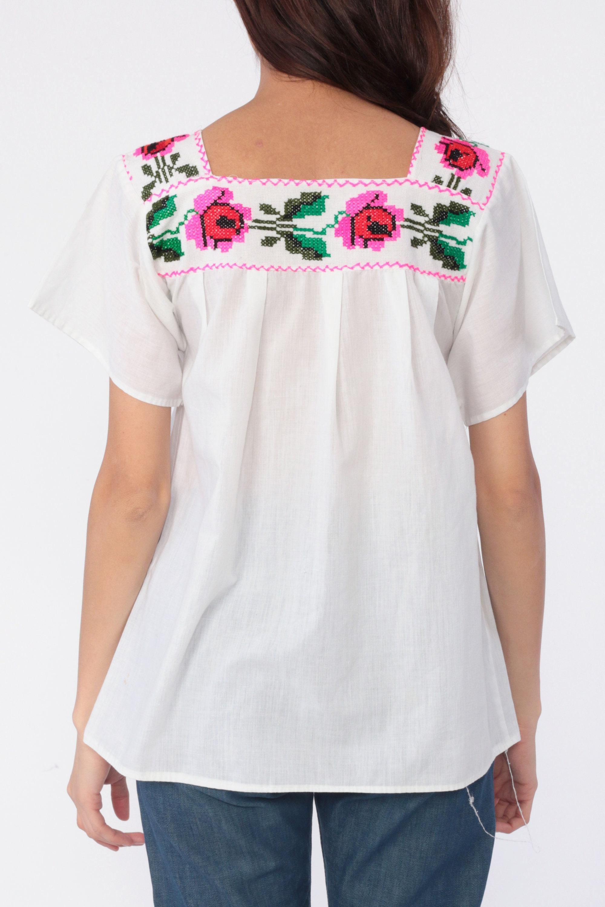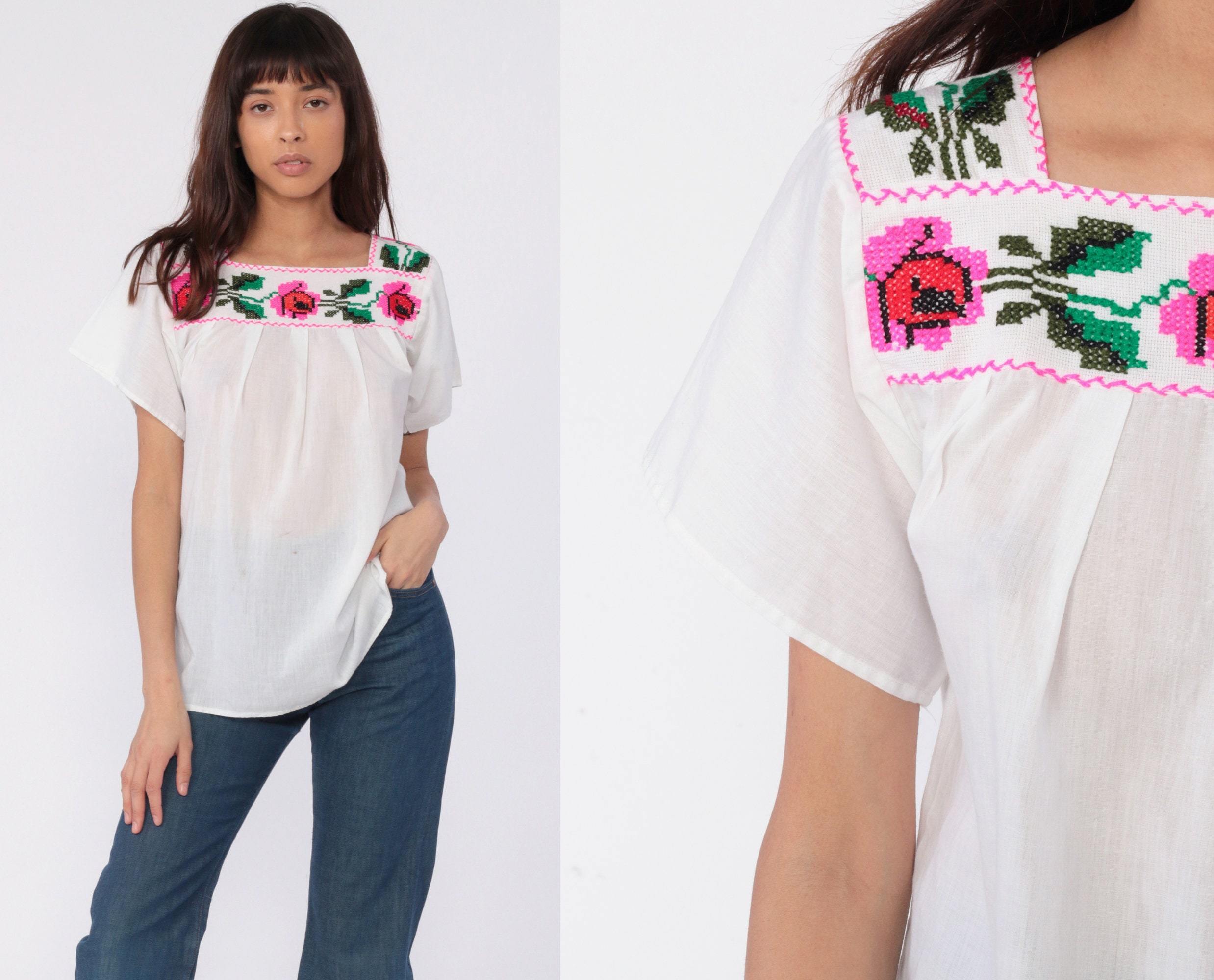 Vintage Mexican blouse with floral embroidery on white cotton. Tunic cut.