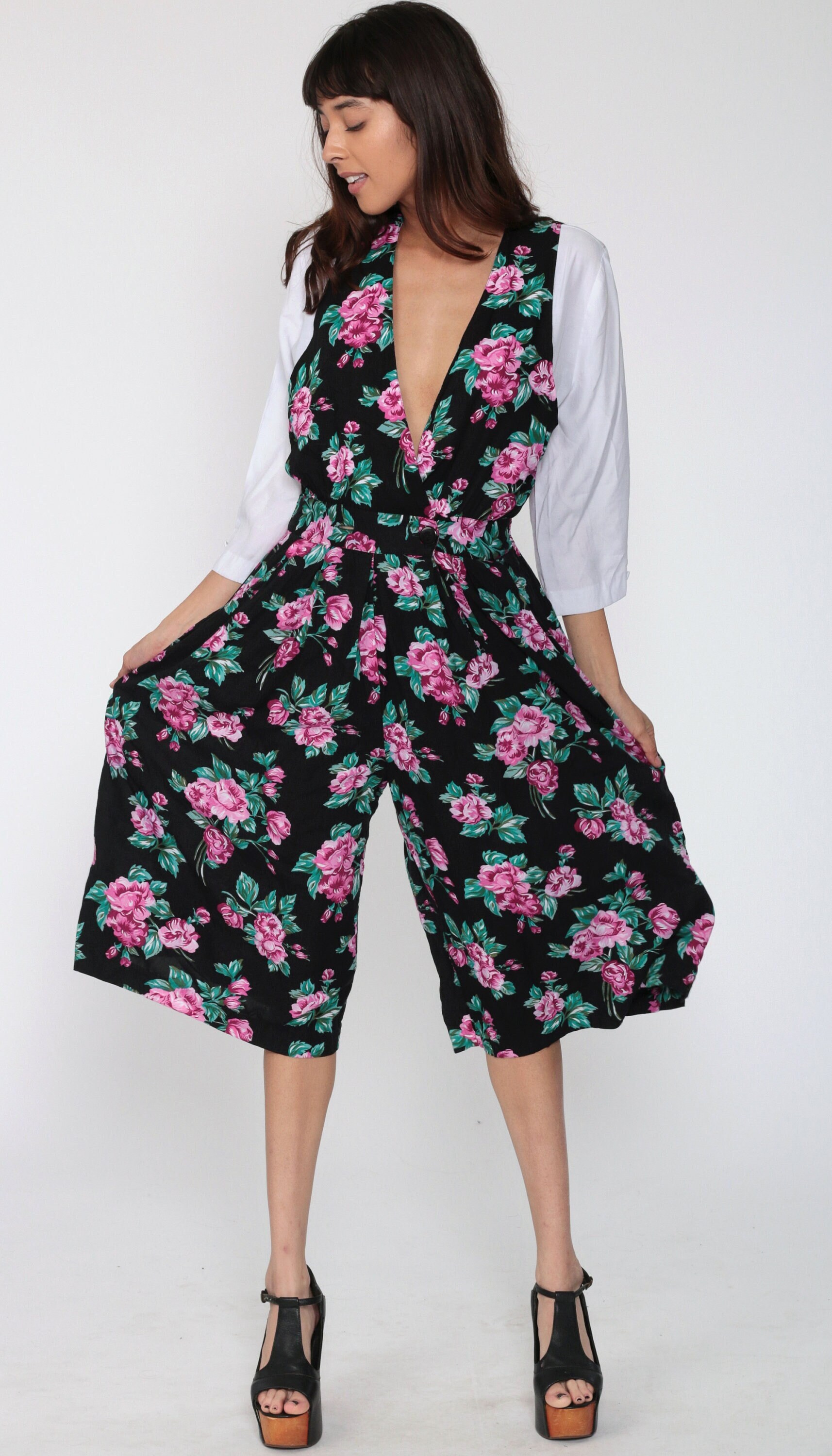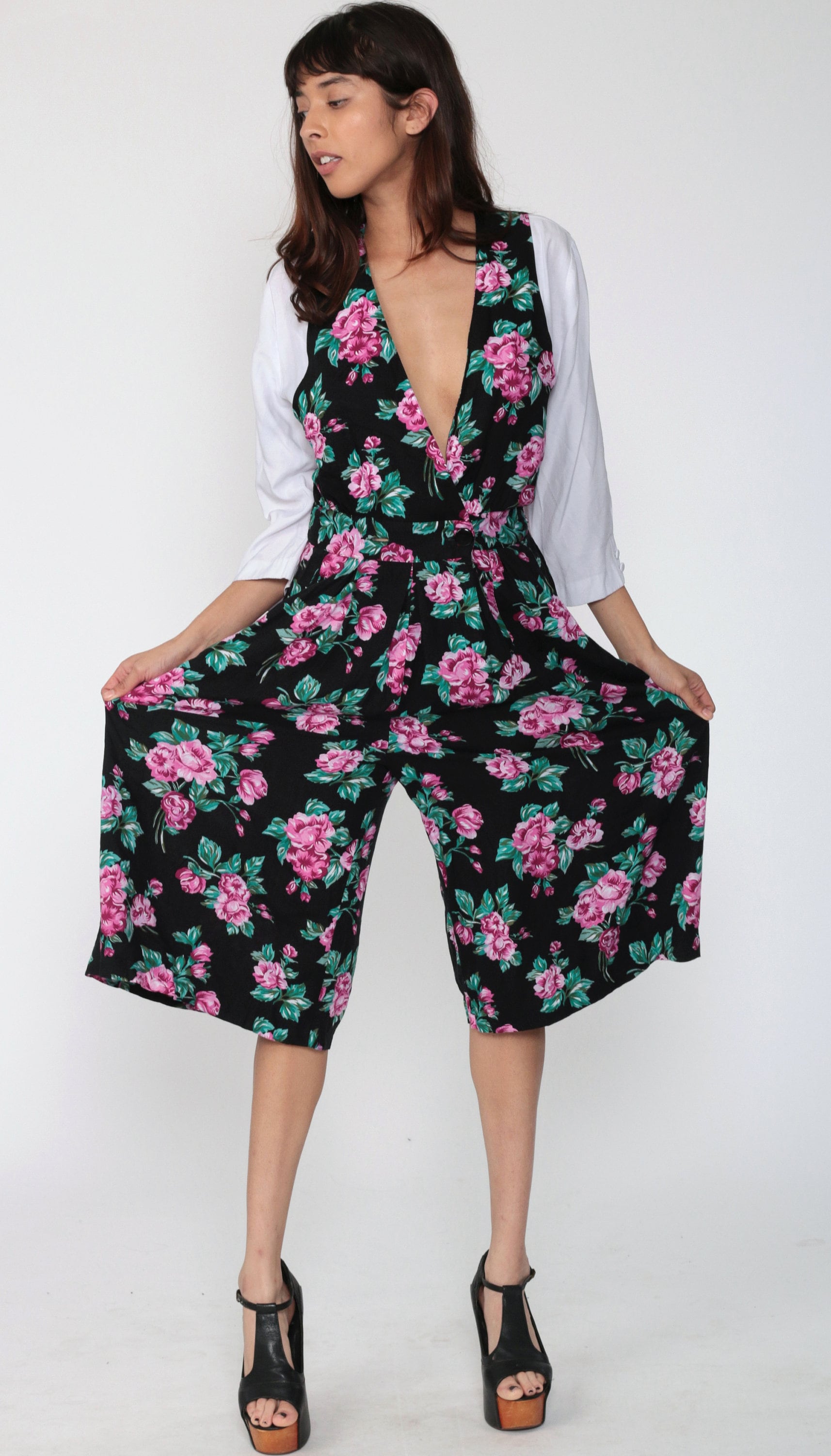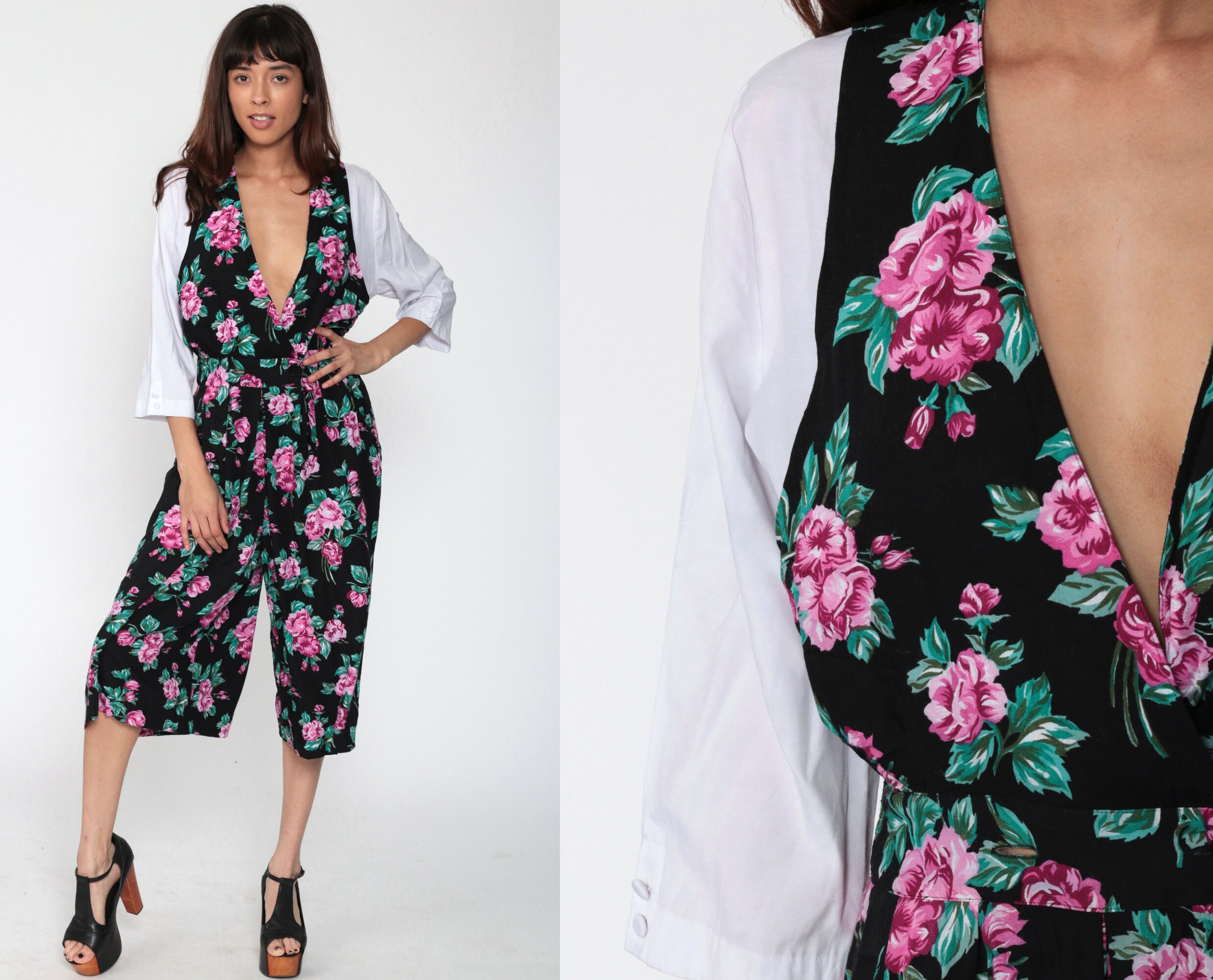 Vintage 90s jumpsuit with a floral print and wide legs. It has a deep v neck, a high waist and pockets. Note: Button at waist is undone in photos, but it is intact.