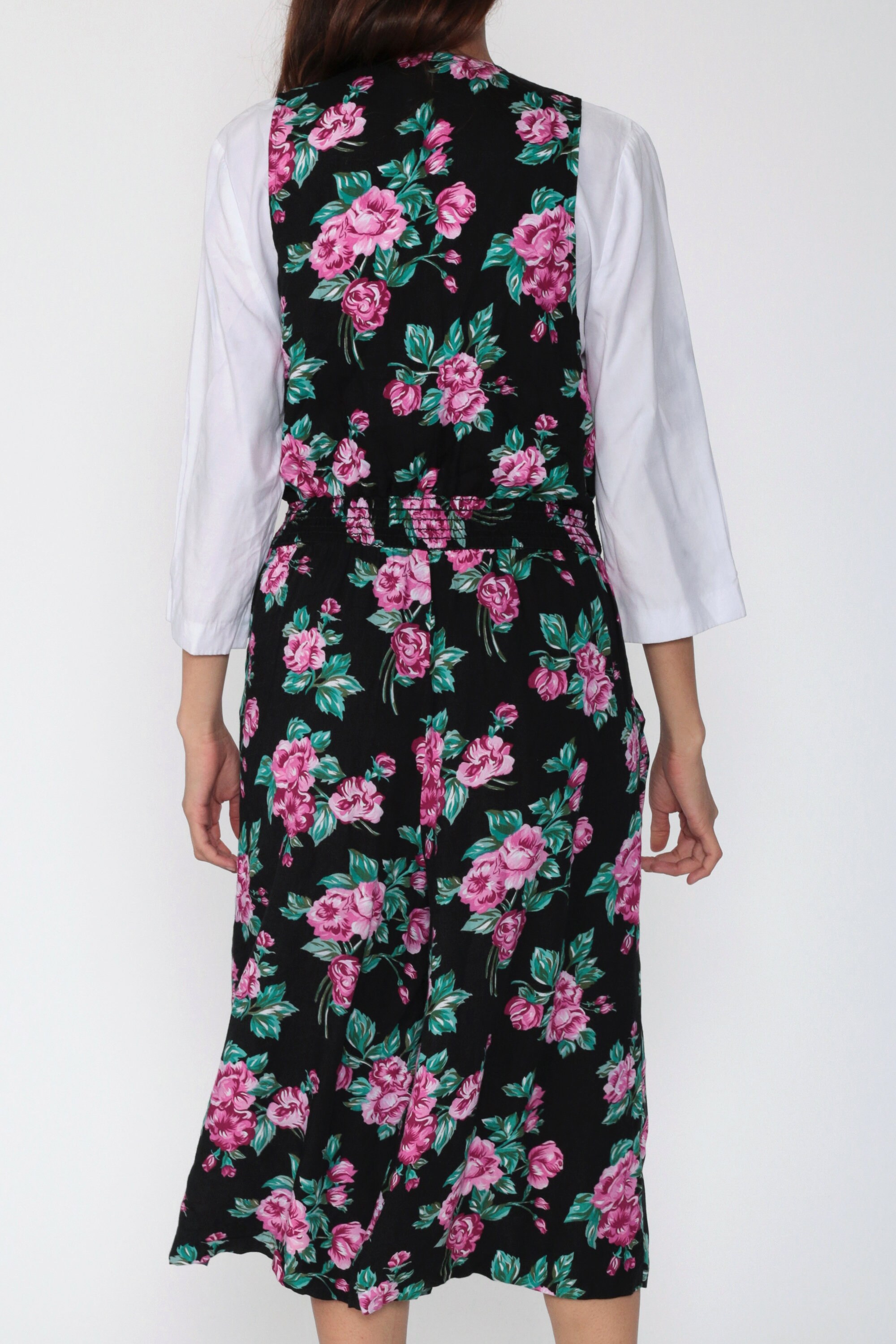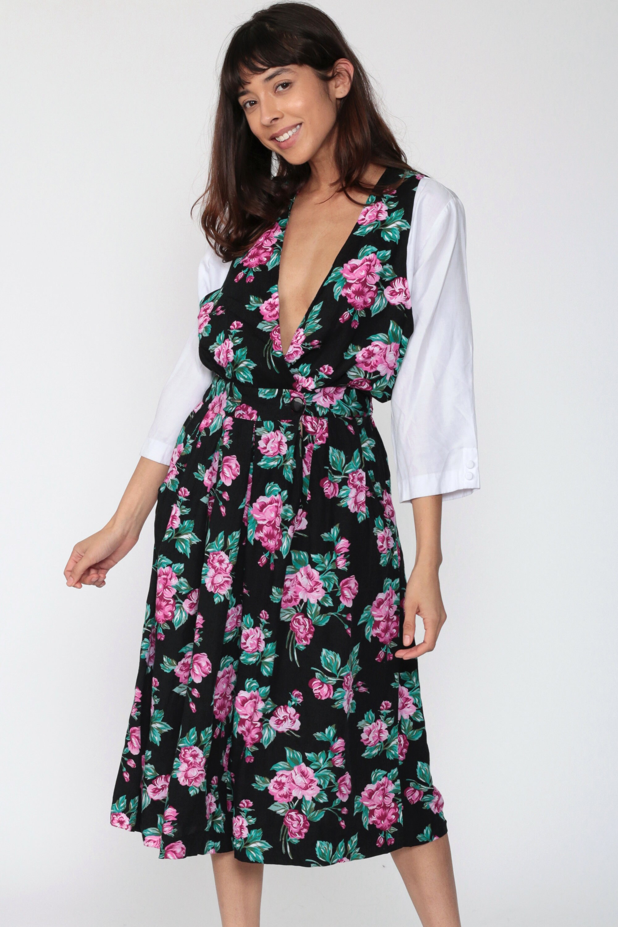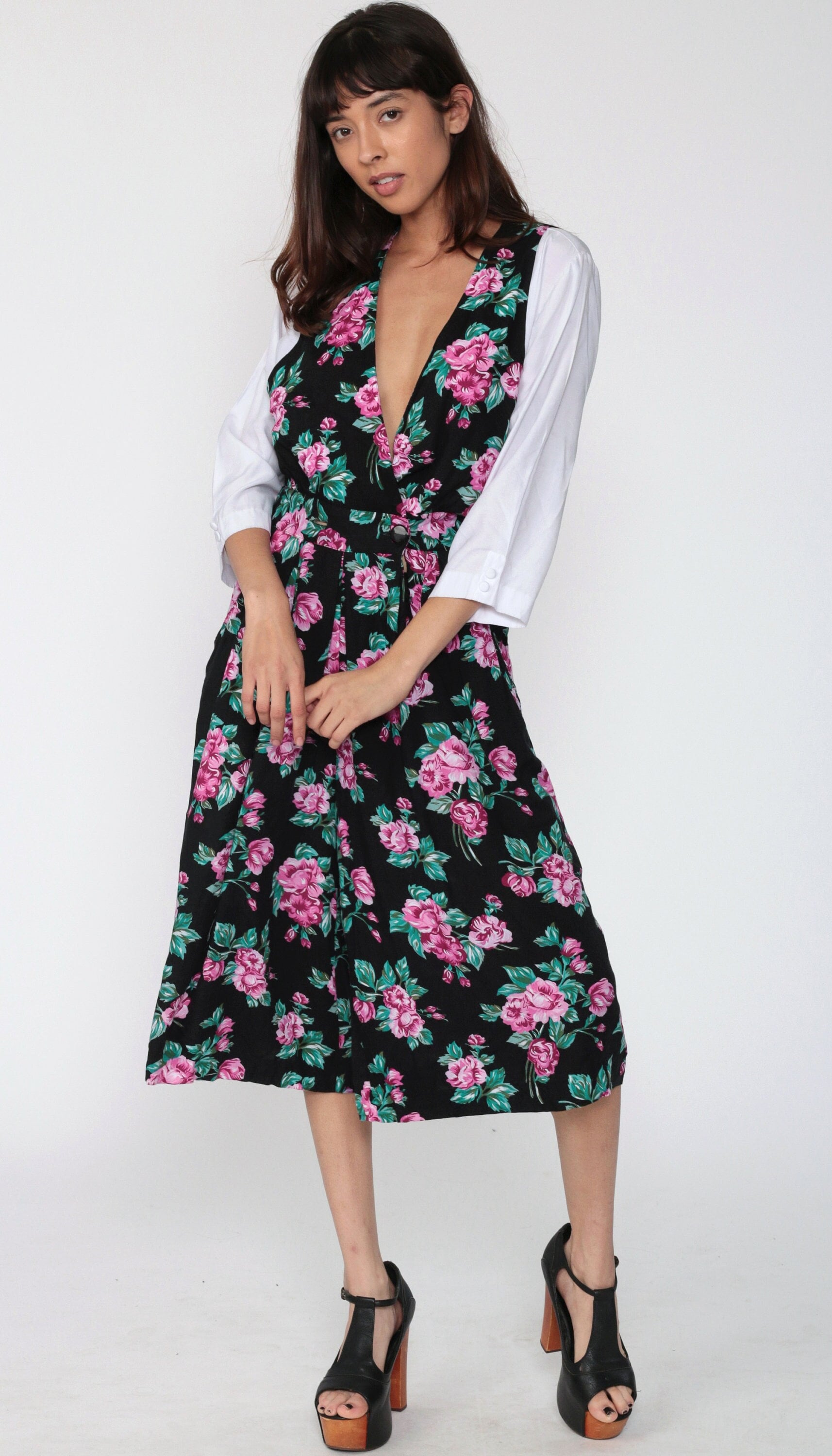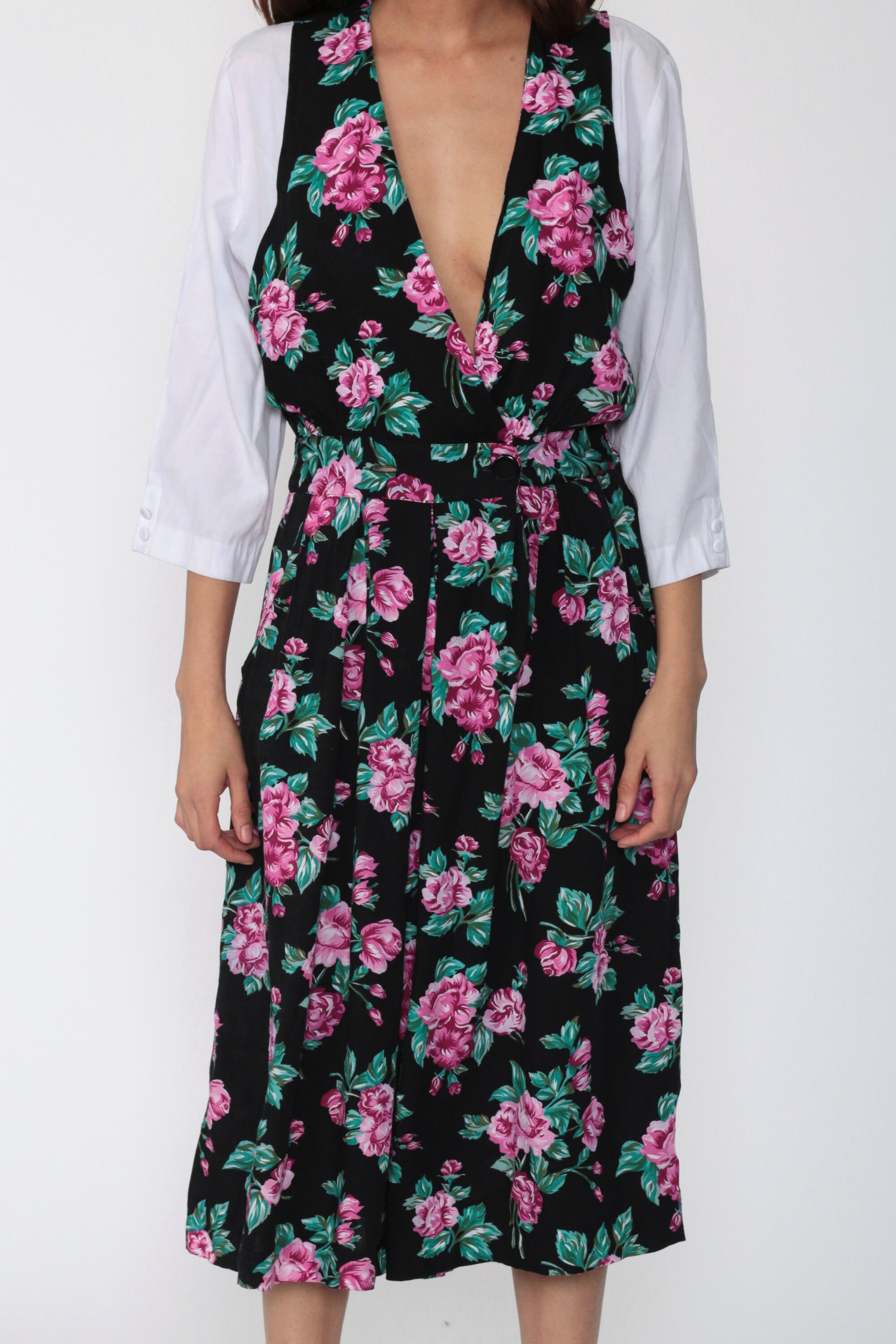 Vintage 90s jumpsuit with a floral print and wide legs. It has a deep v neck, a high waist and pockets. Note: Button at waist is undone in photos, but it is intact.