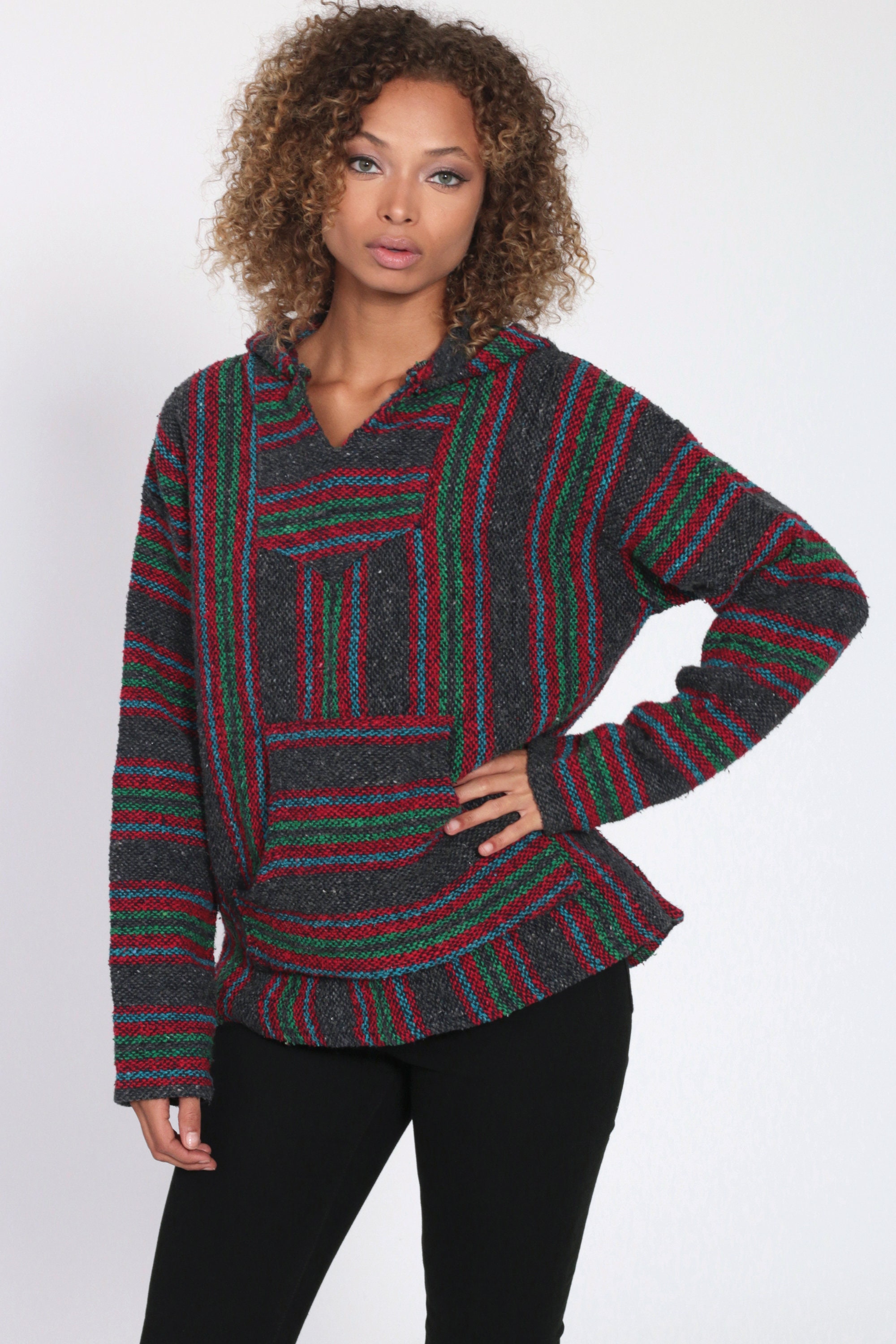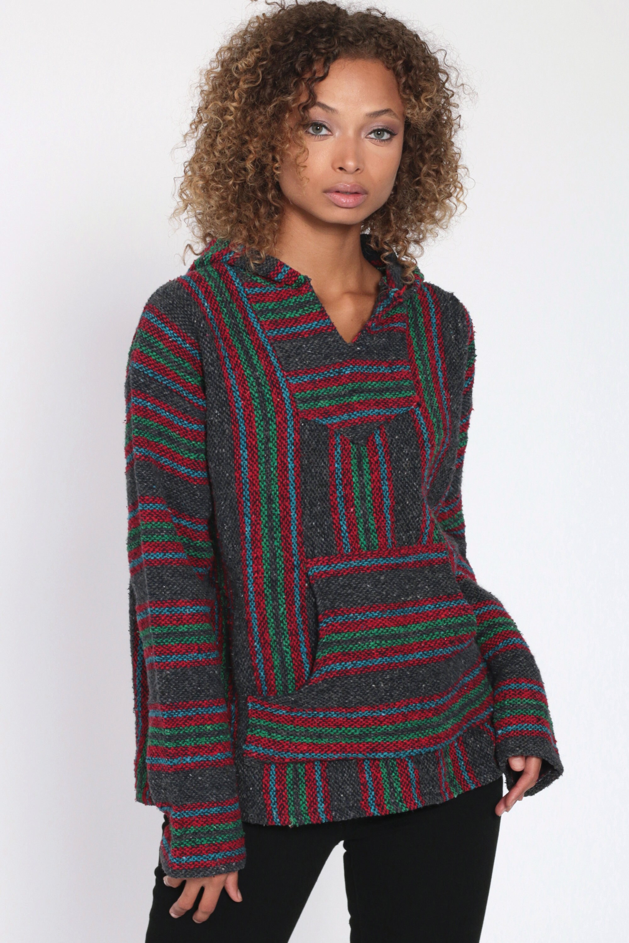 Vintage Mexican drug rug hoodie sweatshirt with stripes and a kangaroo pocket.