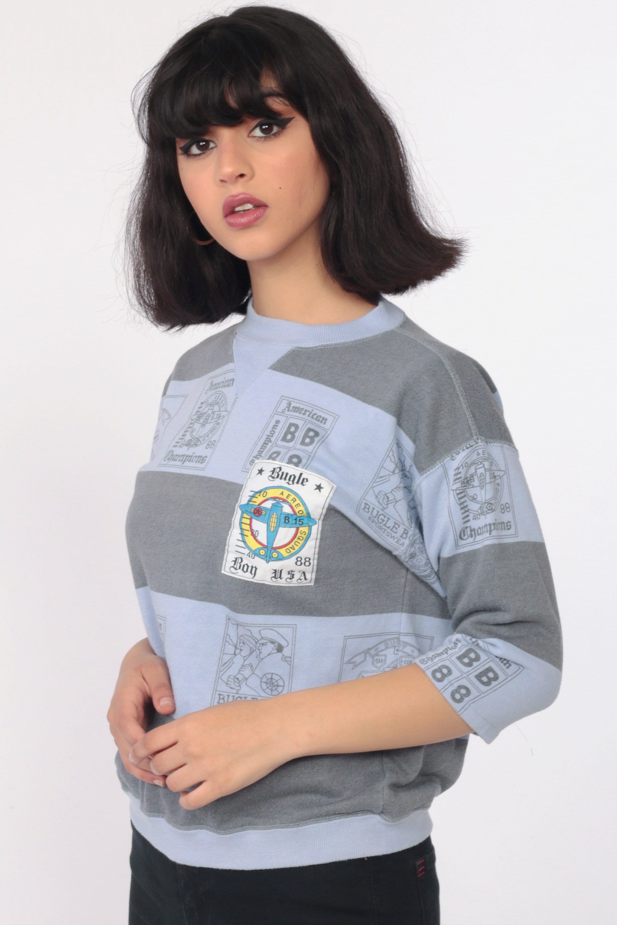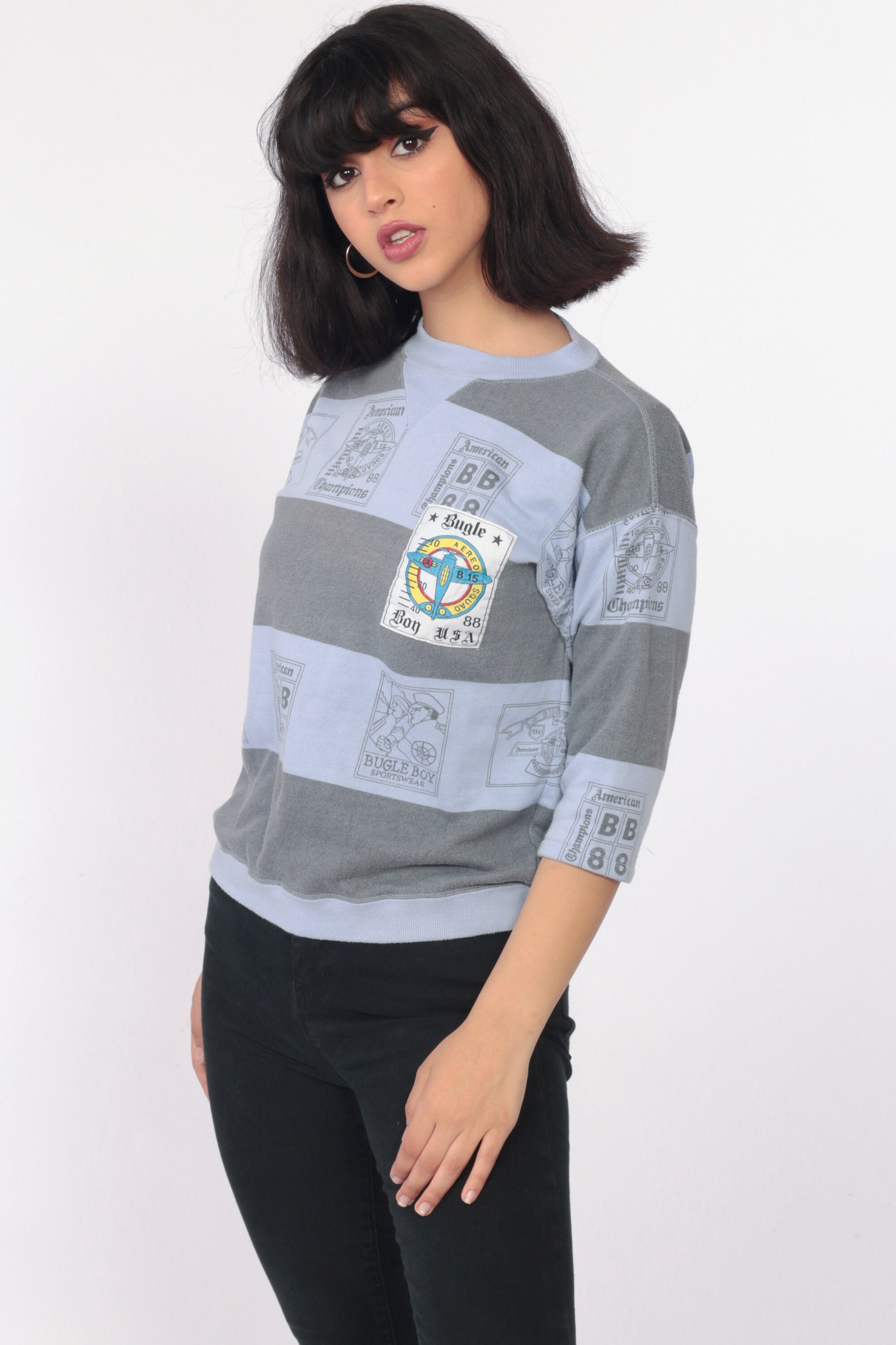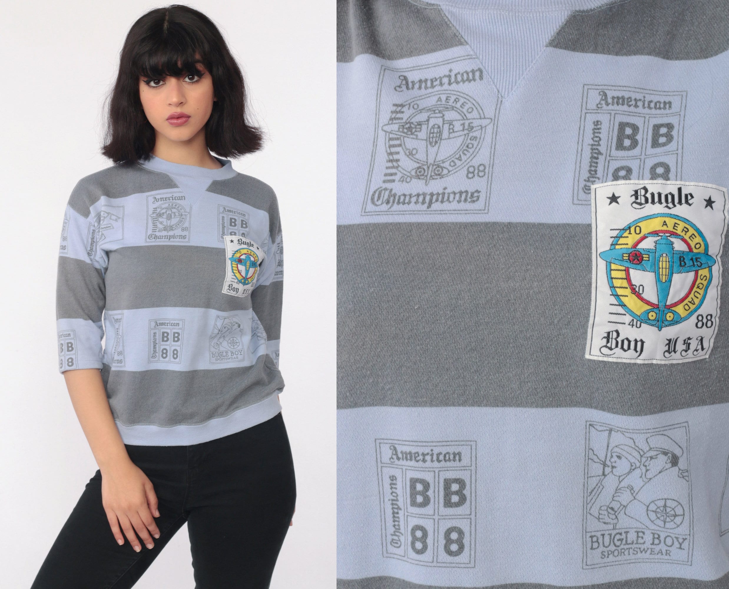 Vintage 80s sweatshirt by Bugle Boy in purple with an airplane print and grey stripes. Cropped sleeves.