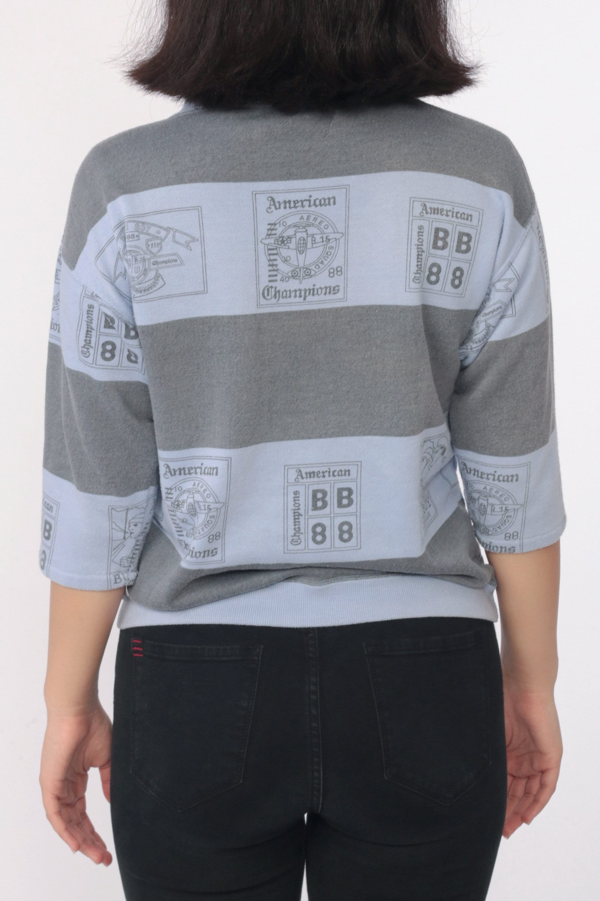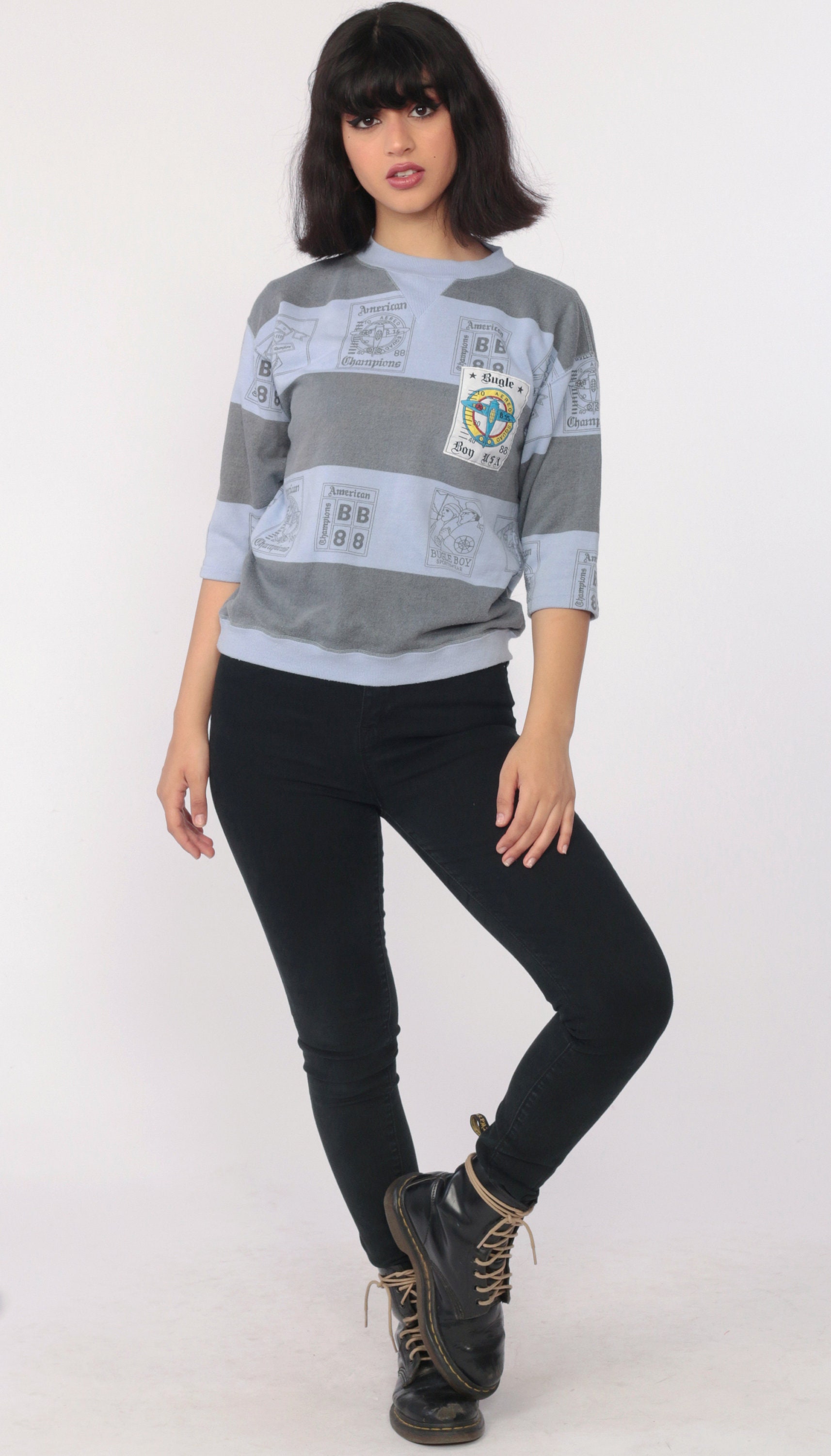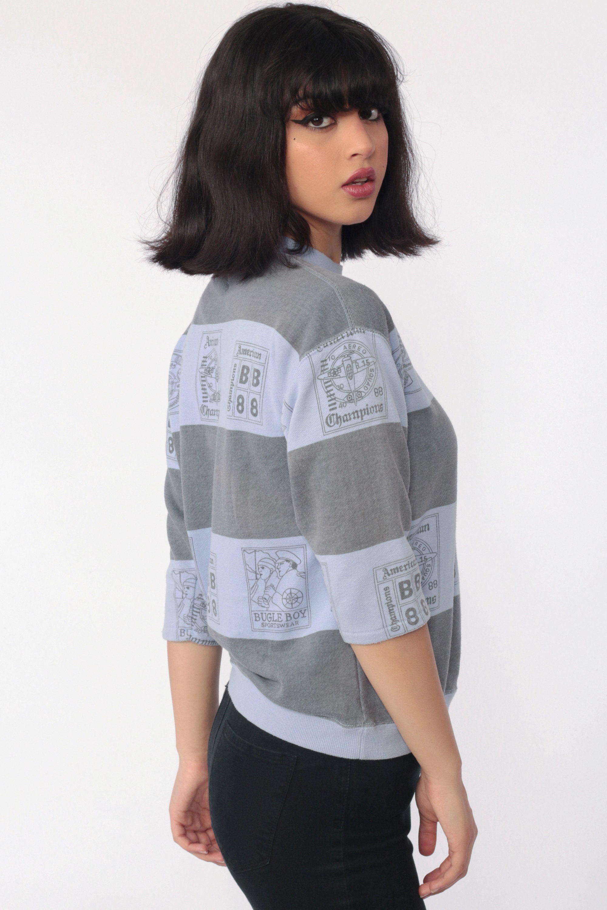 Vintage 80s sweatshirt by Bugle Boy in purple with an airplane print and grey stripes. Cropped sleeves.