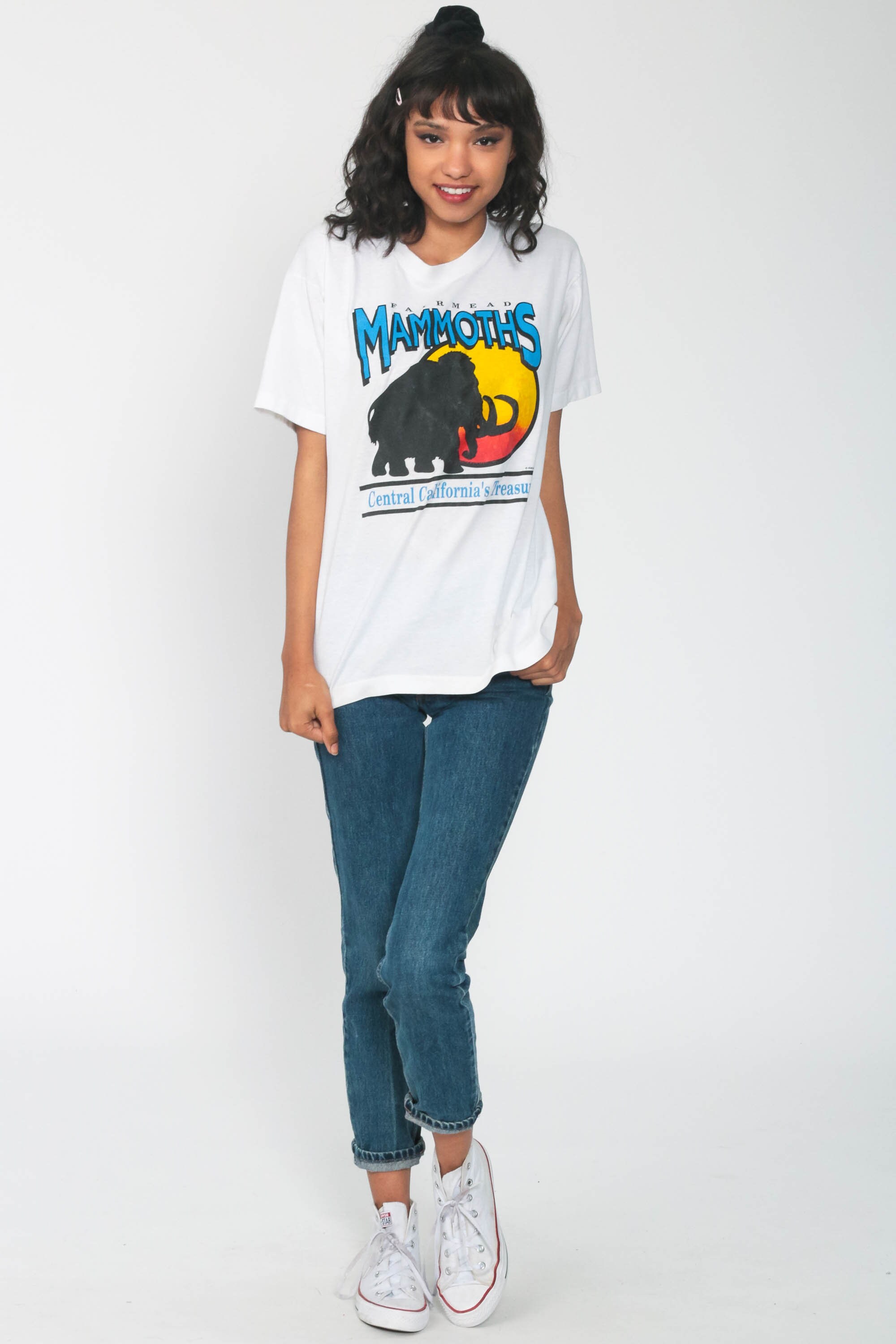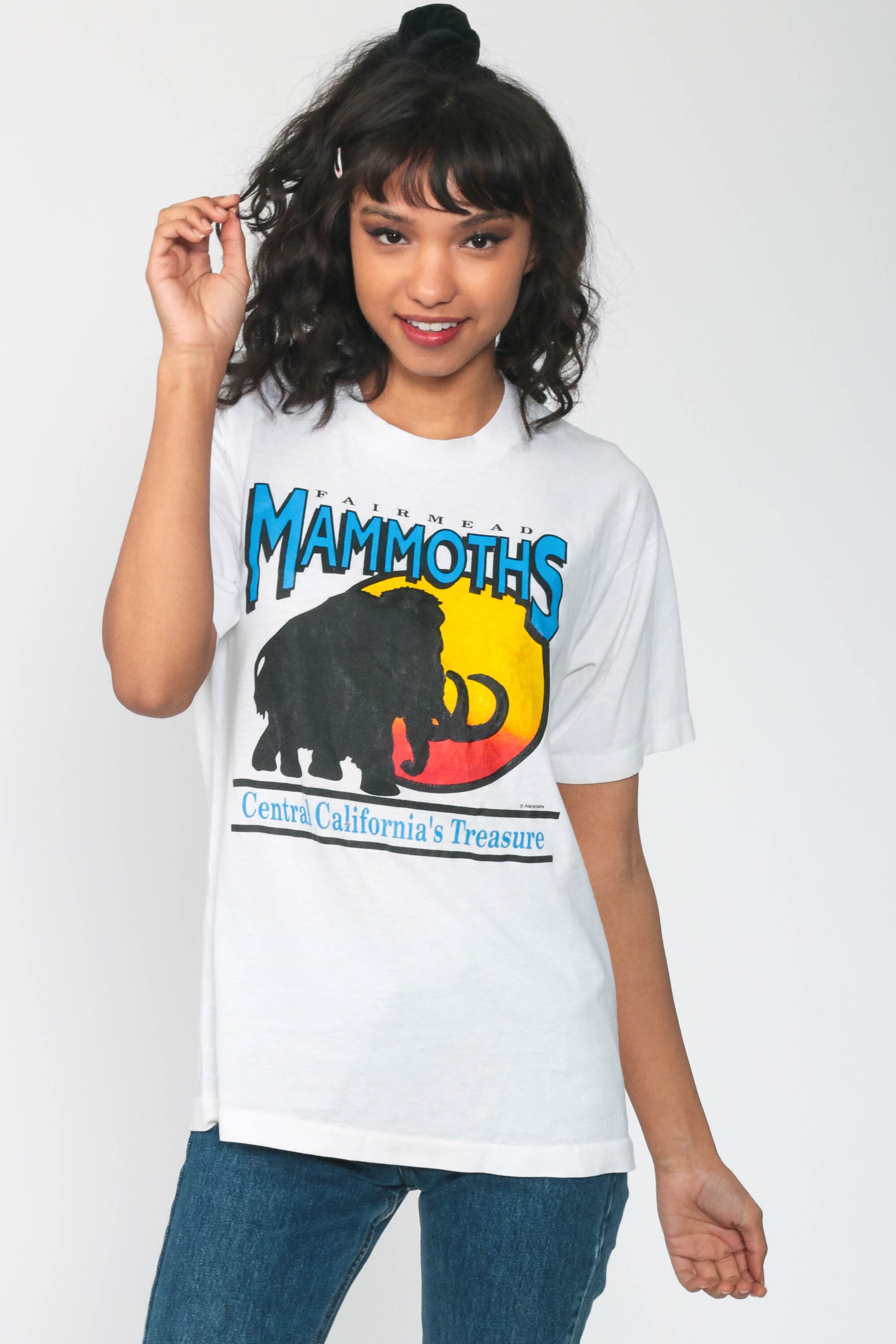 Vintage 80s t shirt with a Fairmead Mammoths print. Single Stitch hem.