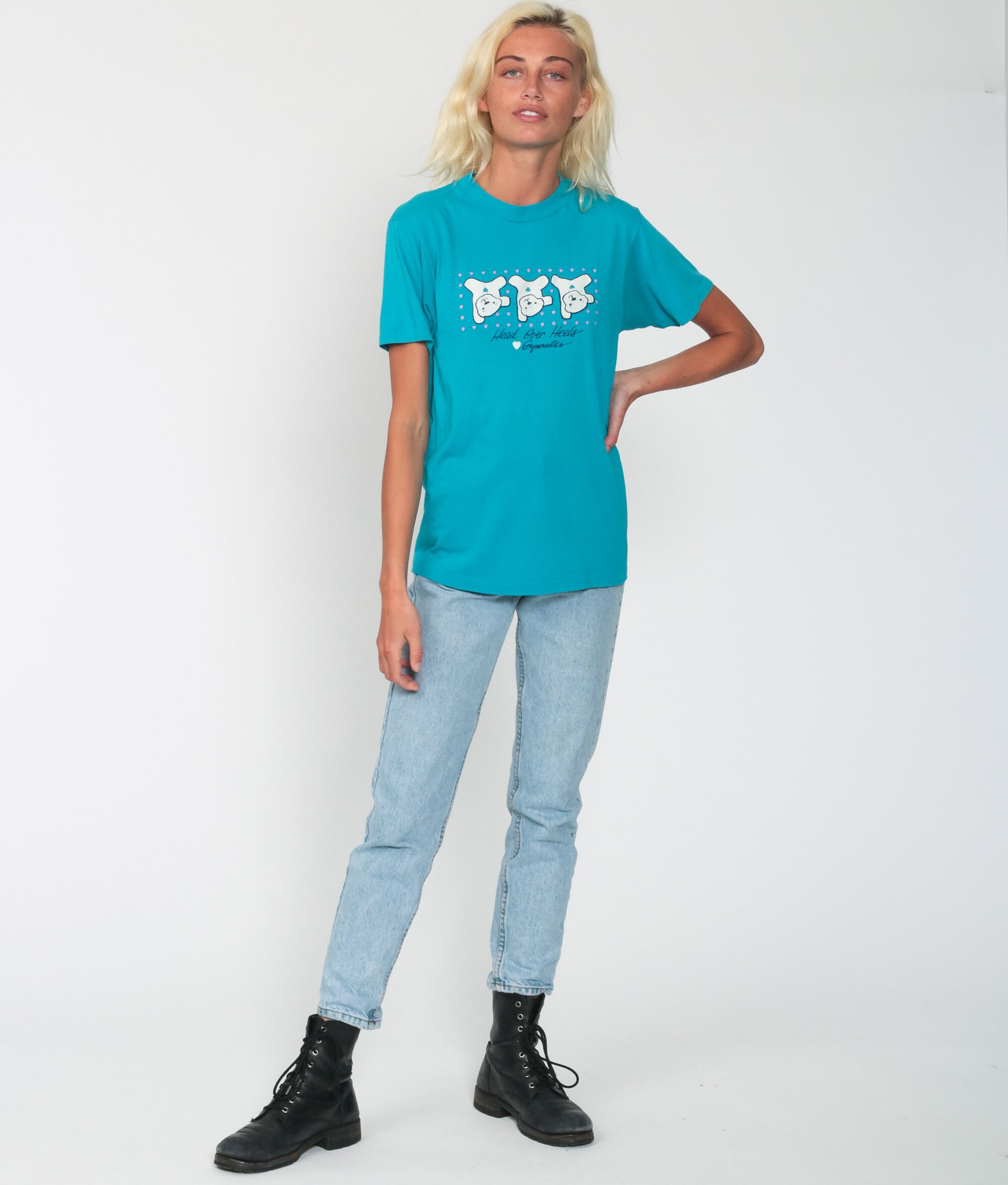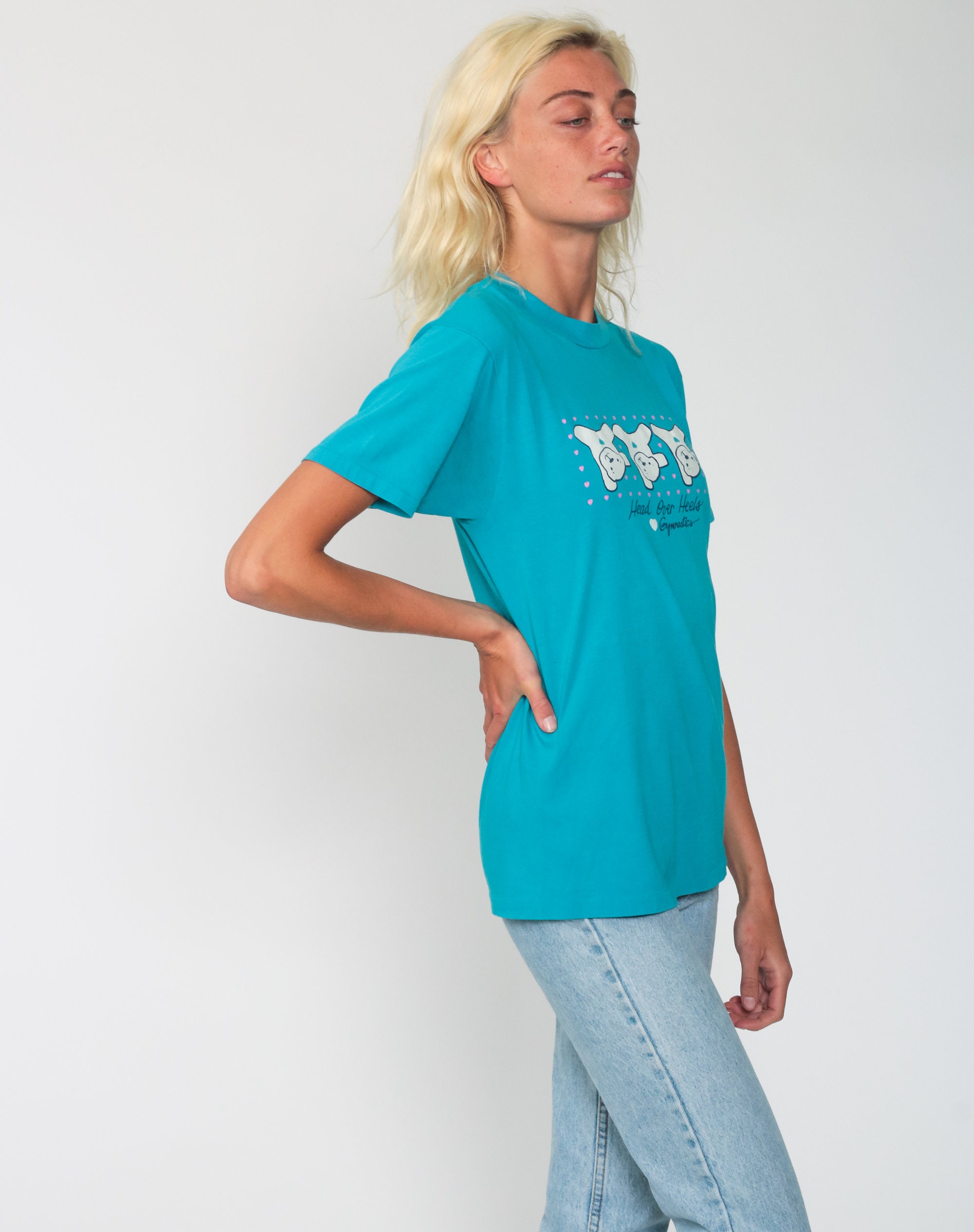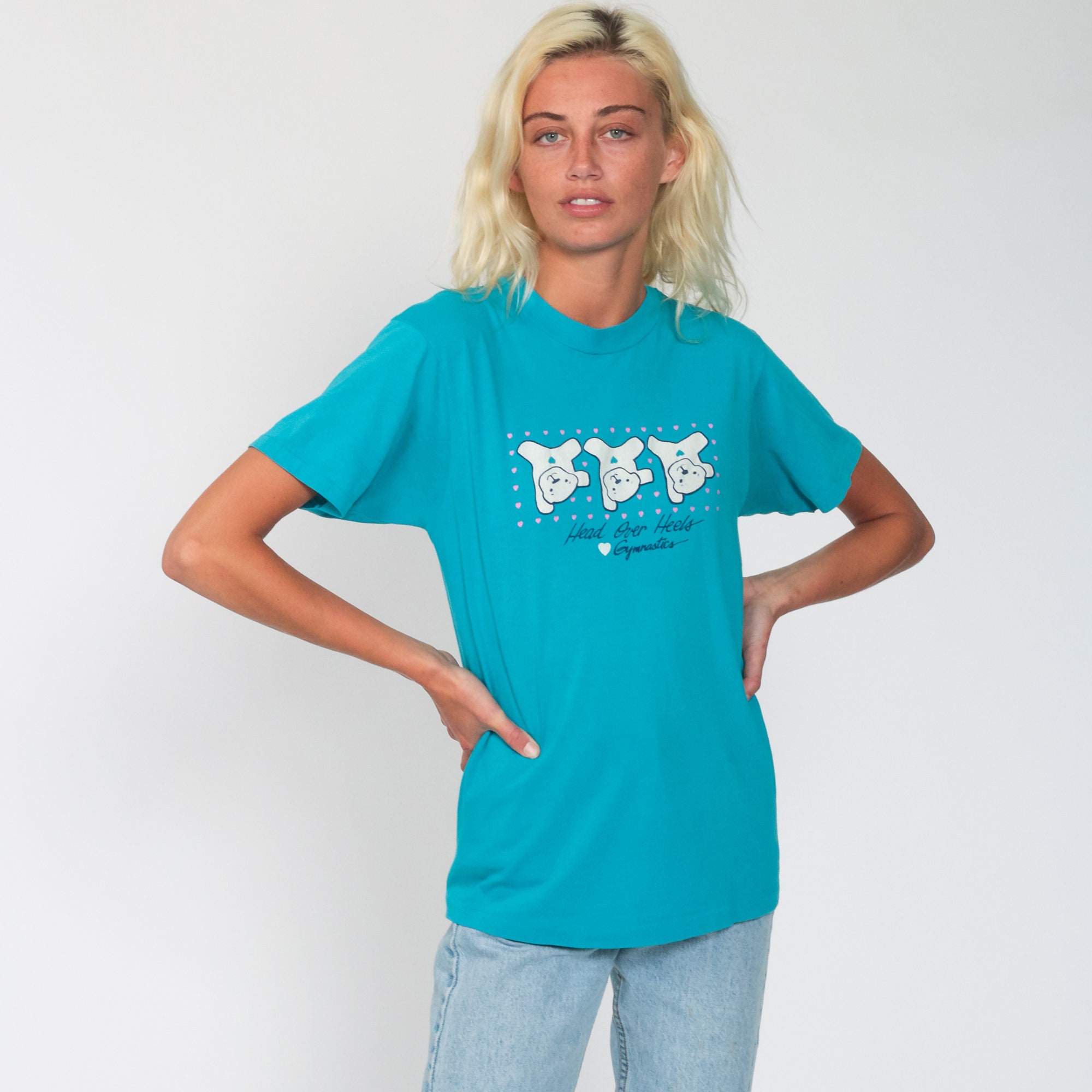 Vintage 80s t shirt with a gymnastic teddy bear print.