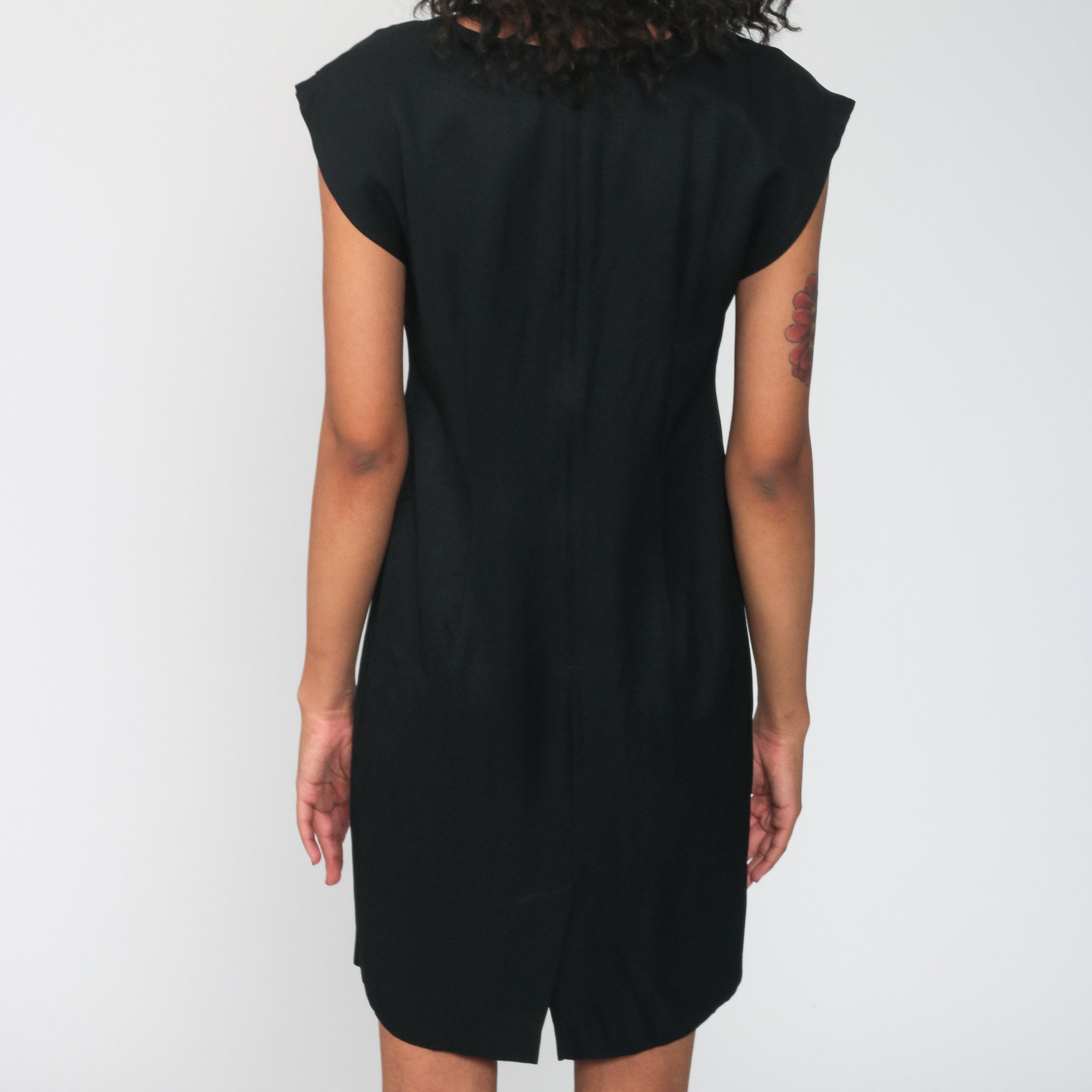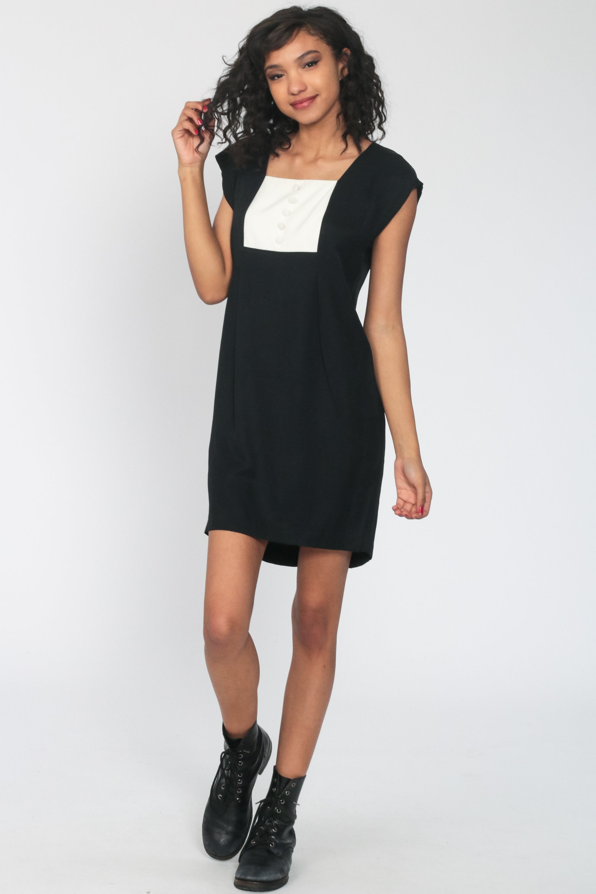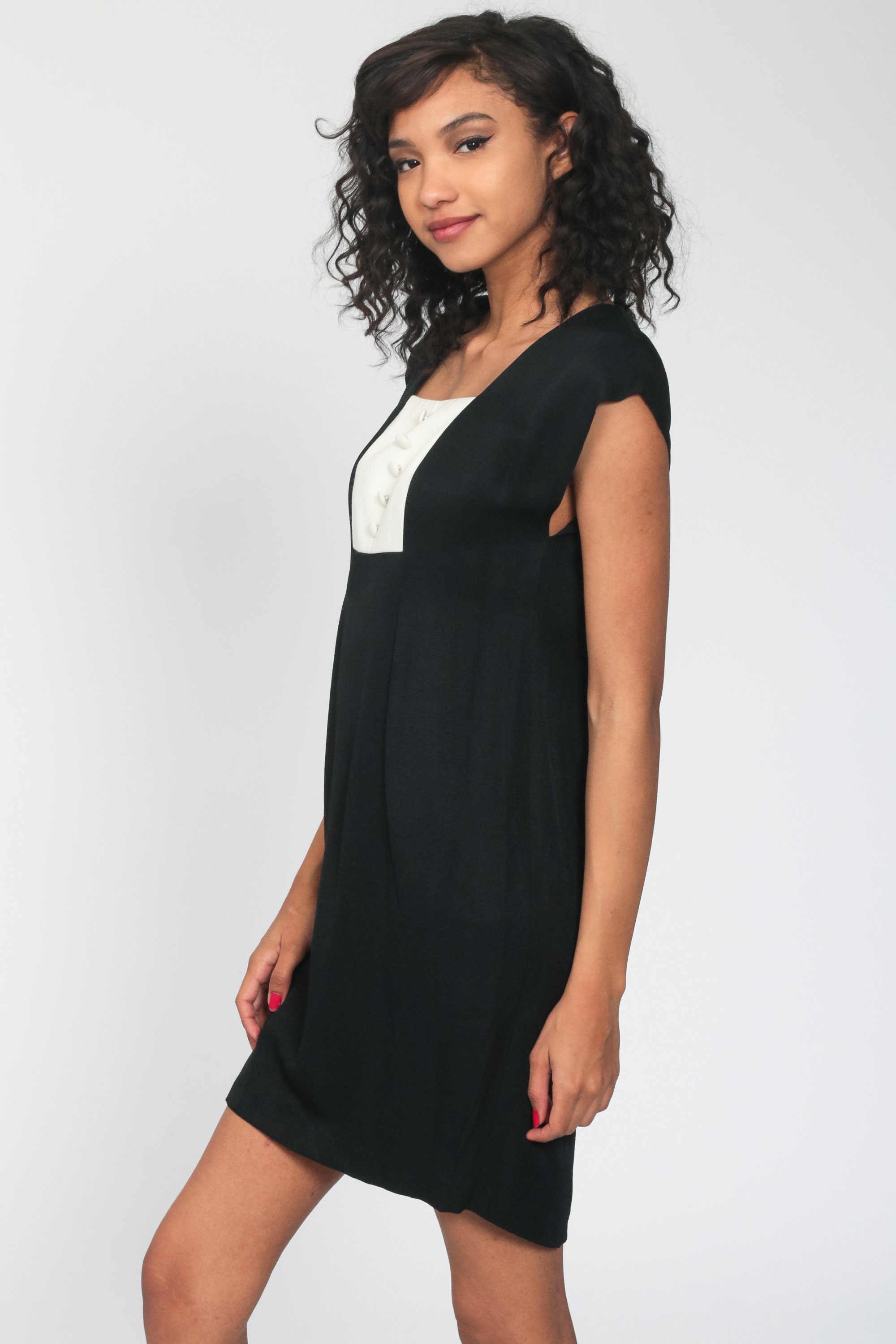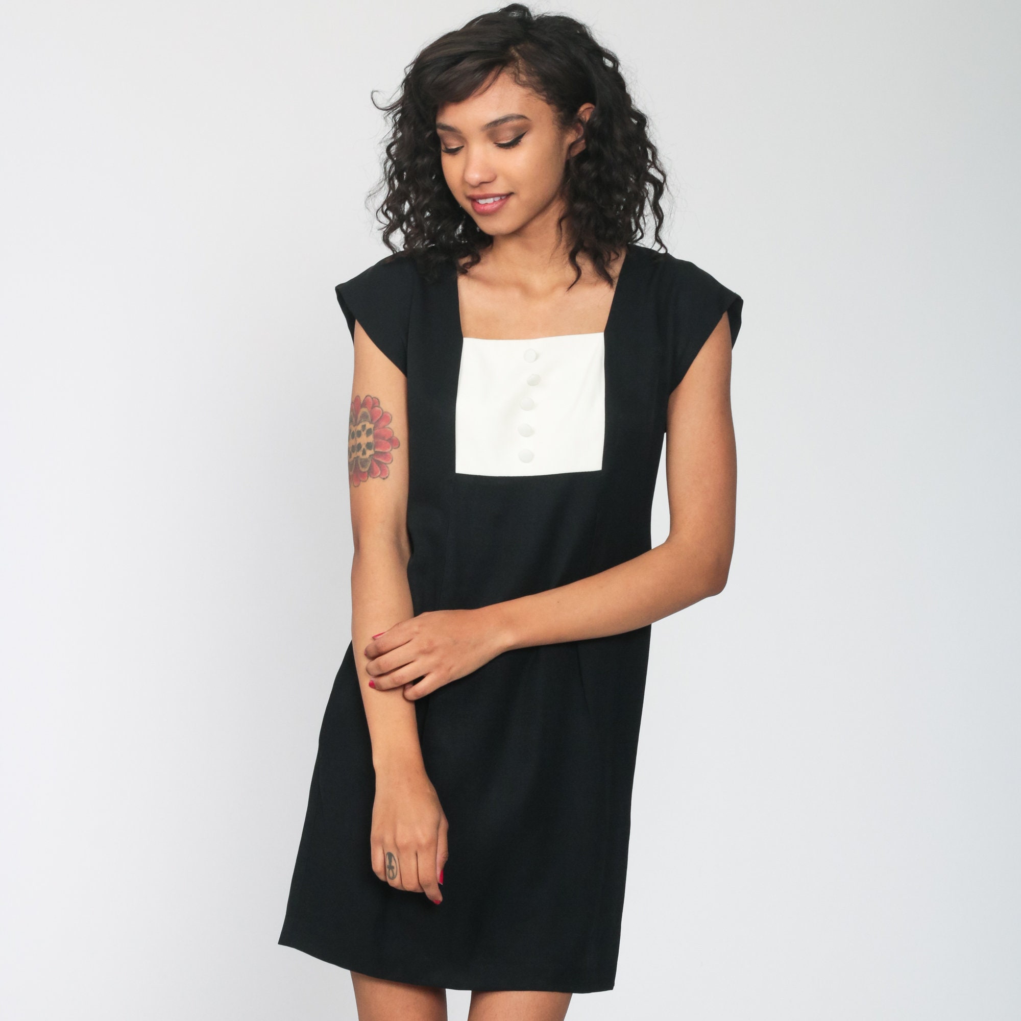Vintage 90s dress in black with an off-white bib and cap sleeves. Sheath cut.