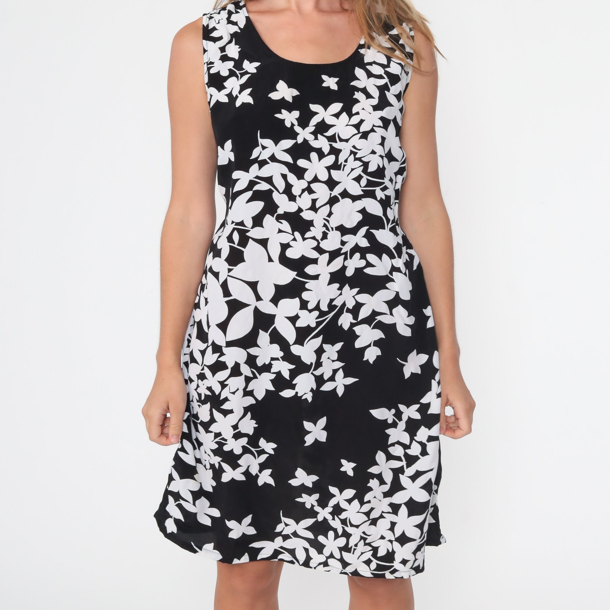 Vintage 90s dress in black with a white floral print. Sleeveless shift cut with an attached belt, mini length.