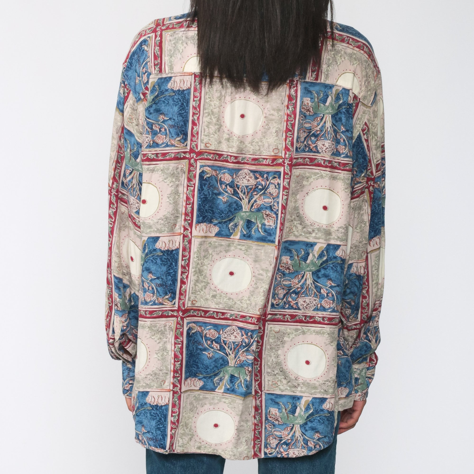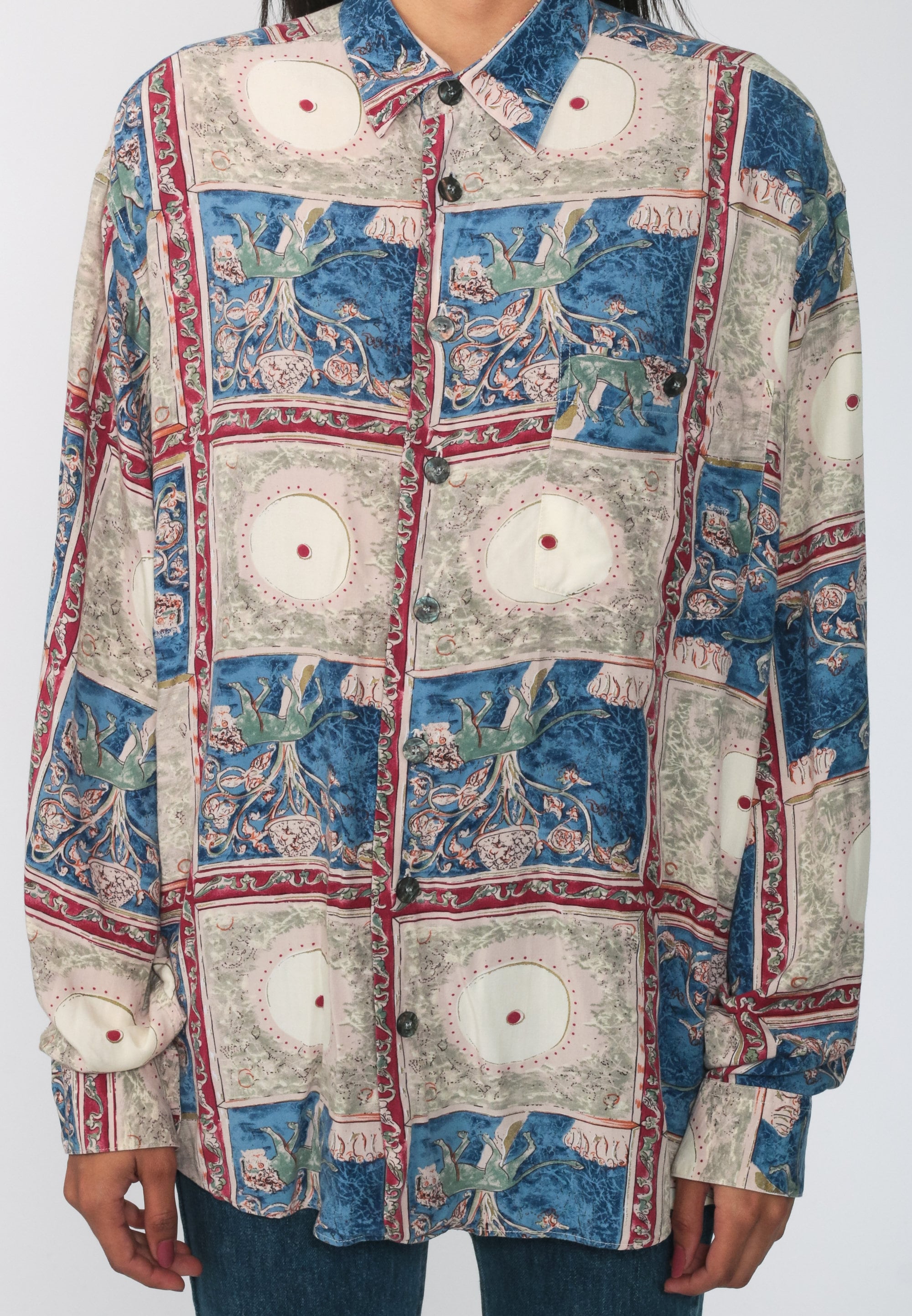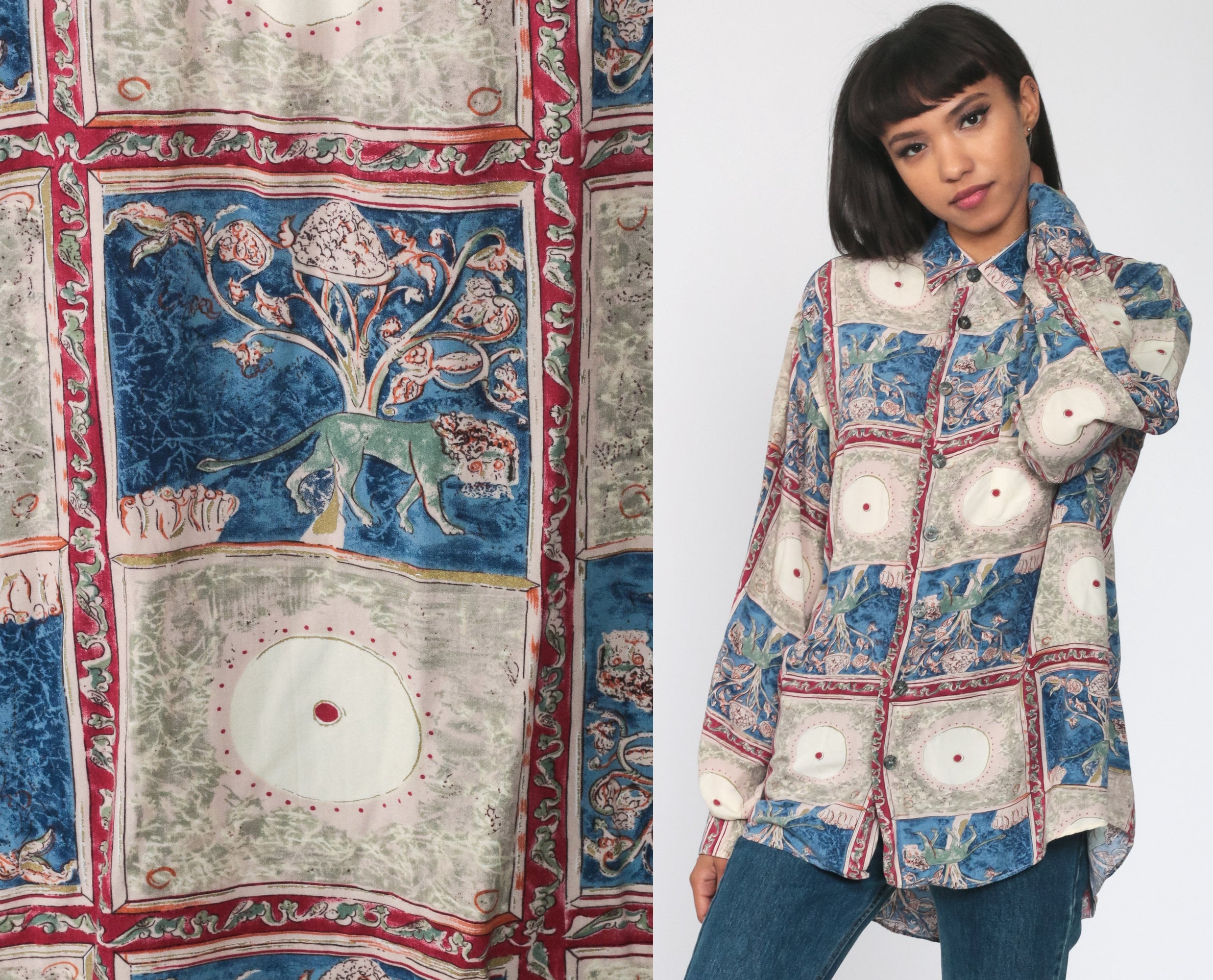 Vintage 90s shirt with a lion print. Buttons up the front with long sleeves. Originally for men.