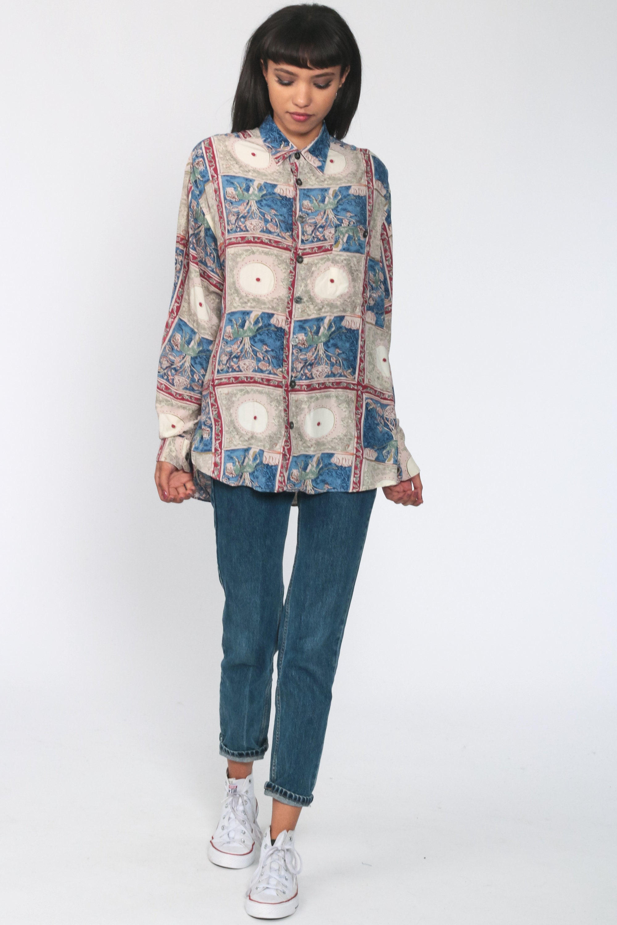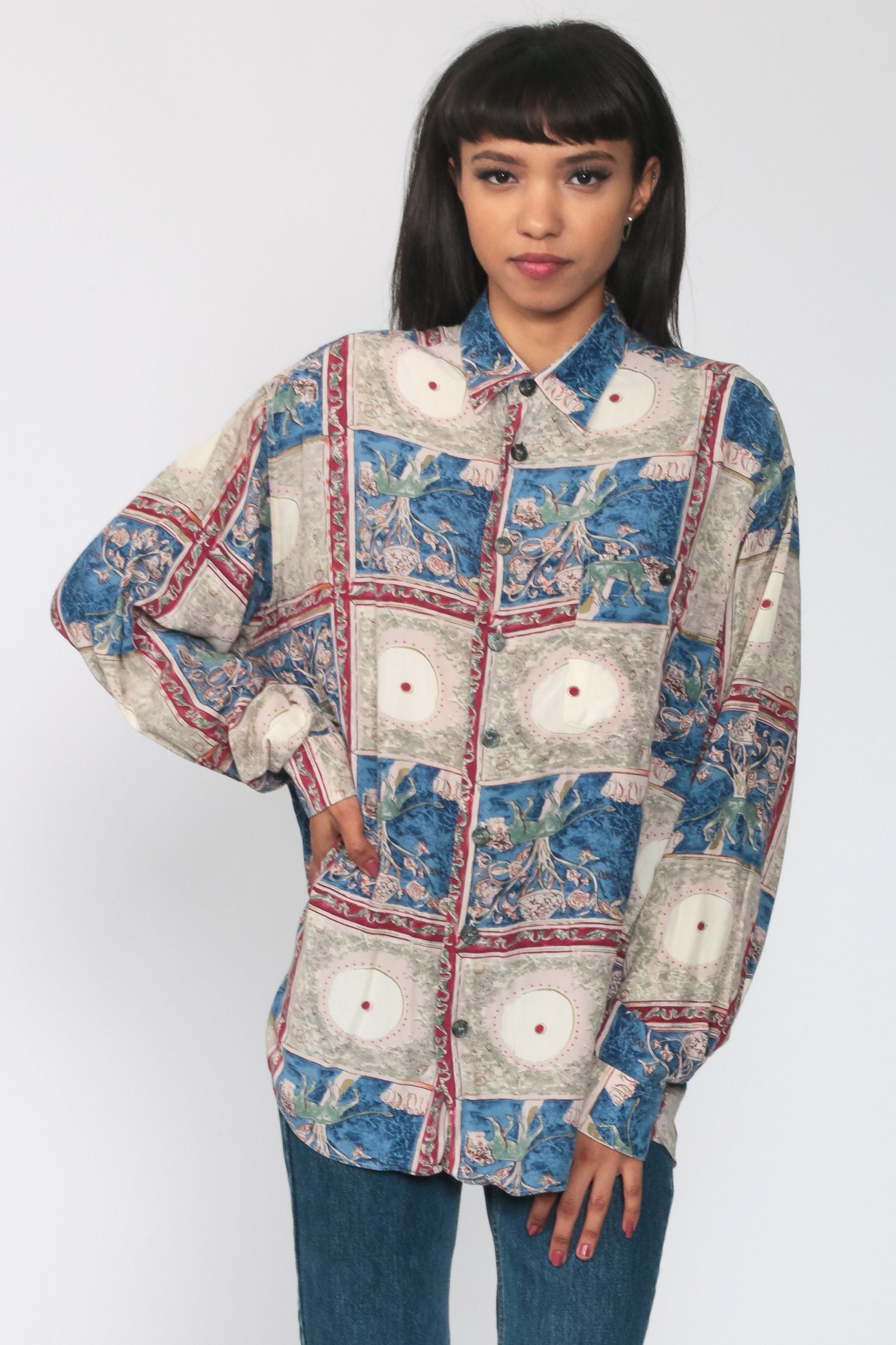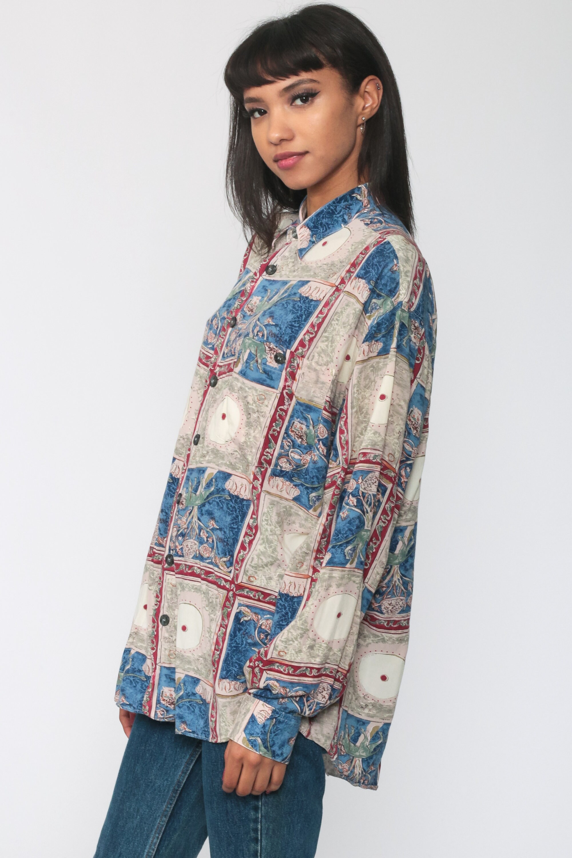 Vintage 90s shirt with a lion print. Buttons up the front with long sleeves. Originally for men.