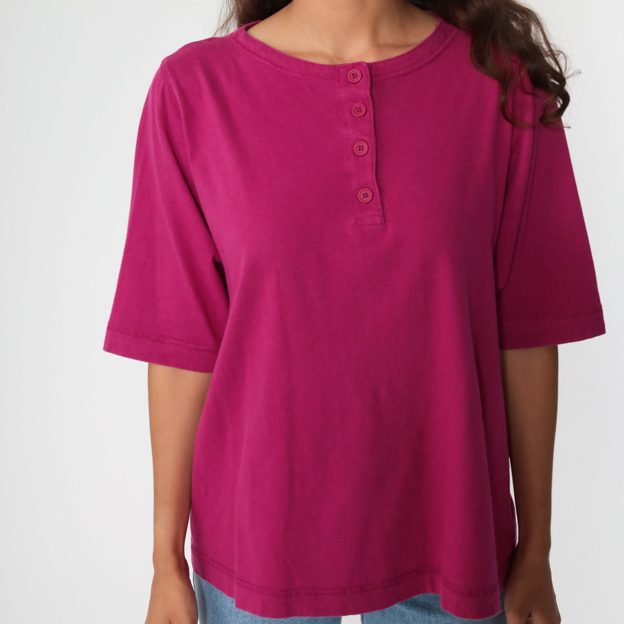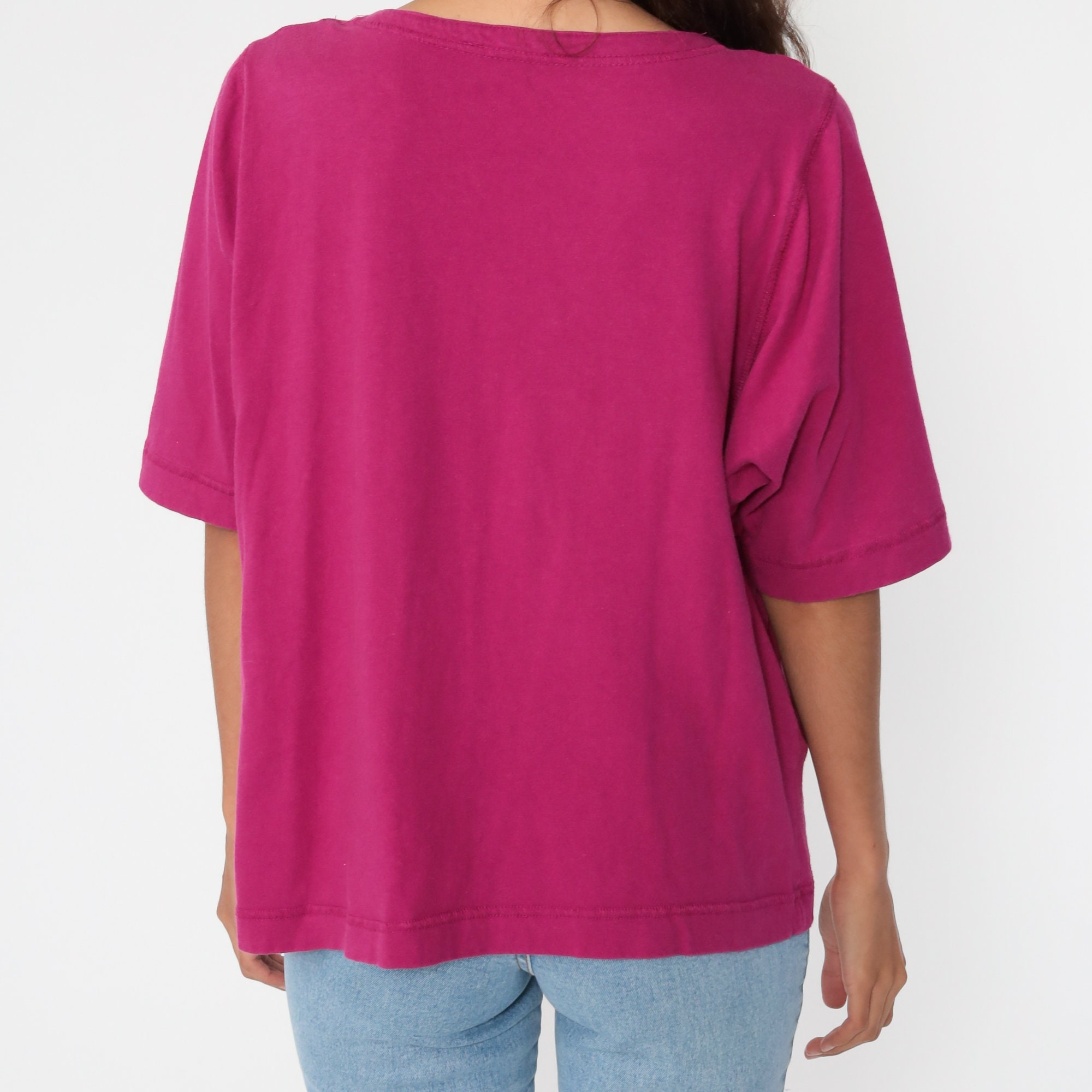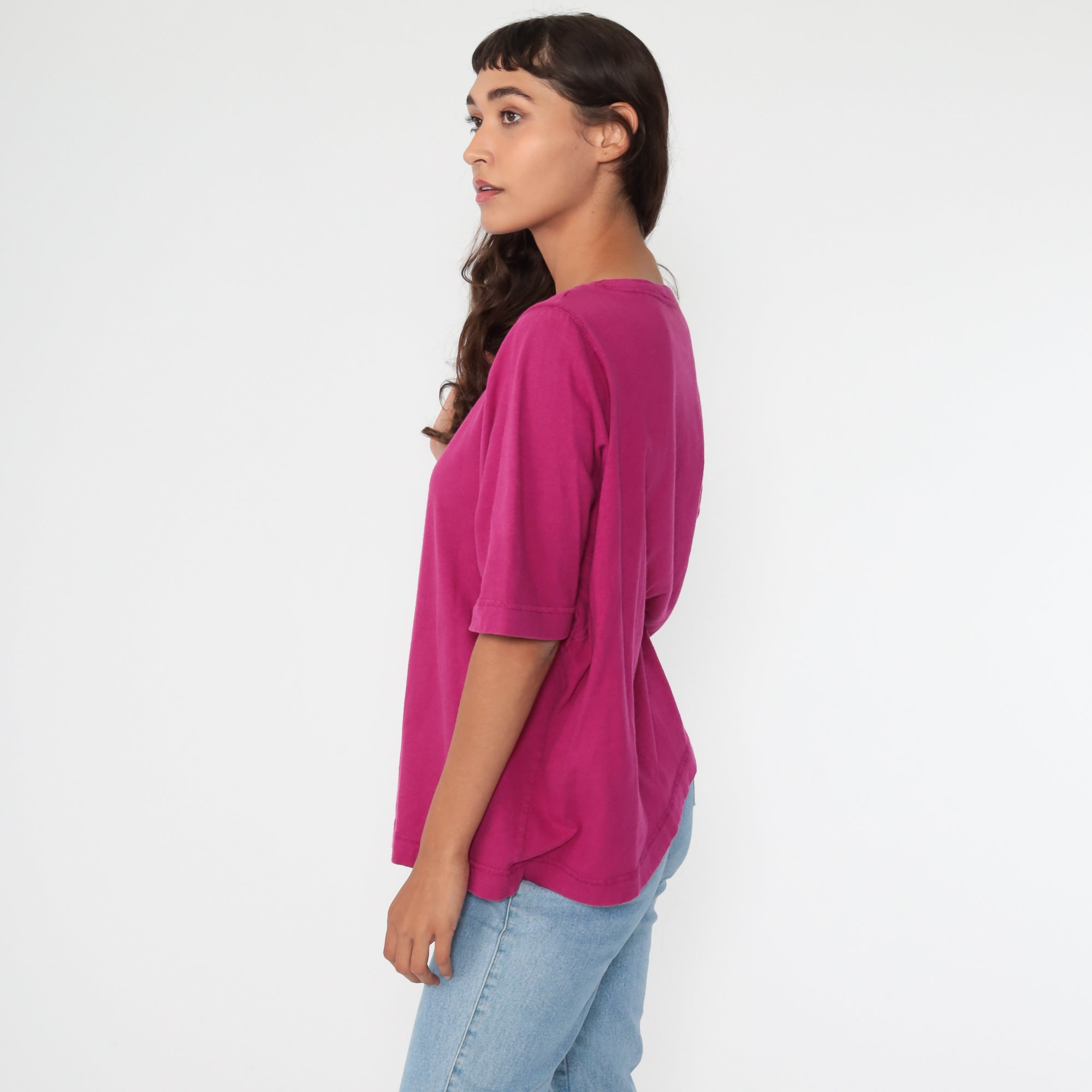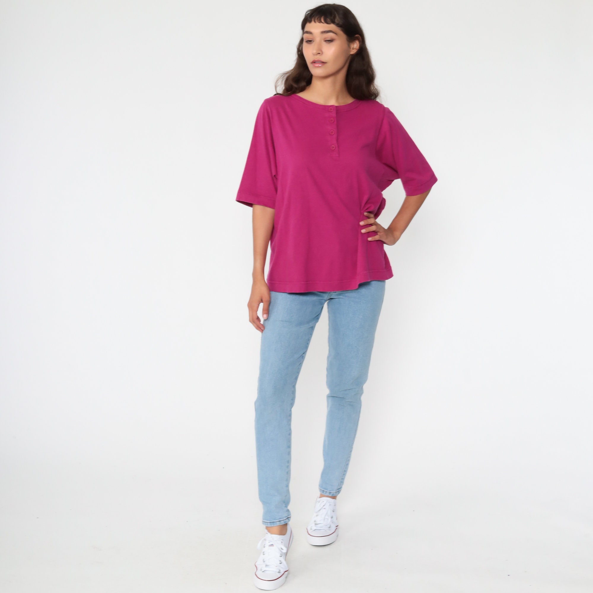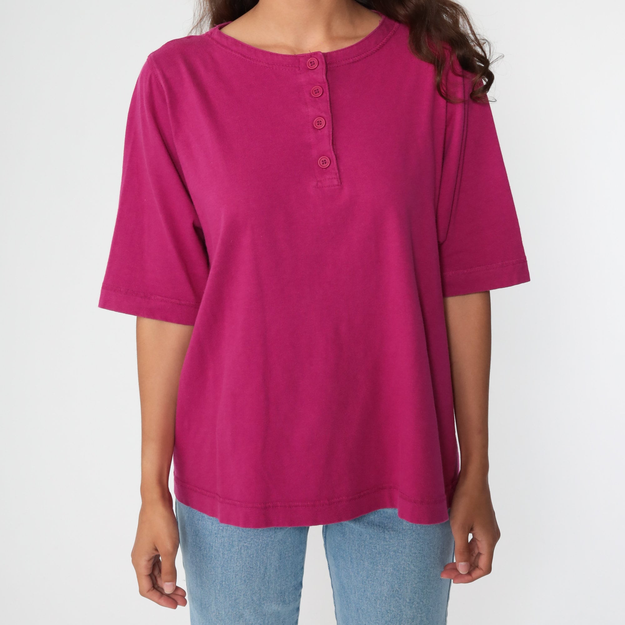 Vintage 80s 90s shirt in deep pink with buttons up the chest and short sleeves.