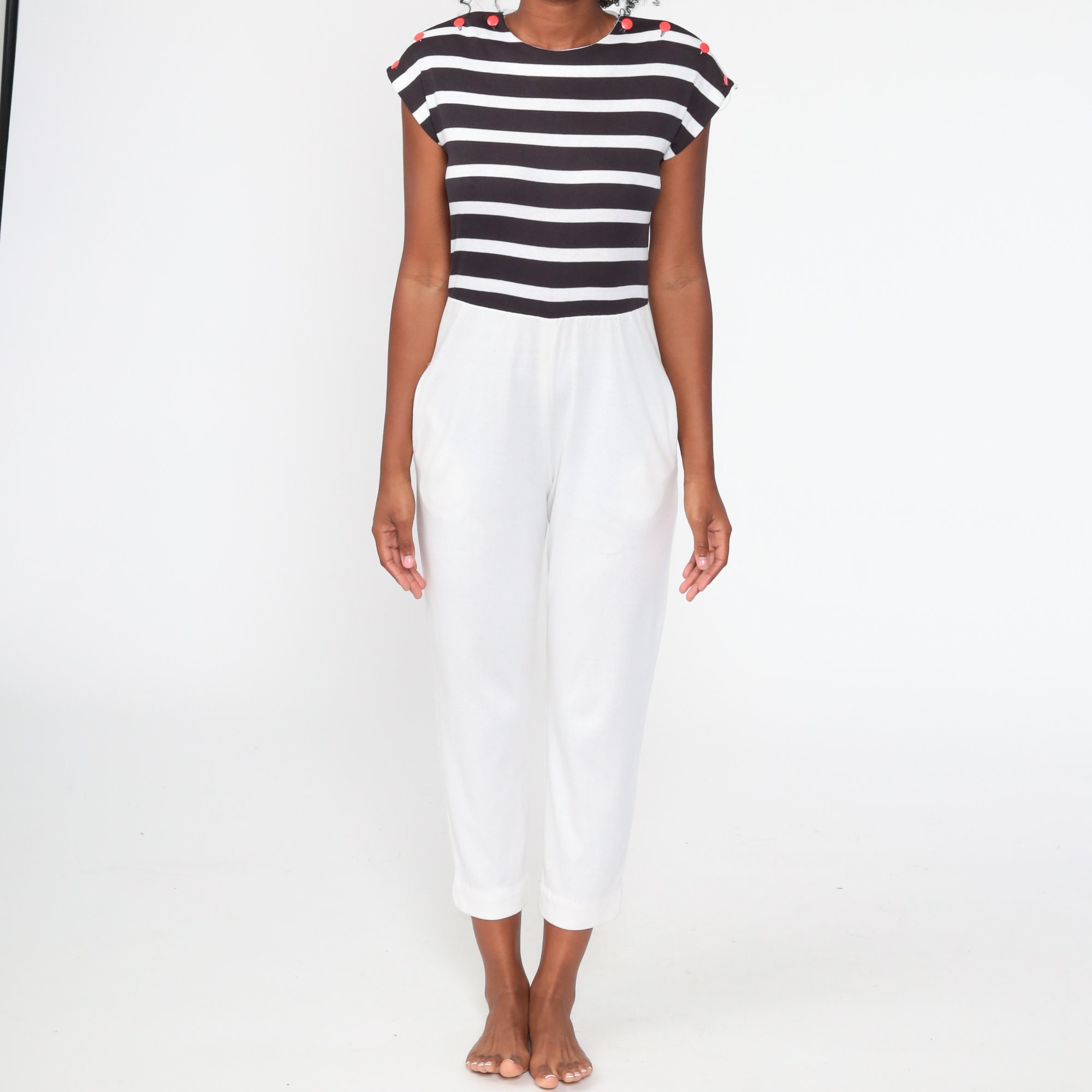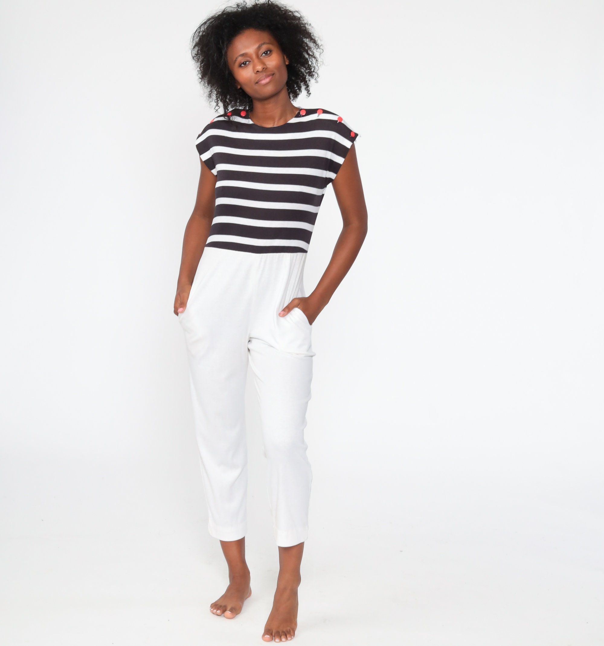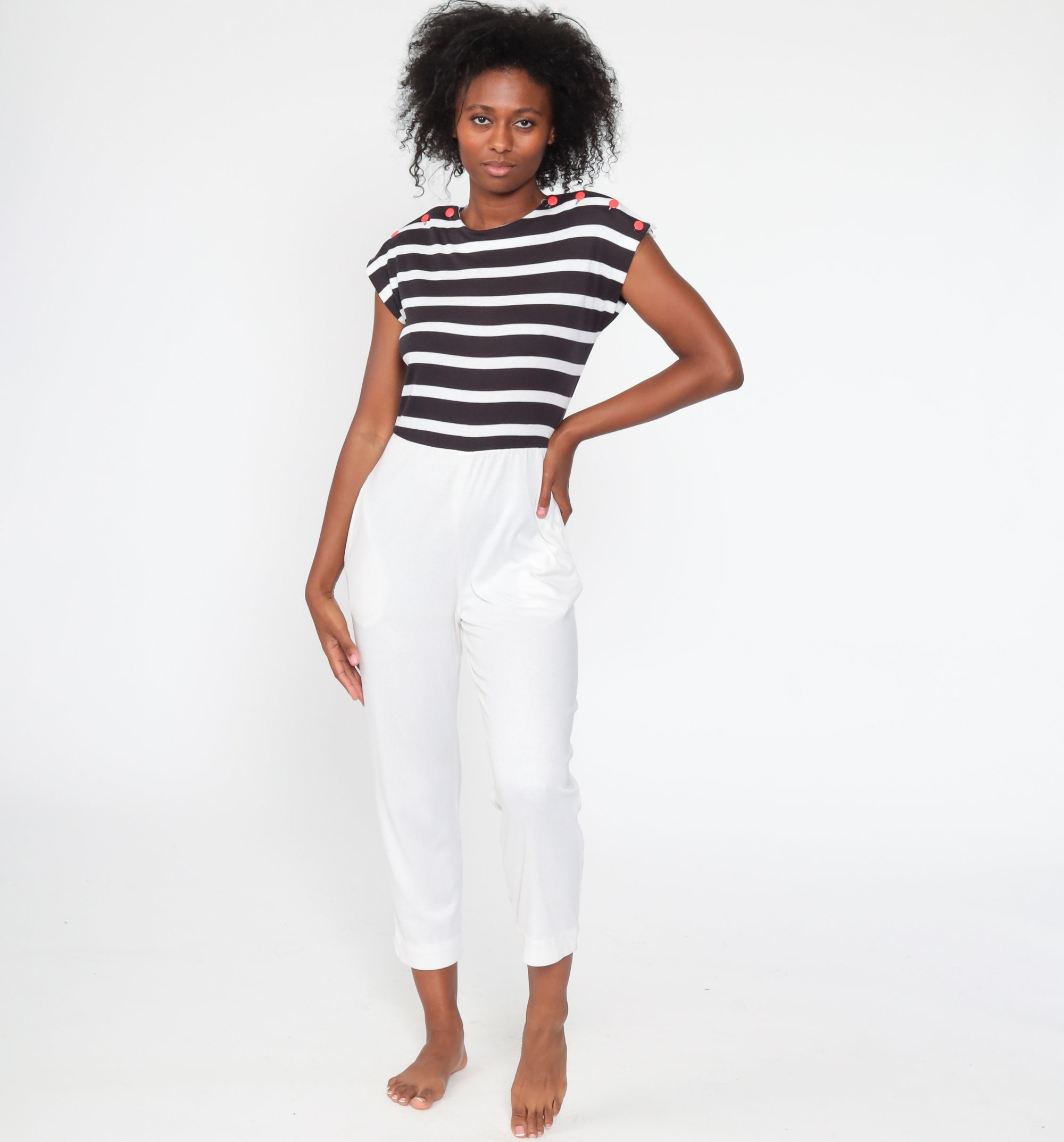 Vintage 80s jumpsuit with a striped bodice and white tapered legs.