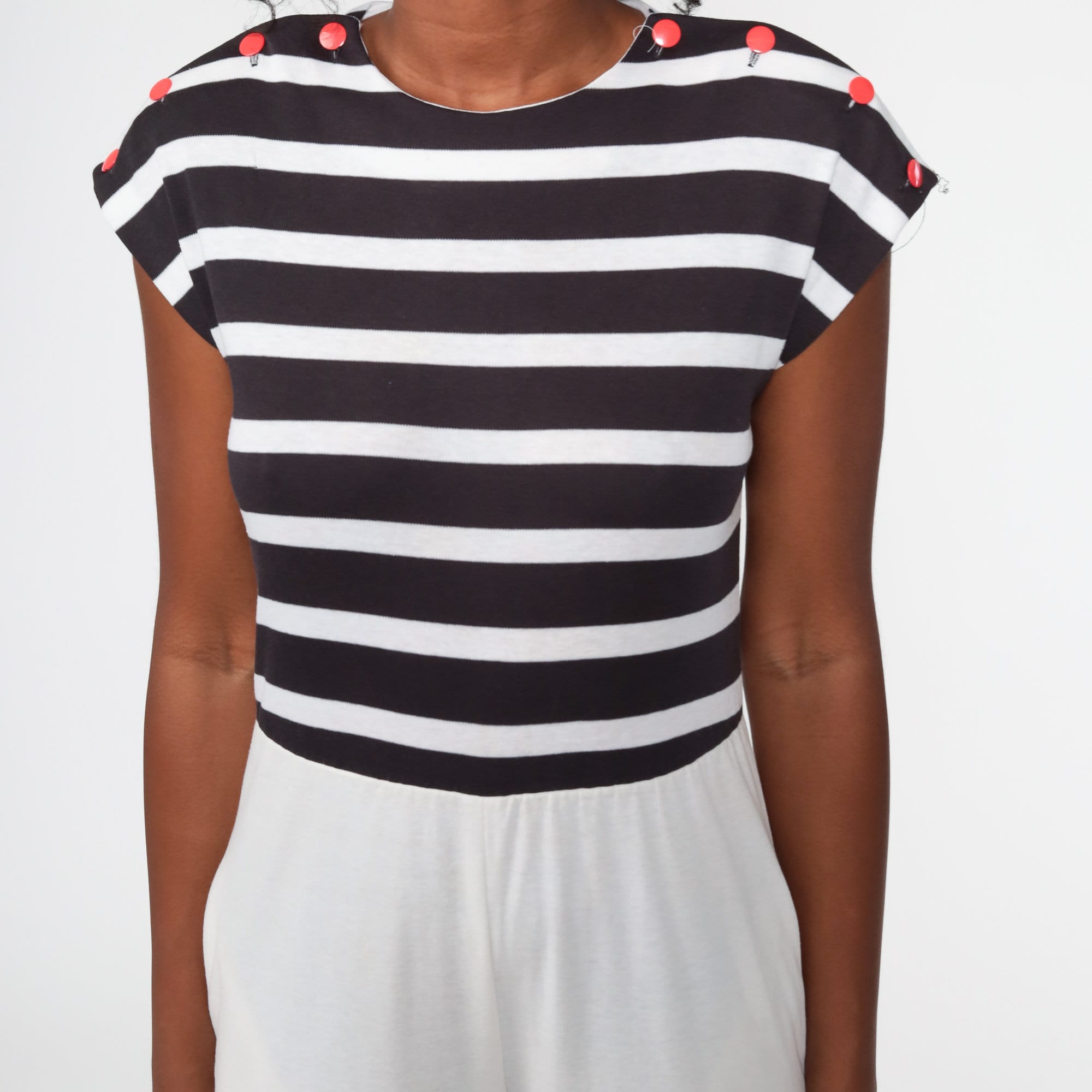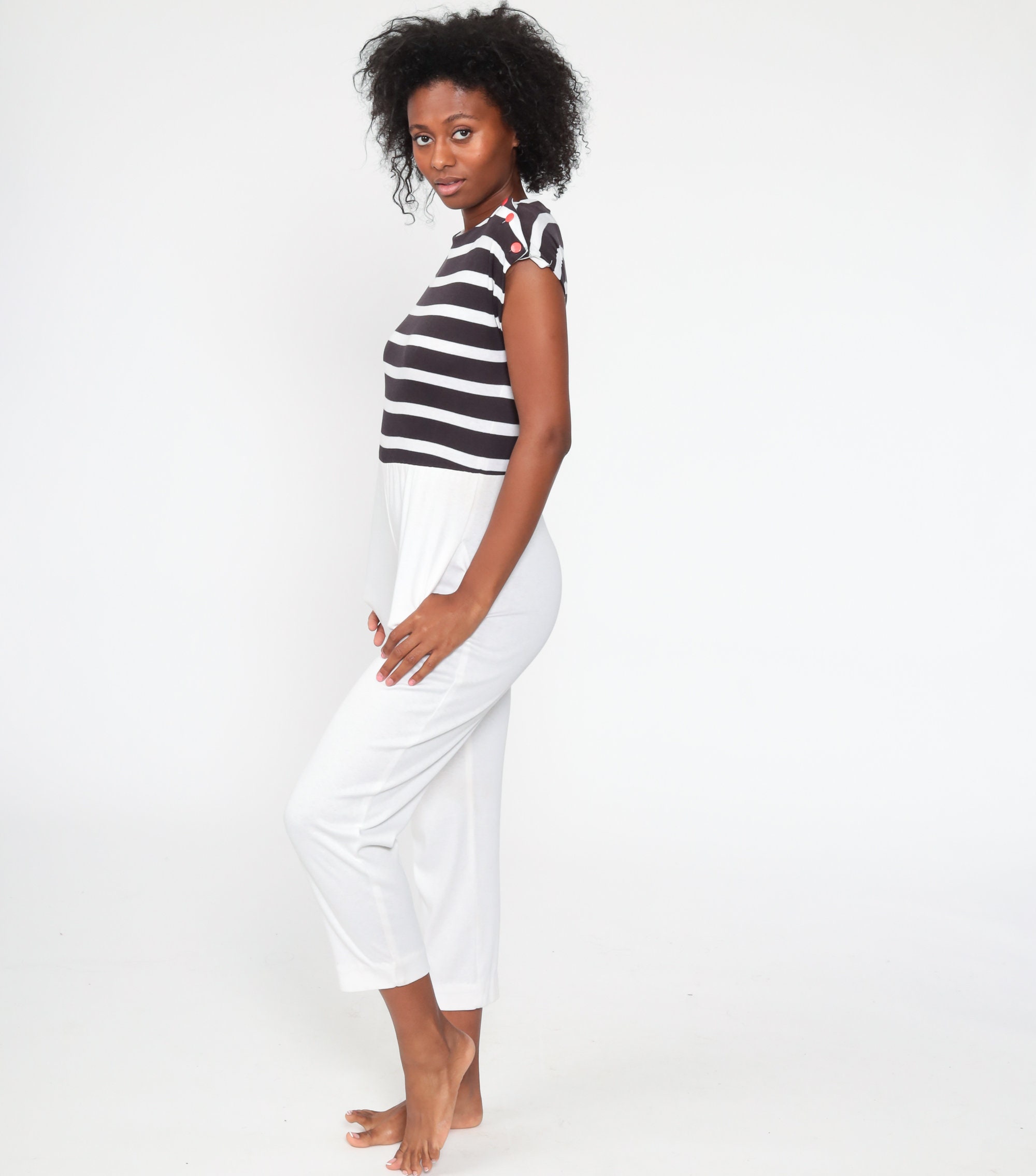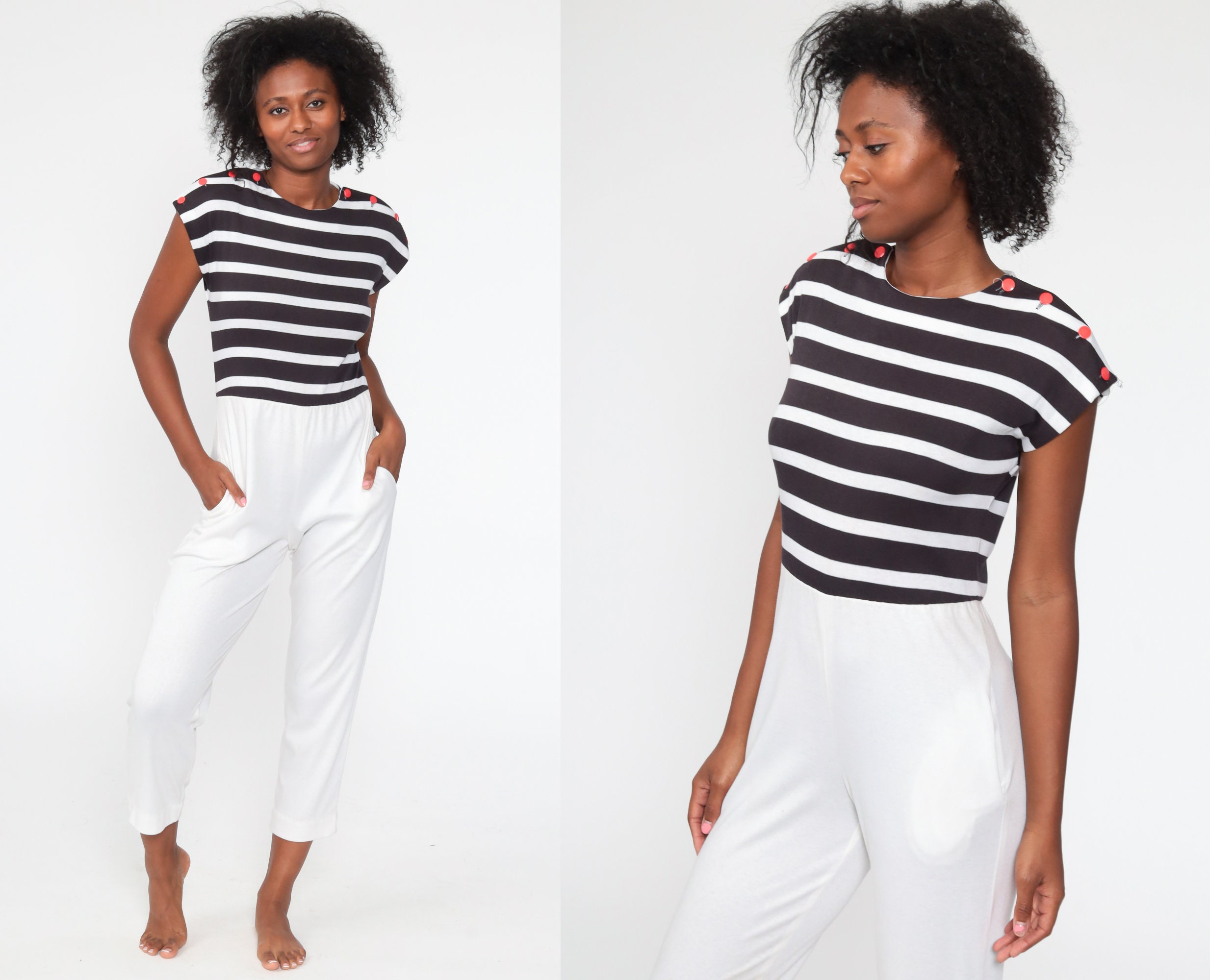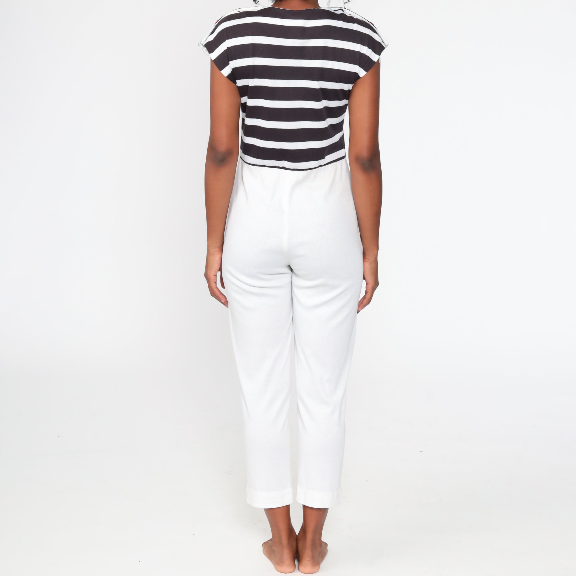 Vintage 80s jumpsuit with a striped bodice and white tapered legs.