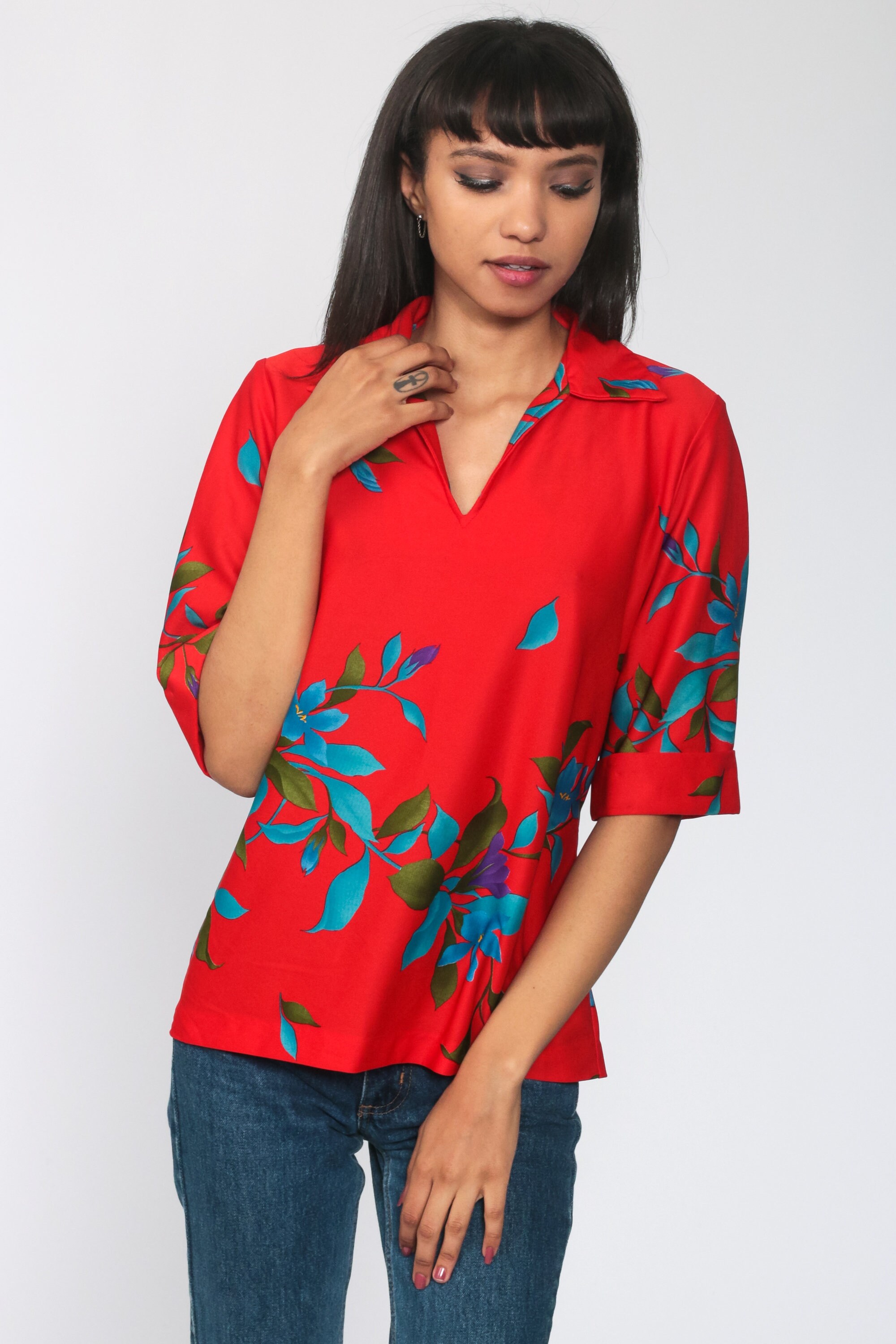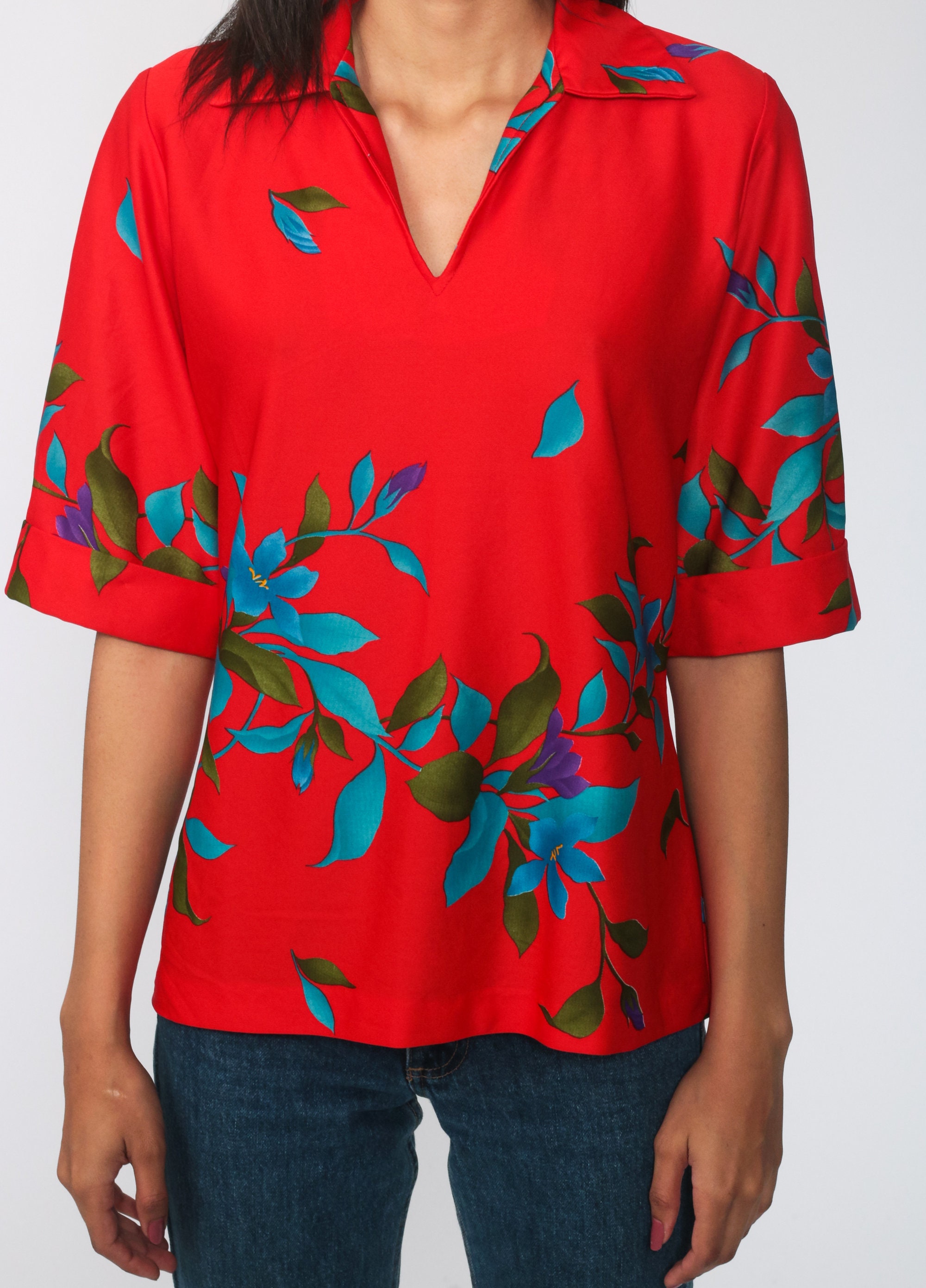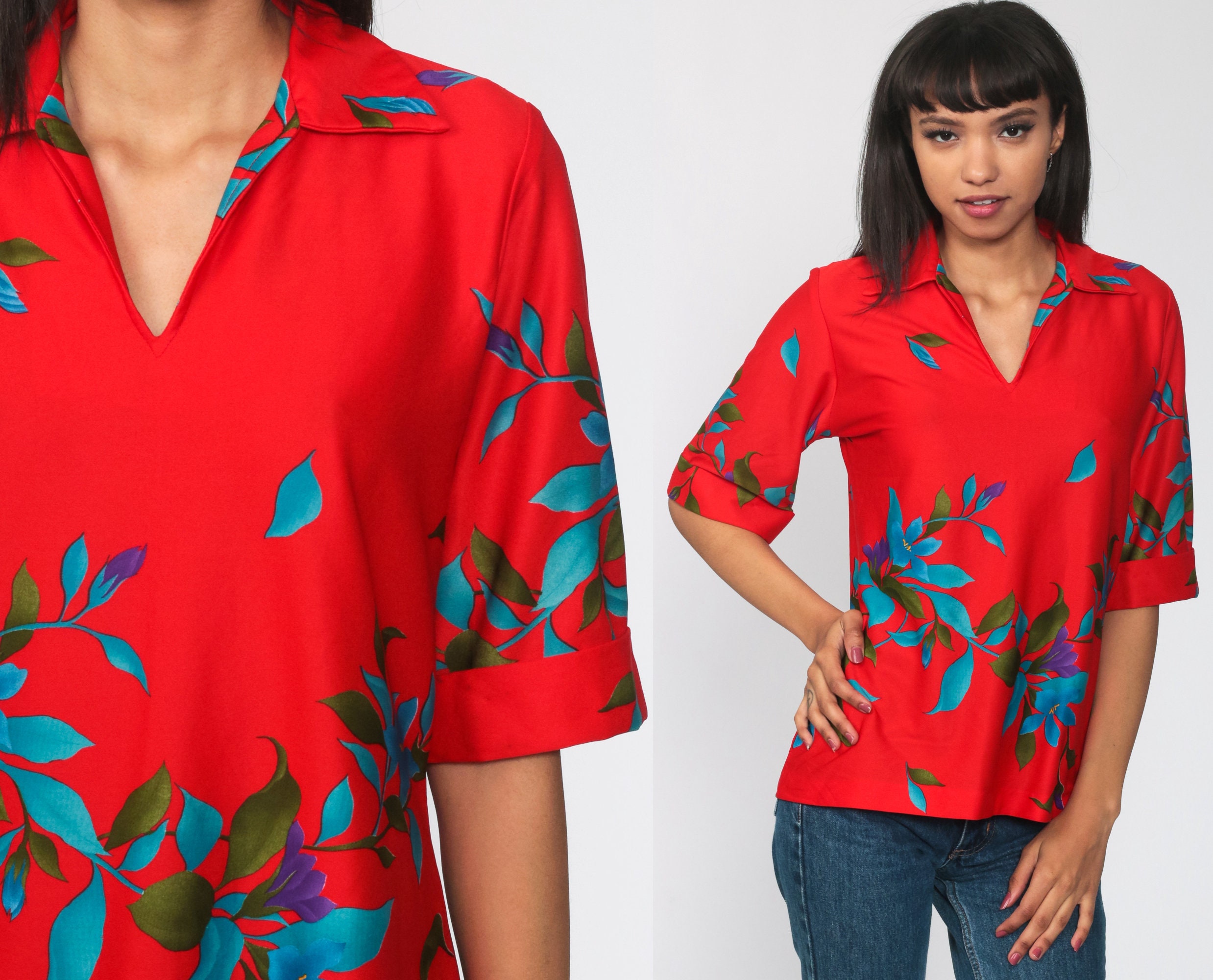 Vintage 70s blouse in red with a floral print and a pointed collar.