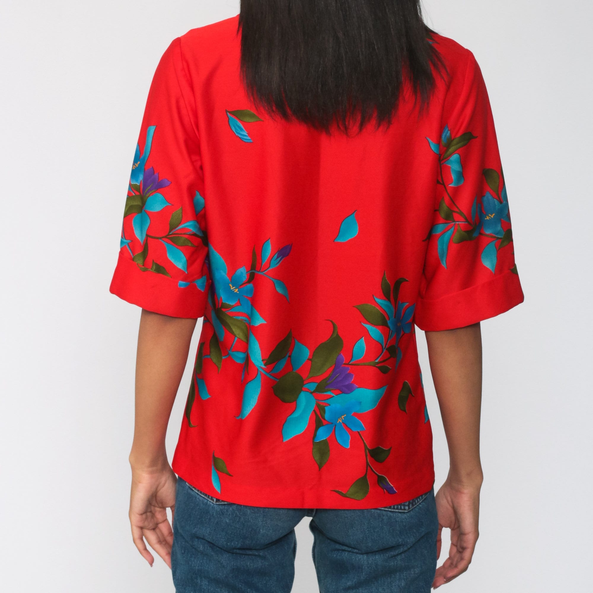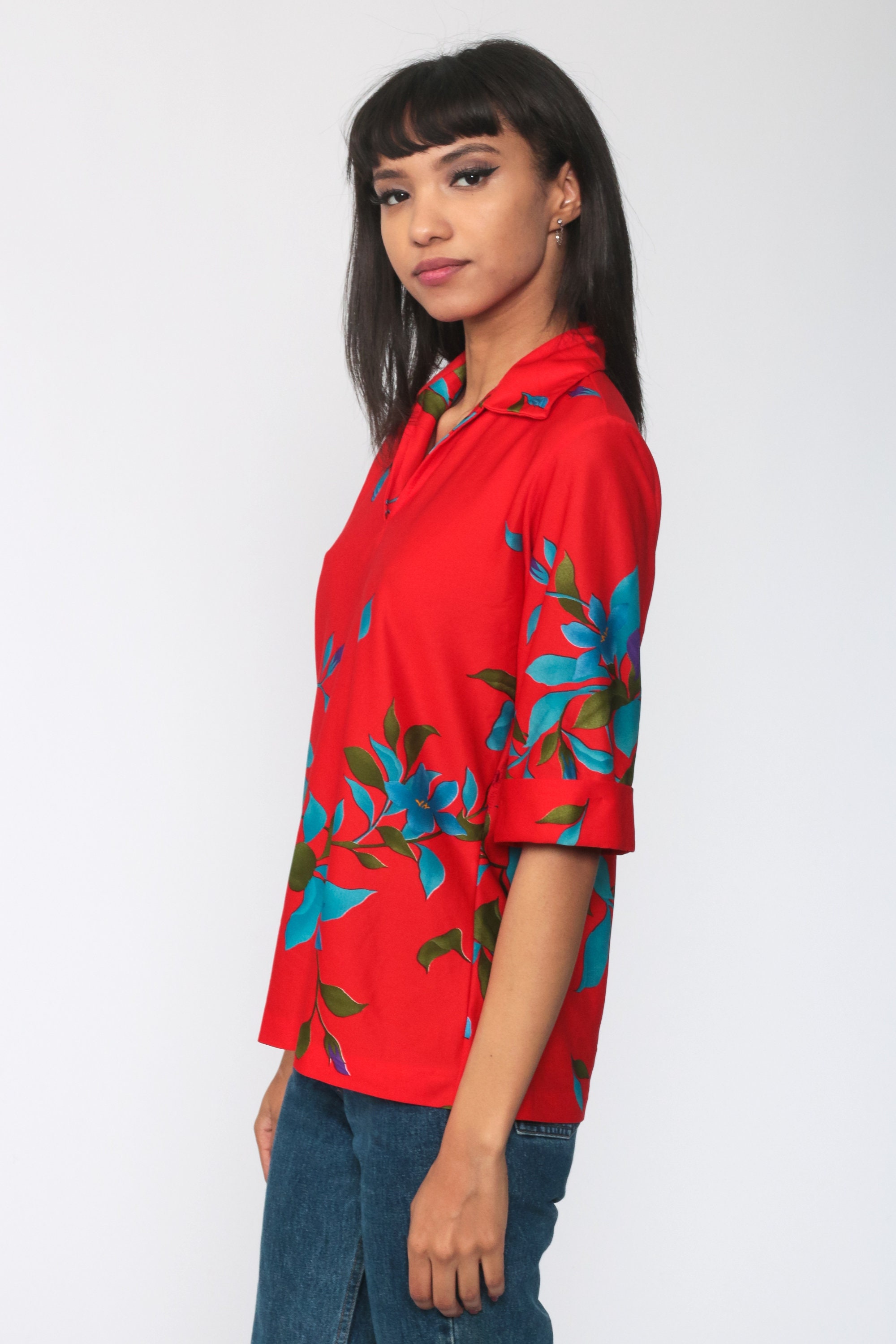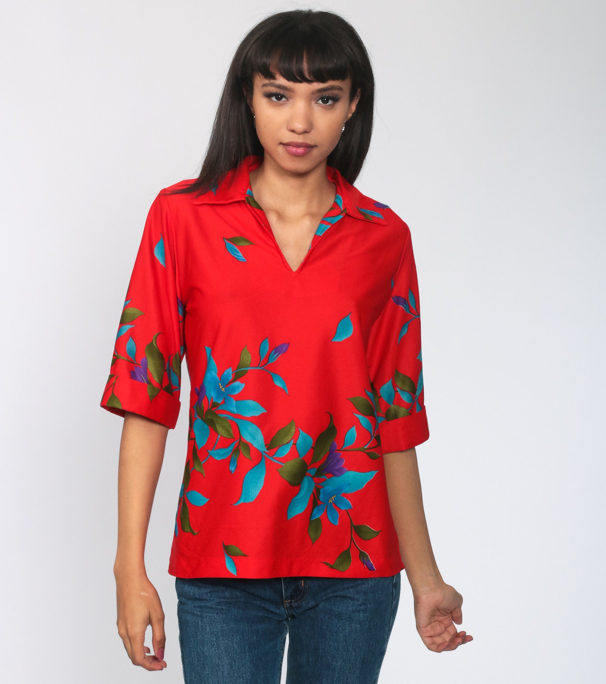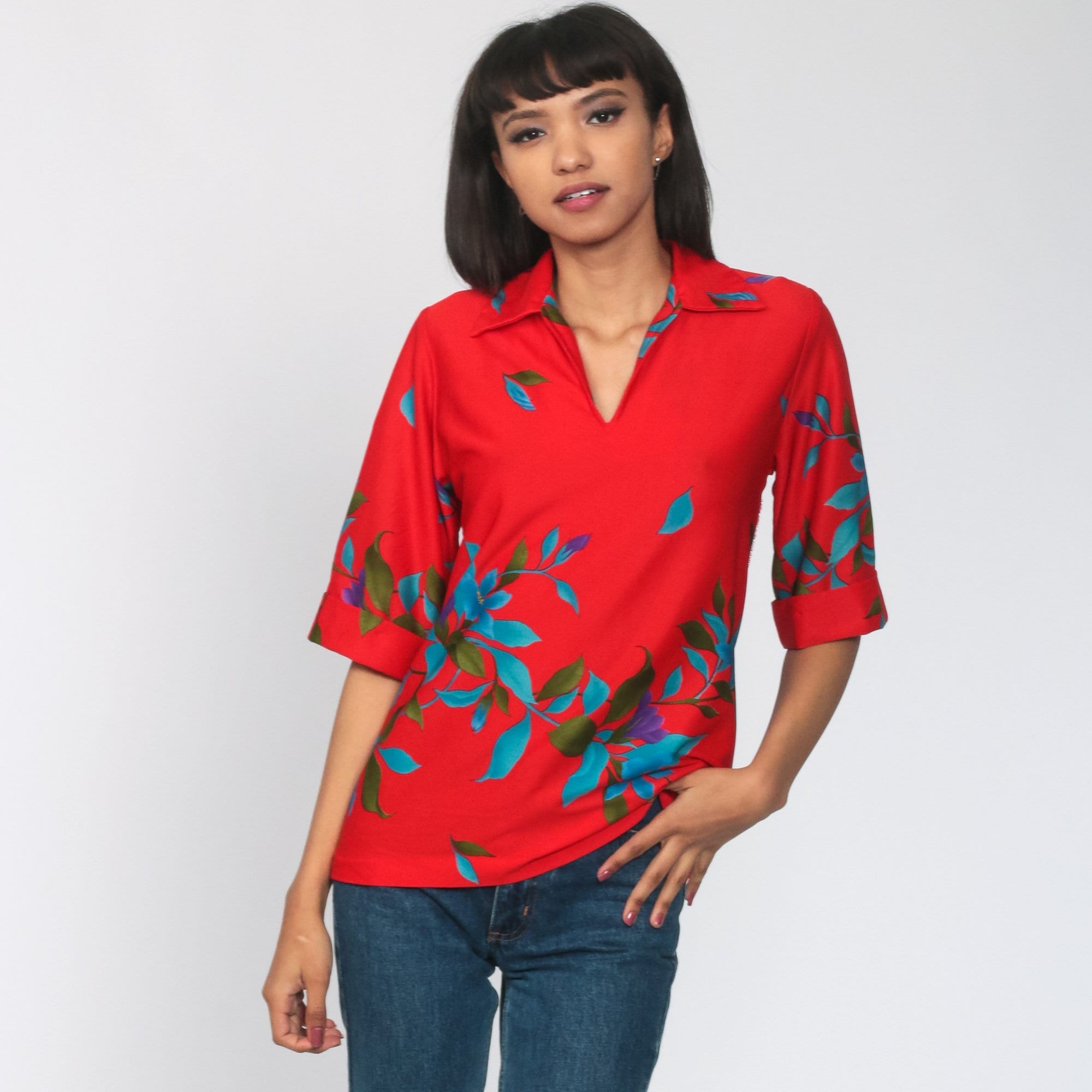 Vintage 70s blouse in red with a floral print and a pointed collar.