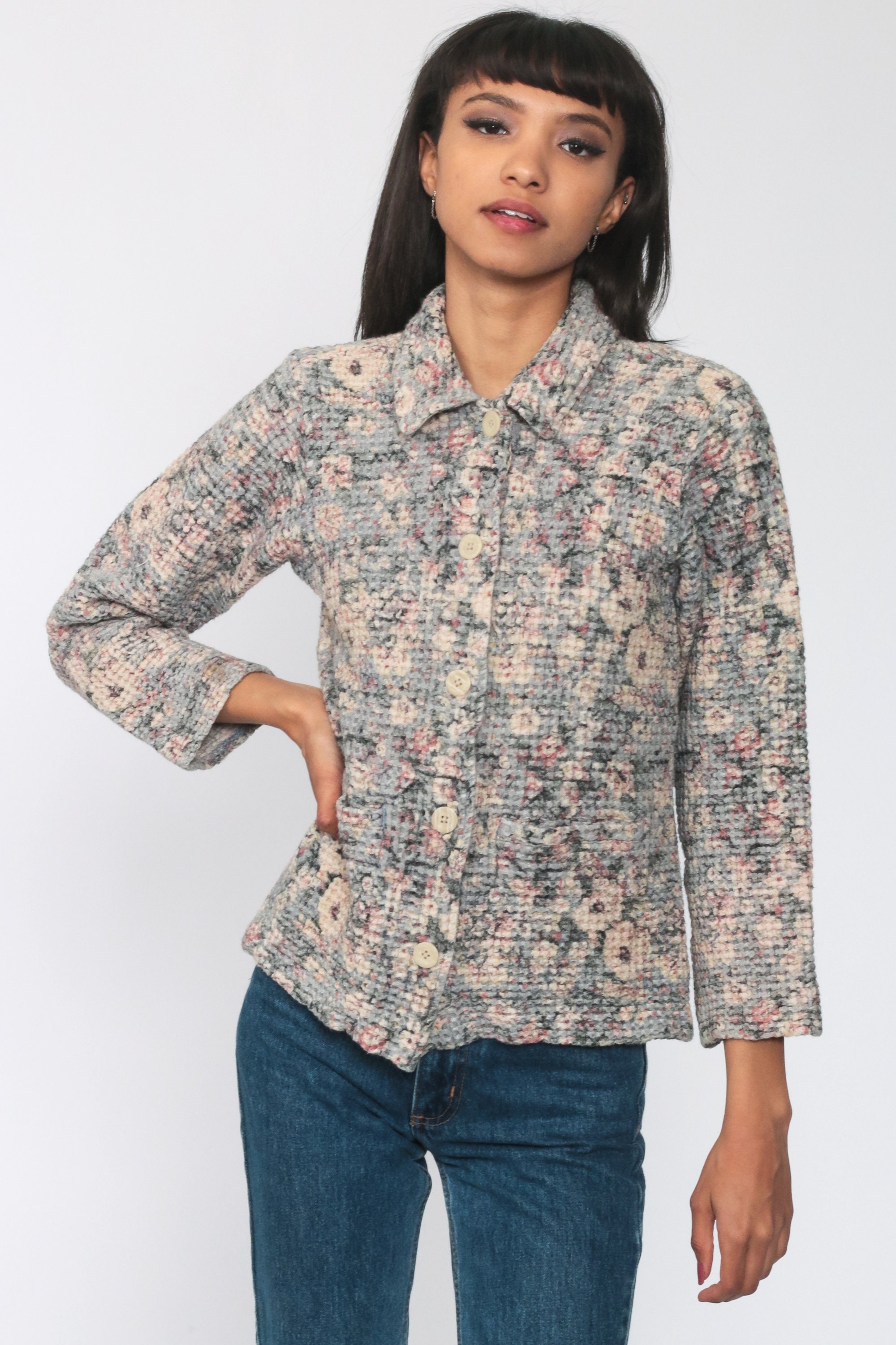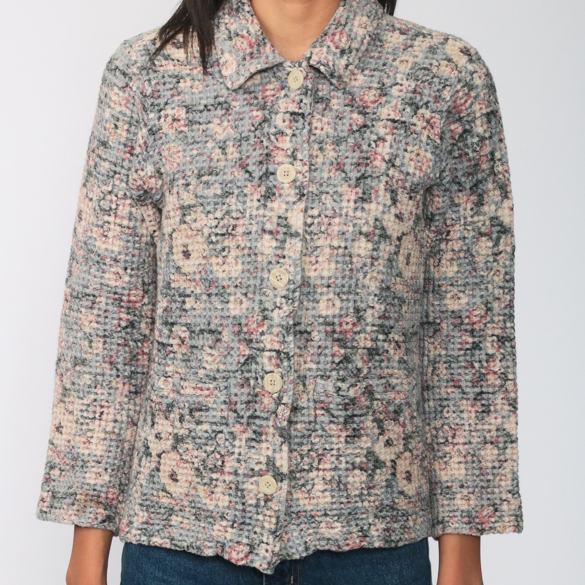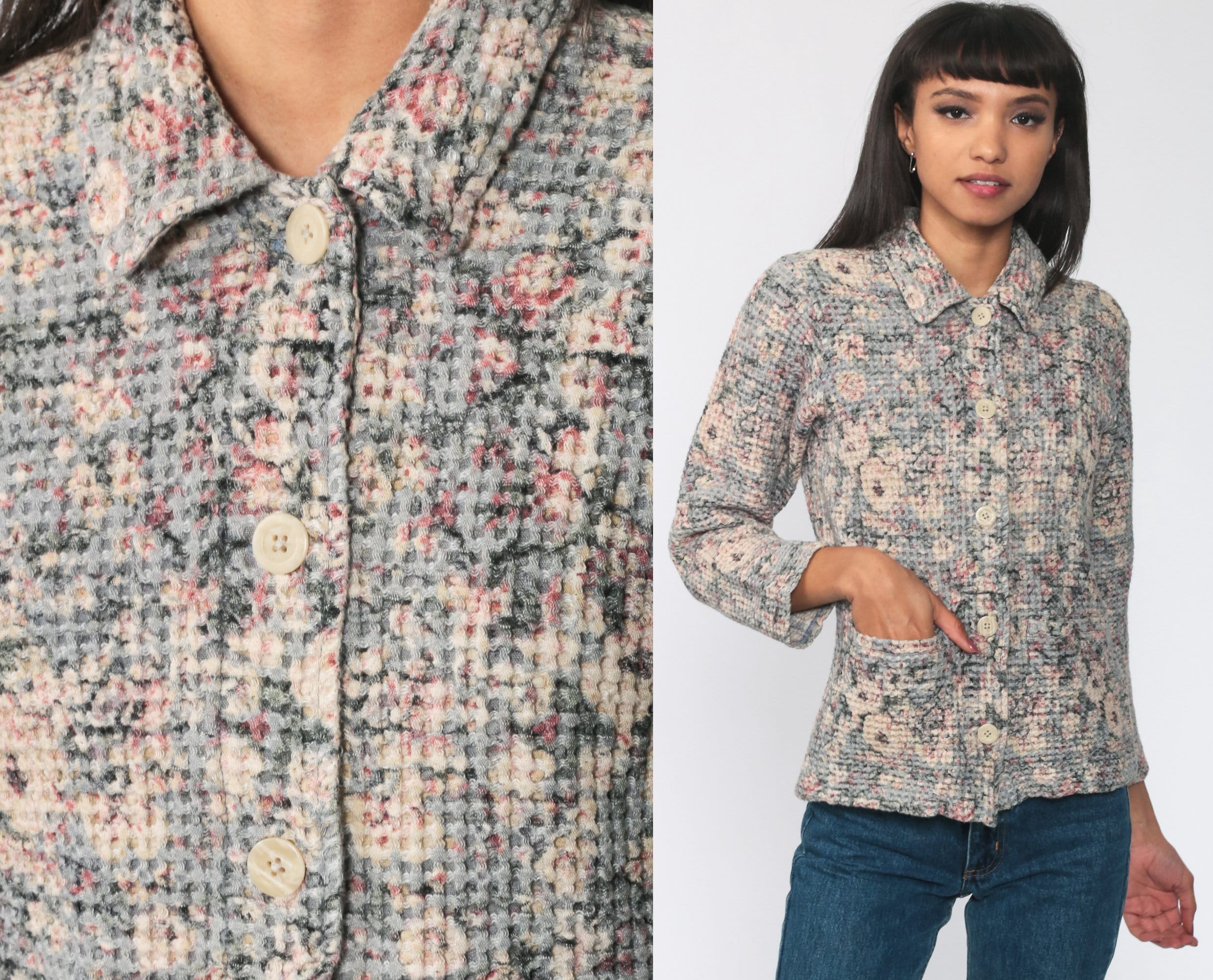 Vintage 90s shirt/jacket hybrid in waffle knit with a floral print. It has long sleeves and buttons up the front.