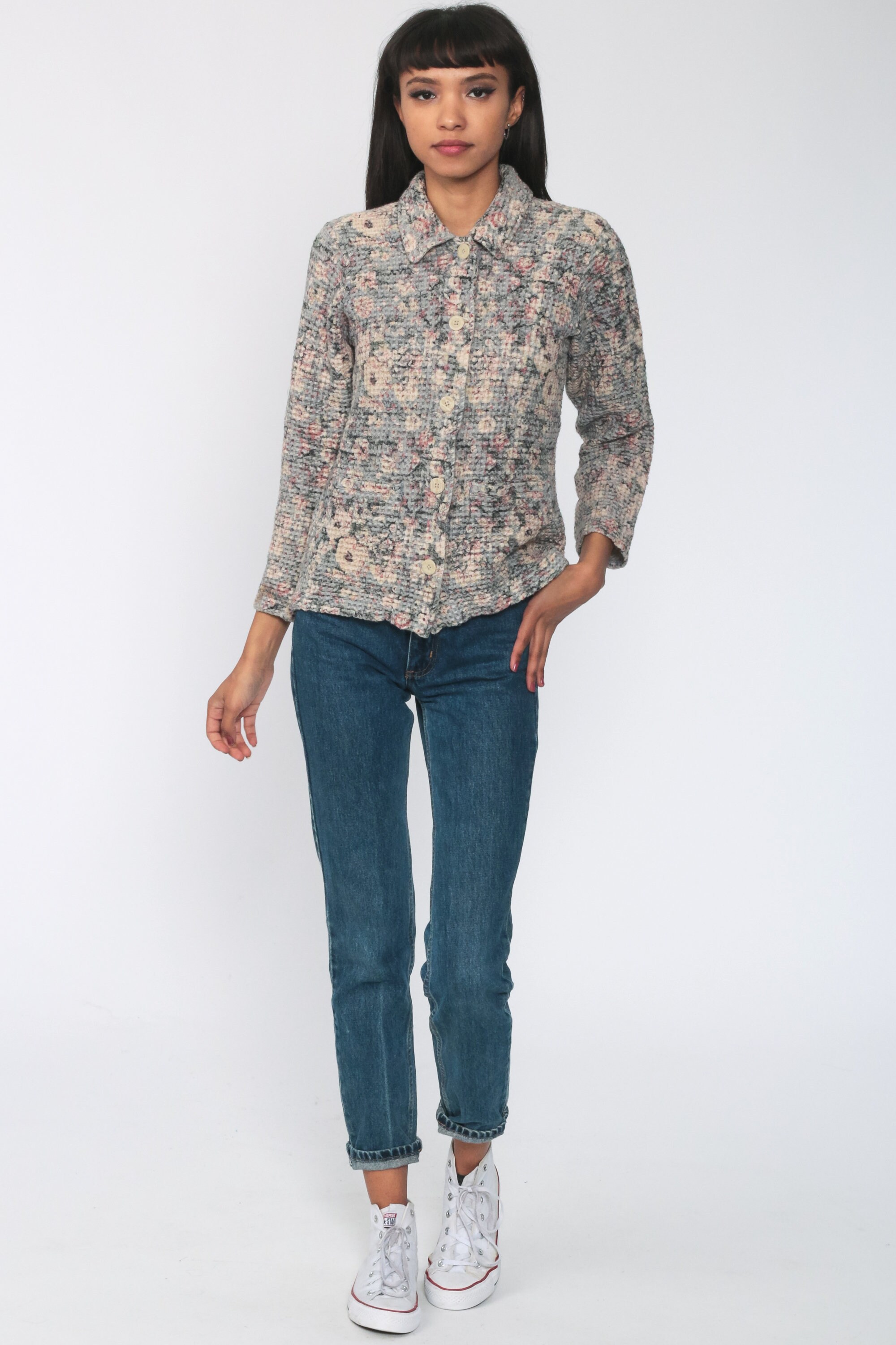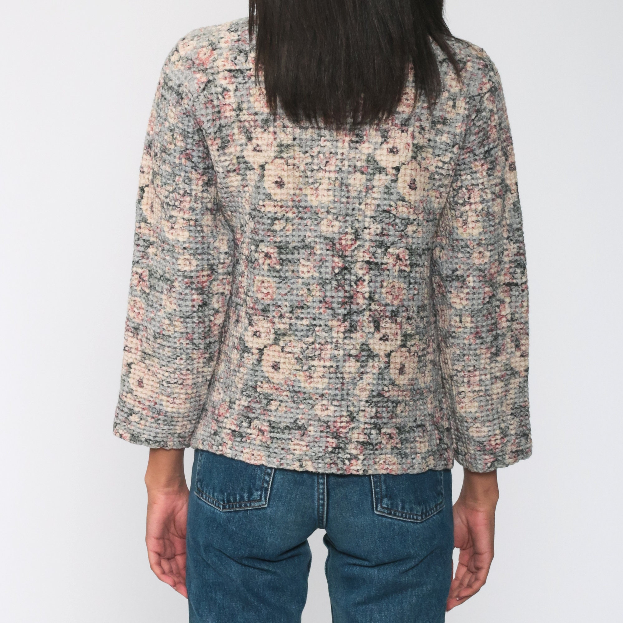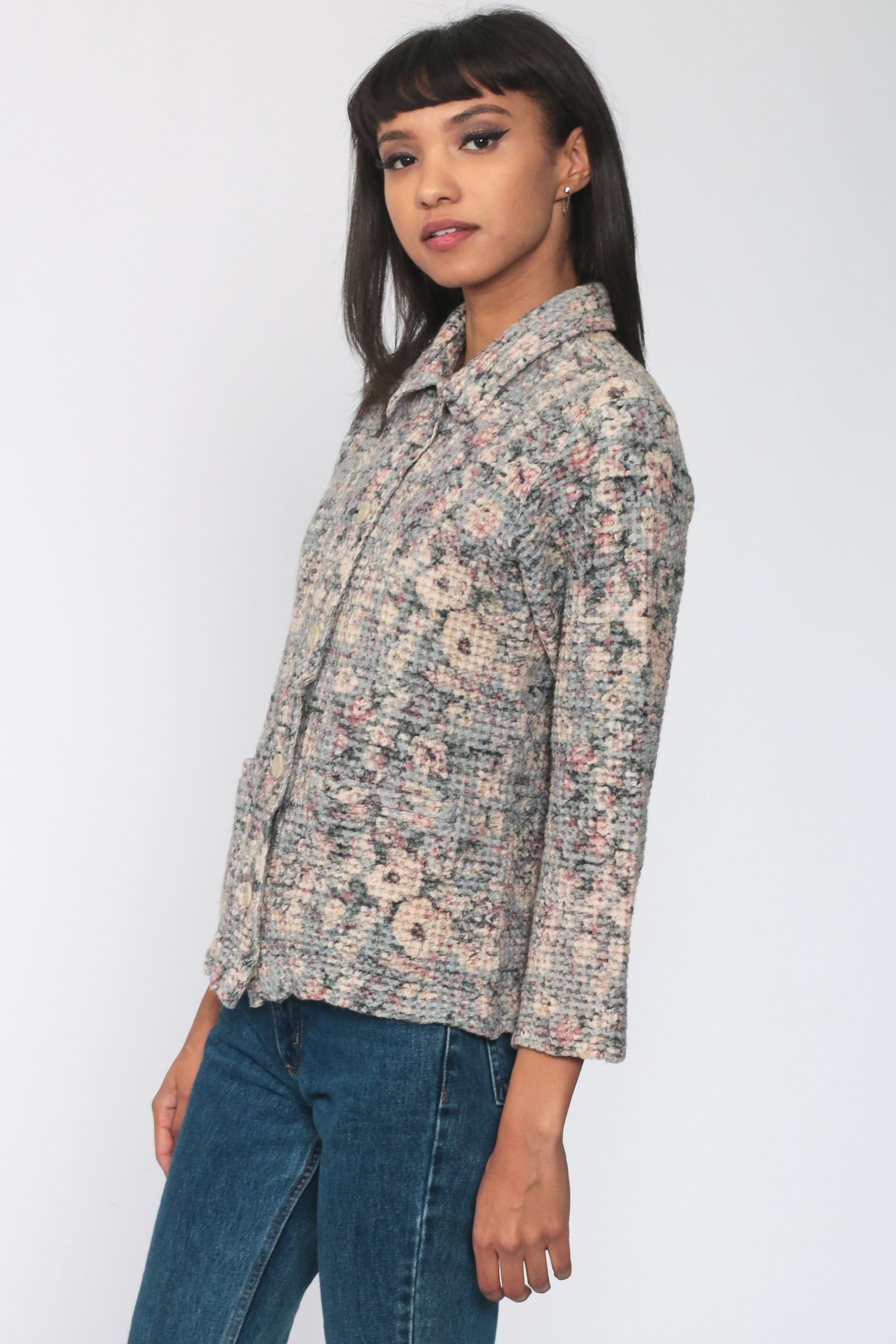 Vintage 90s shirt/jacket hybrid in waffle knit with a floral print. It has long sleeves and buttons up the front.