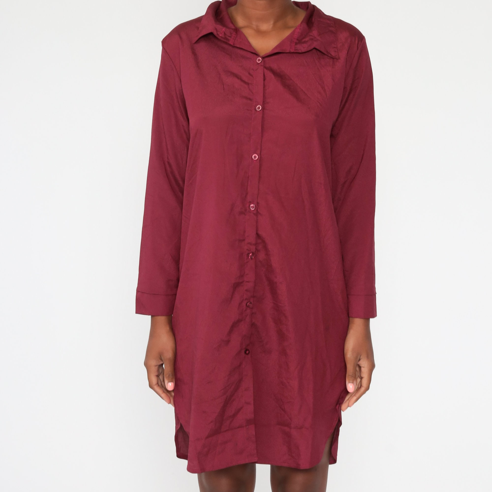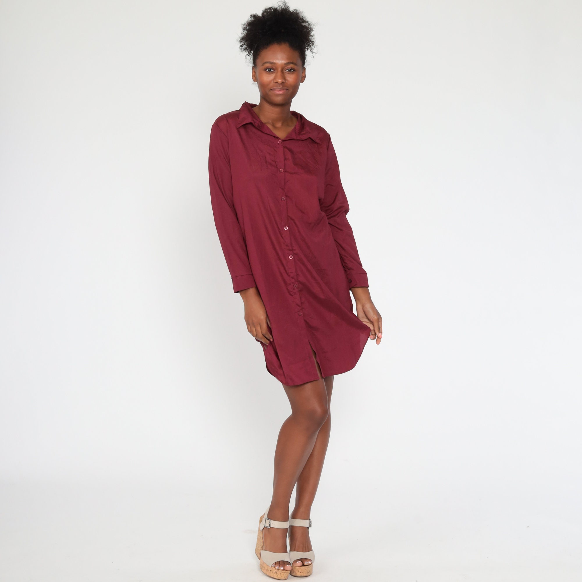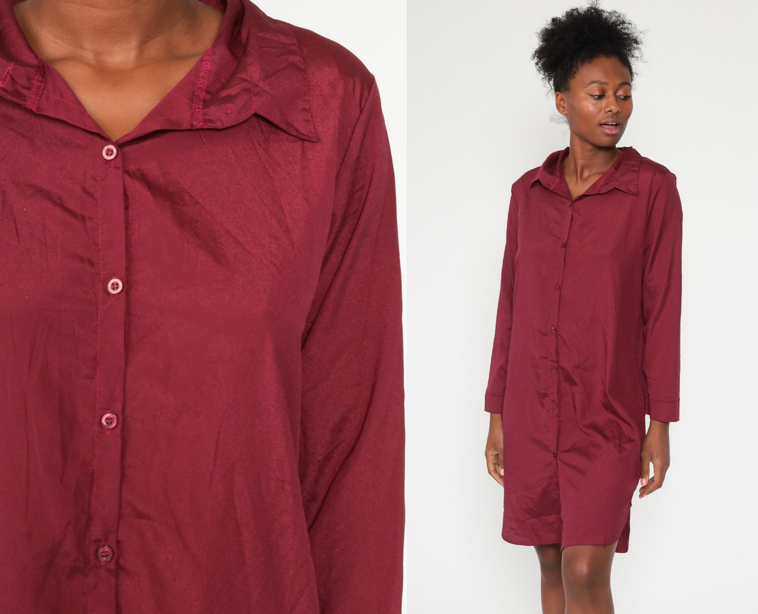 Vintage 80s dress in burgundy with buttons up the front and a shift cut.