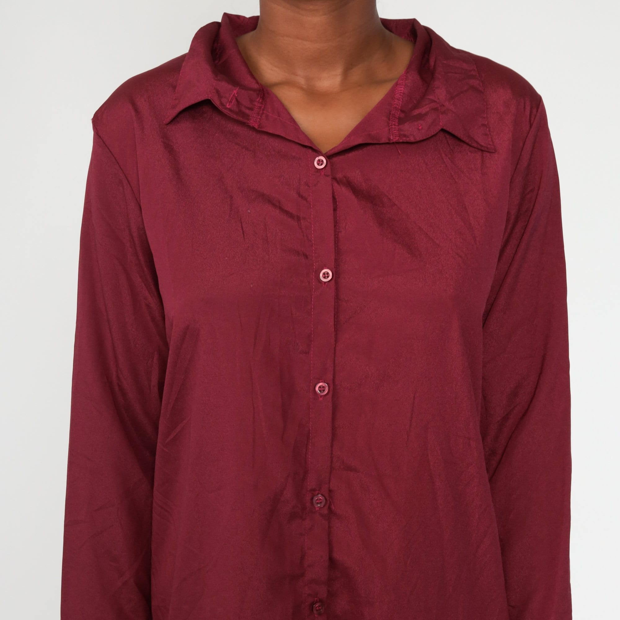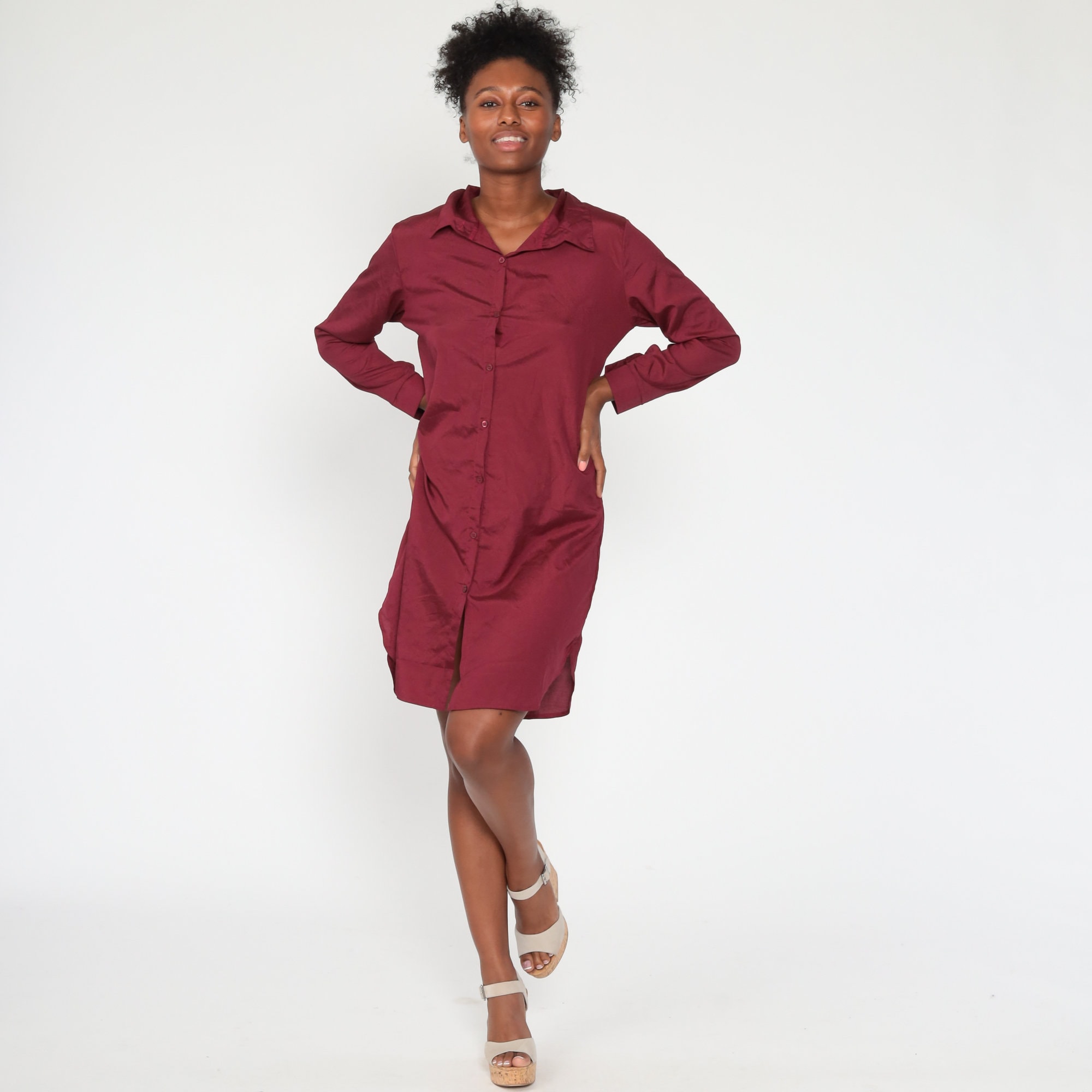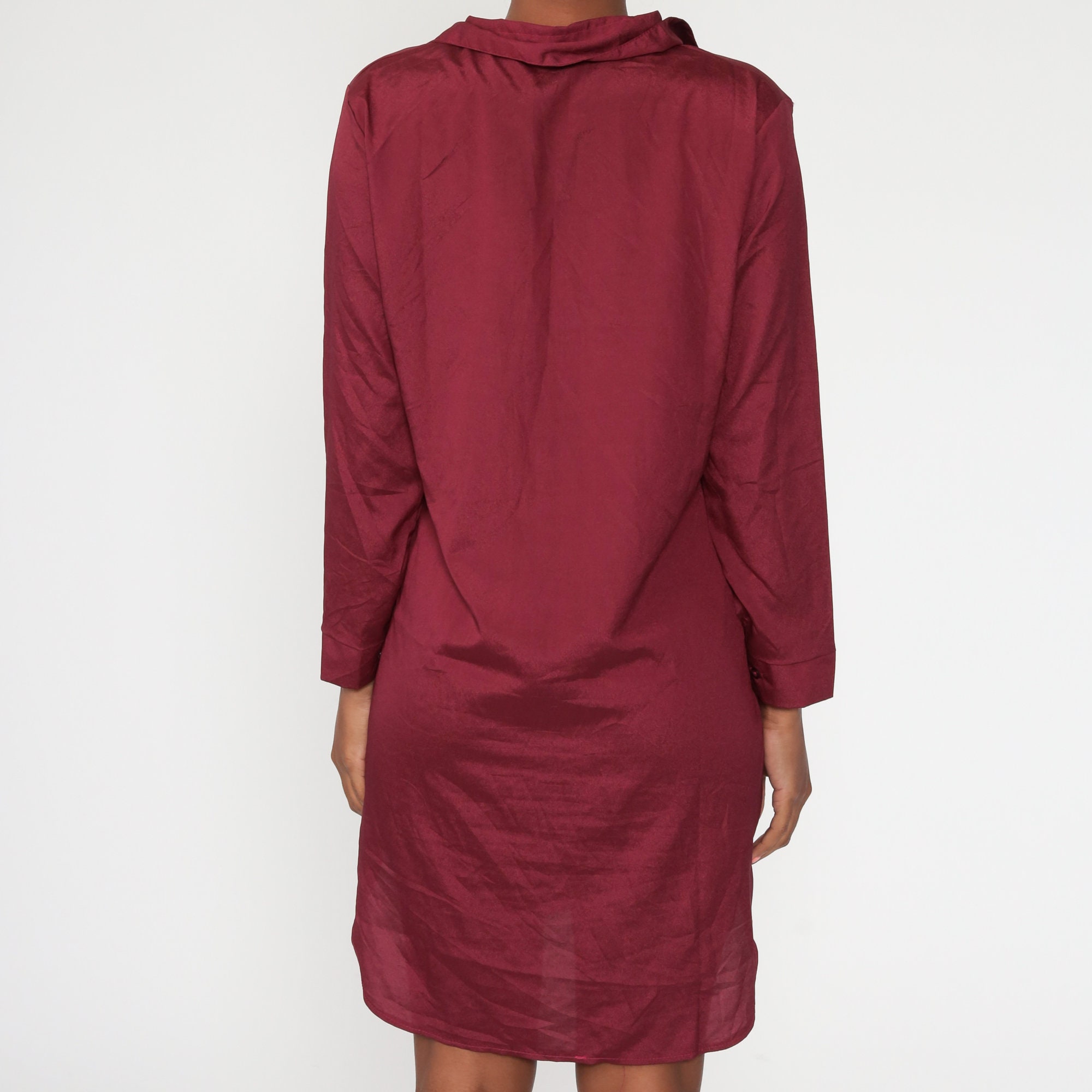 Vintage 80s dress in burgundy with buttons up the front and a shift cut.