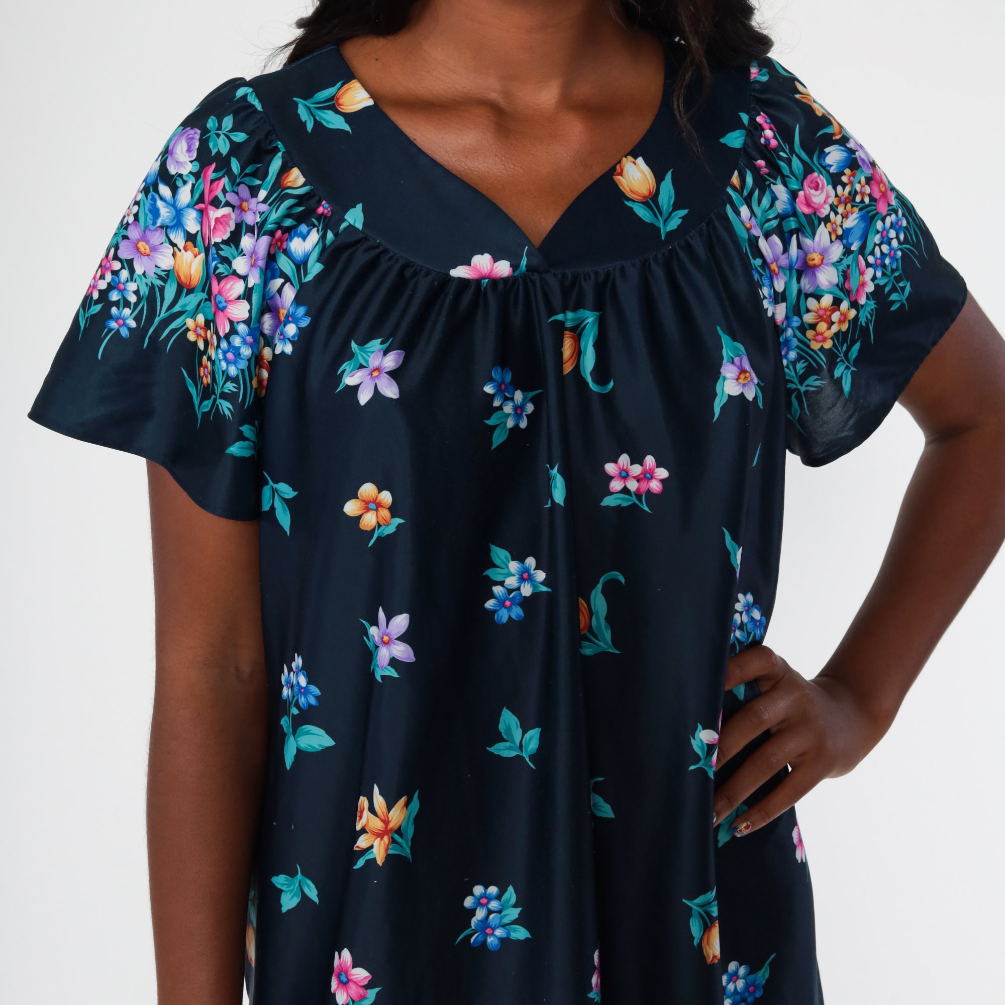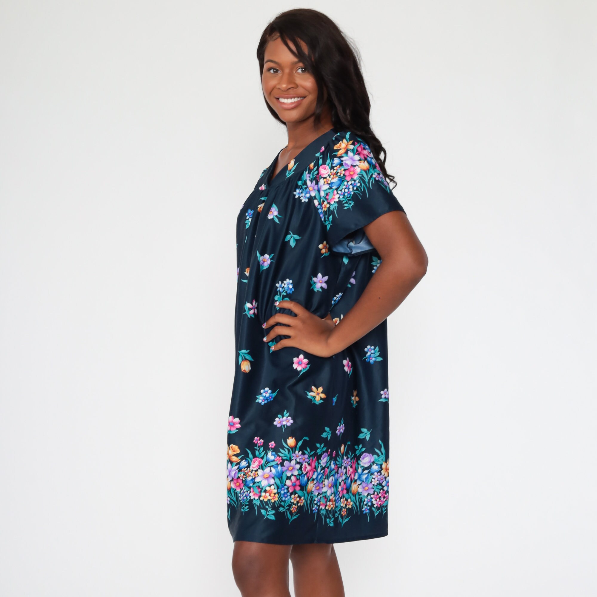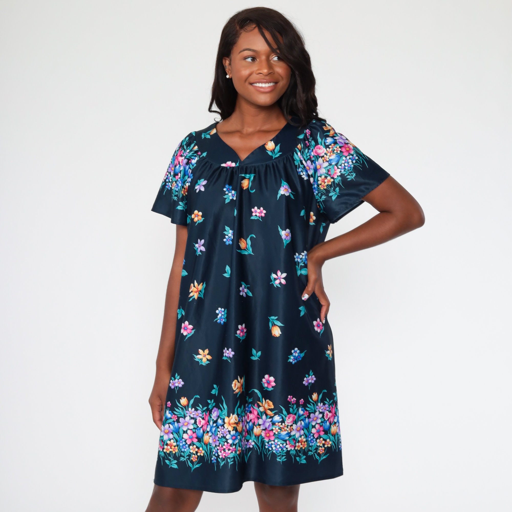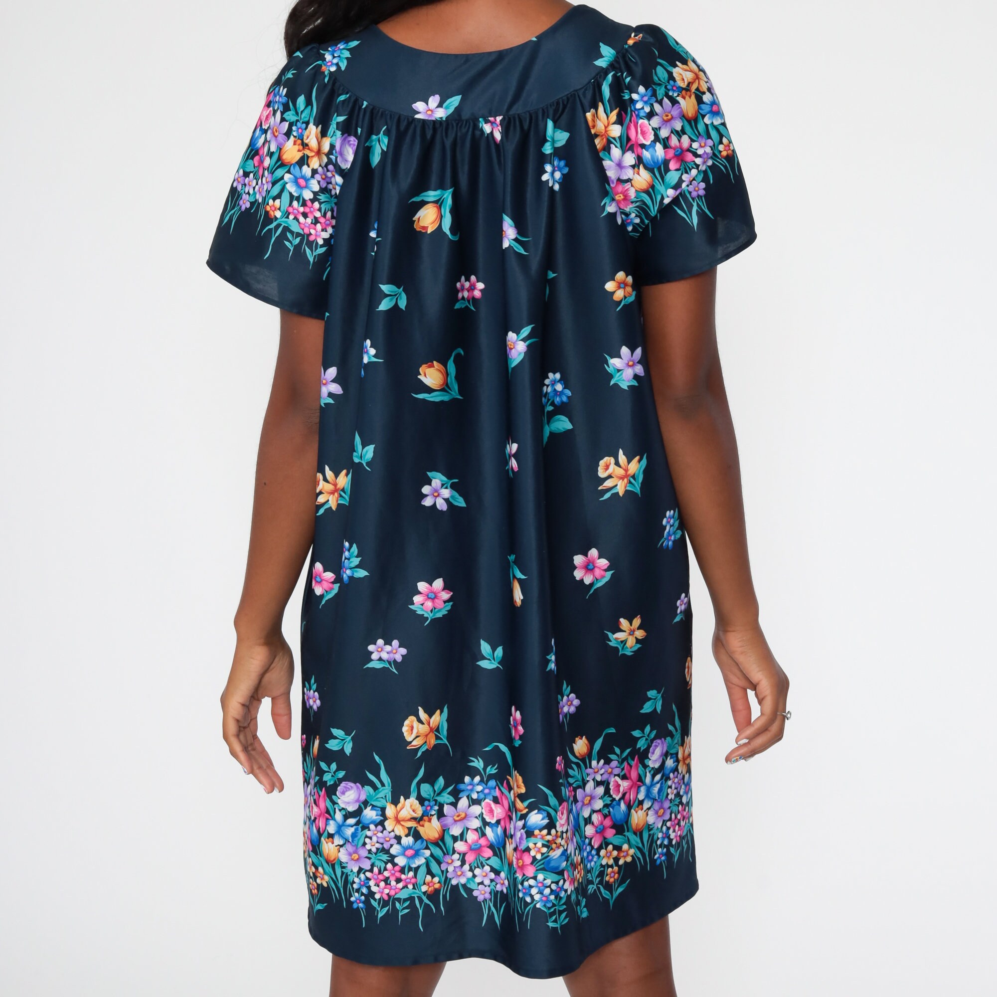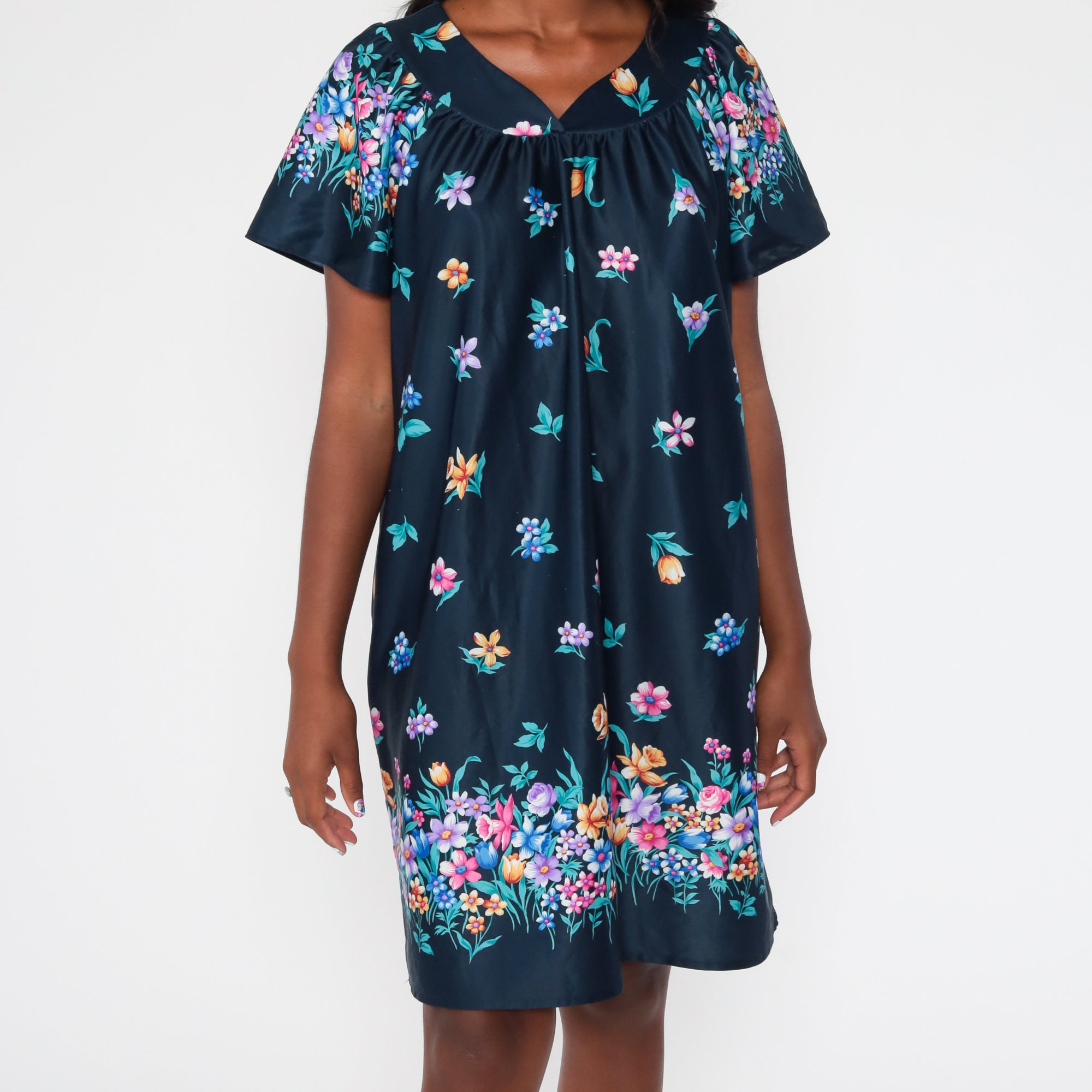 Vintage 00s dress in a blue floral print. It has a tent cut with short sleeves.