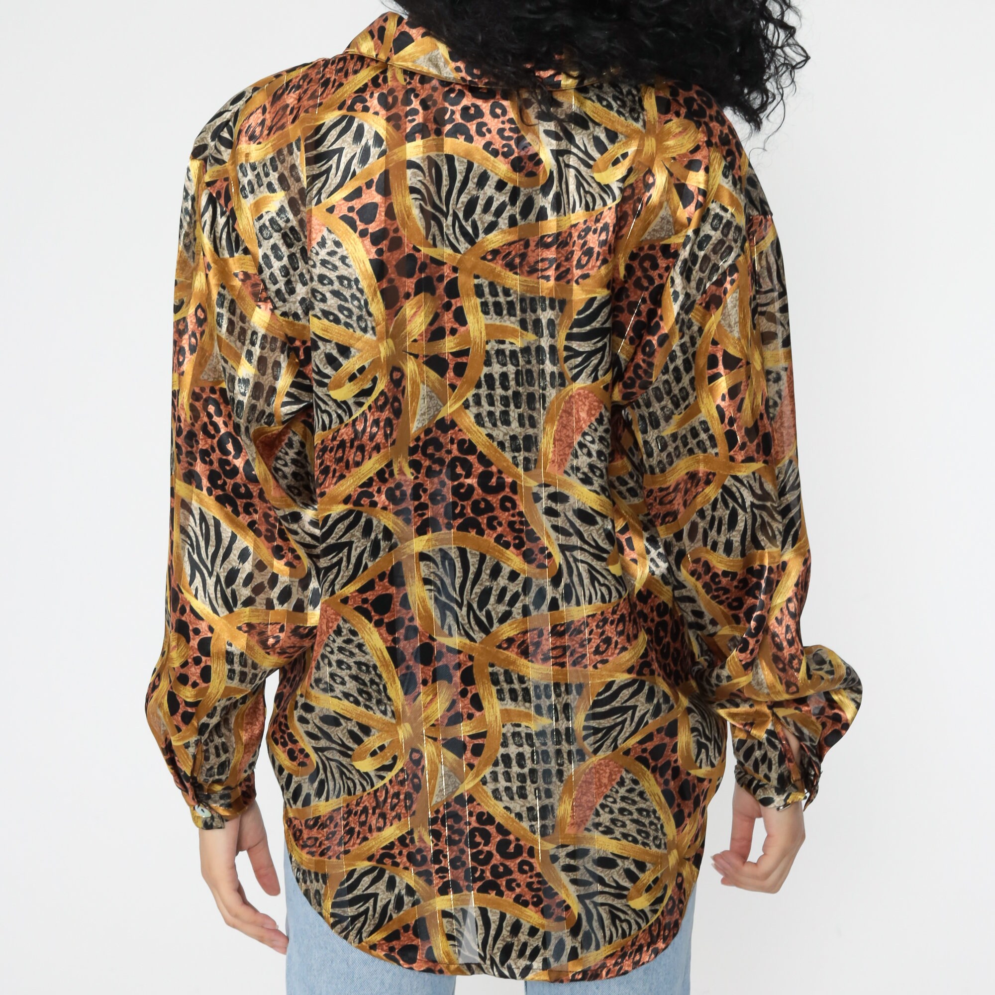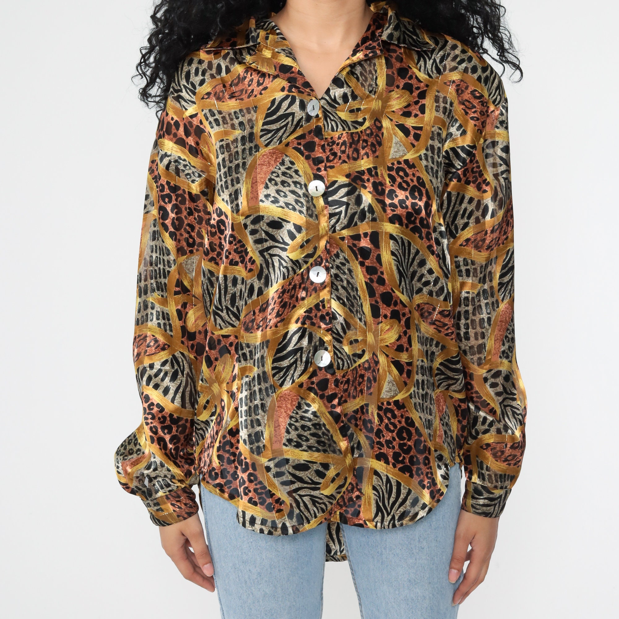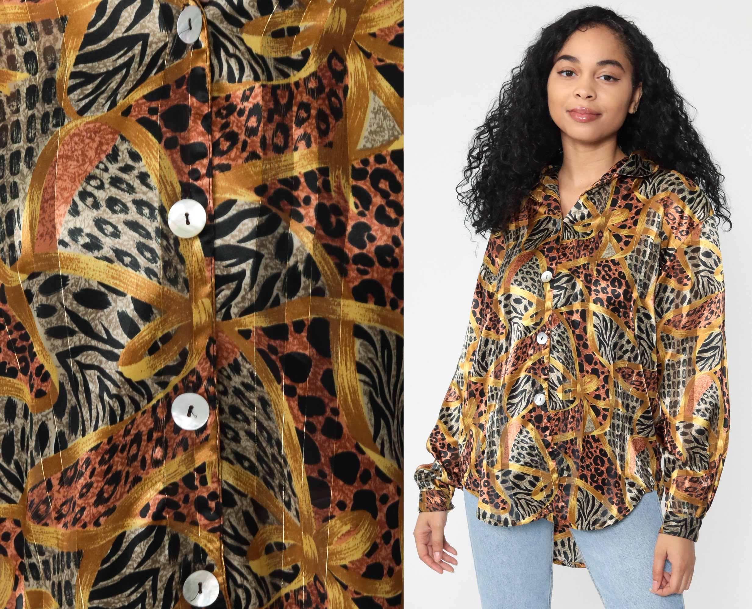 Vintage 90s blouse in a leopard print with gold stripes.