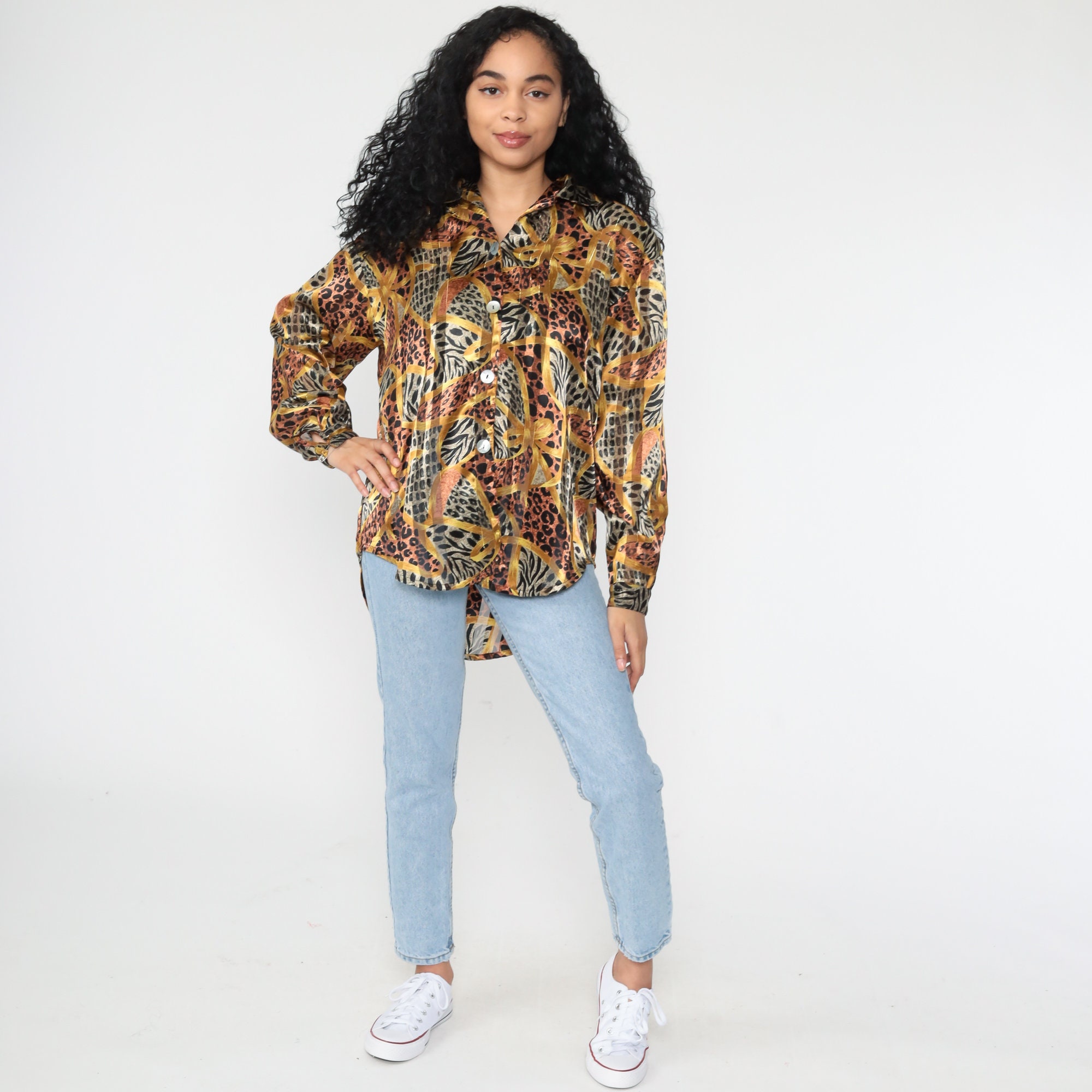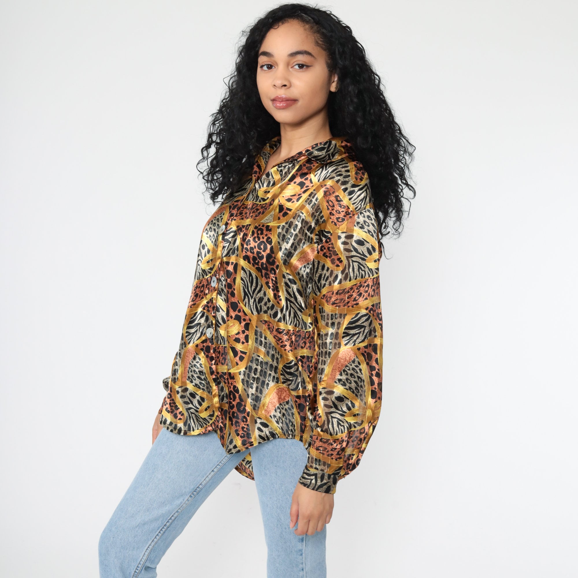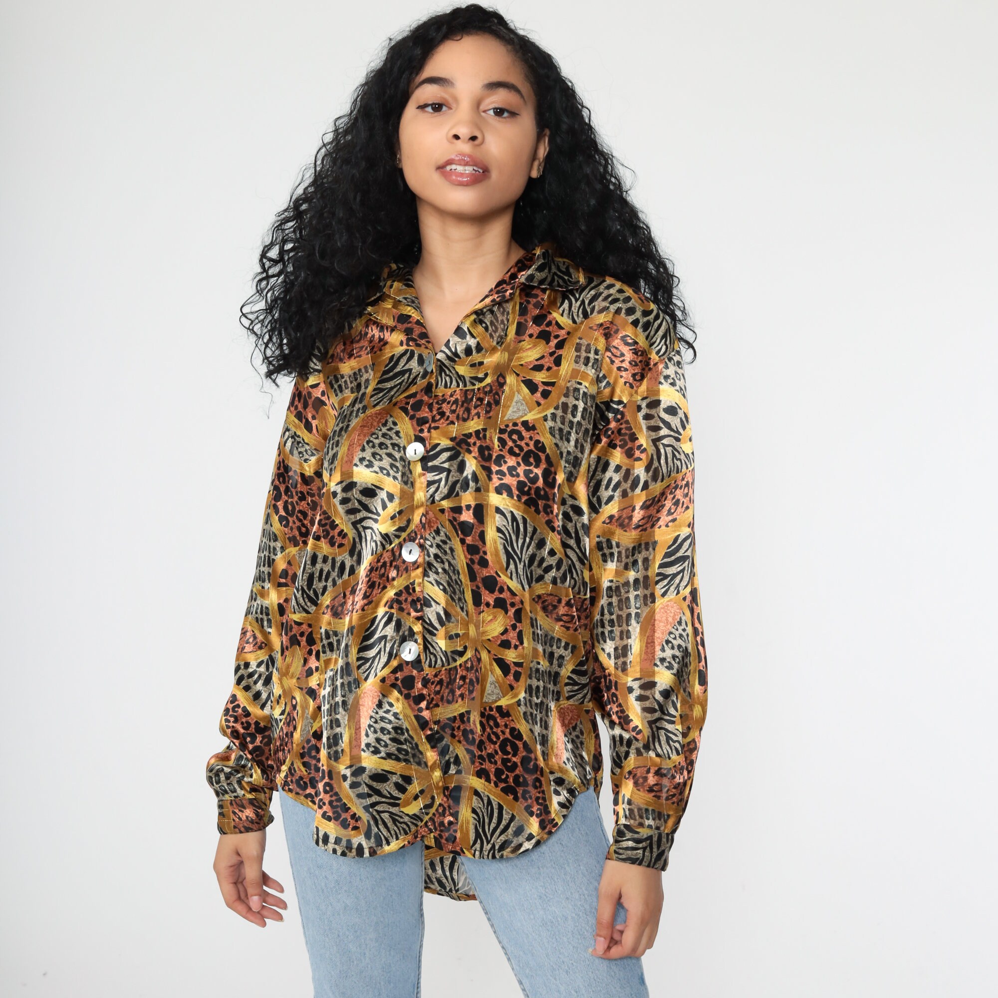 Vintage 90s blouse in a leopard print with gold stripes.