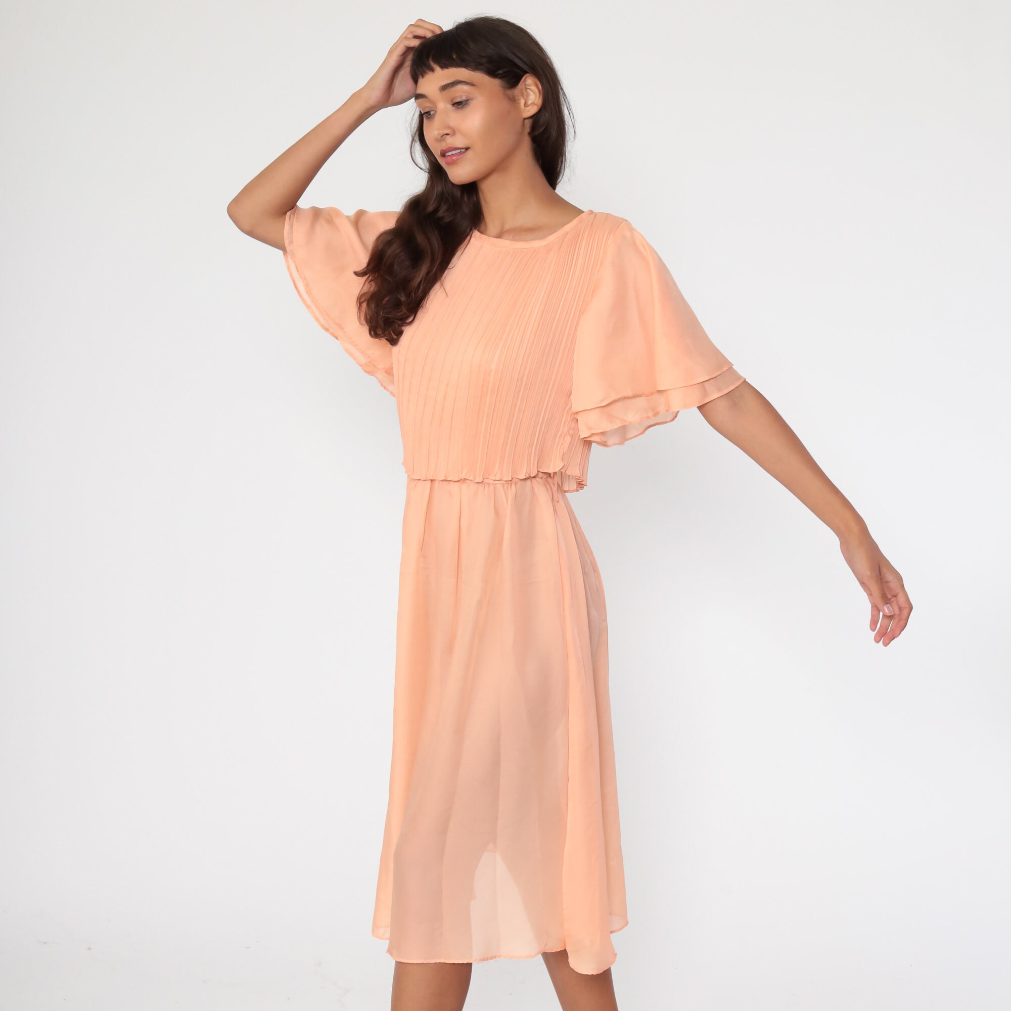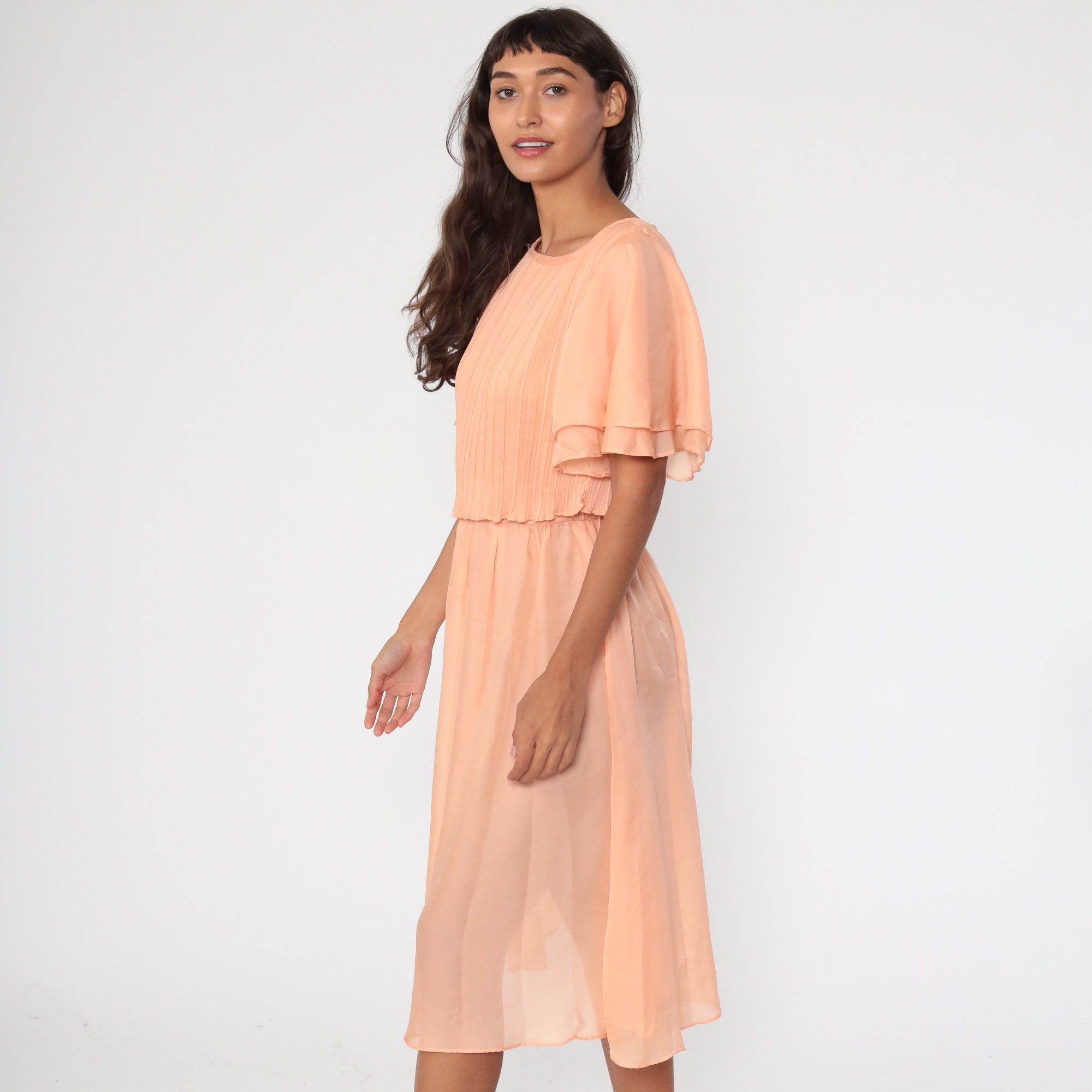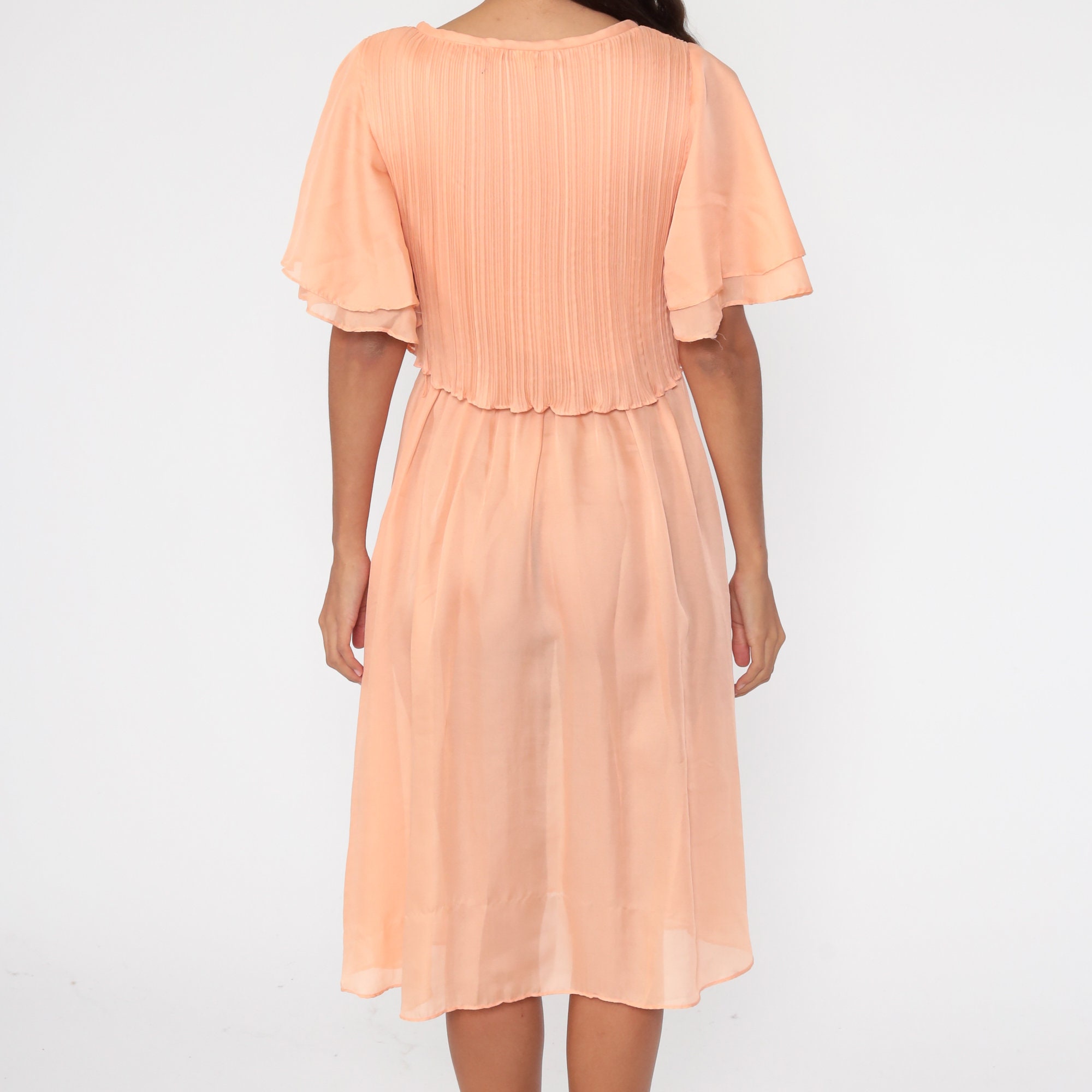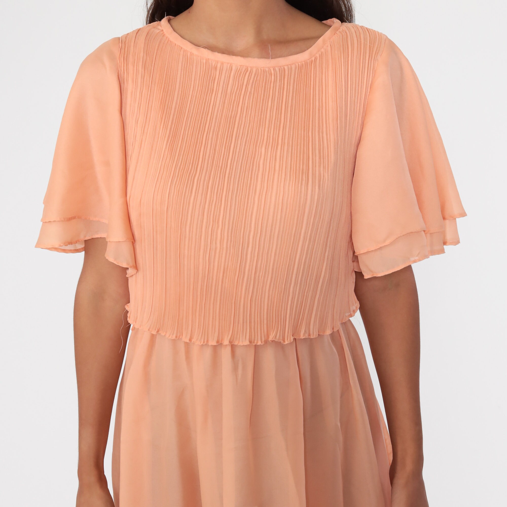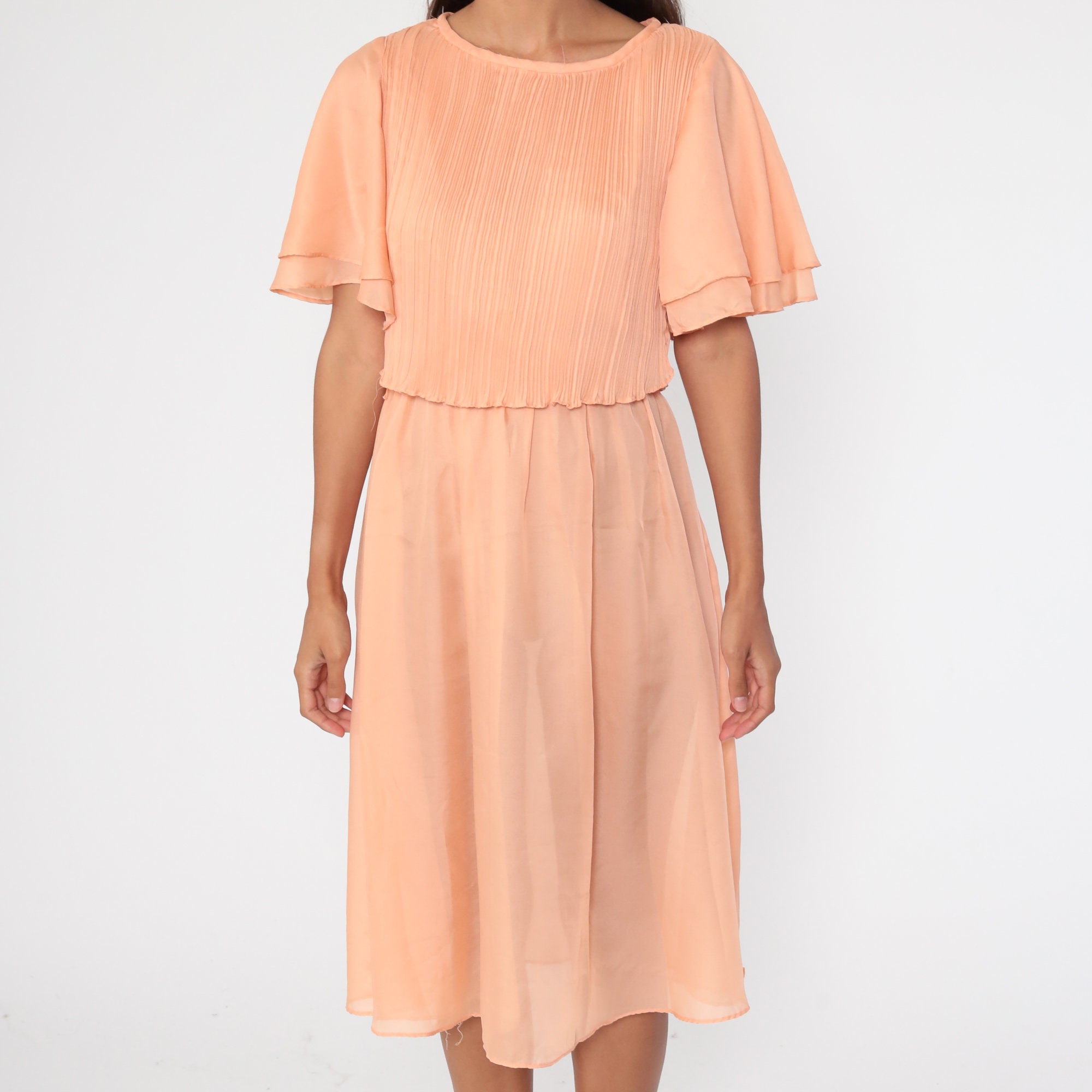 Vintage 70s dress in orange with flutter sleeves. It has a high waist and a midi length skirt.