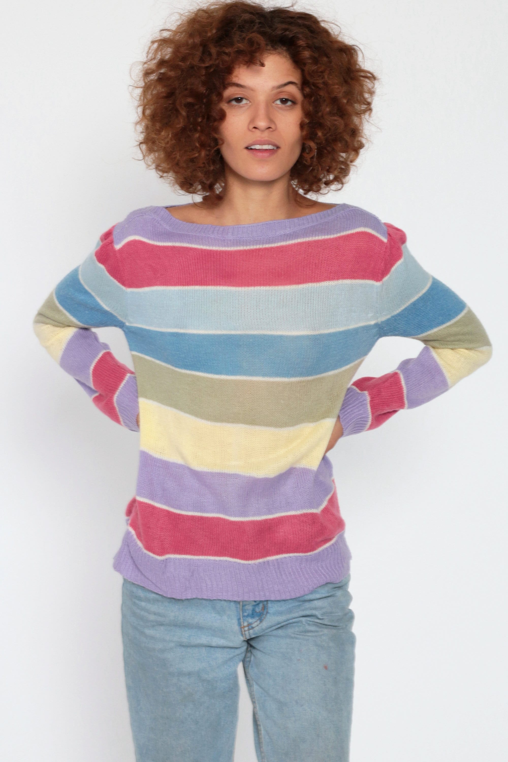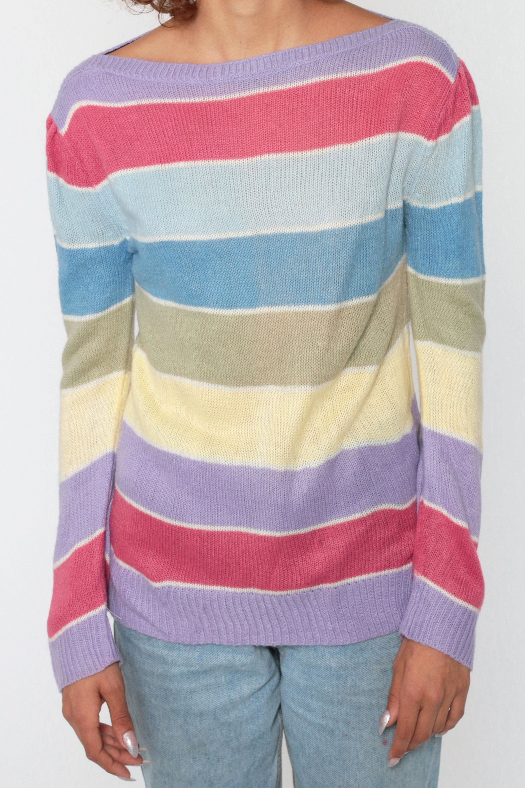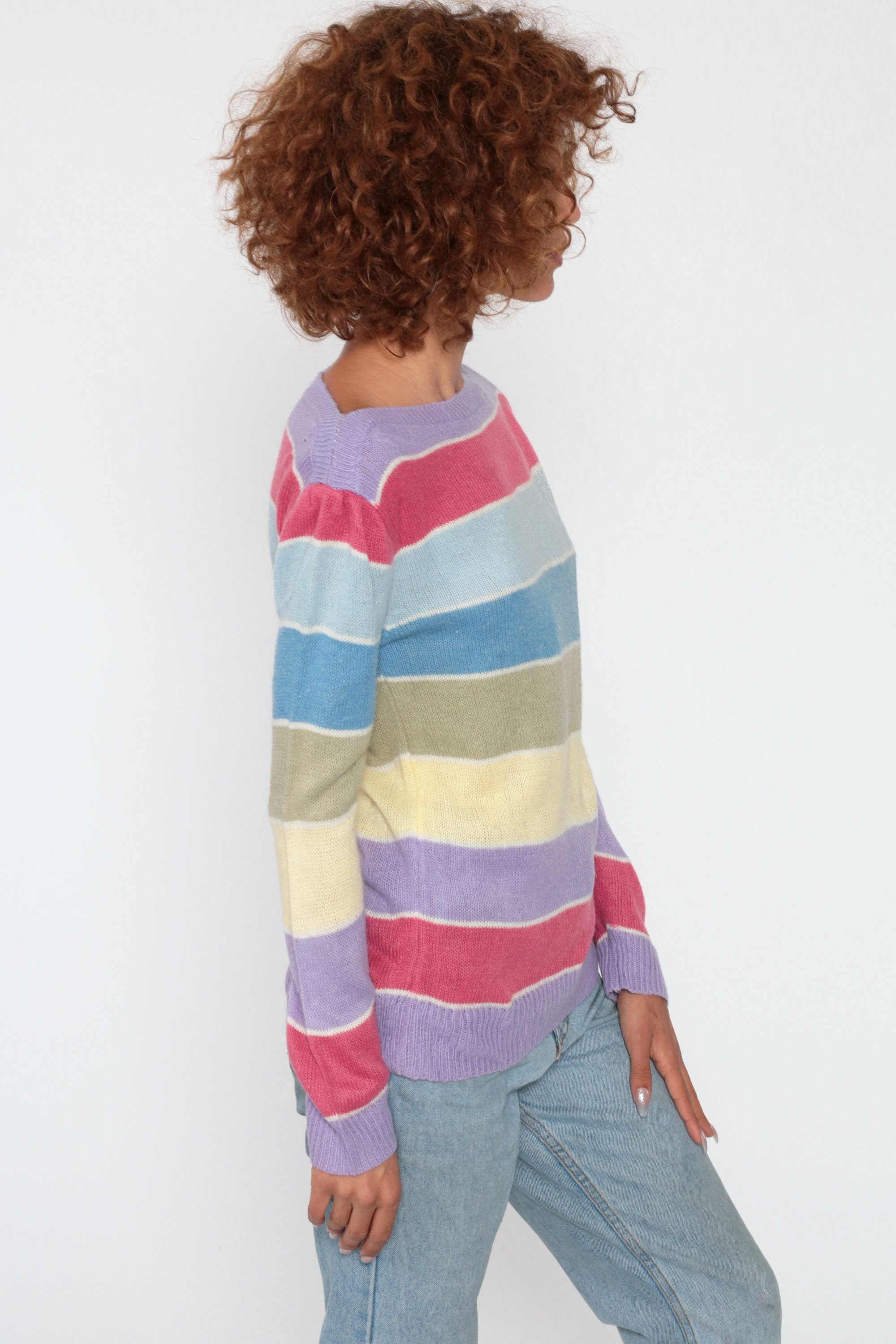 Vintage 80s sweater with pastel stripes, a boatneck and puff sleeves.