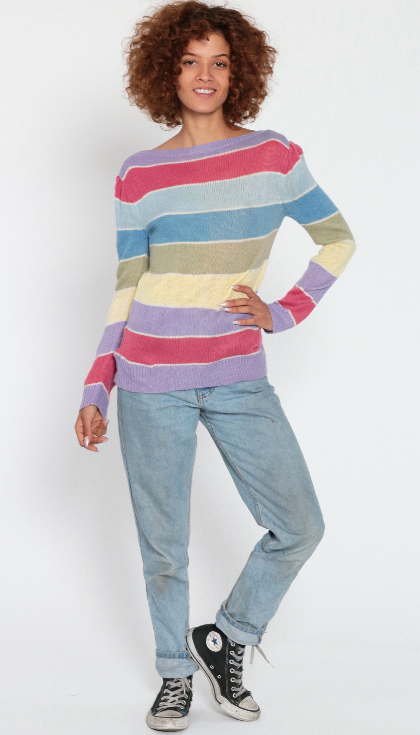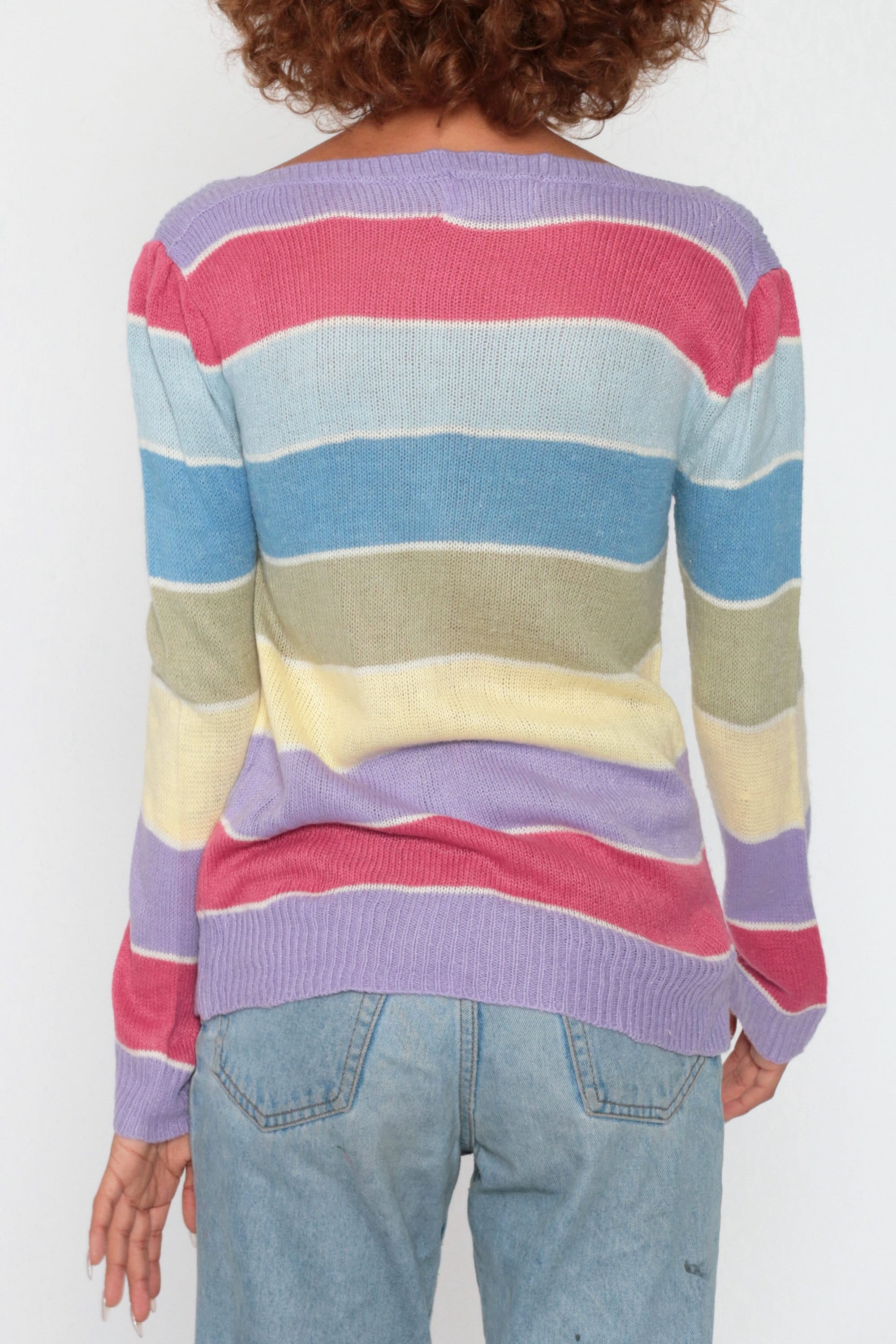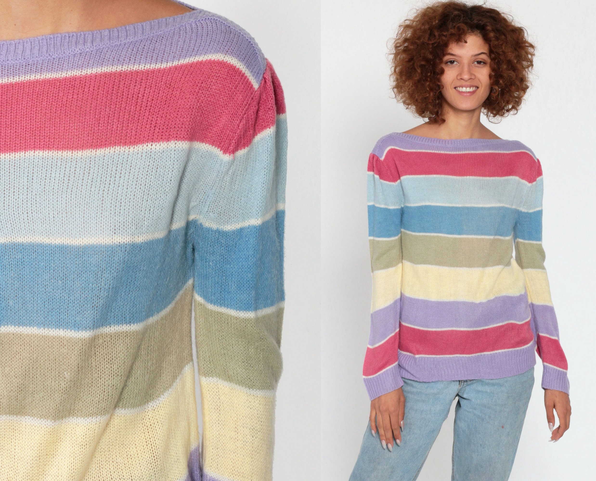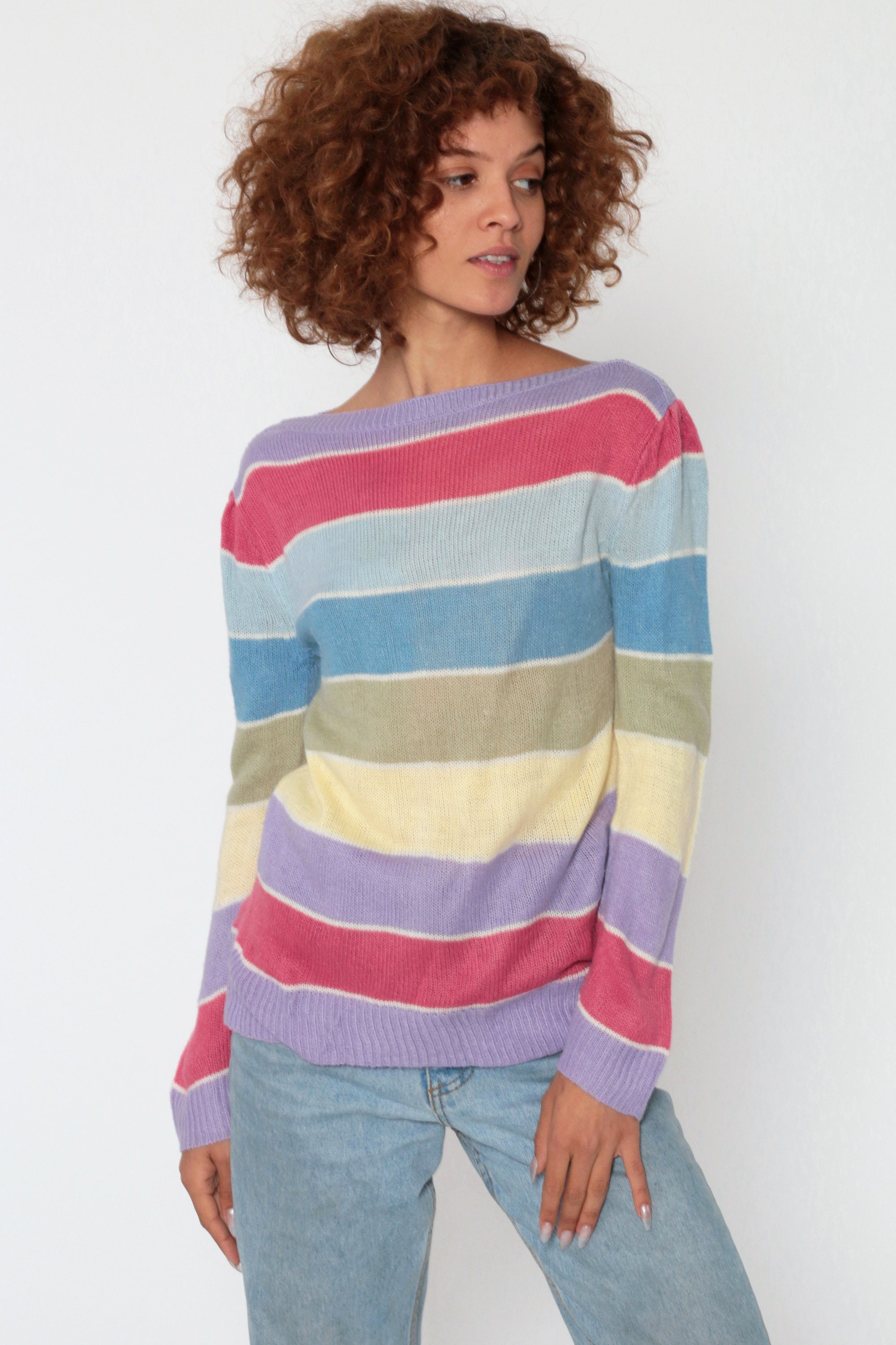 Vintage 80s sweater with pastel stripes, a boatneck and puff sleeves.