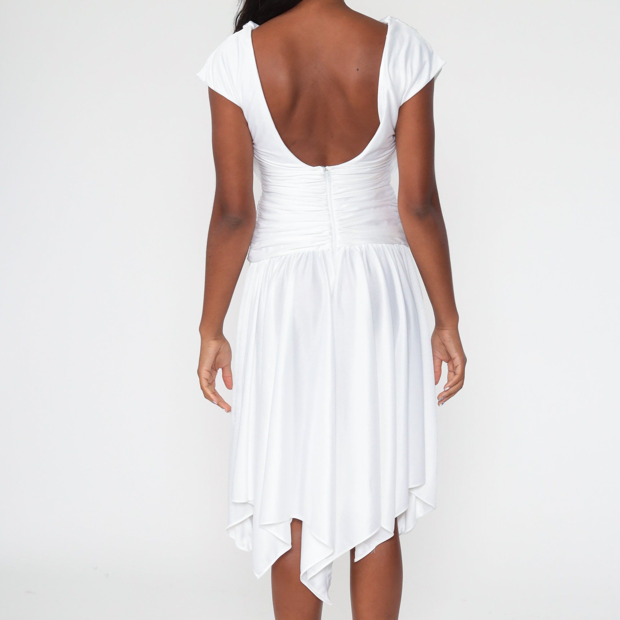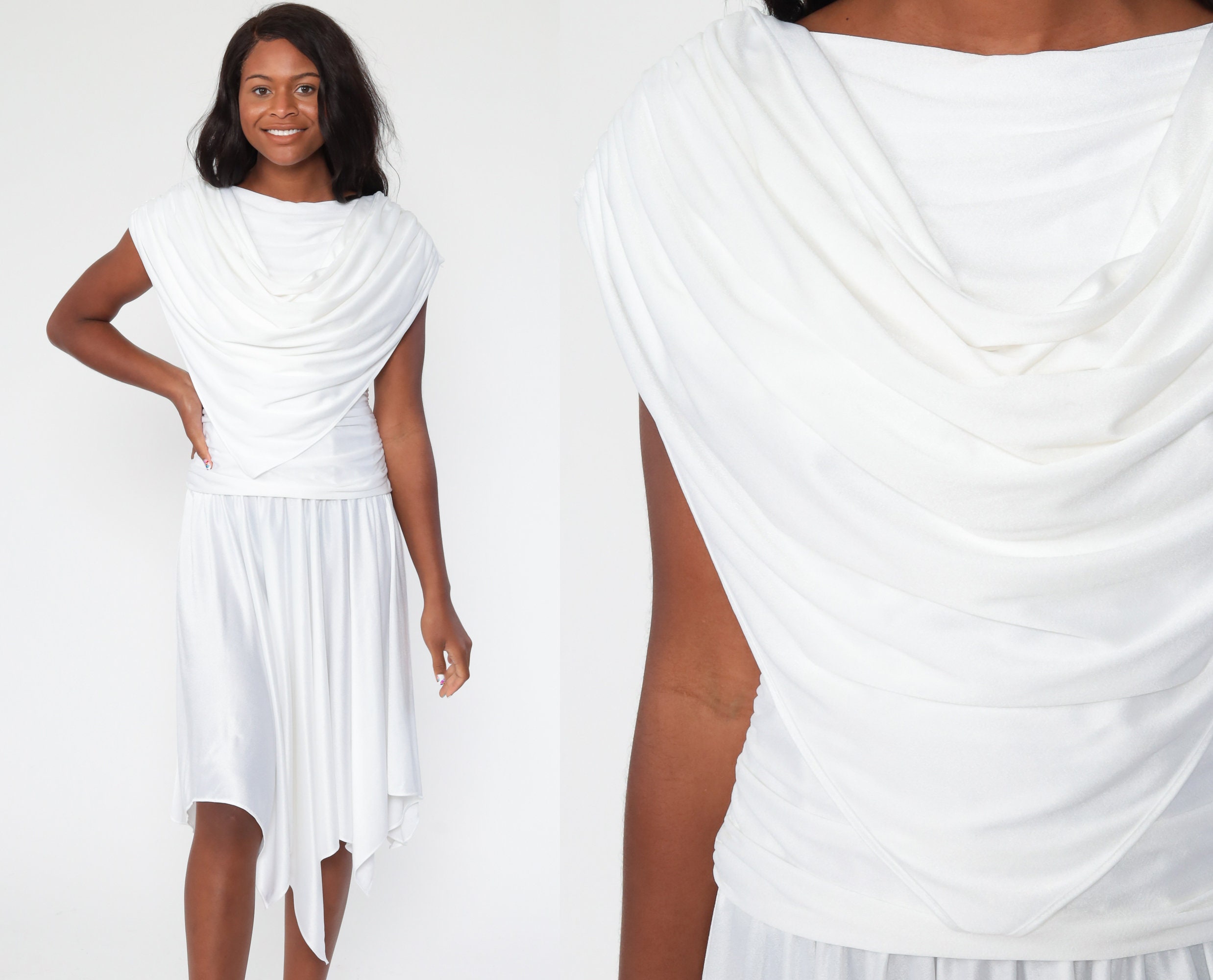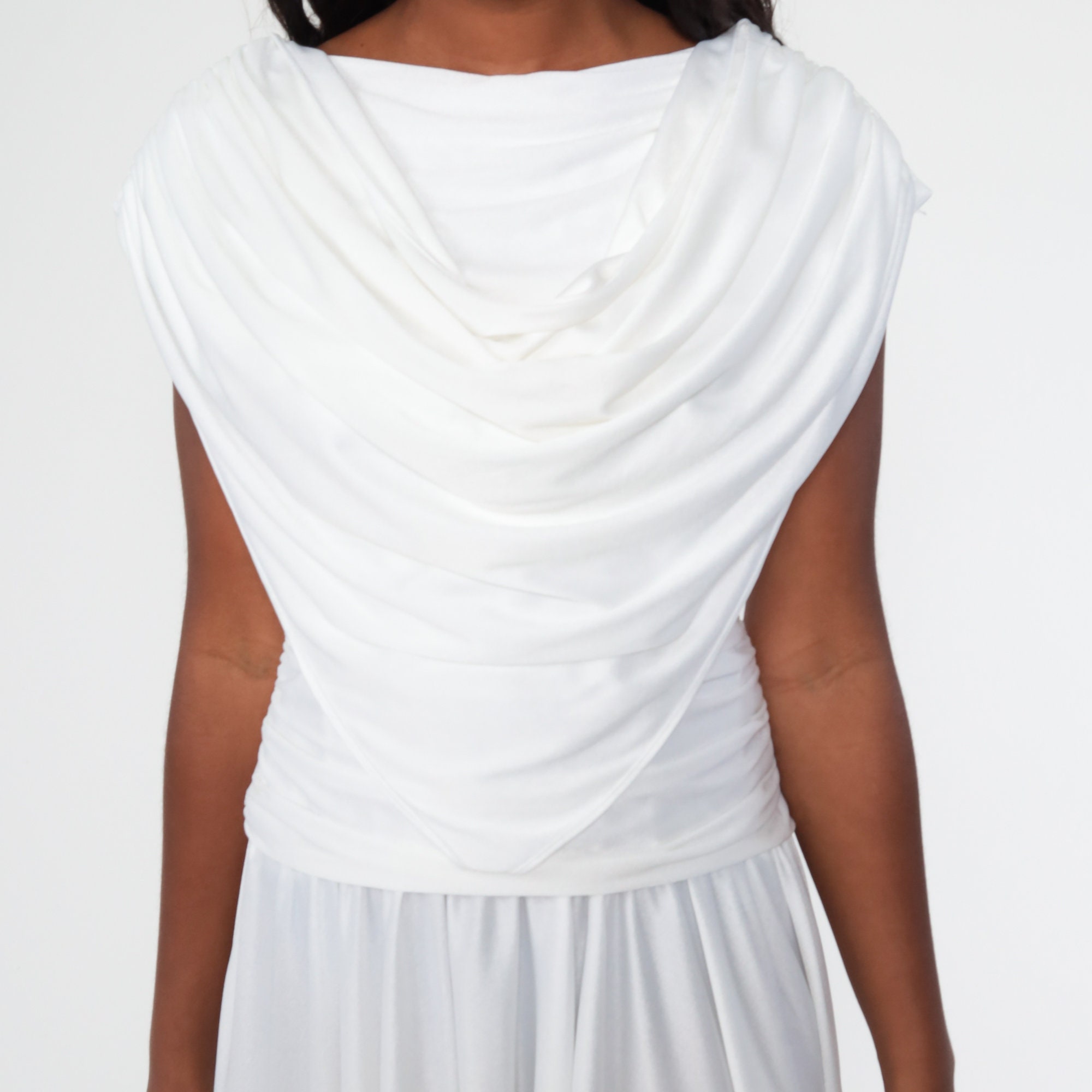 Vintage 70s dress in white with a draped bodice, a low back and a drop waist.