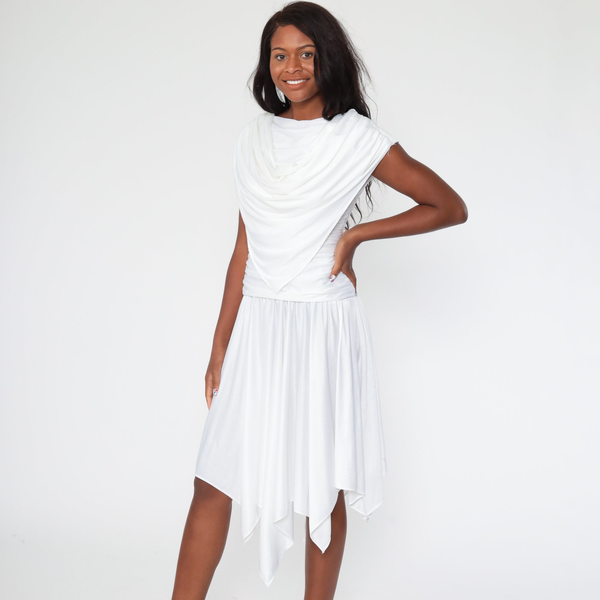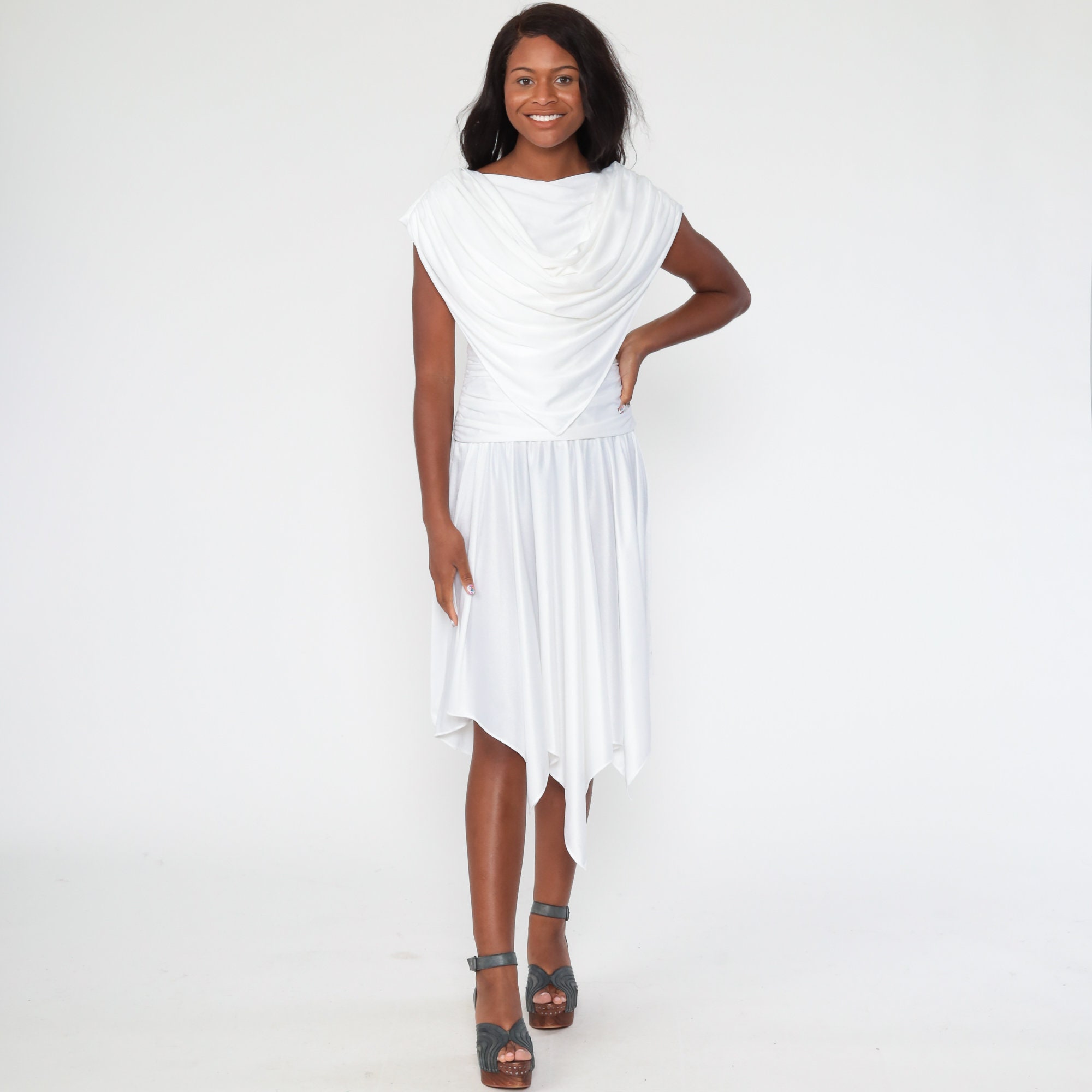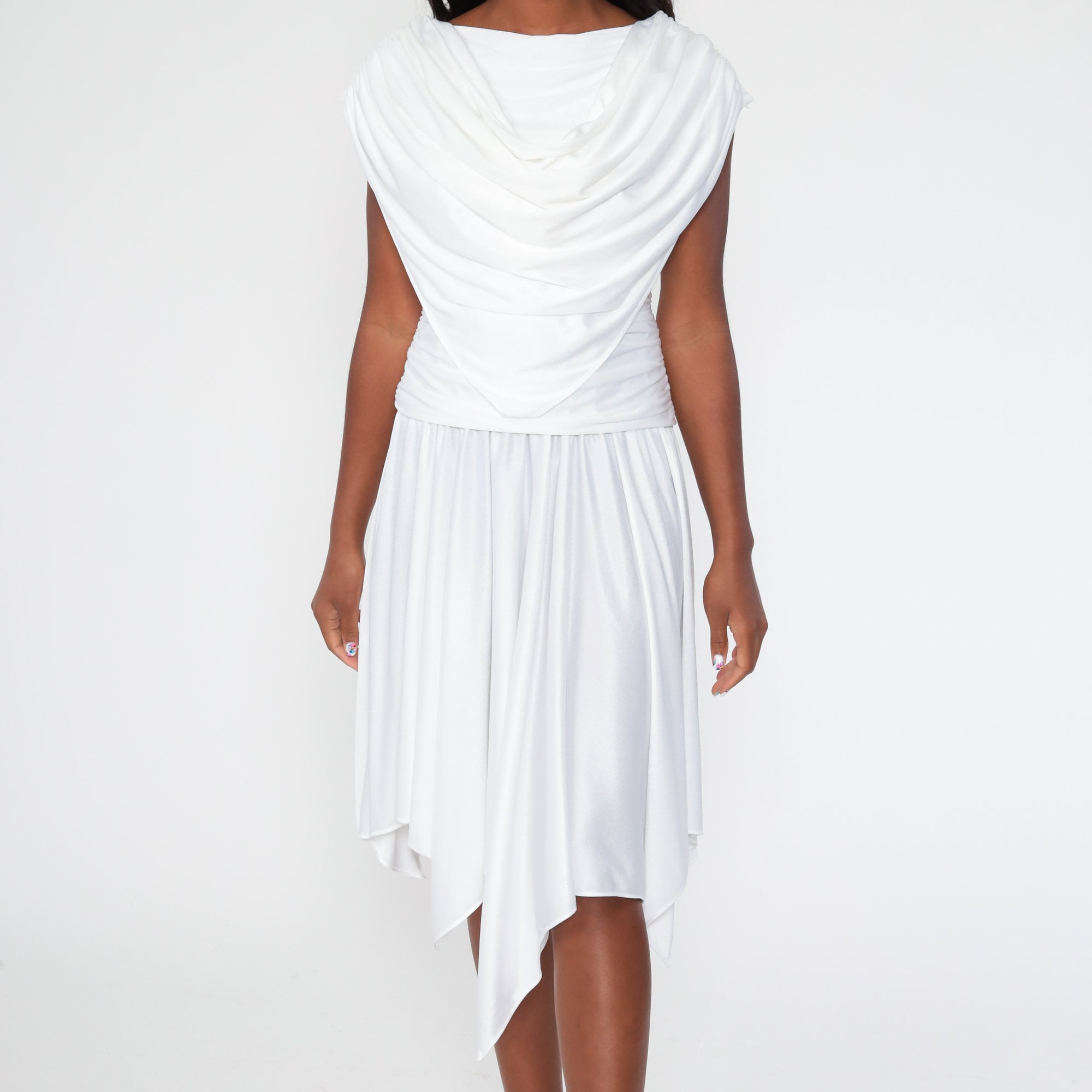 Vintage 70s dress in white with a draped bodice, a low back and a drop waist.