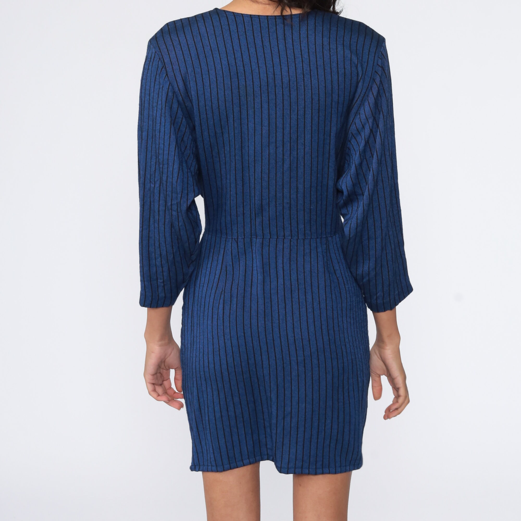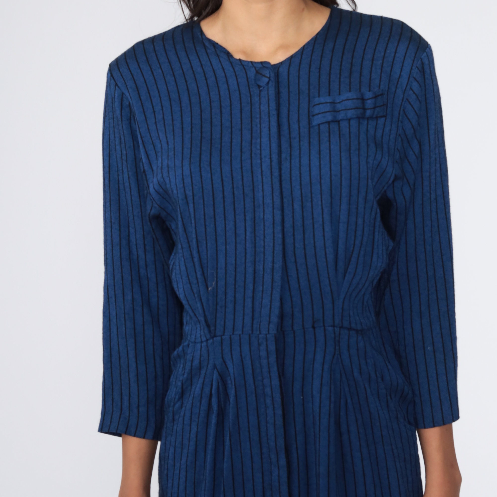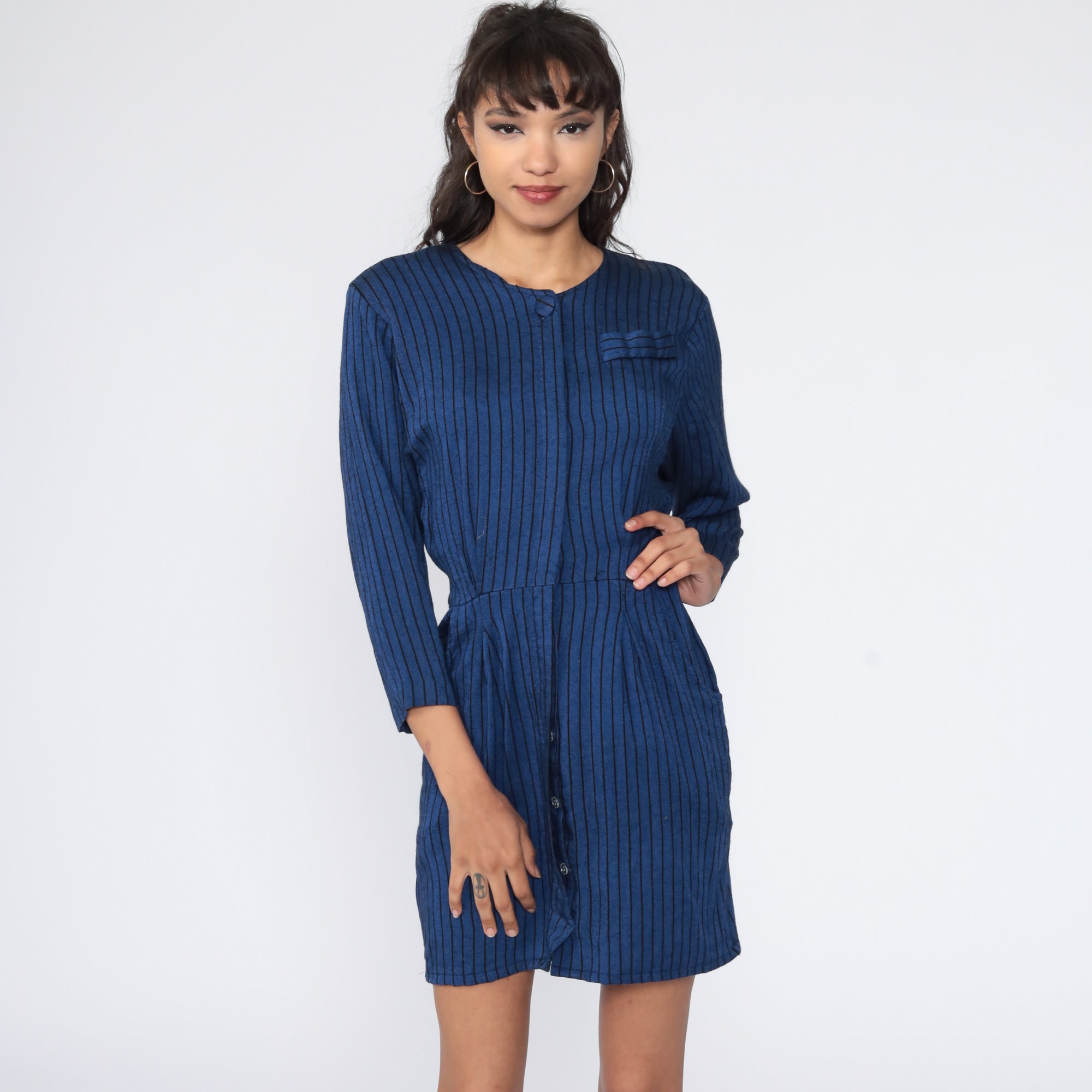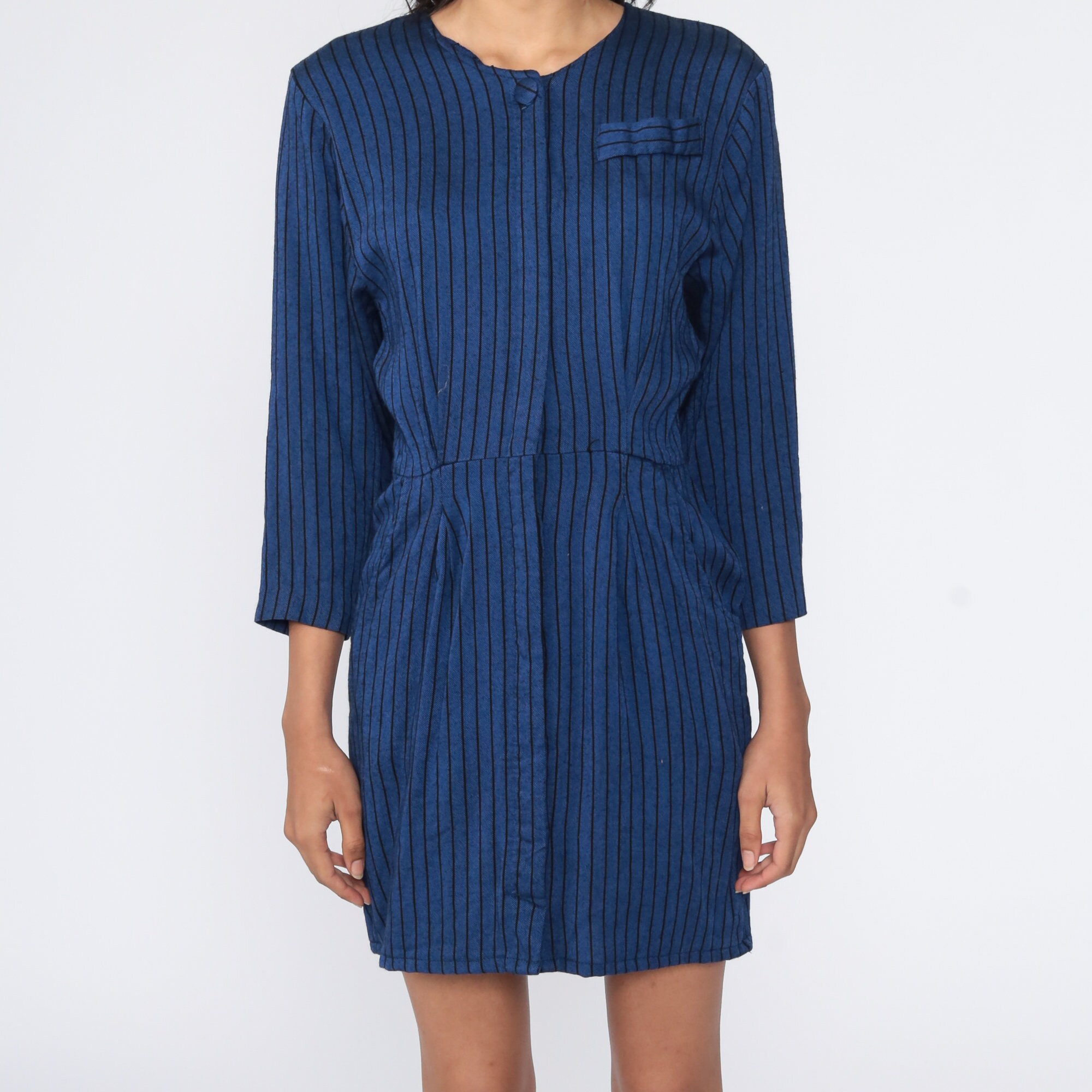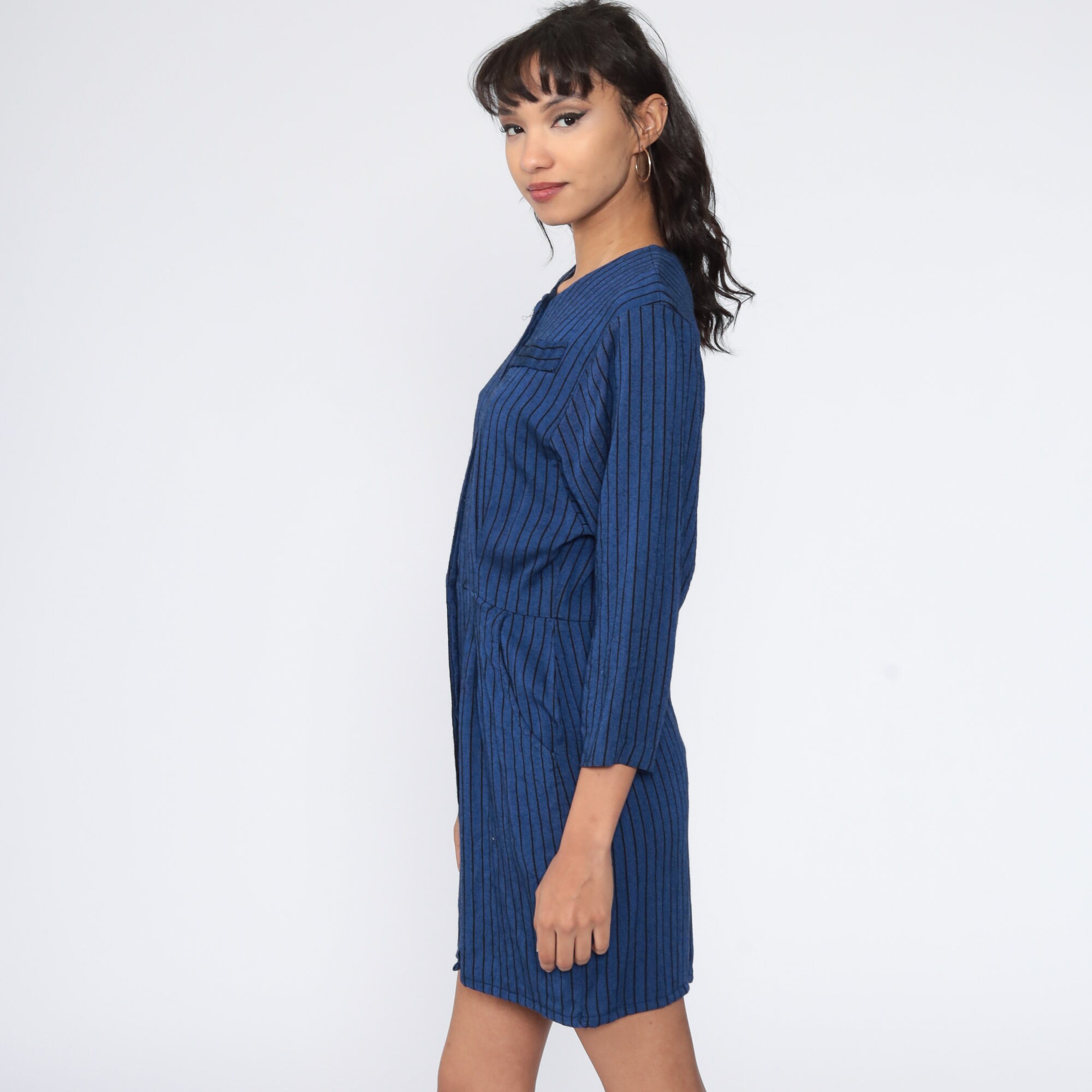 Vintage 80s dress in blue with a striped print. It has a high waist and buttons up the front. Mini length.