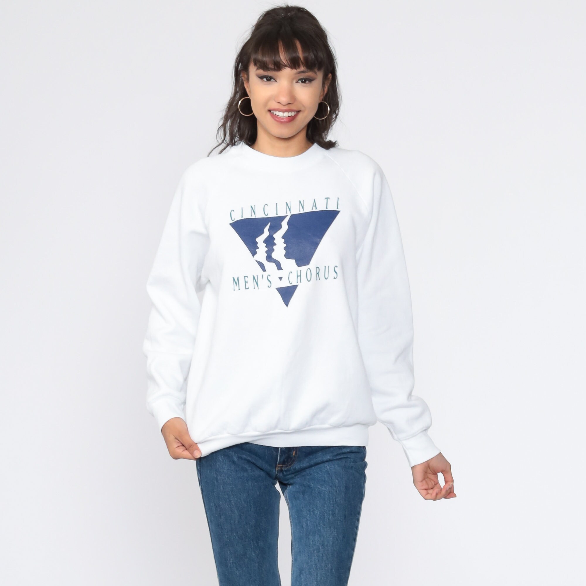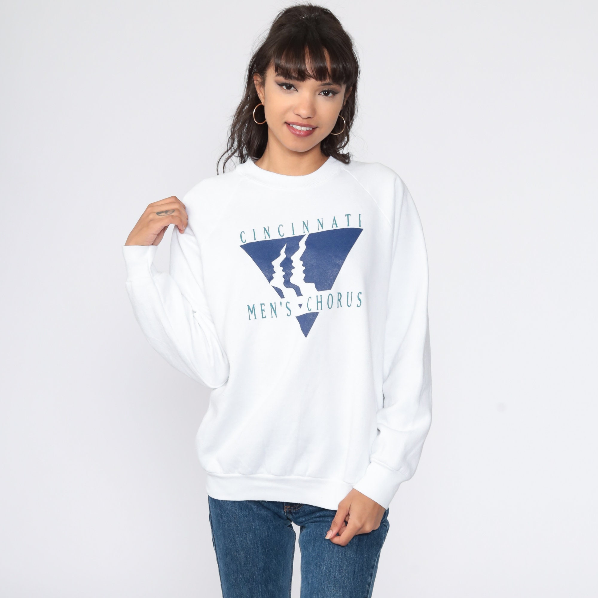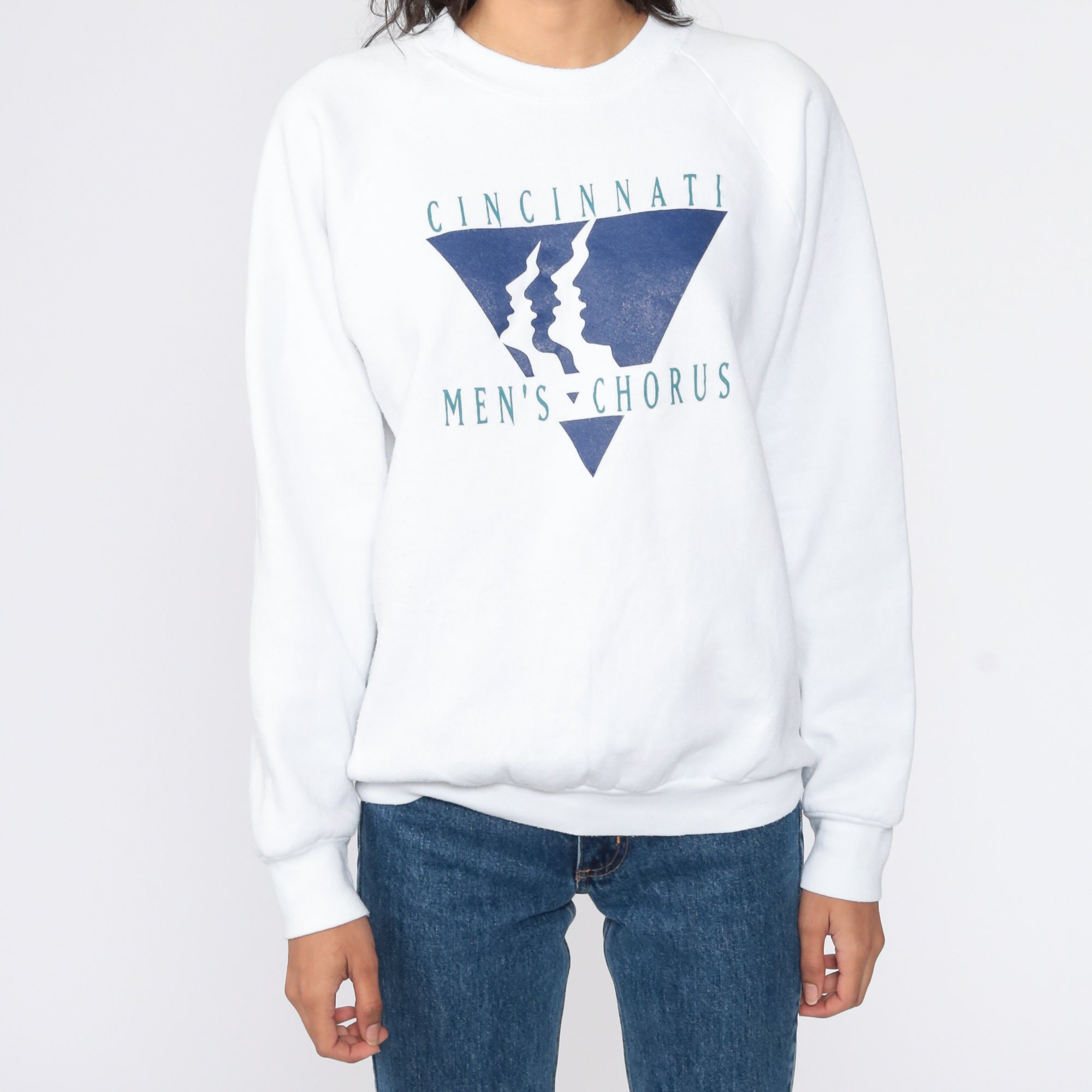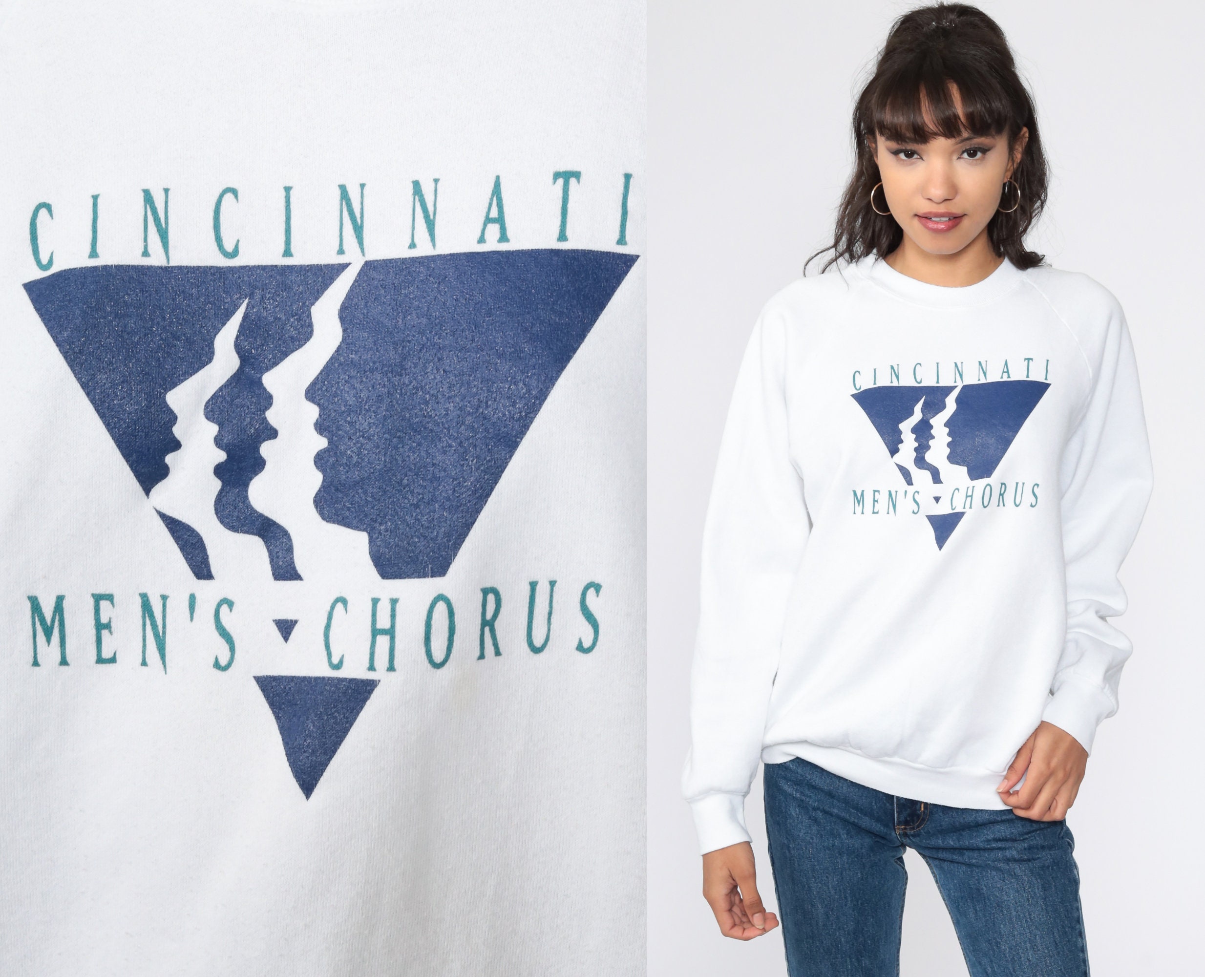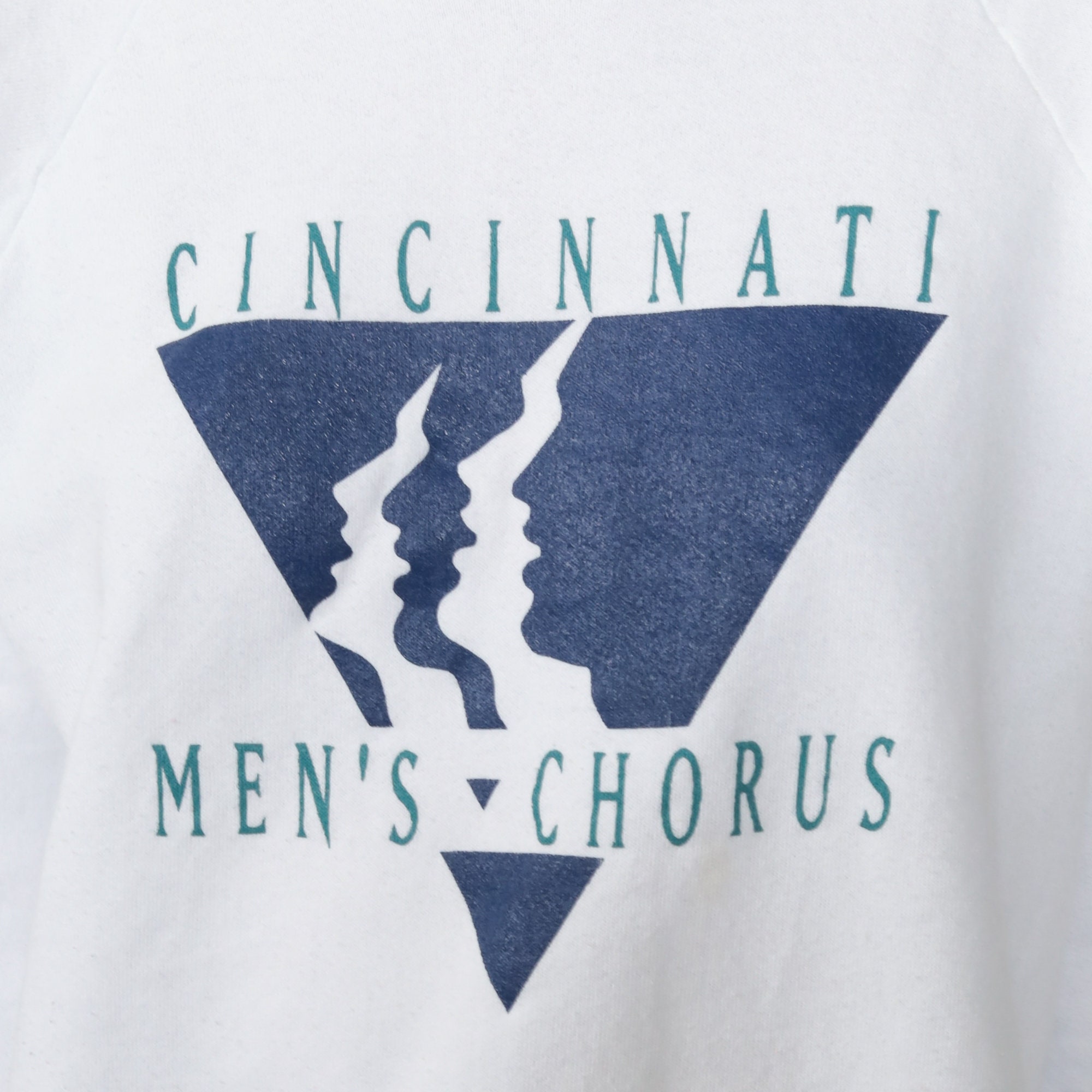Vintage 80s sweatshirt with a Cincinnati Men's Chorus print on the chest. Slouchy fit with raglan sleeves.