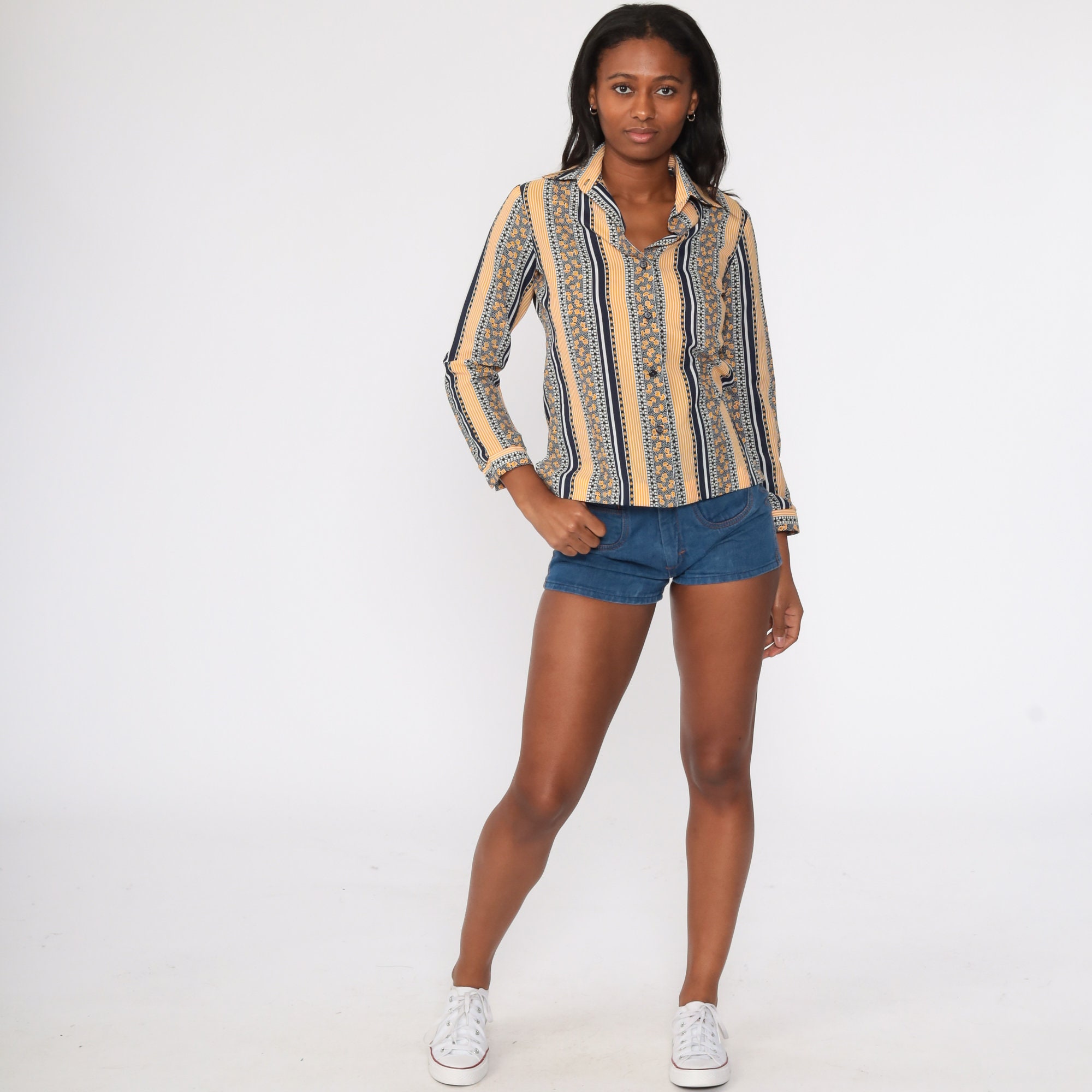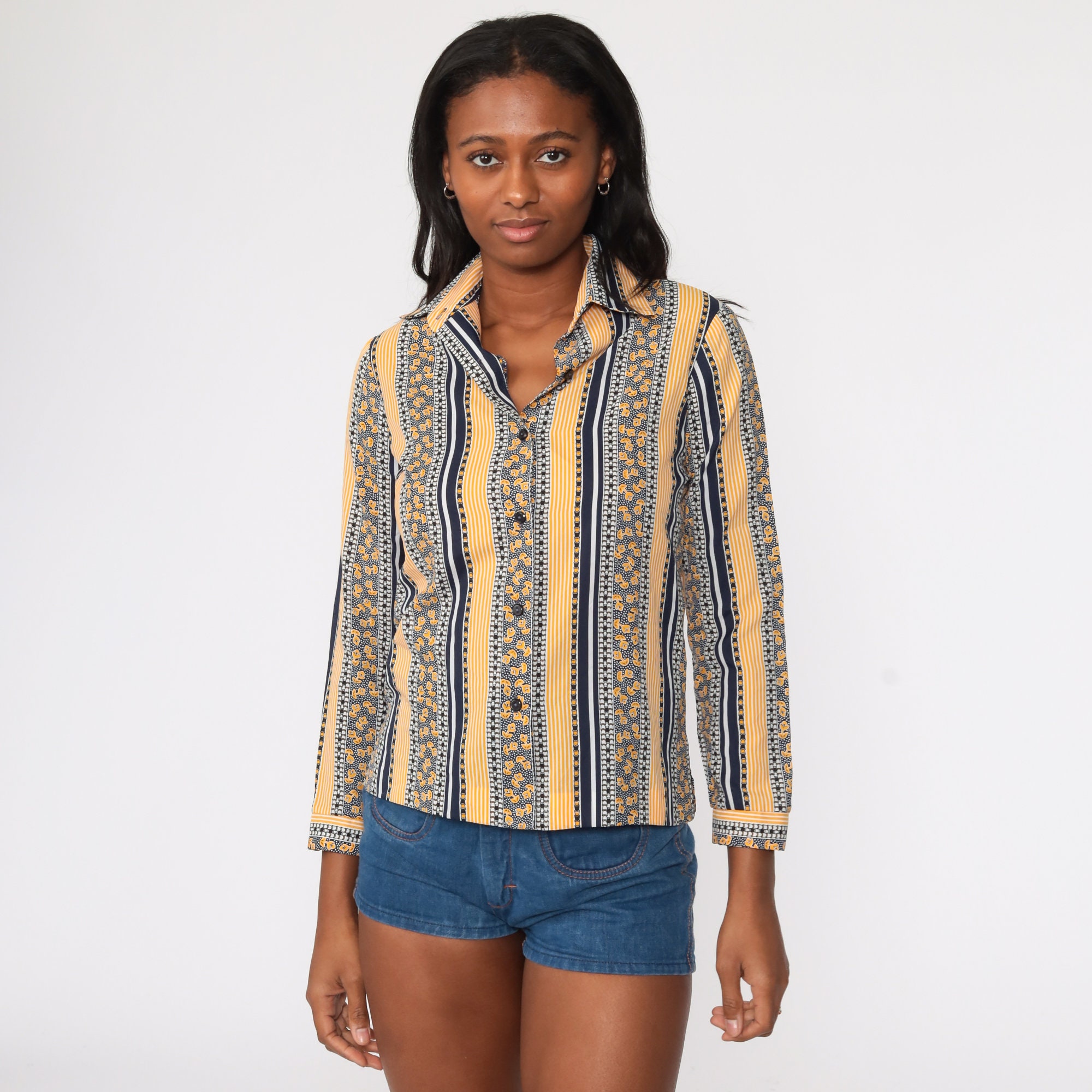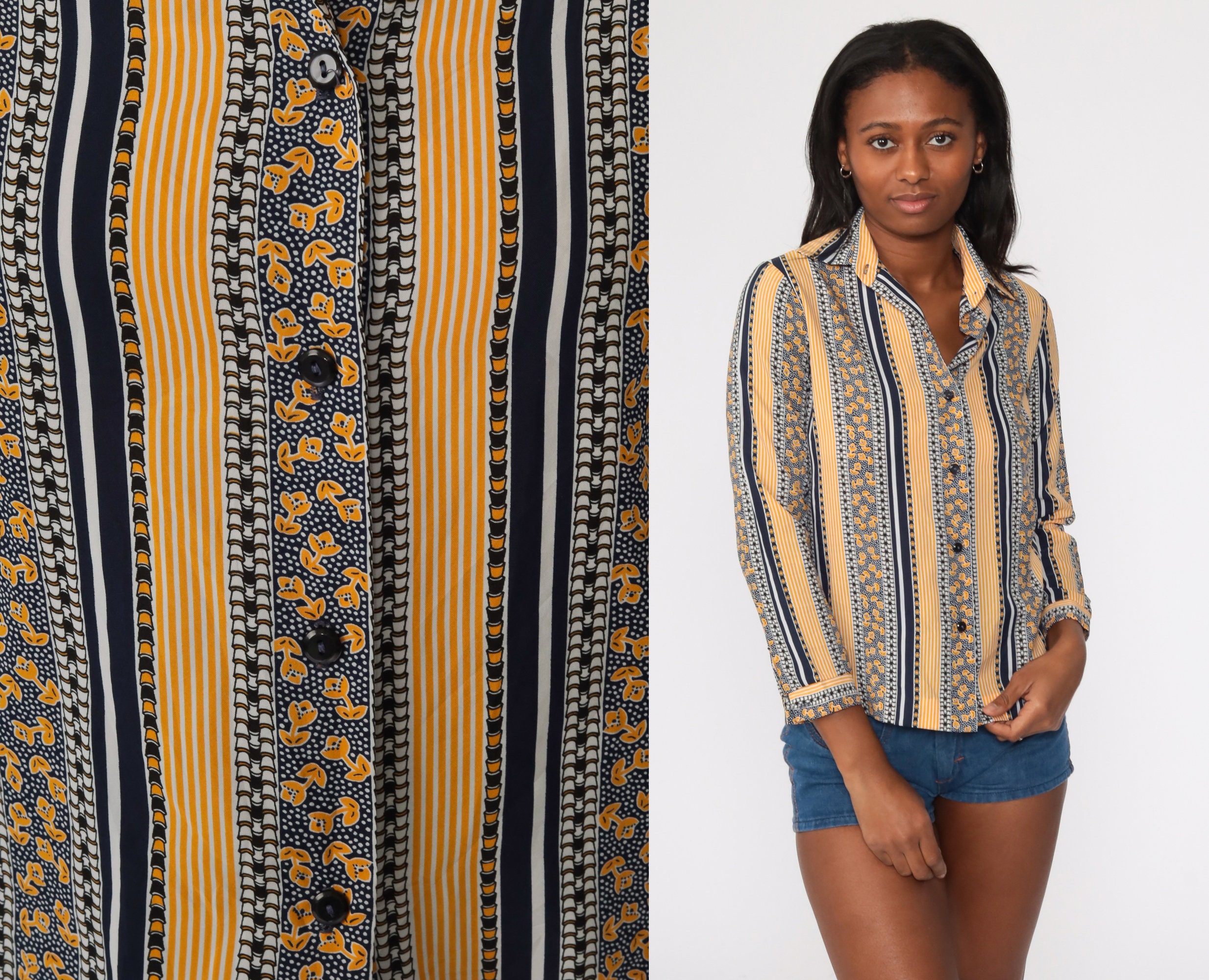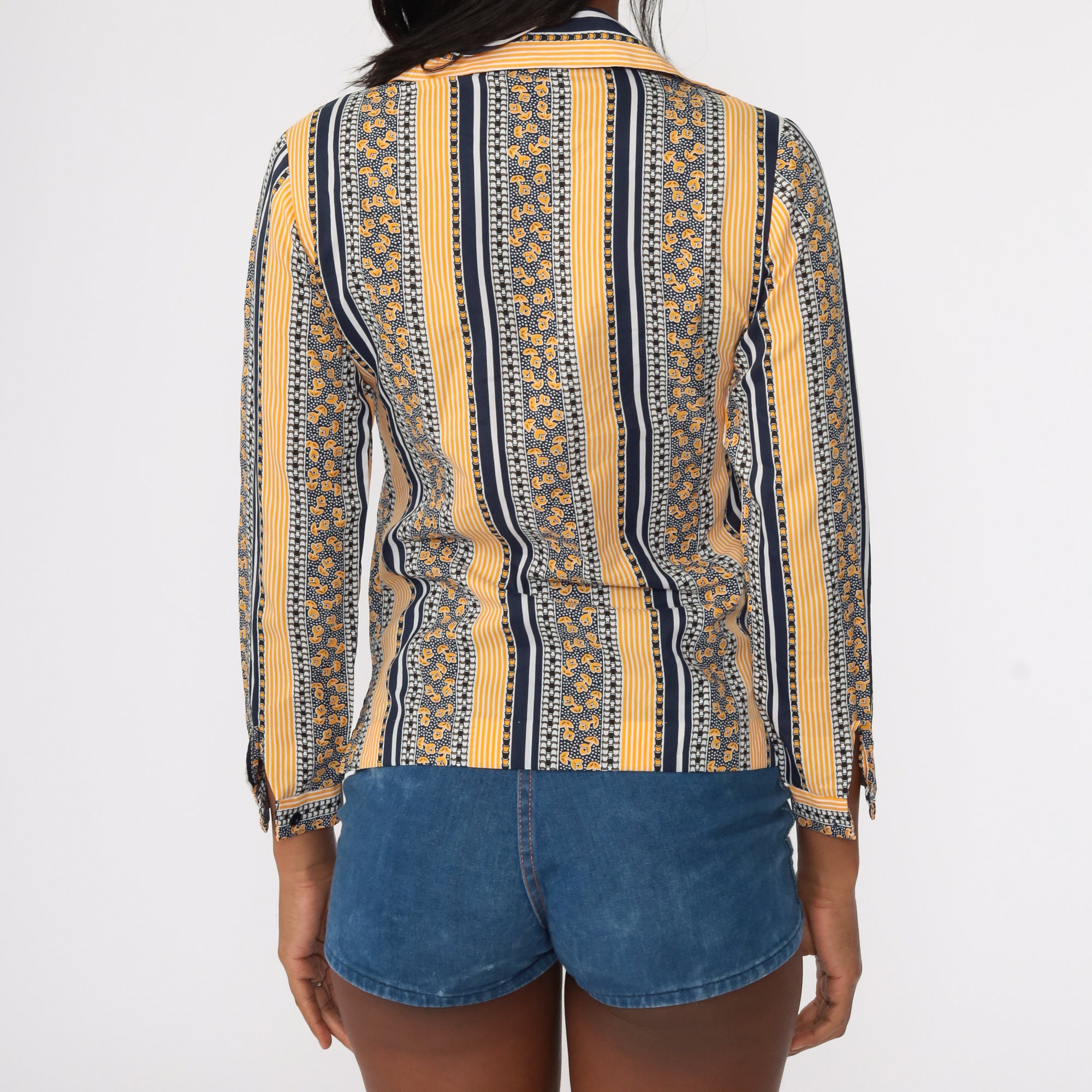 Vintage 70s shirt with a striped floral print. Buttons up the front with long sleeves and a pointed collar.