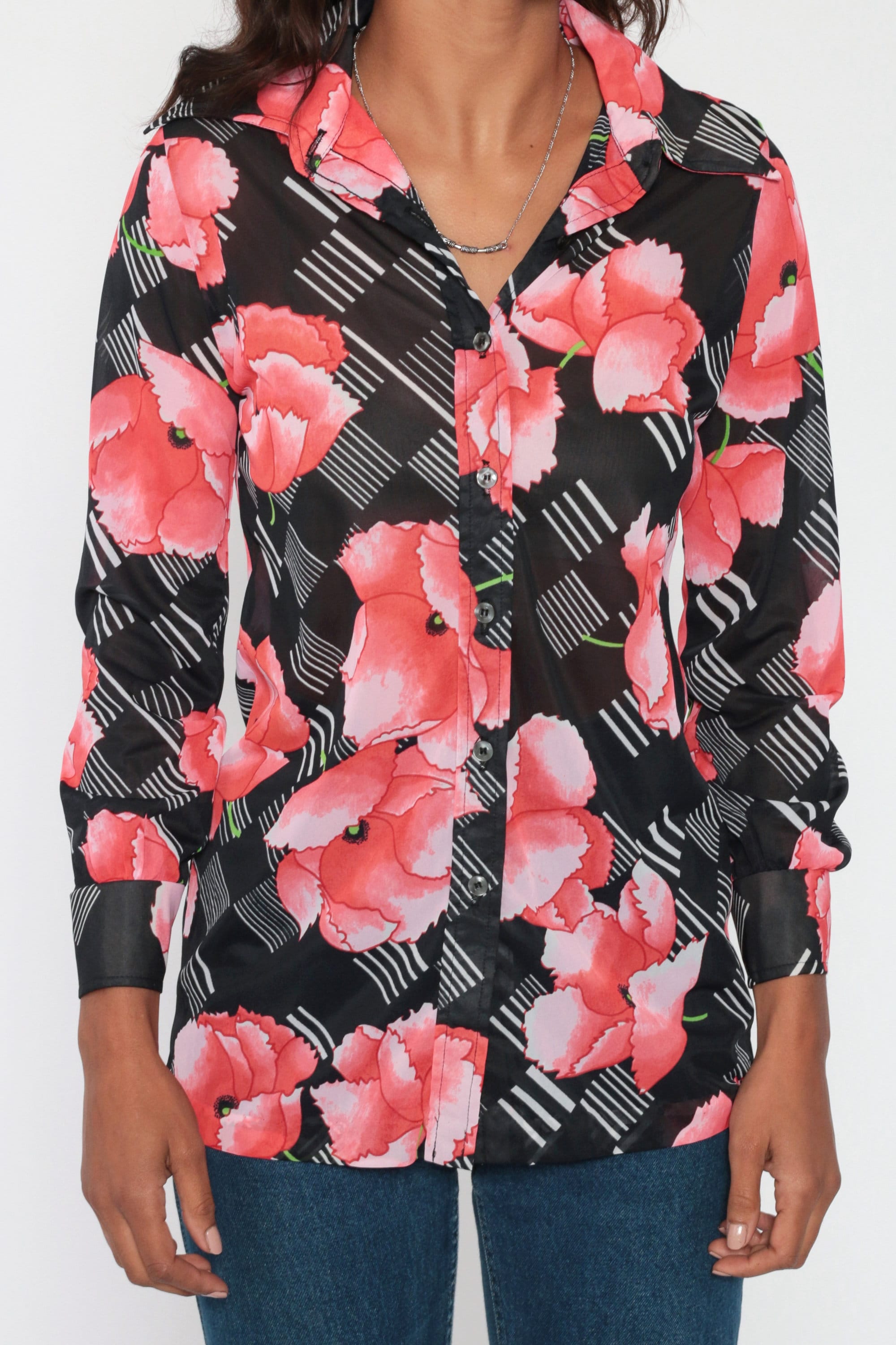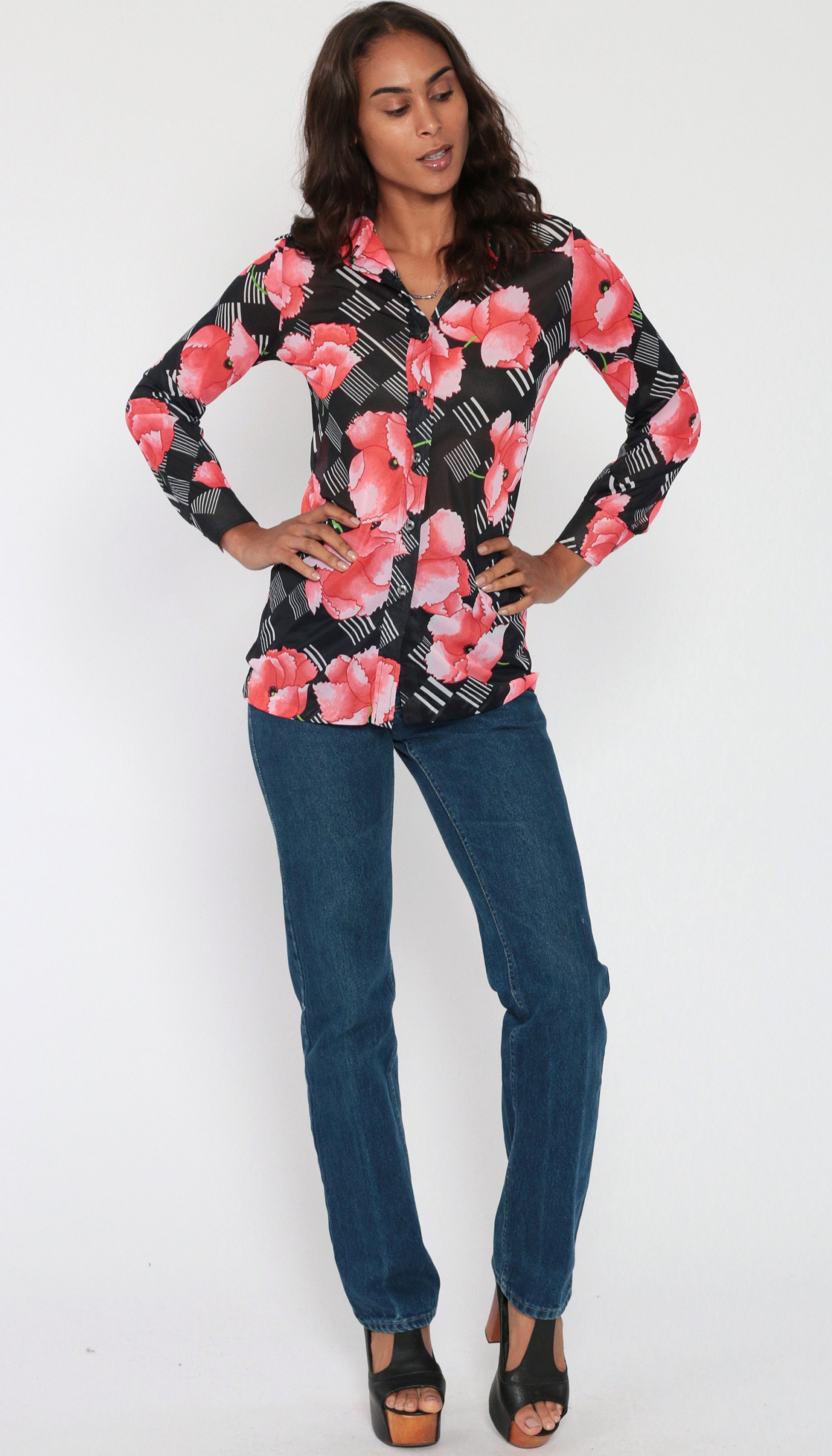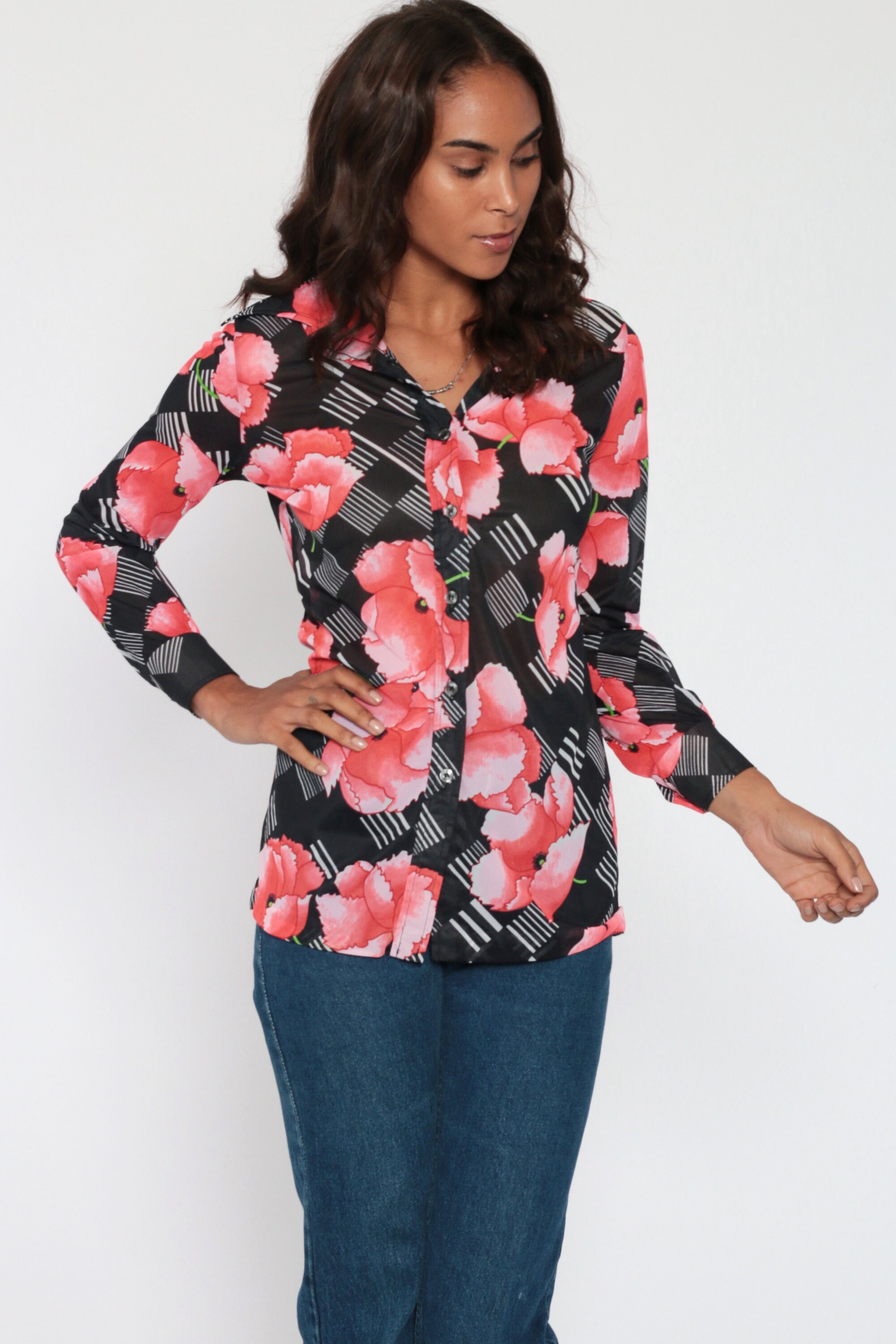 Vintage 70s blouse in sheer black with a floral poppy print. It has buttons up the front, long sleeves and a pointed collar.