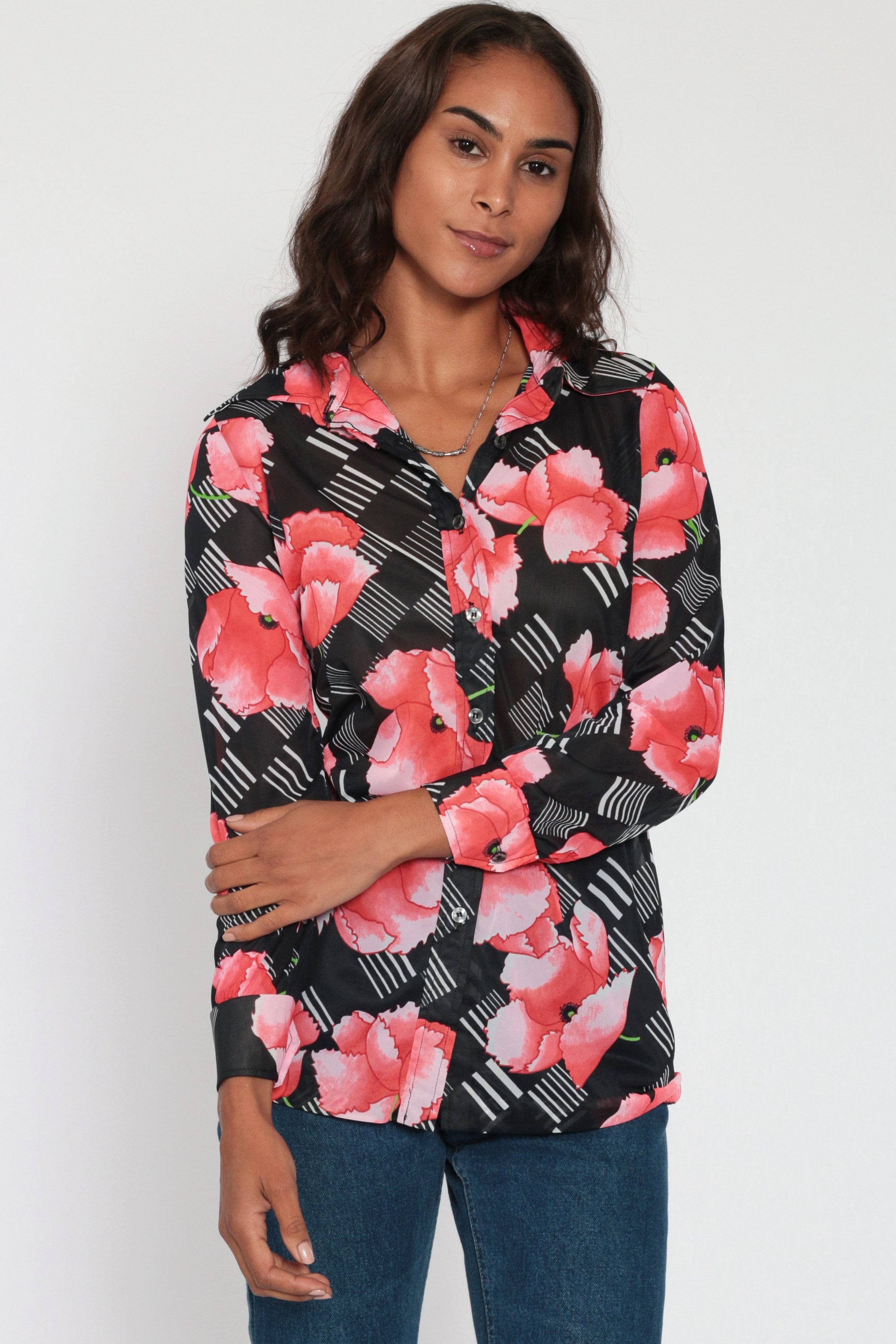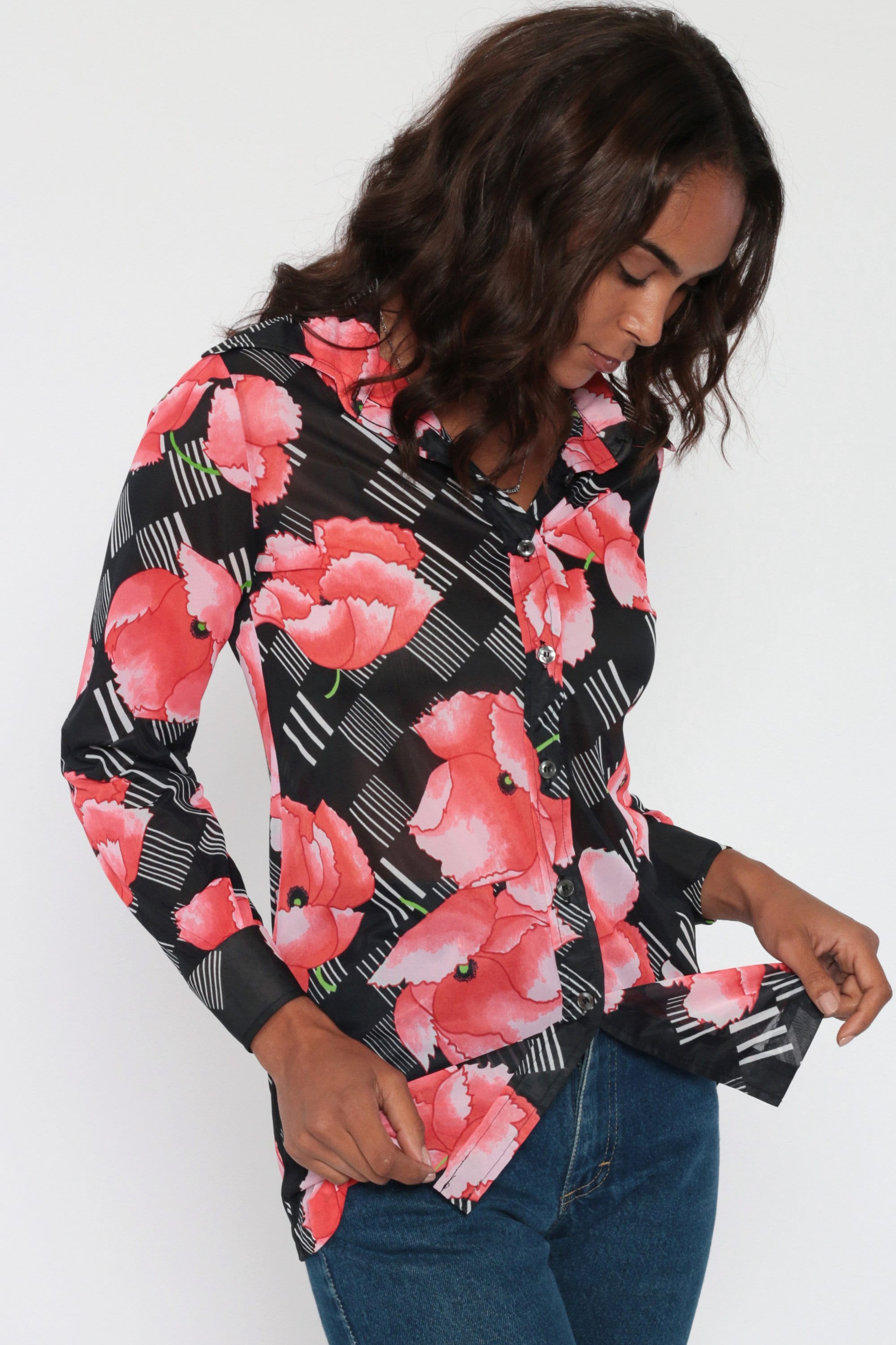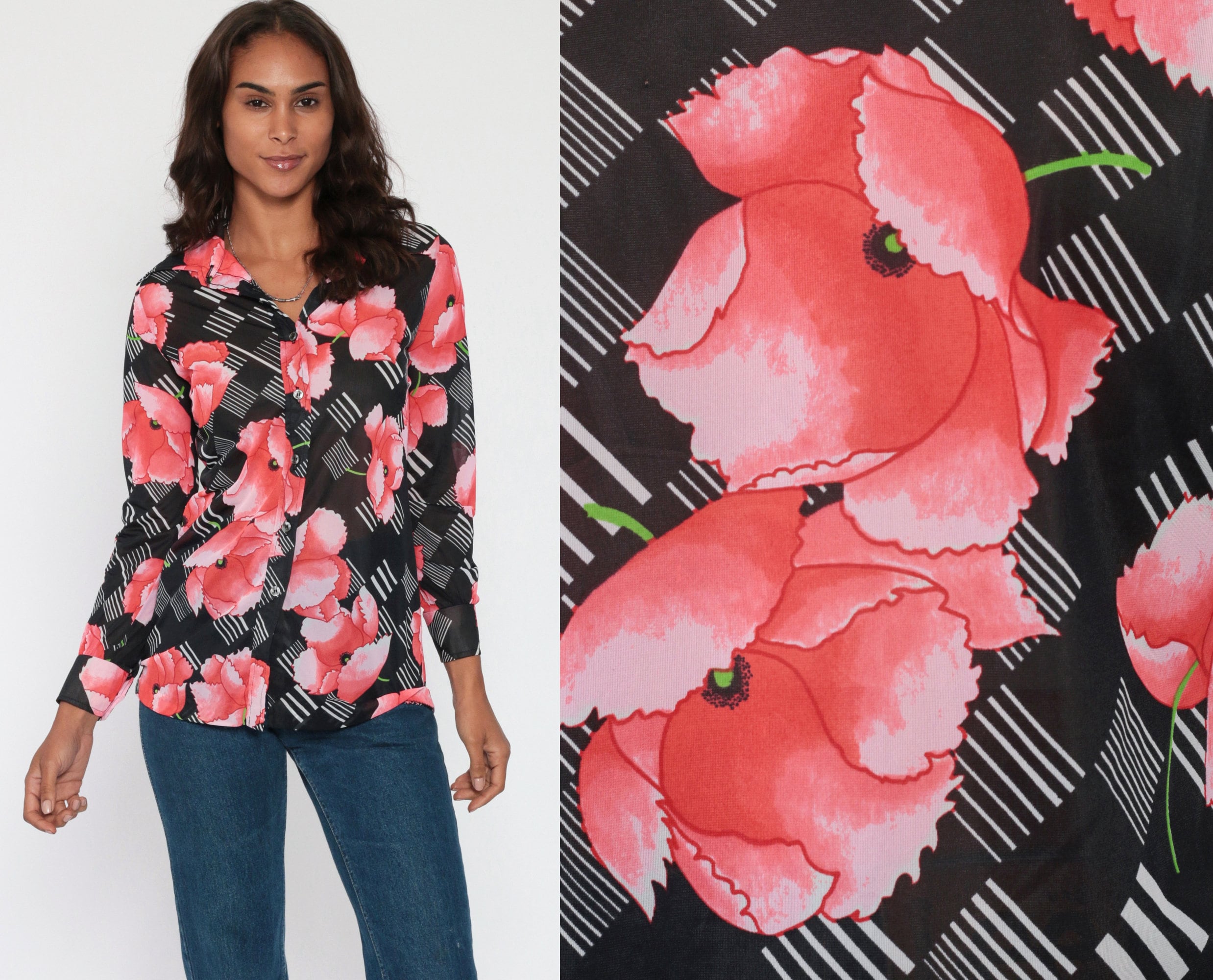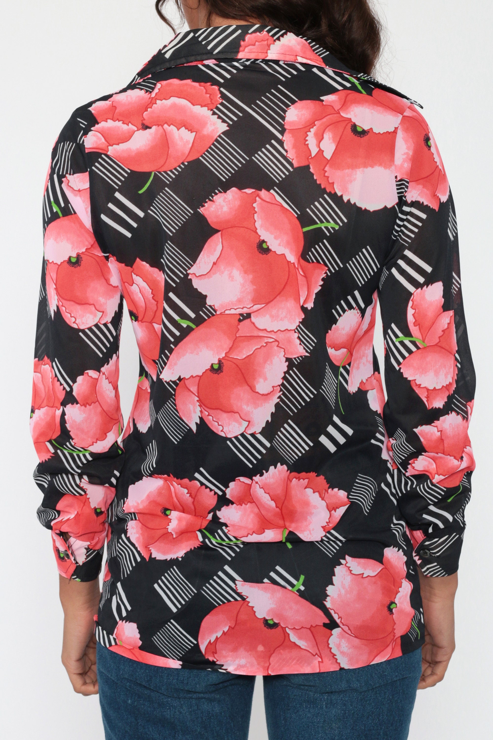 Vintage 70s blouse in sheer black with a floral poppy print. It has buttons up the front, long sleeves and a pointed collar.