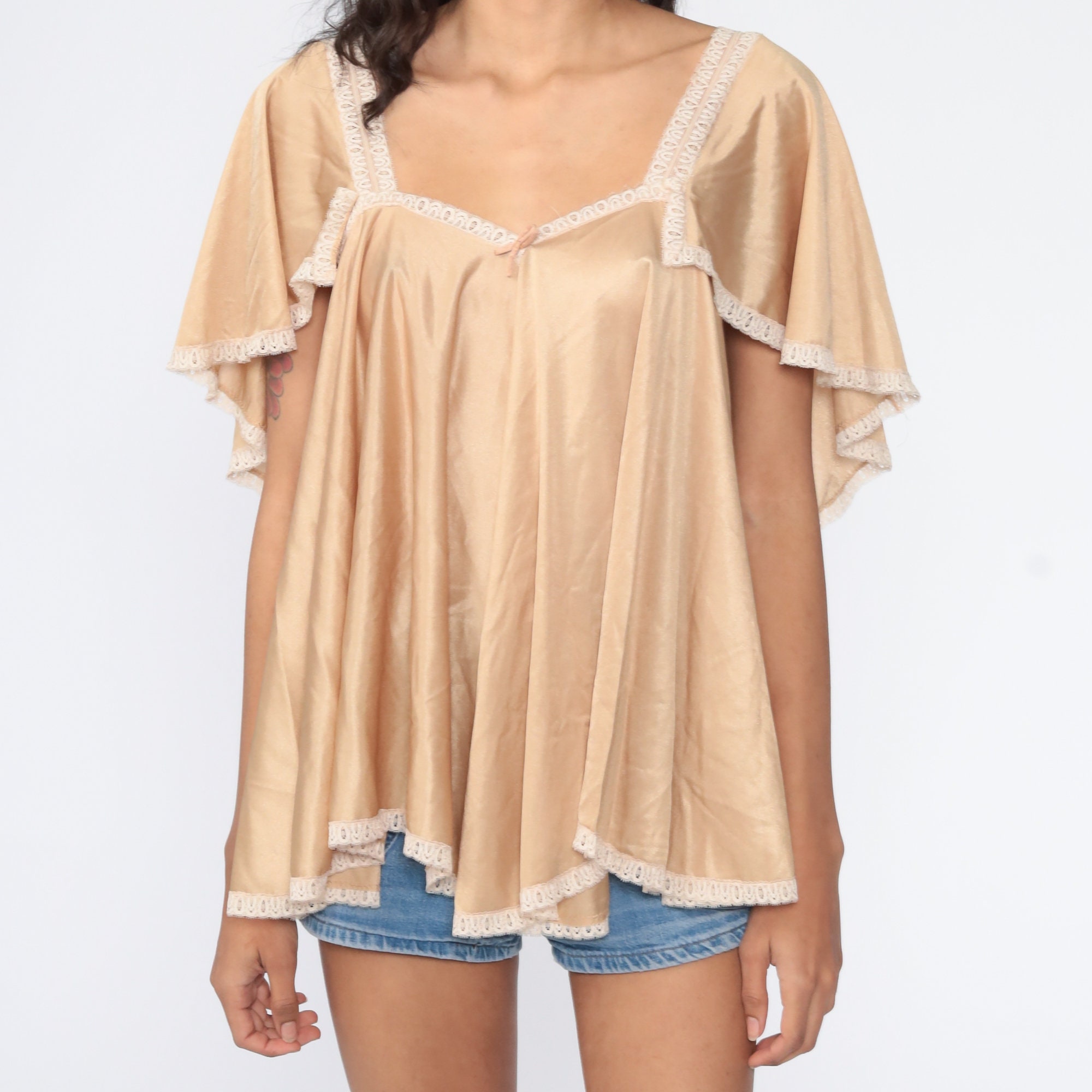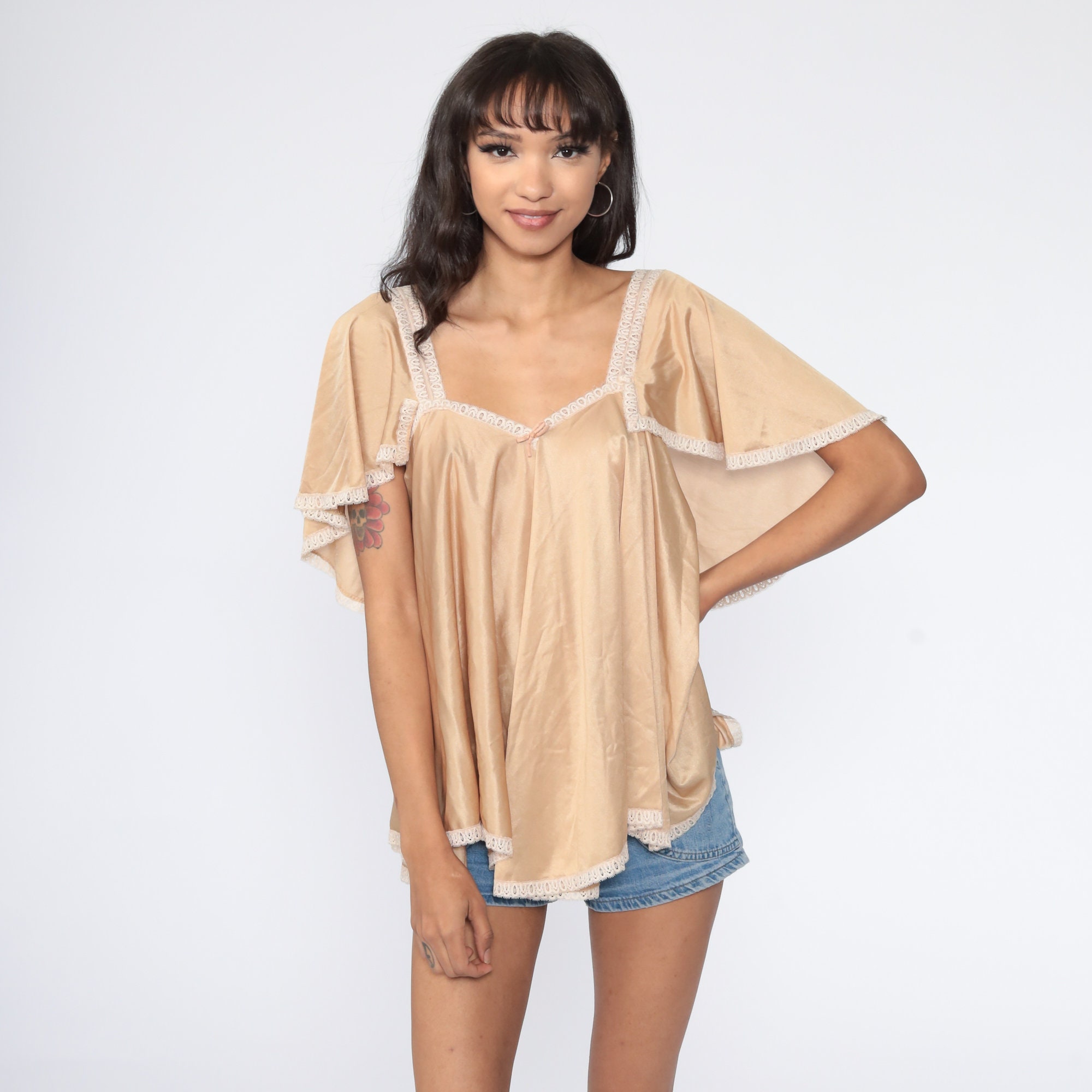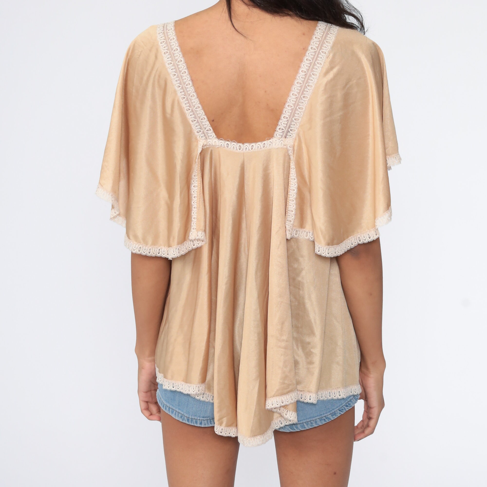 Vintage 70s top in tan with a tent cut and flutter sleeves.
