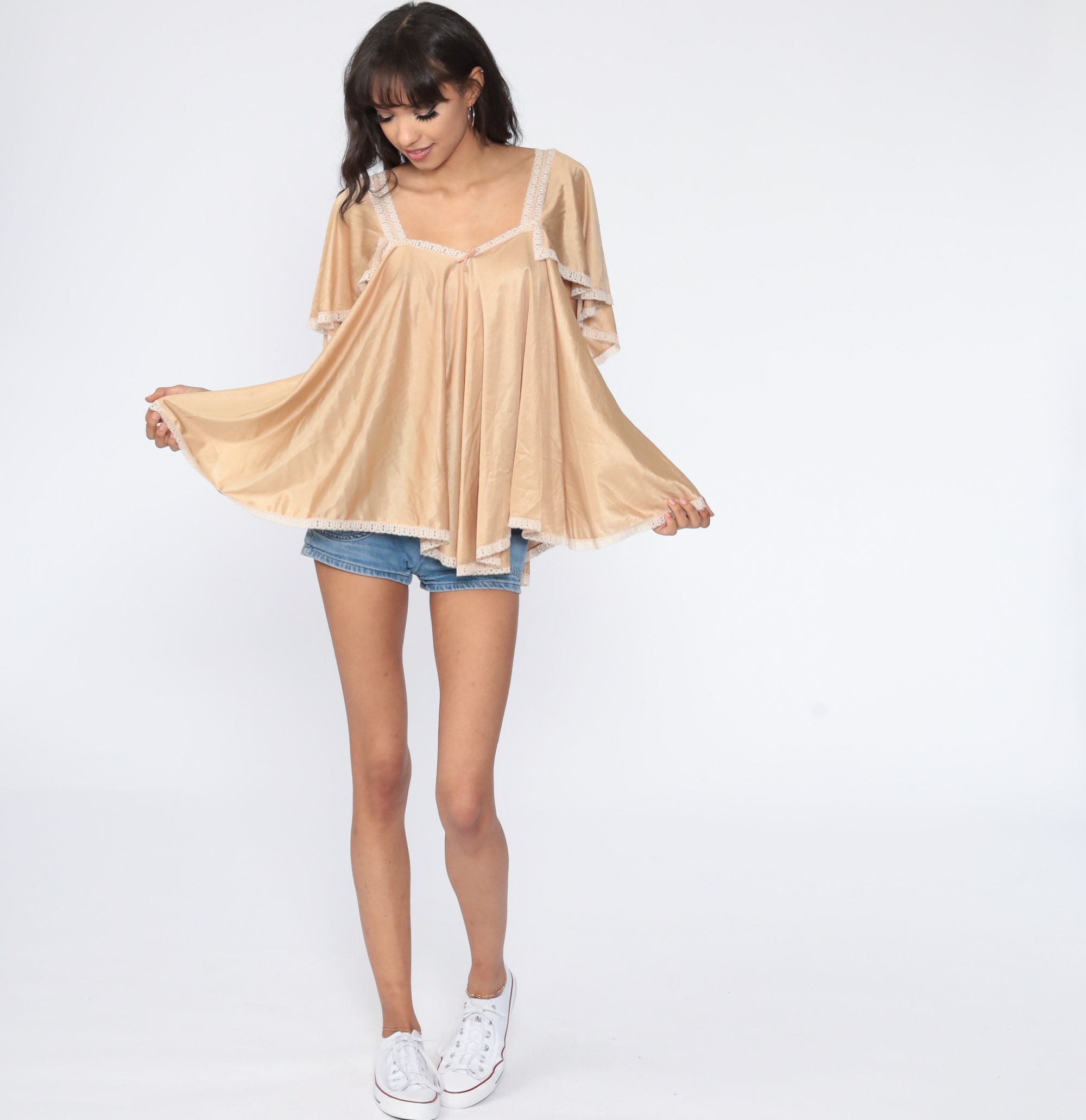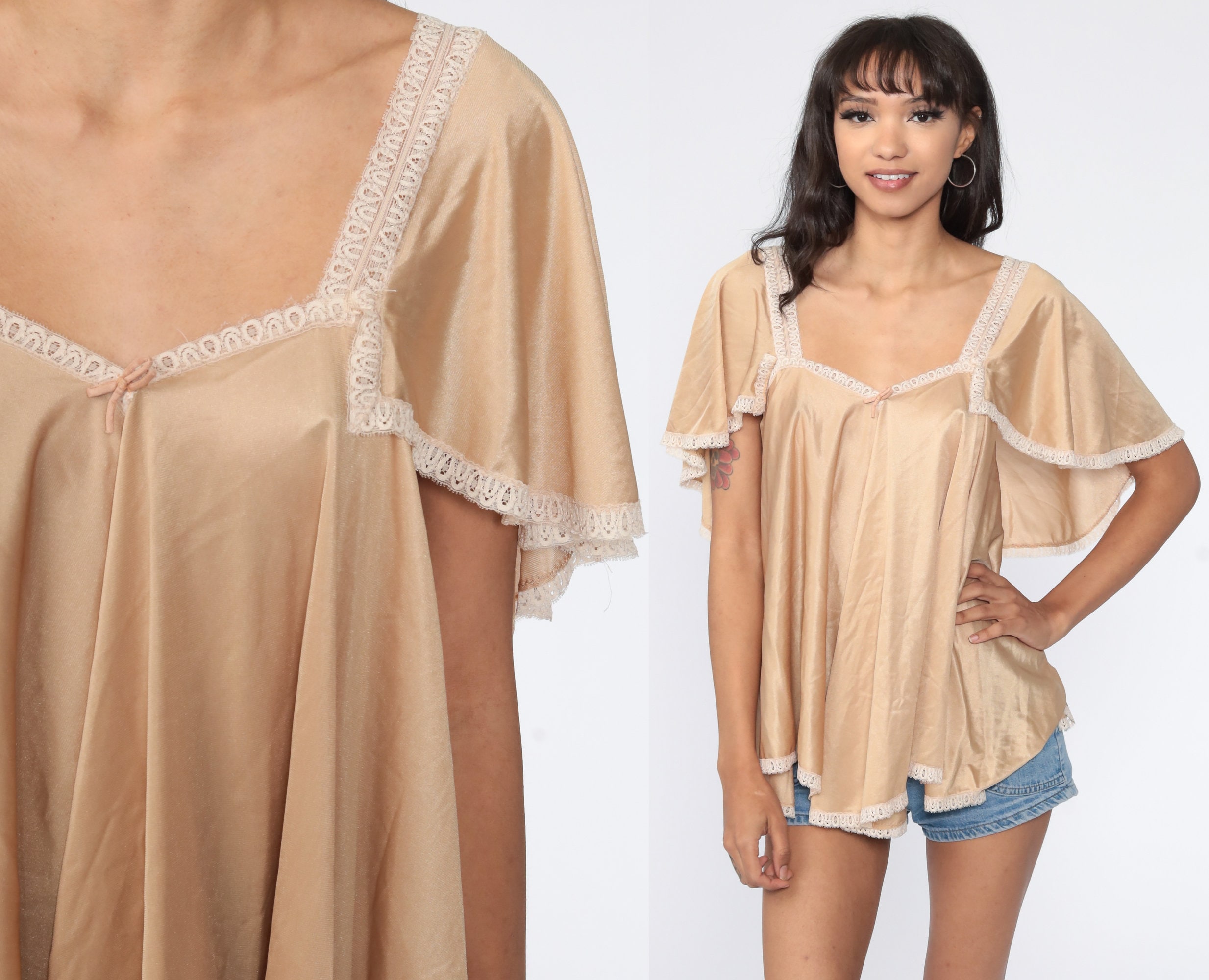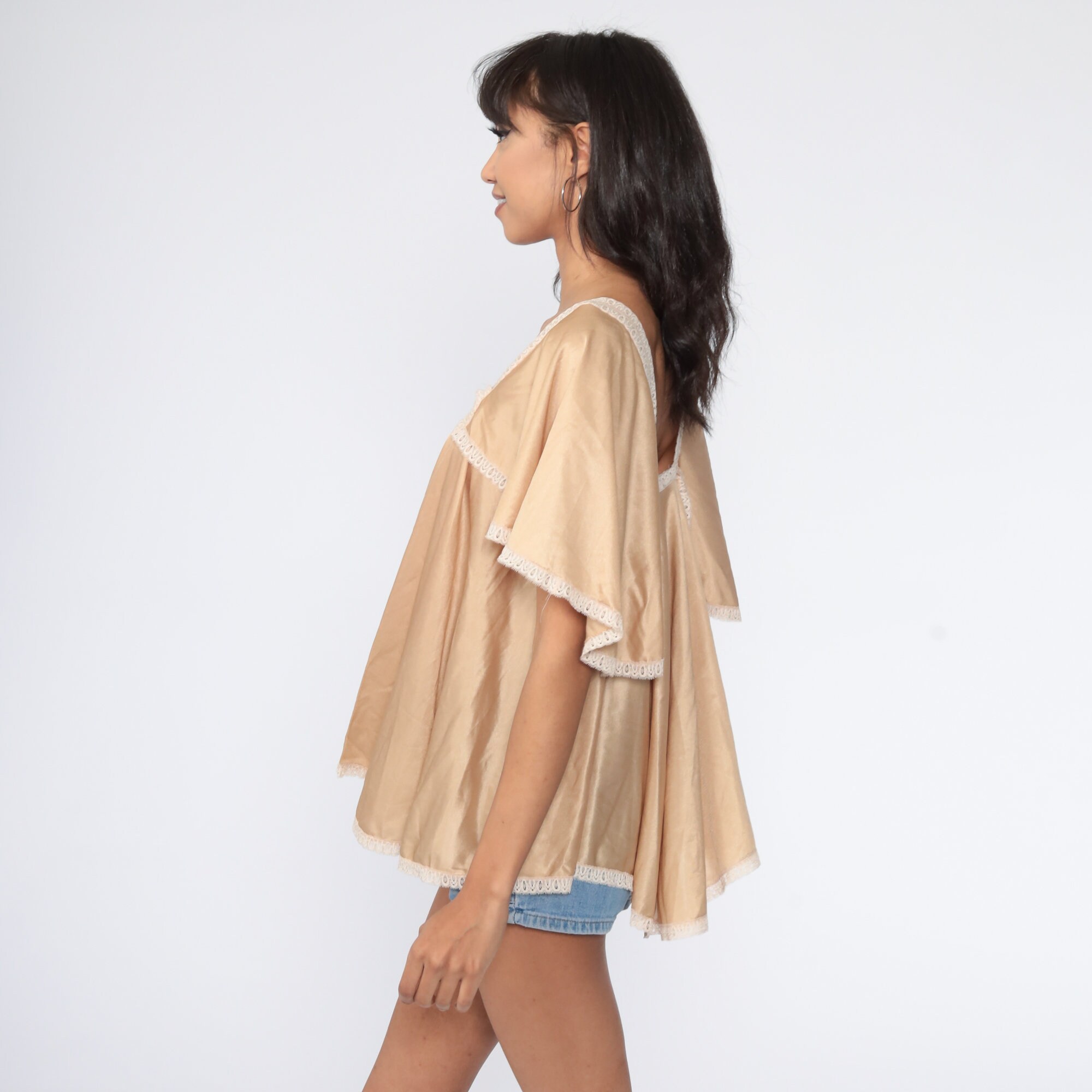 Vintage 70s top in tan with a tent cut and flutter sleeves.