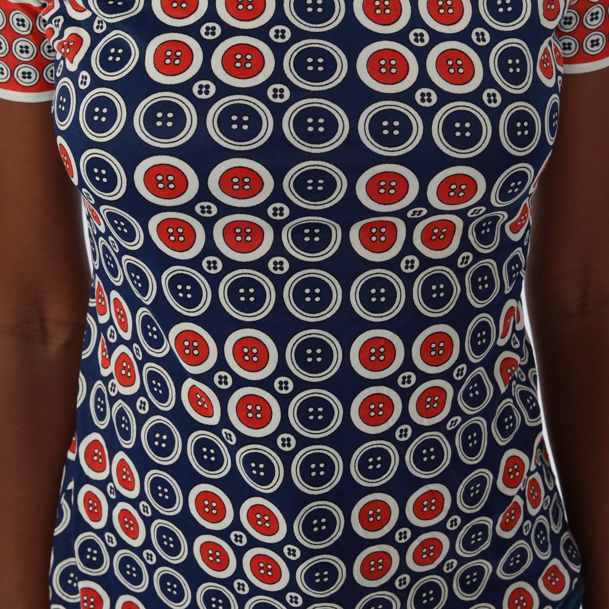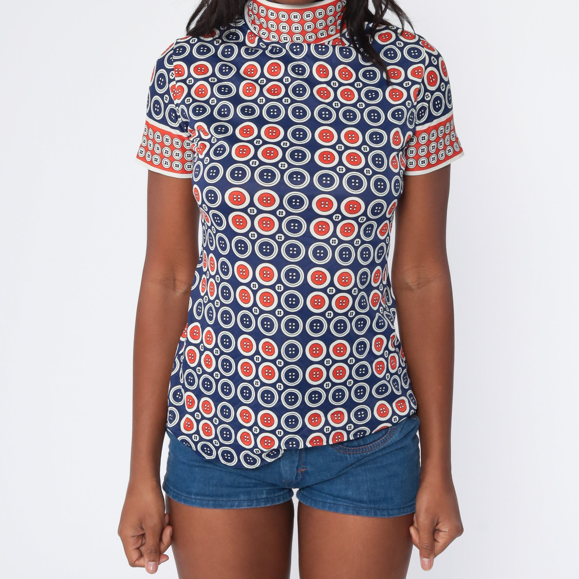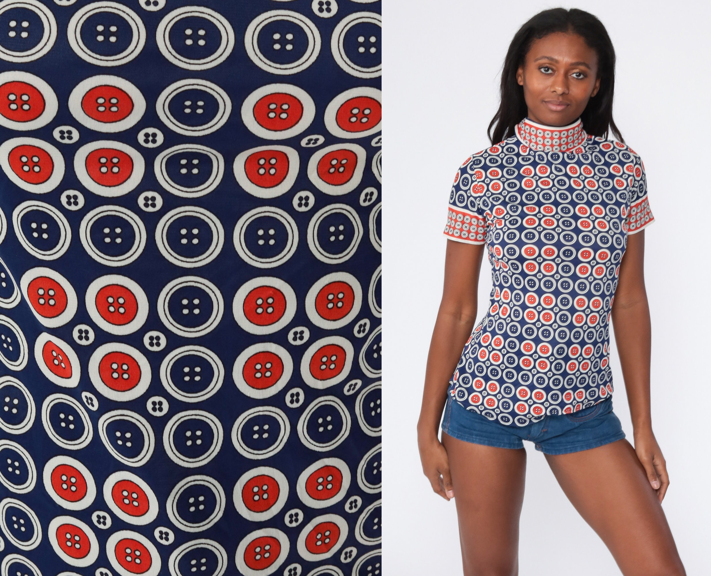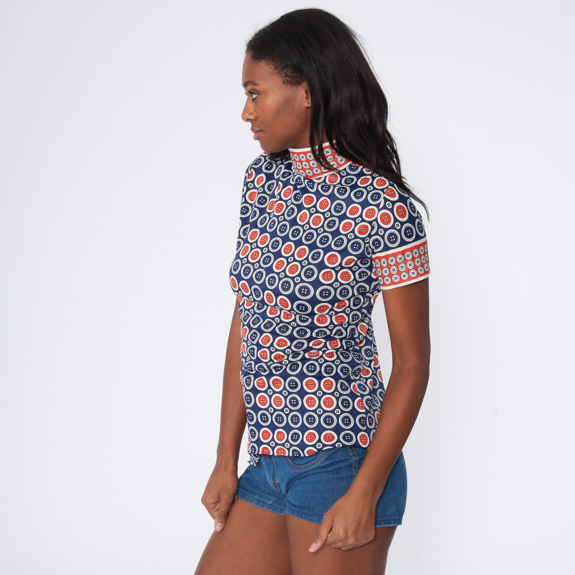 Vintage 70s shirt in a red and blue button print with a rear zipper. Has short sleeves.