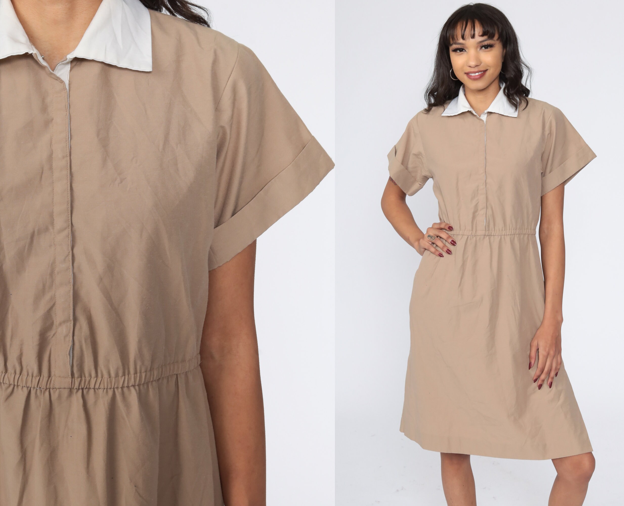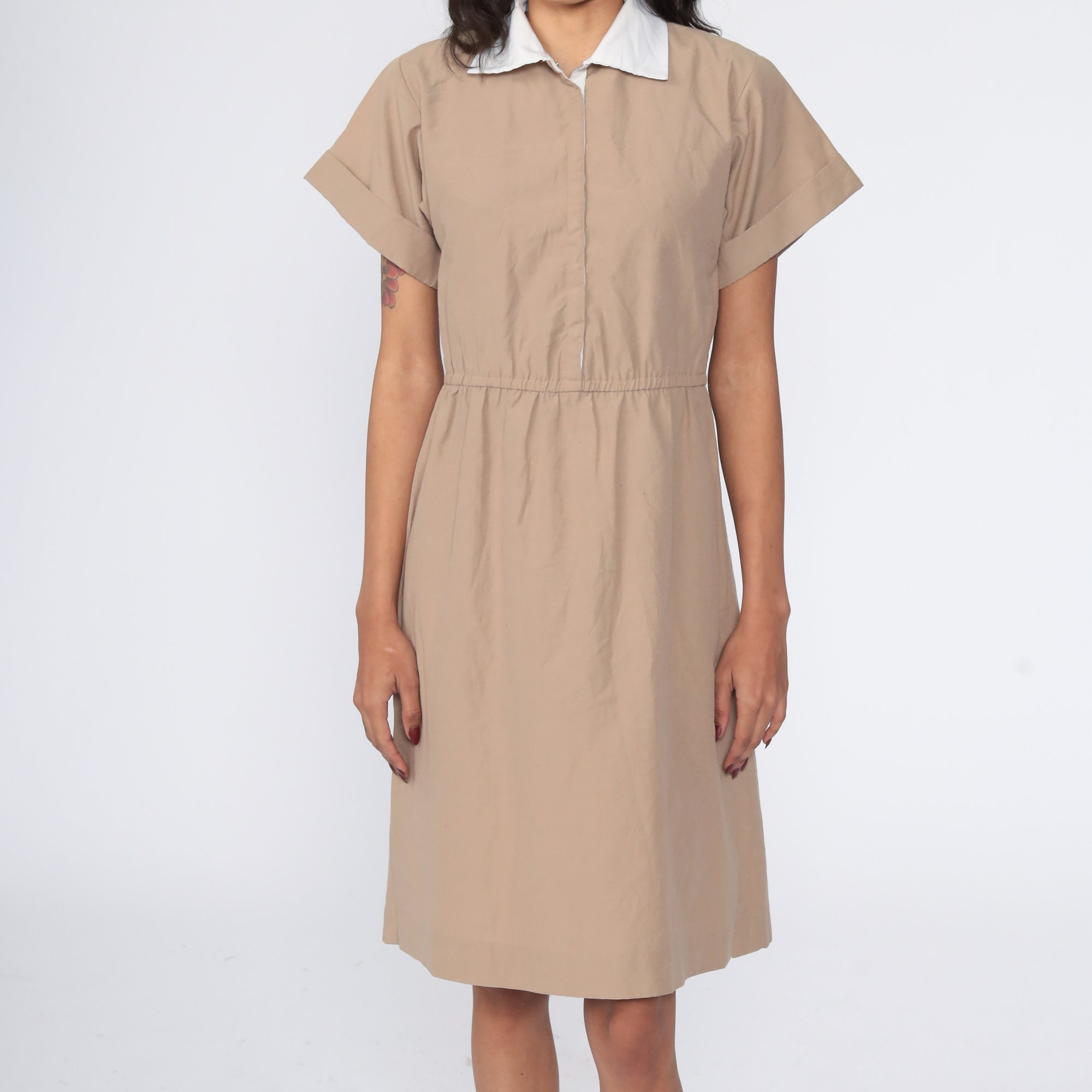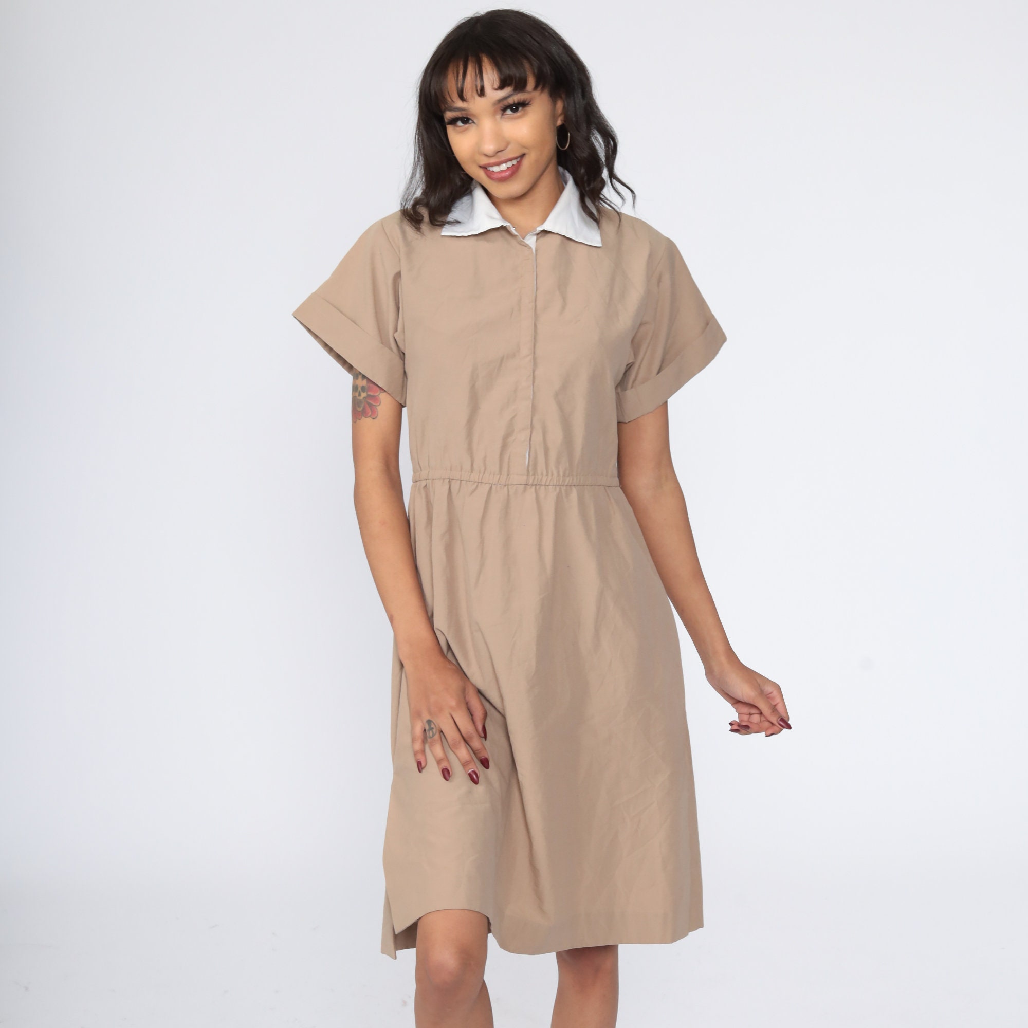 Vintage 80s dress in khaki with hidden buttons up the chest. High waisted with short sleeves and a flared skirt. Midi length.