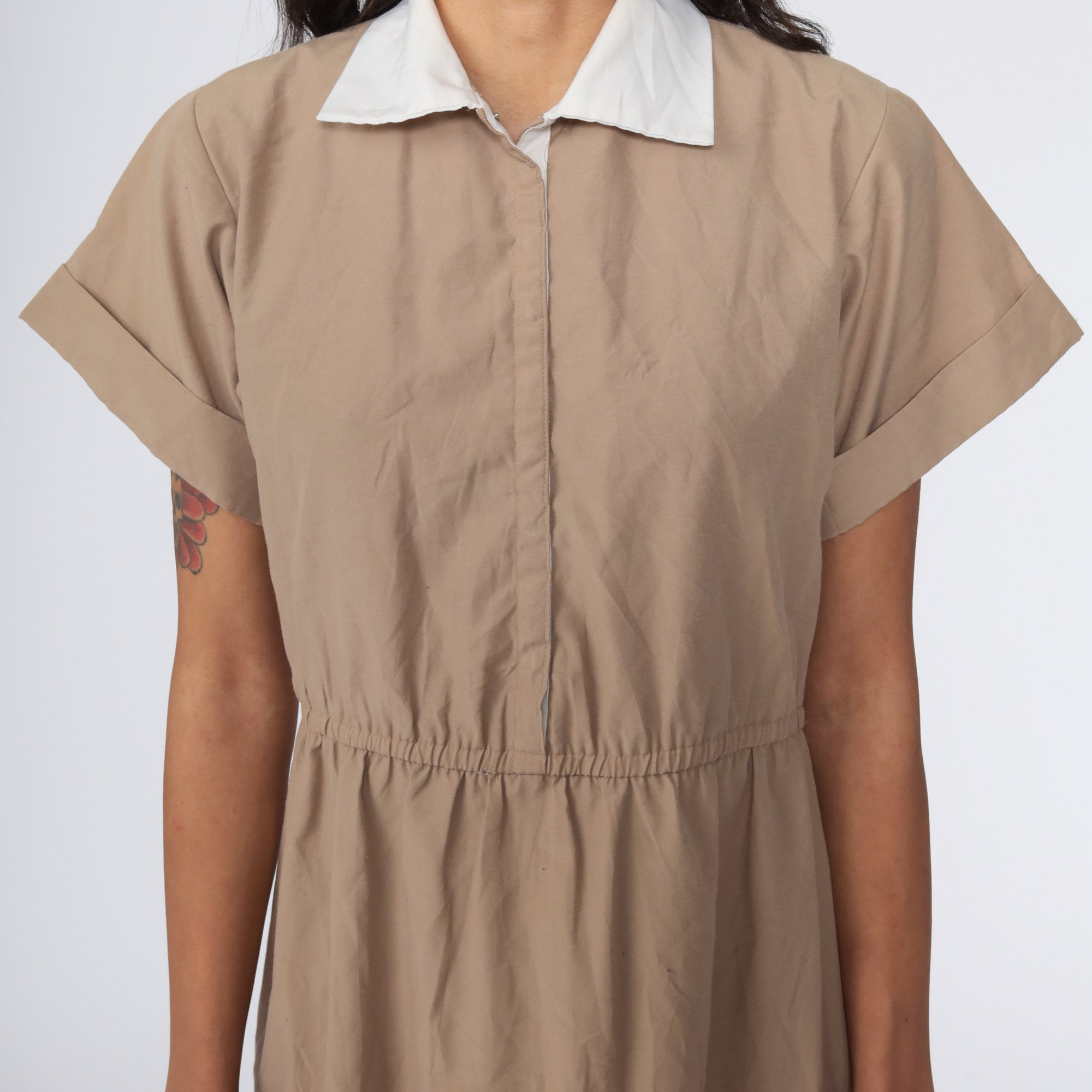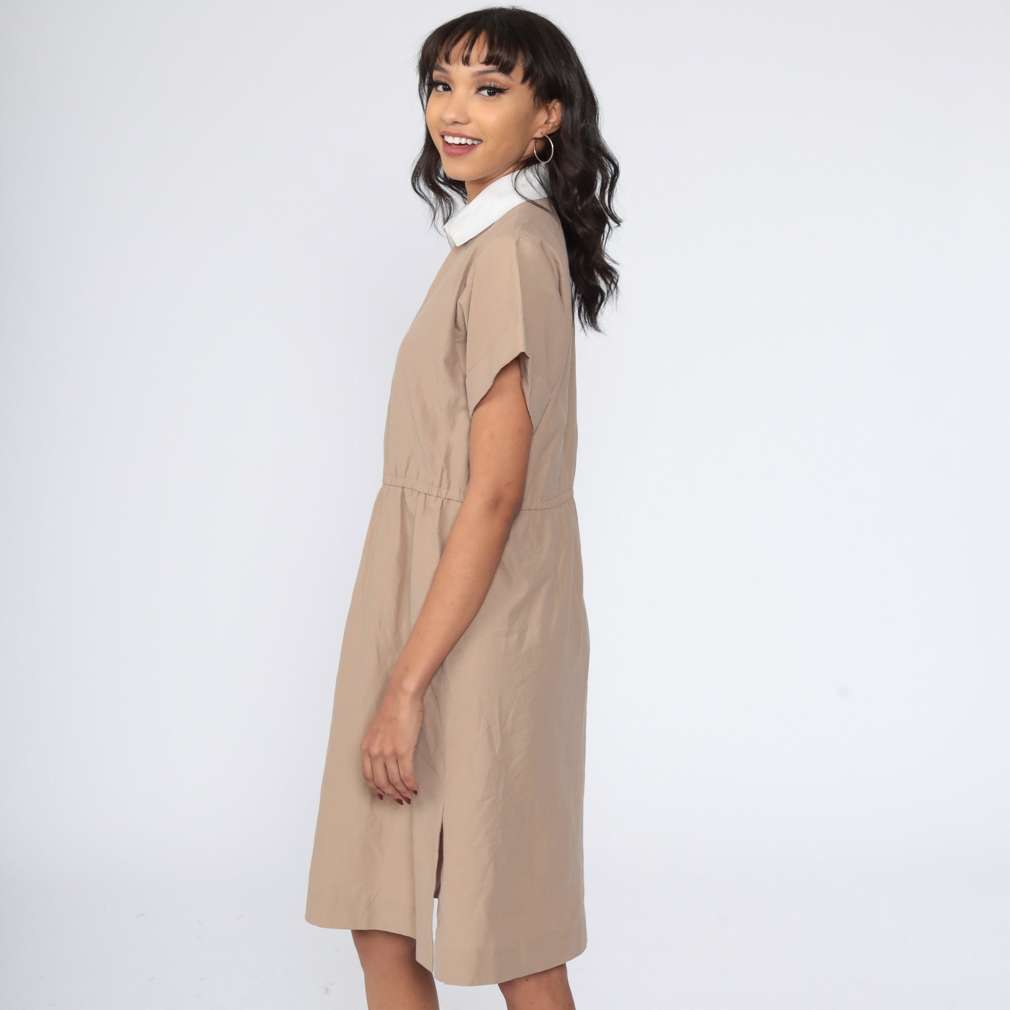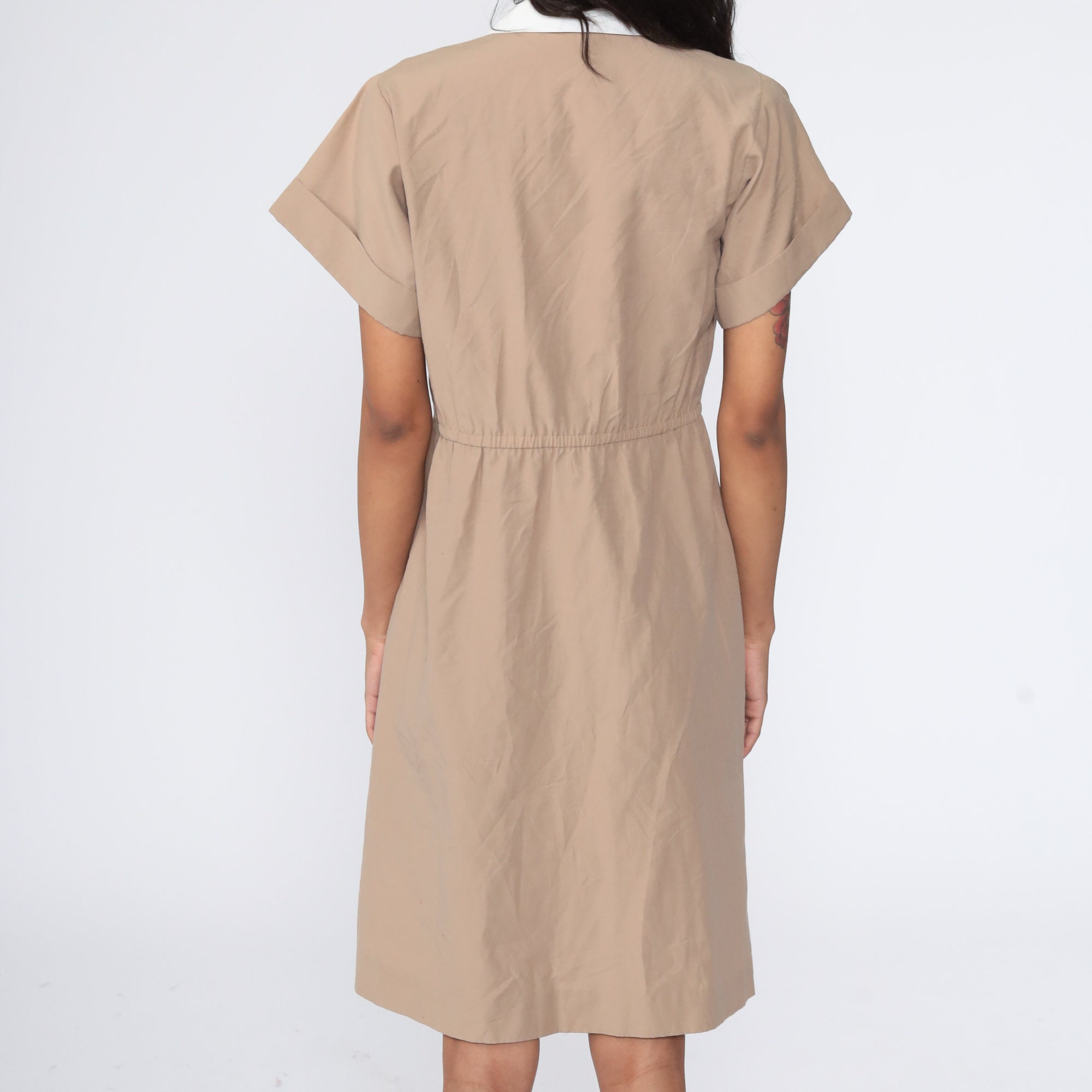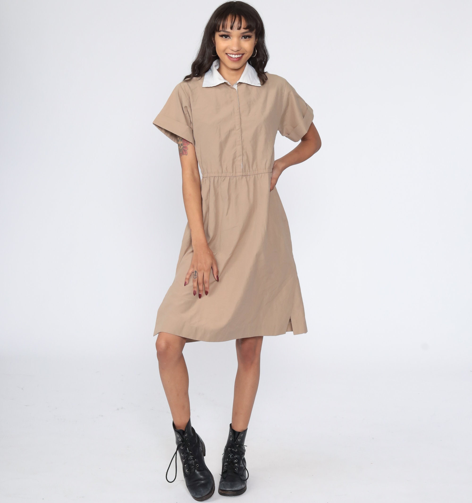 Vintage 80s dress in khaki with hidden buttons up the chest. High waisted with short sleeves and a flared skirt. Midi length.
