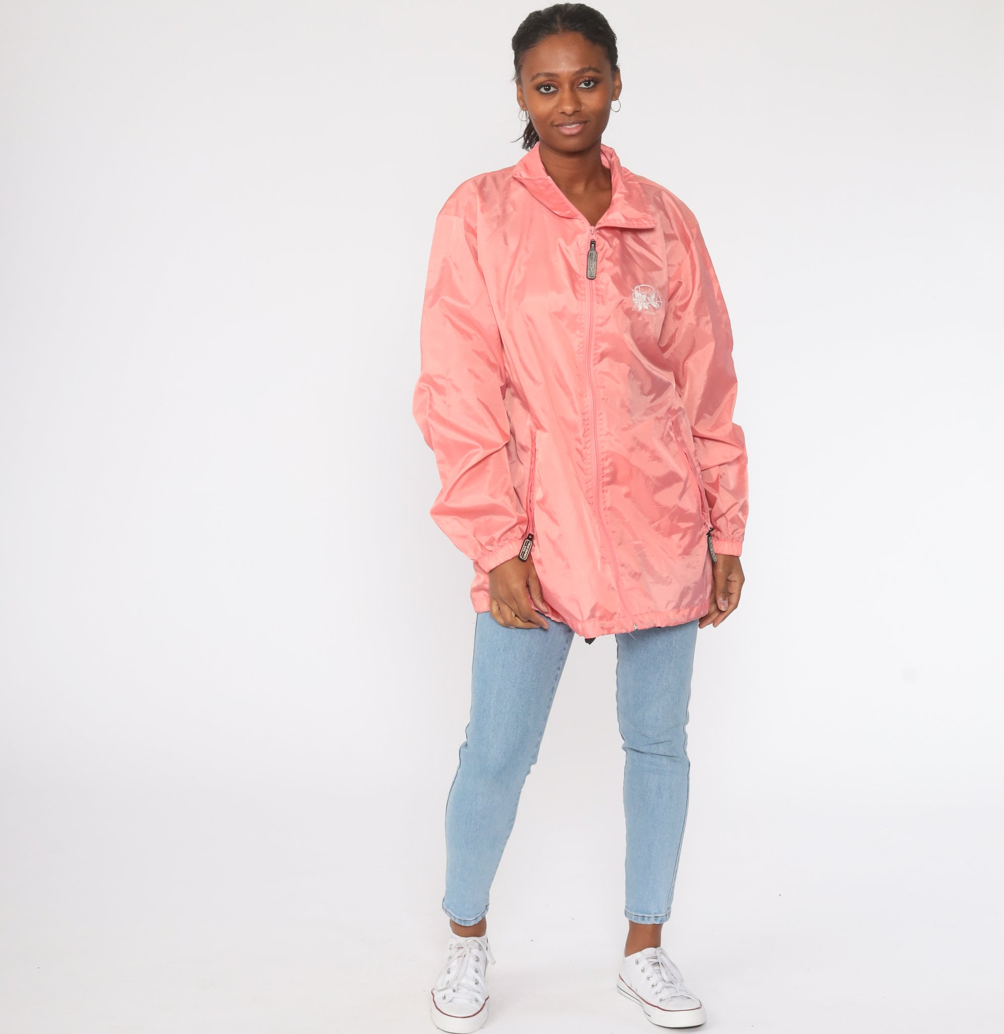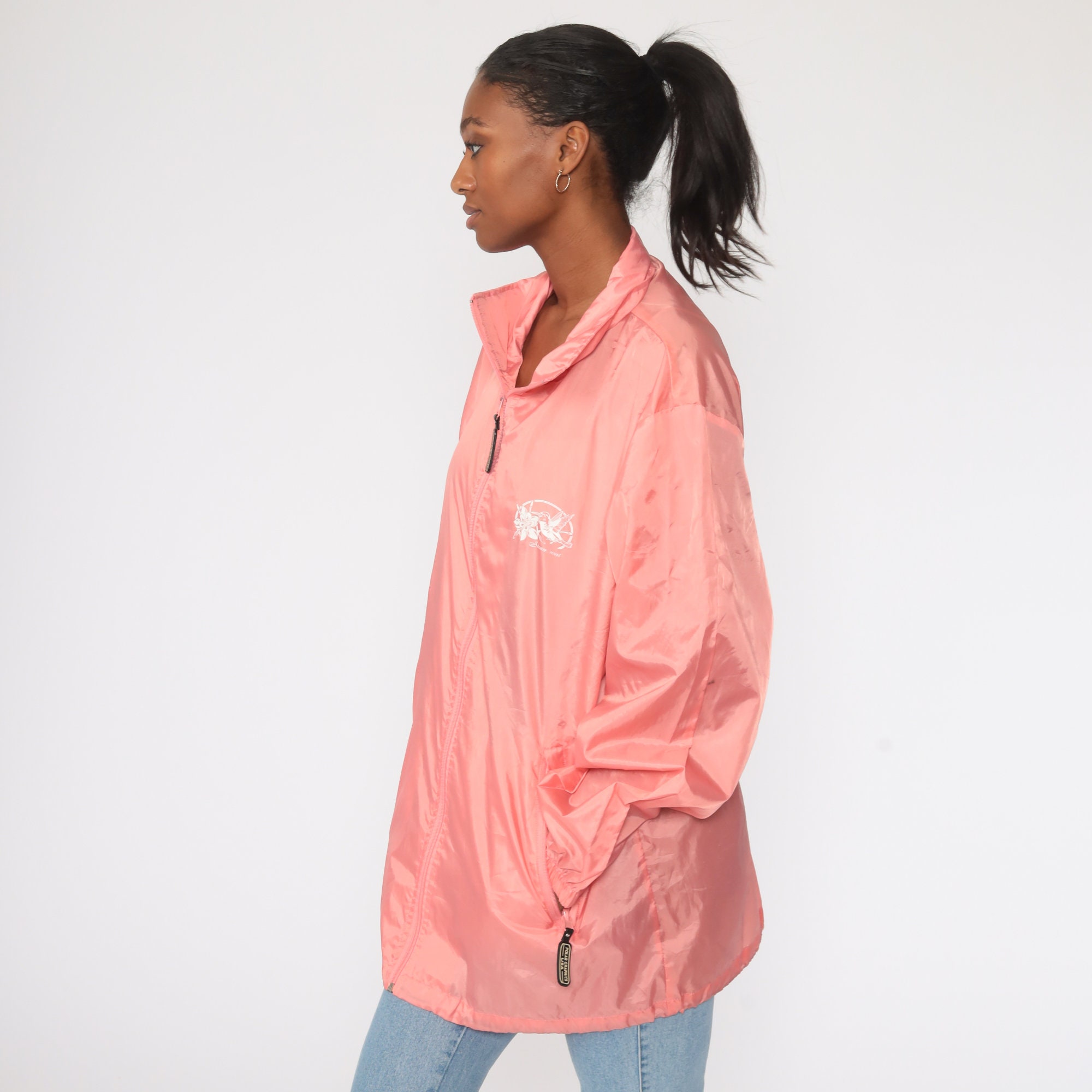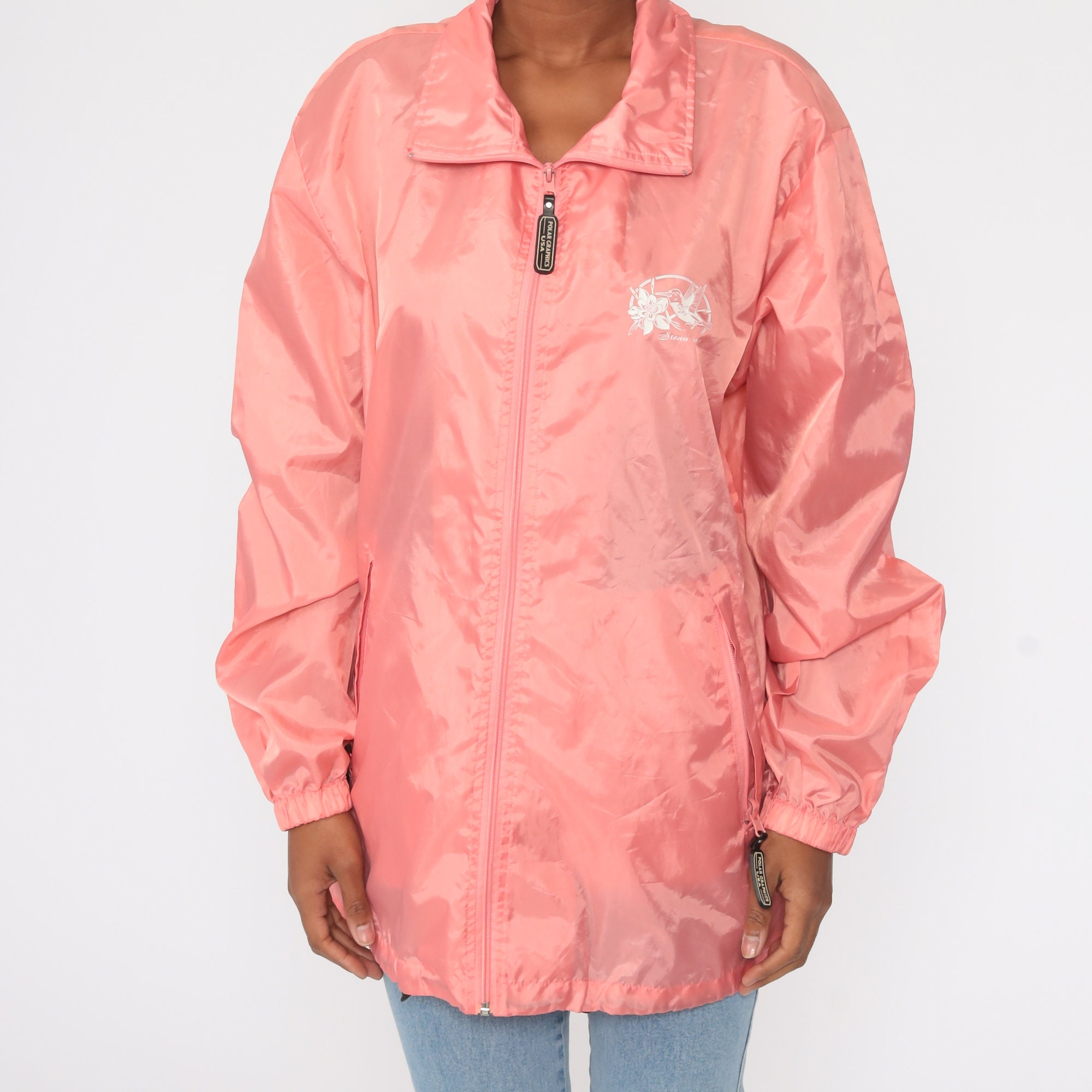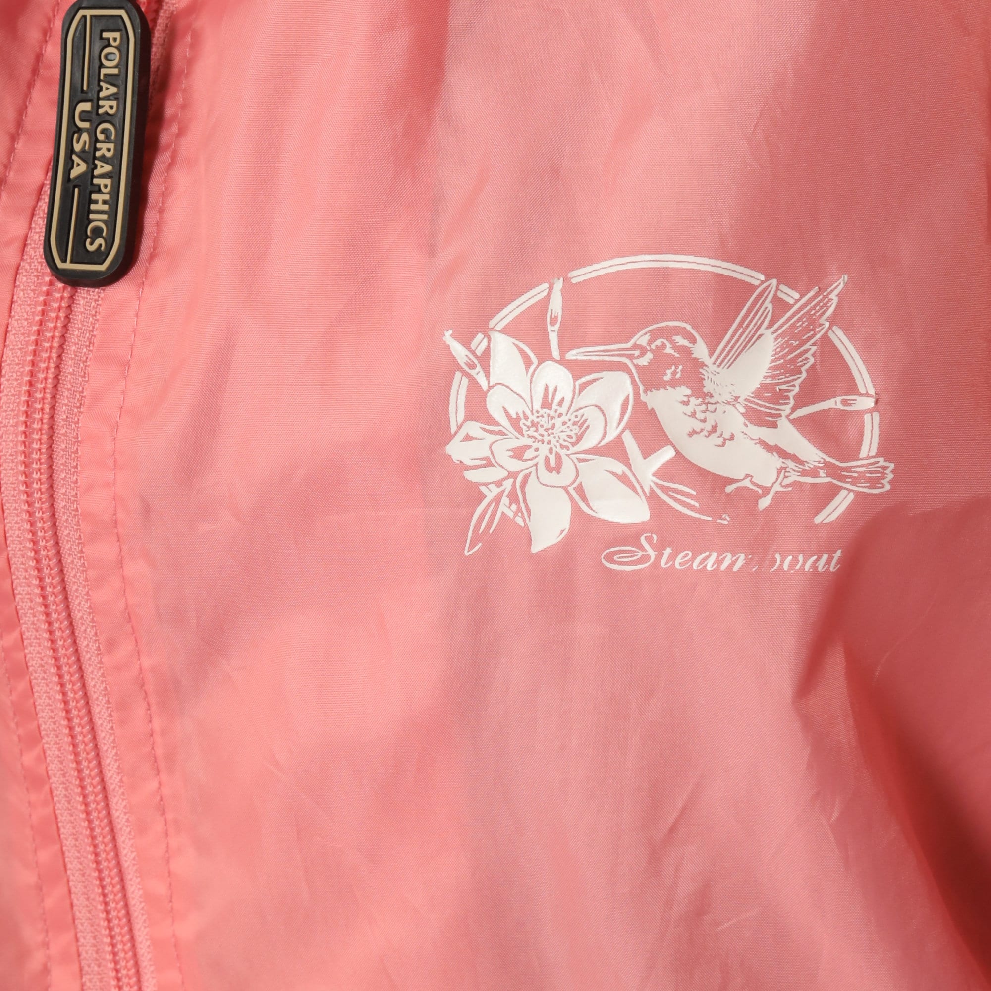 Vintage 00s windbreaker jacket in pink with a Steamboat, Colorado Hummingbird print.