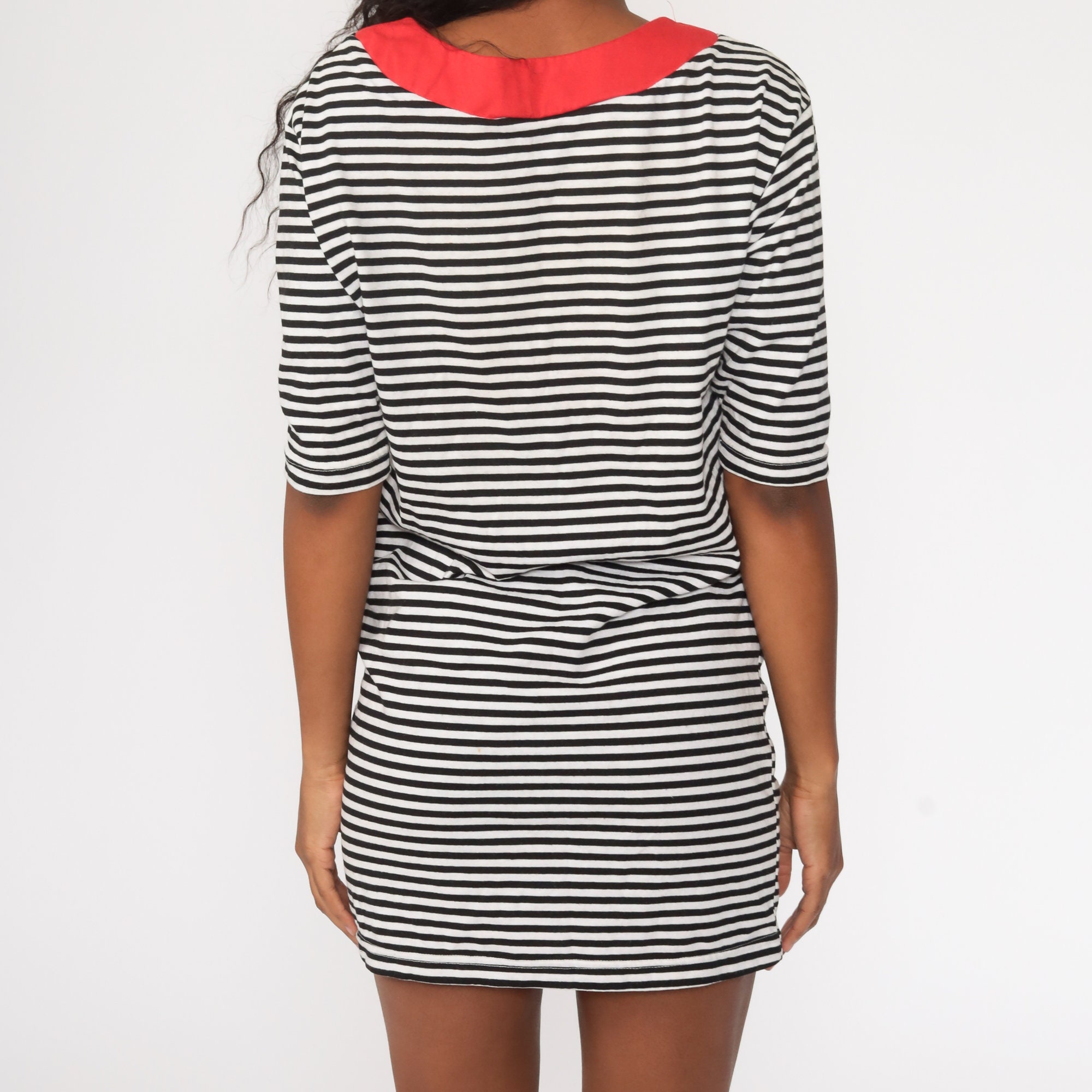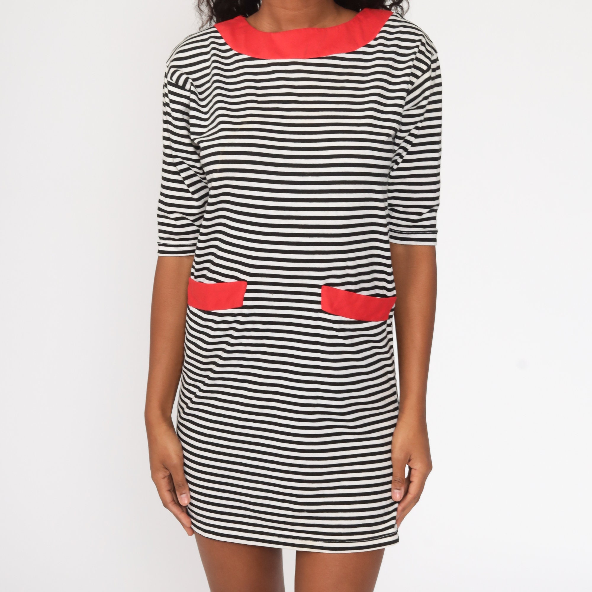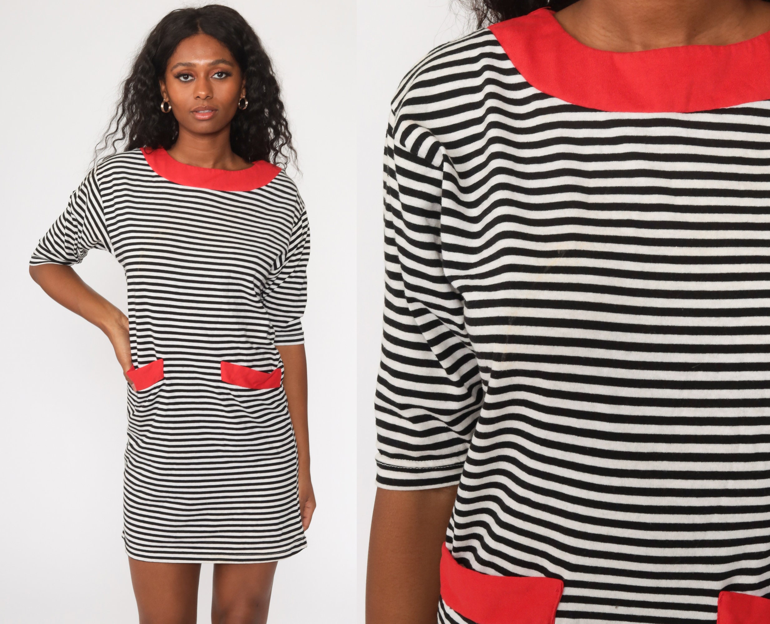 Vintage 80s dress in black and white stripes with a shift cut.