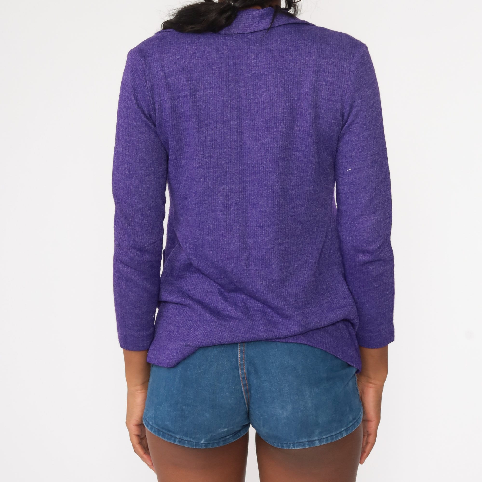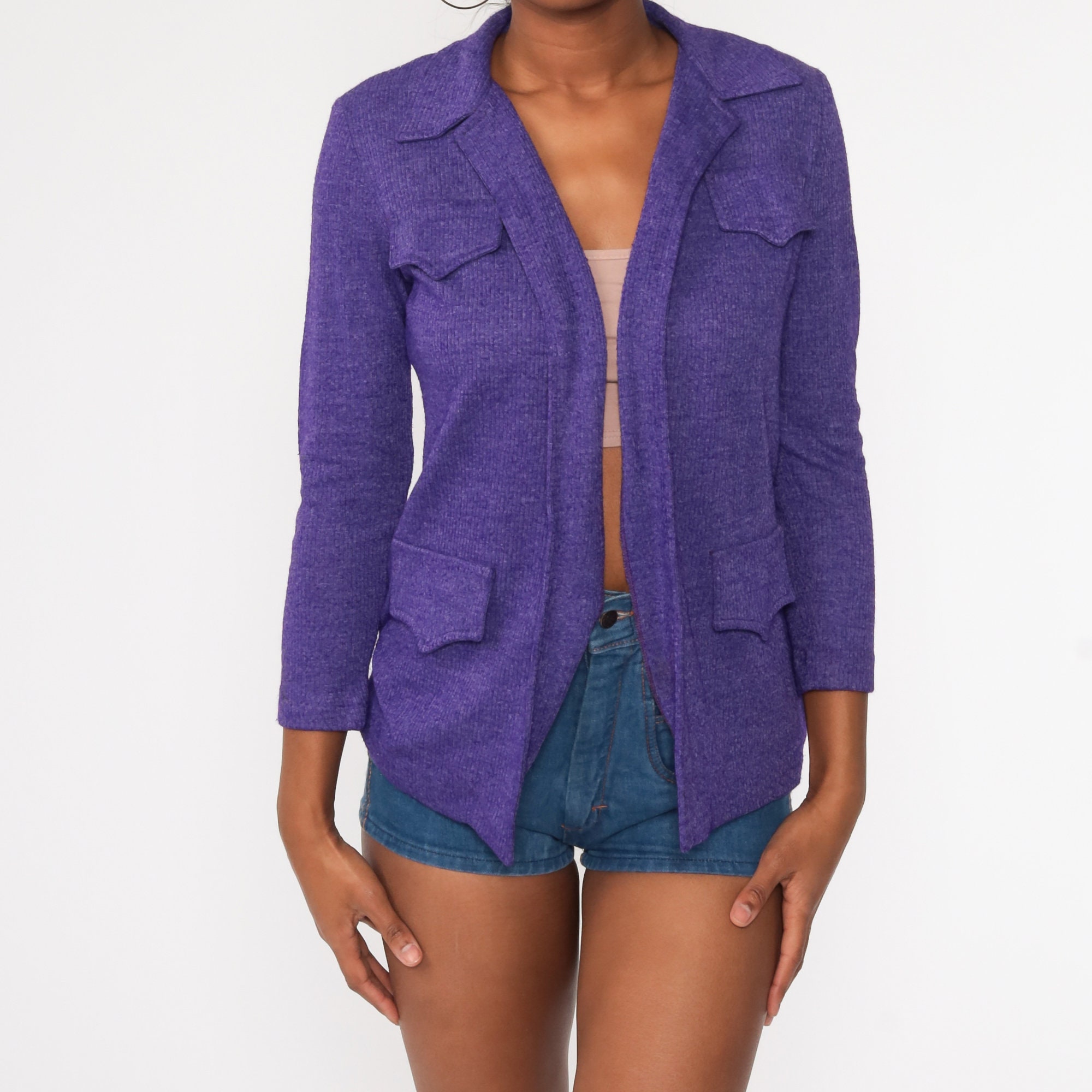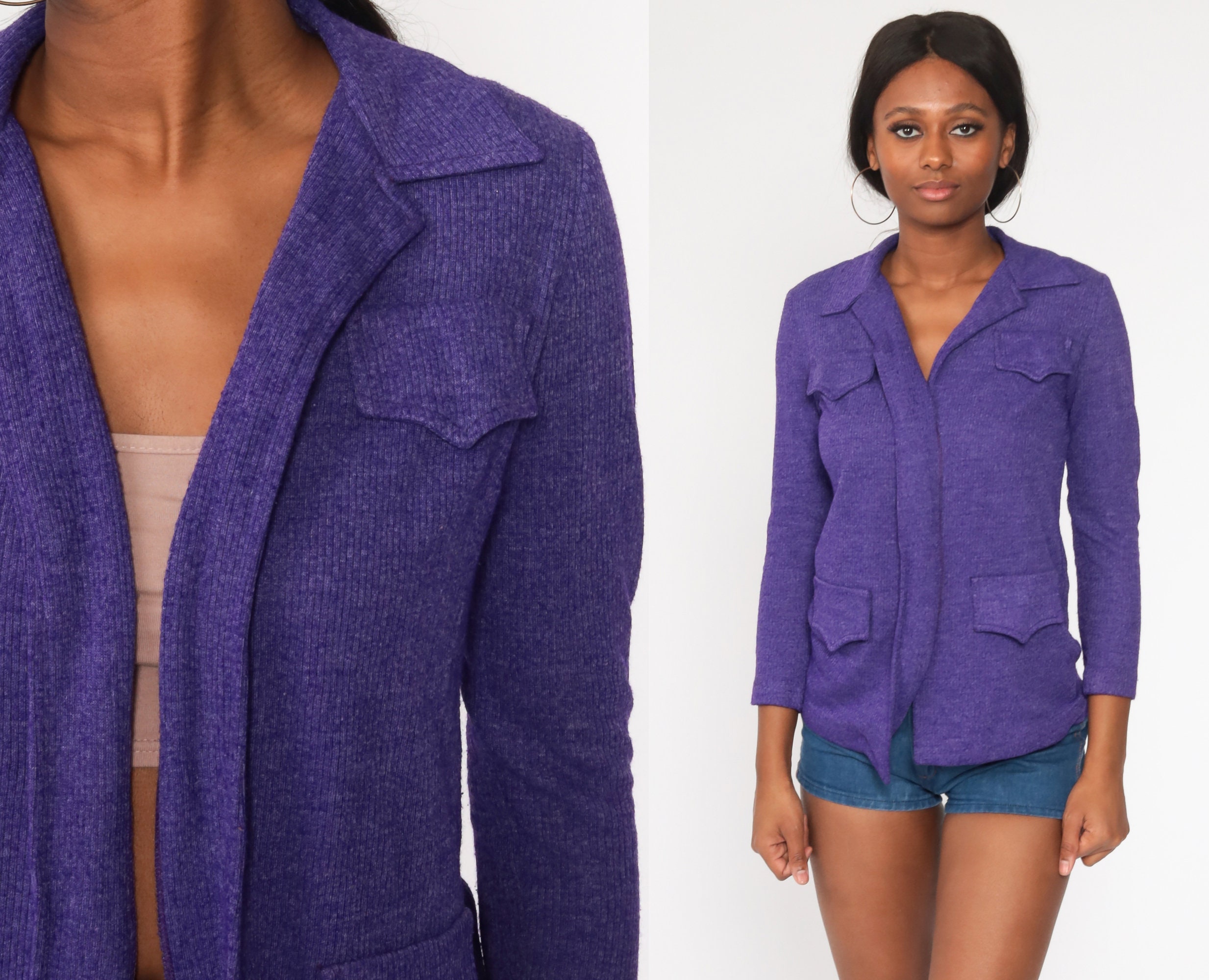 Vintage 70s cardigan sweater in purple knit with an open front.