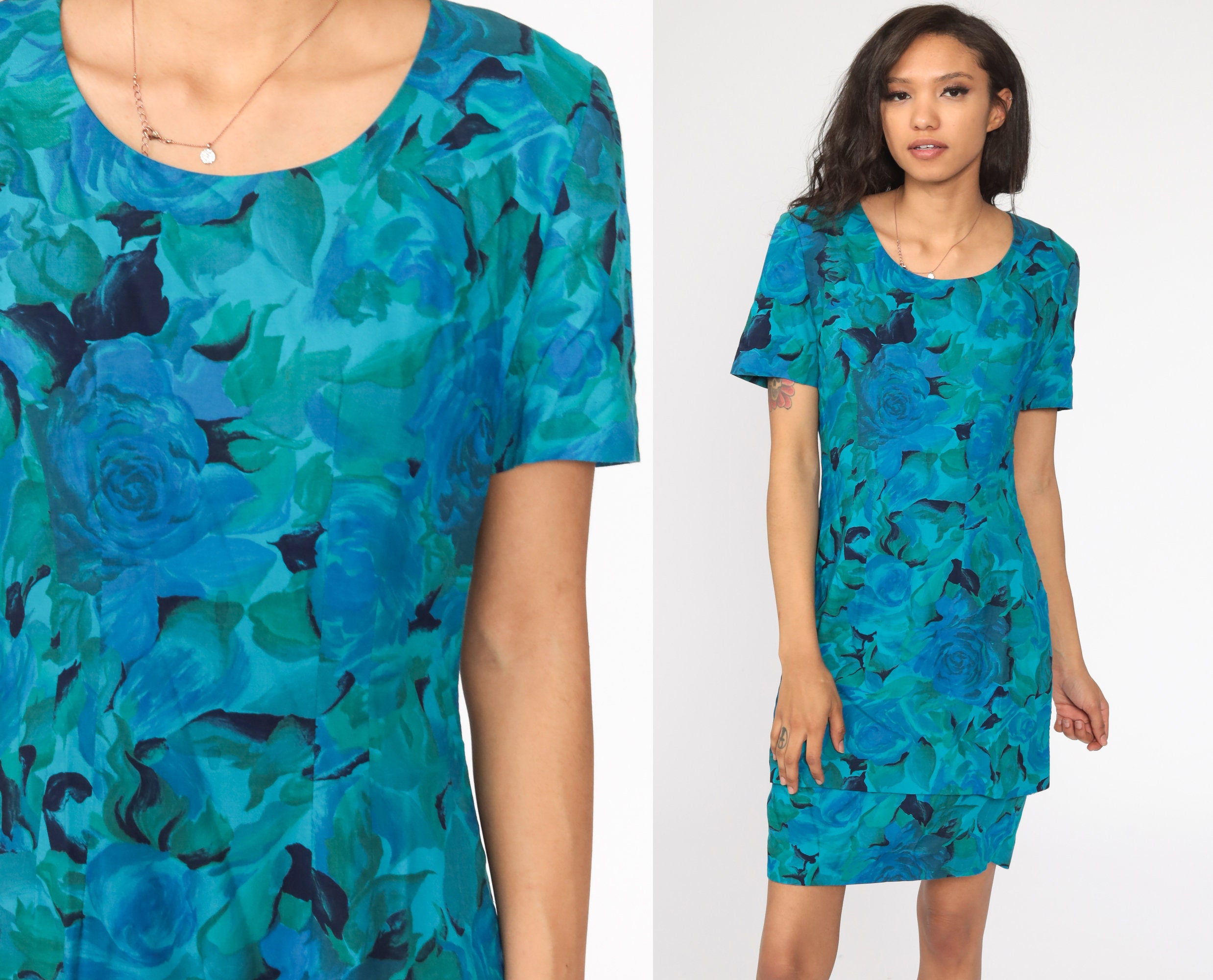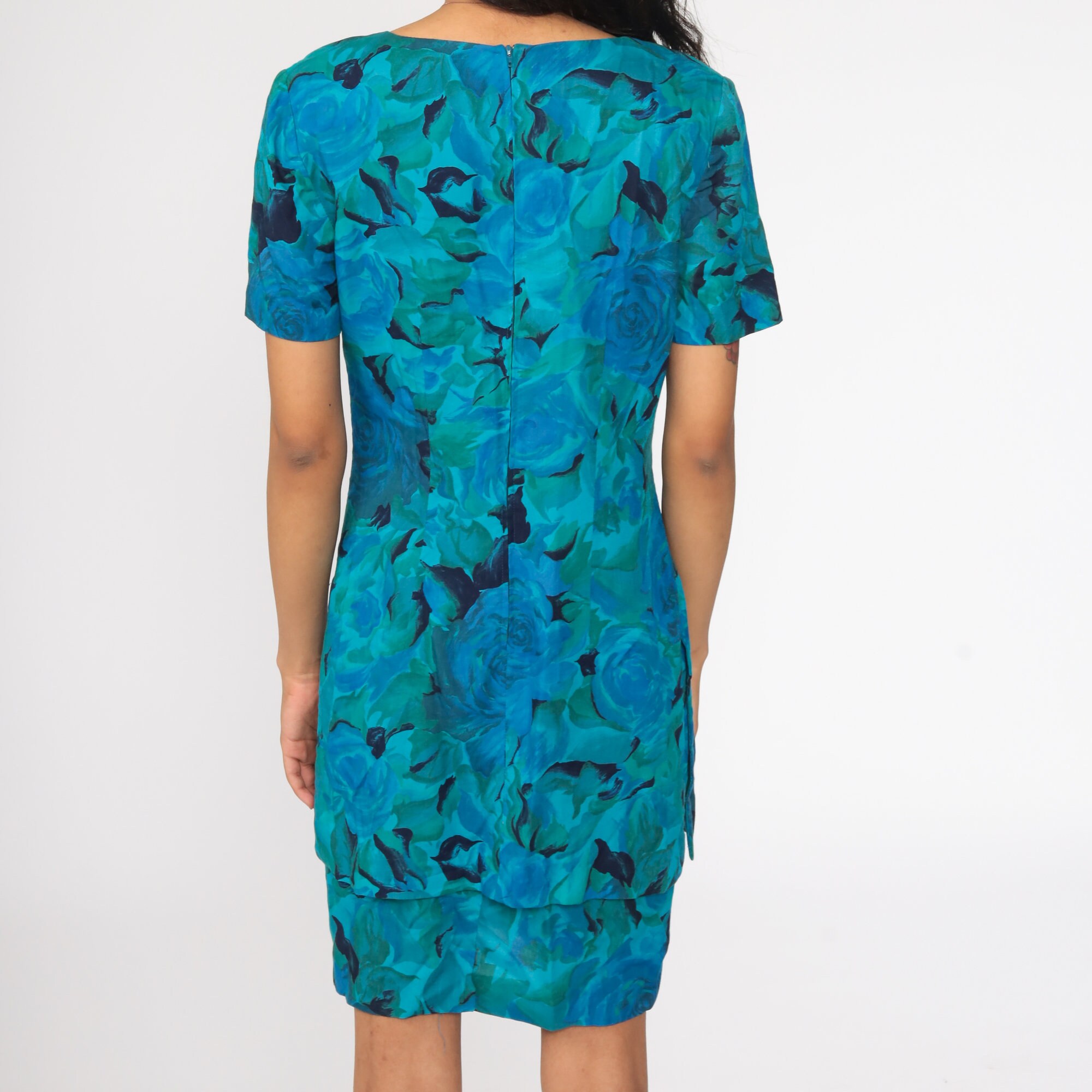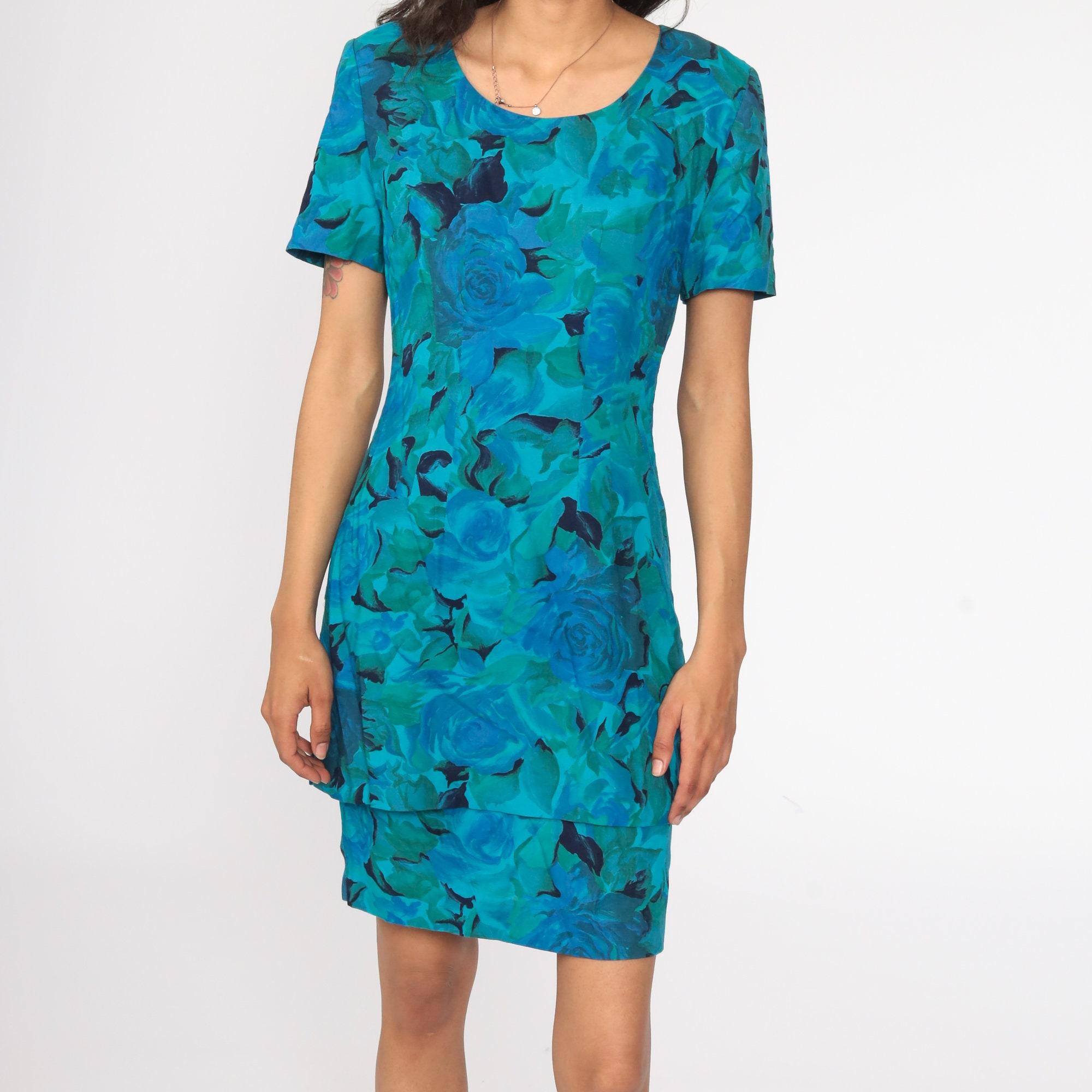 Vintage 80s dress in a blue floral rose print with a sheath cut.