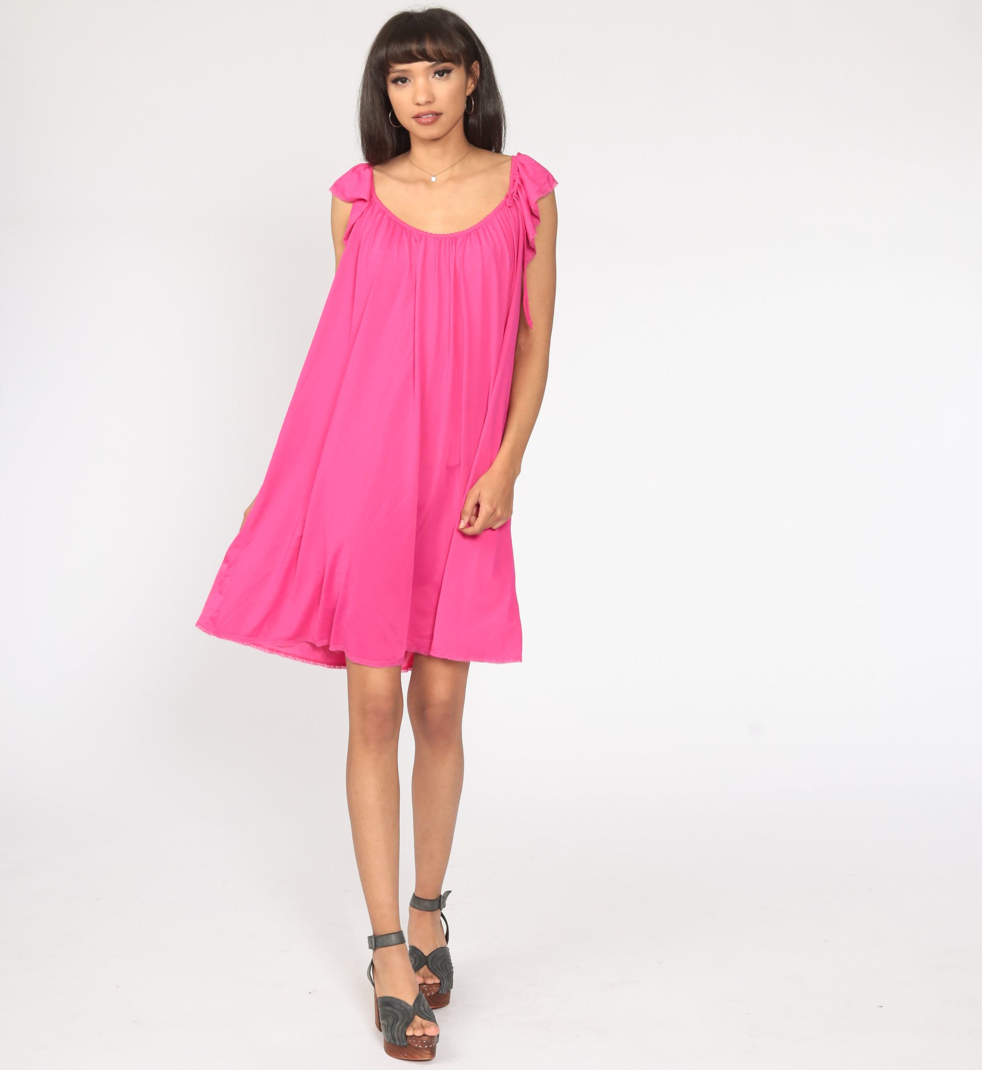 Vintage 80s nightgown in bright pink with a tent cut and flutter sleeves.