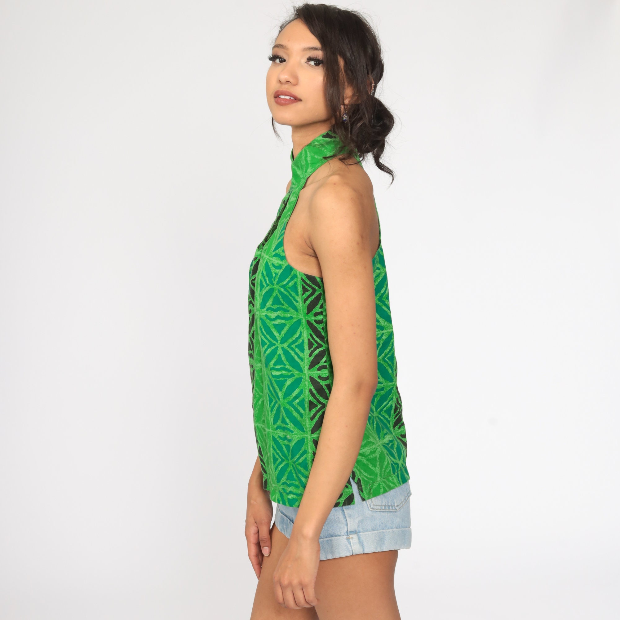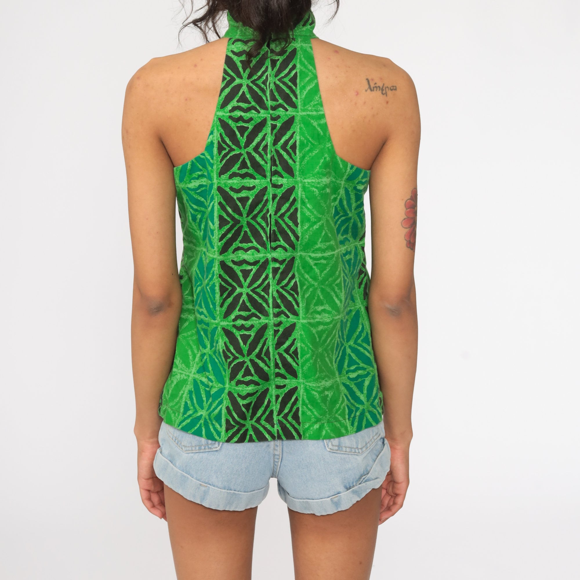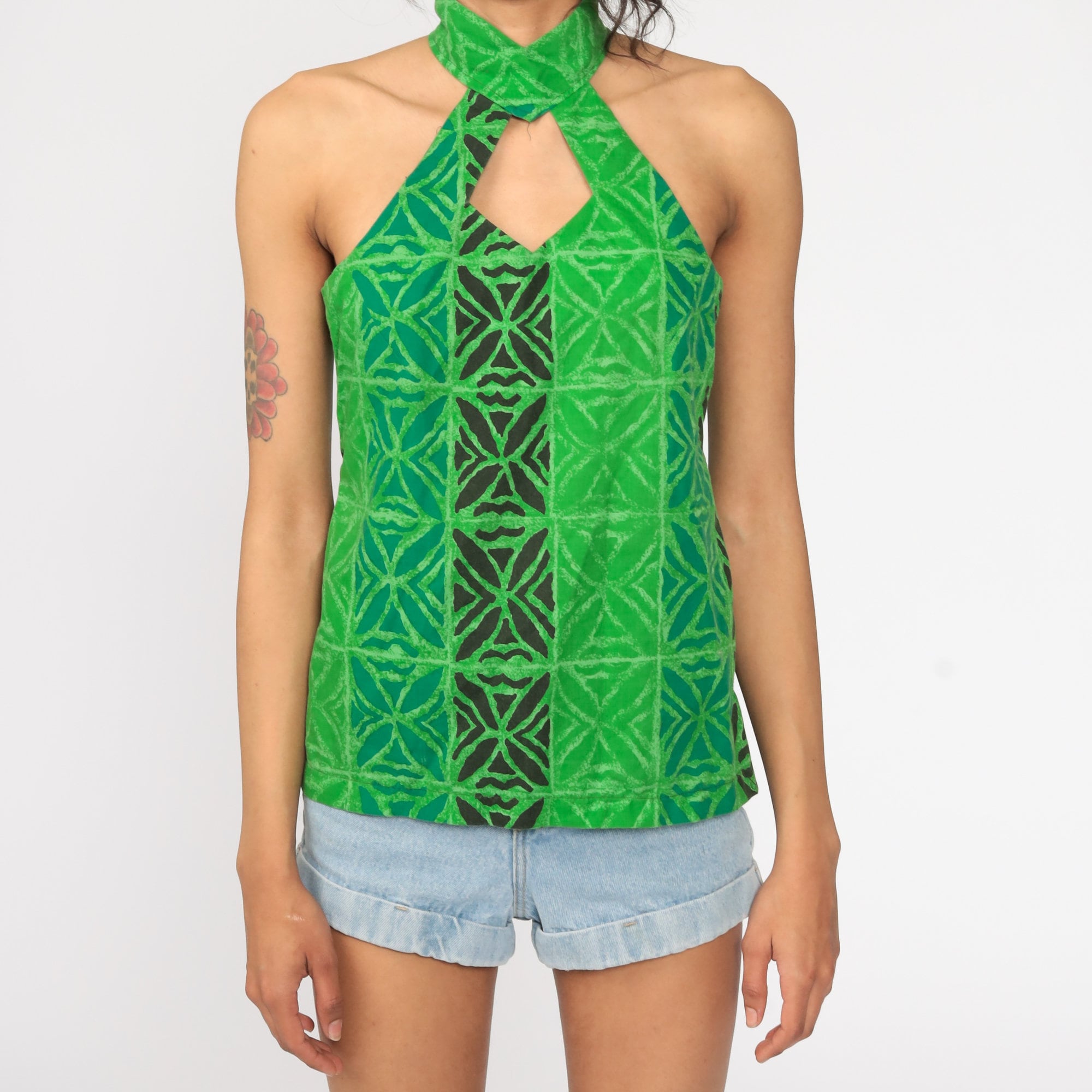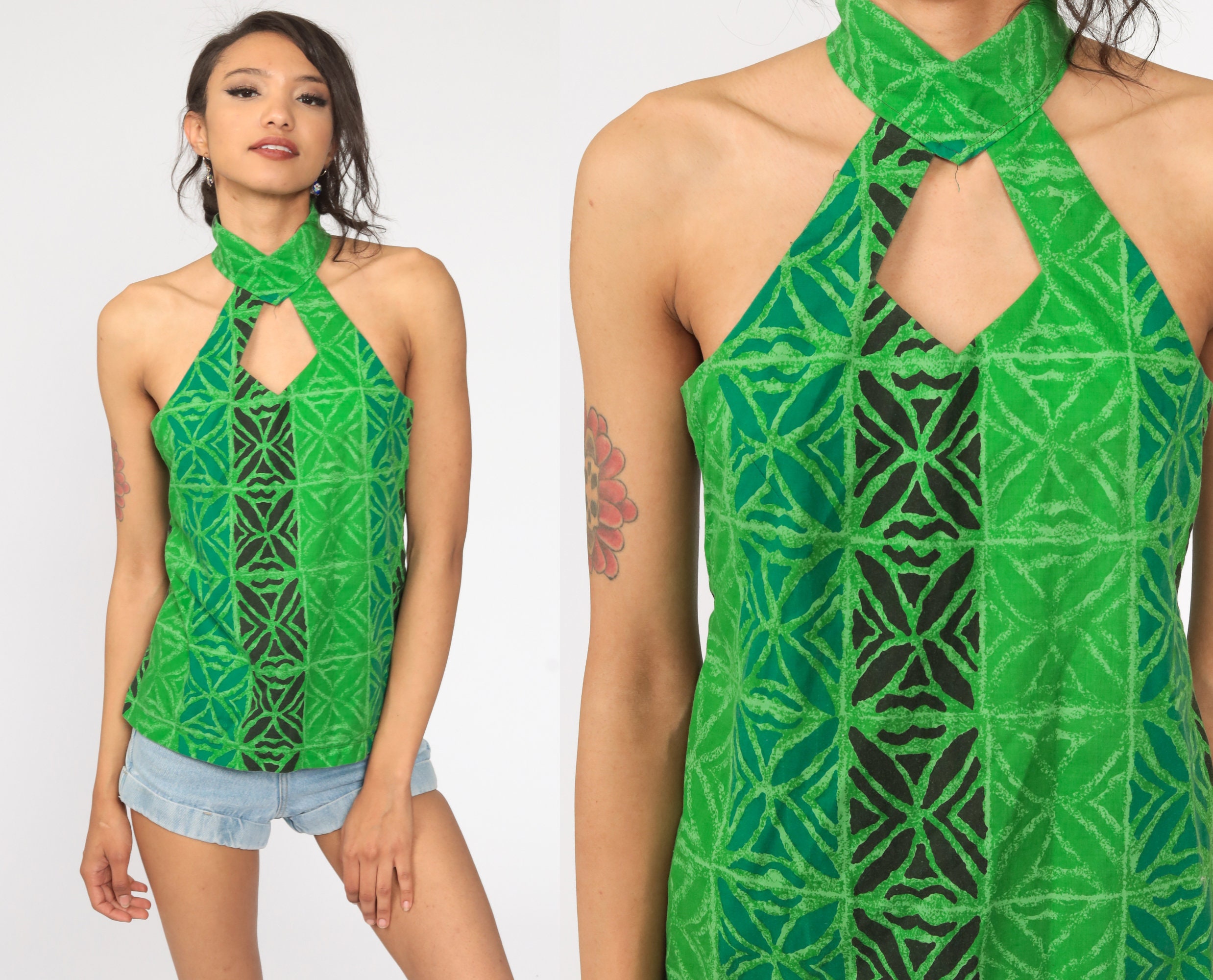 Vintage 90s tank top in green with a tribal print and keyhole choker neck.
