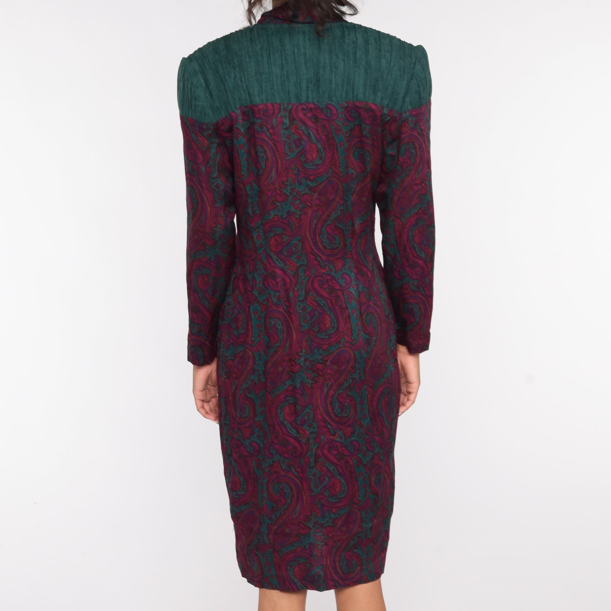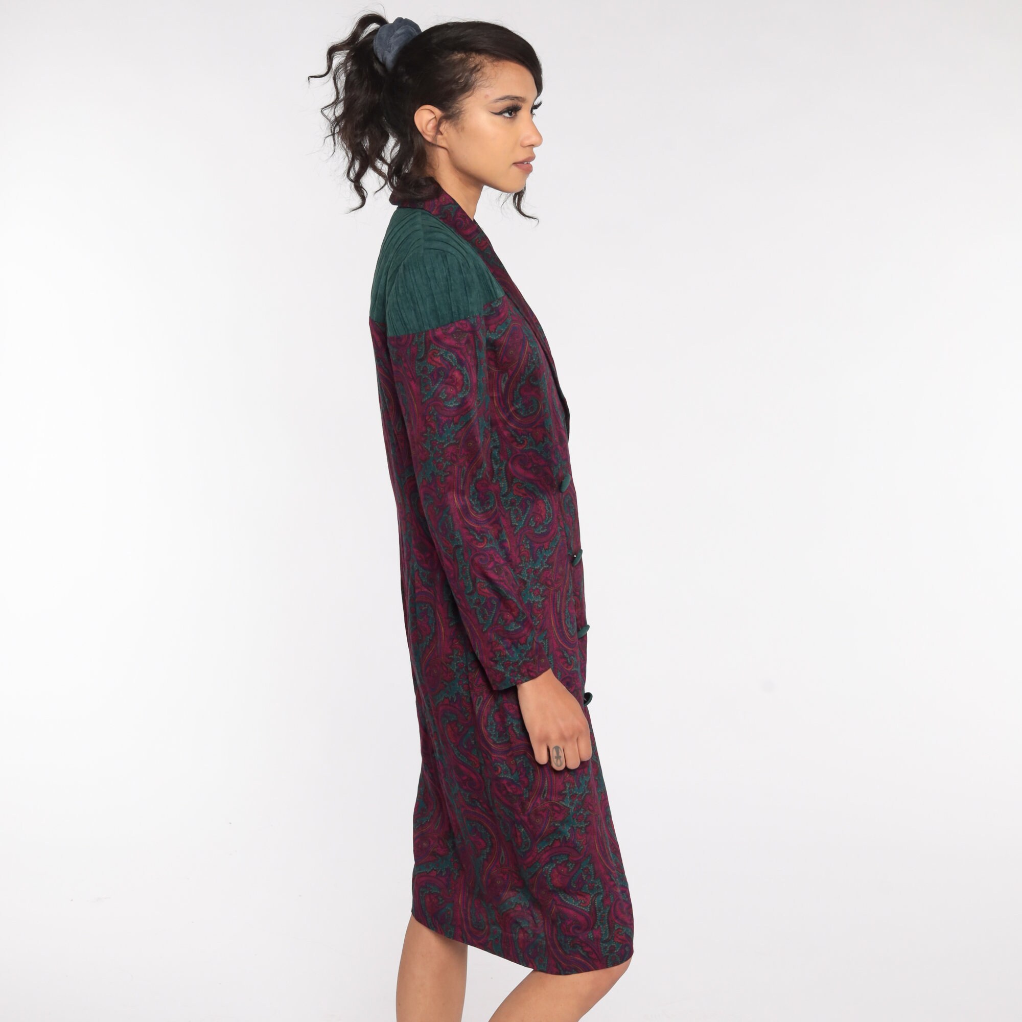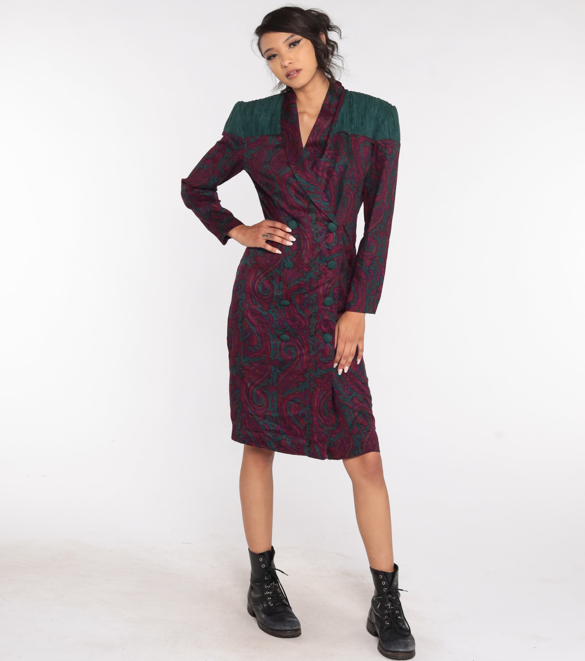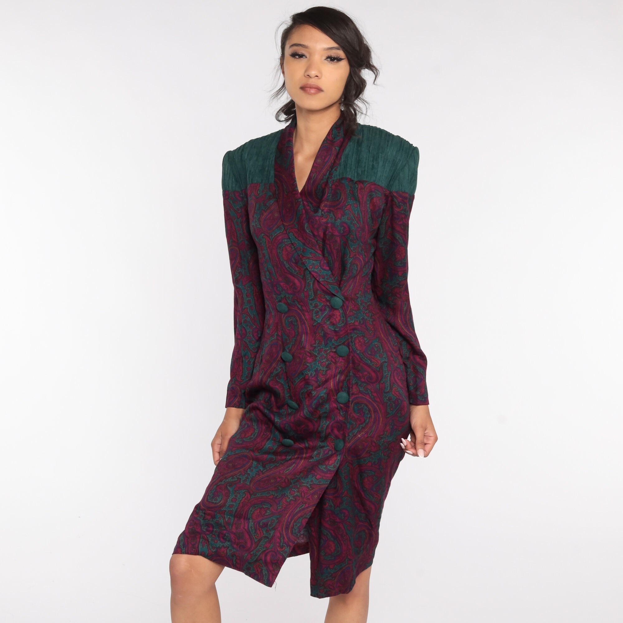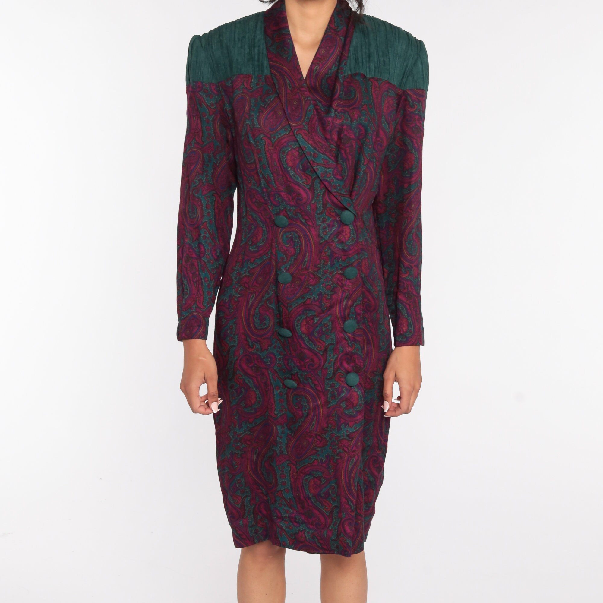 Vintage 80s dress in a paisley print with double breasted buttons up the front.